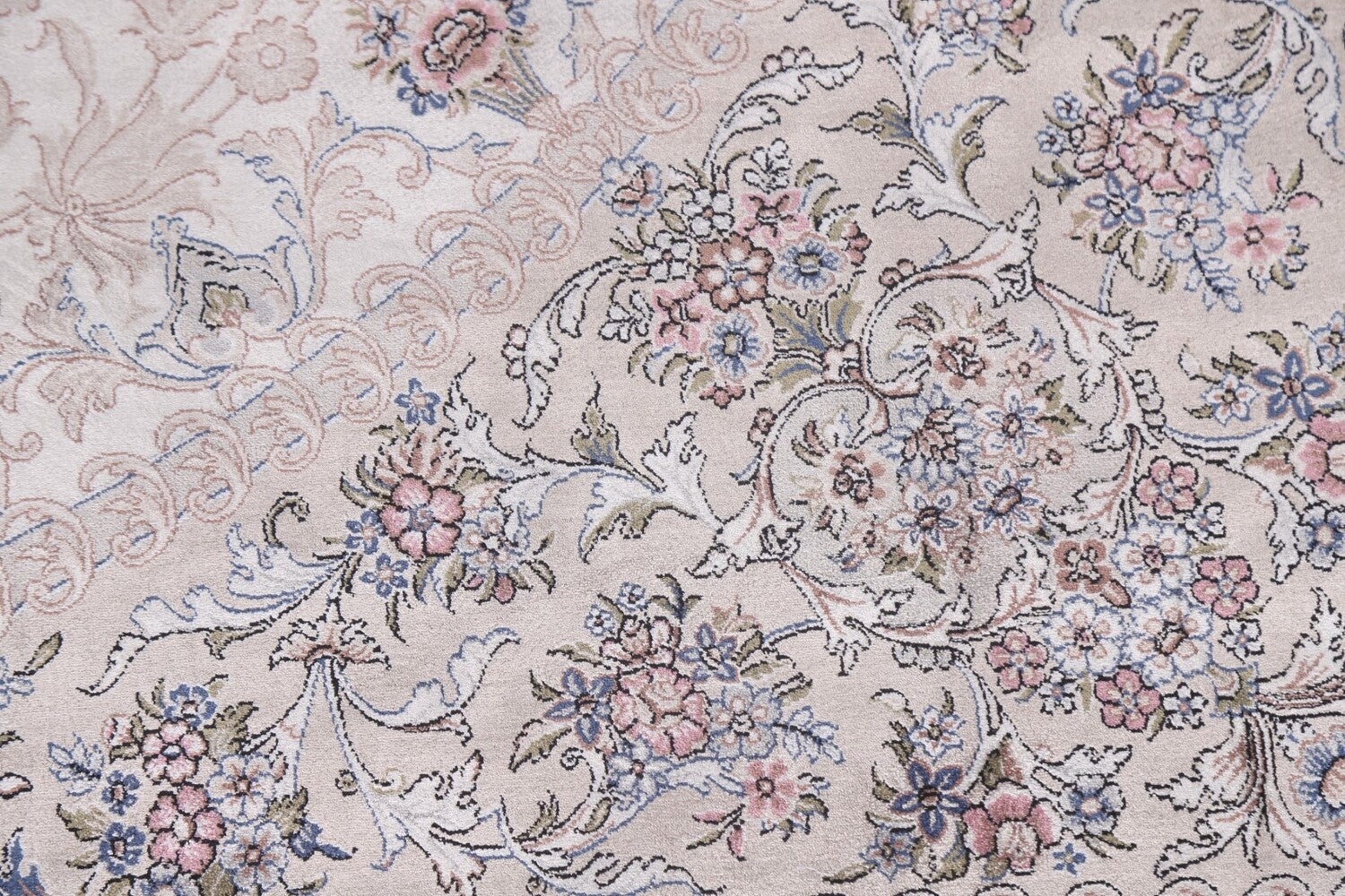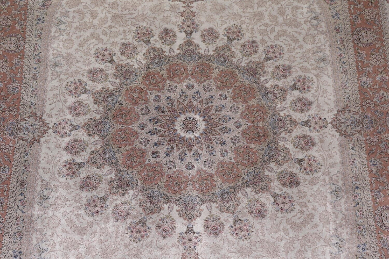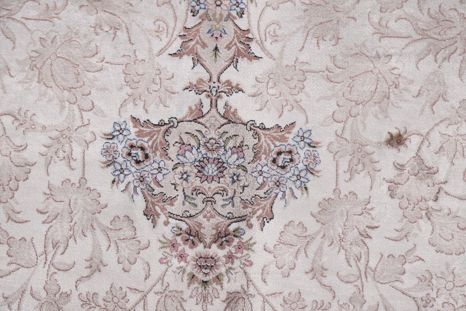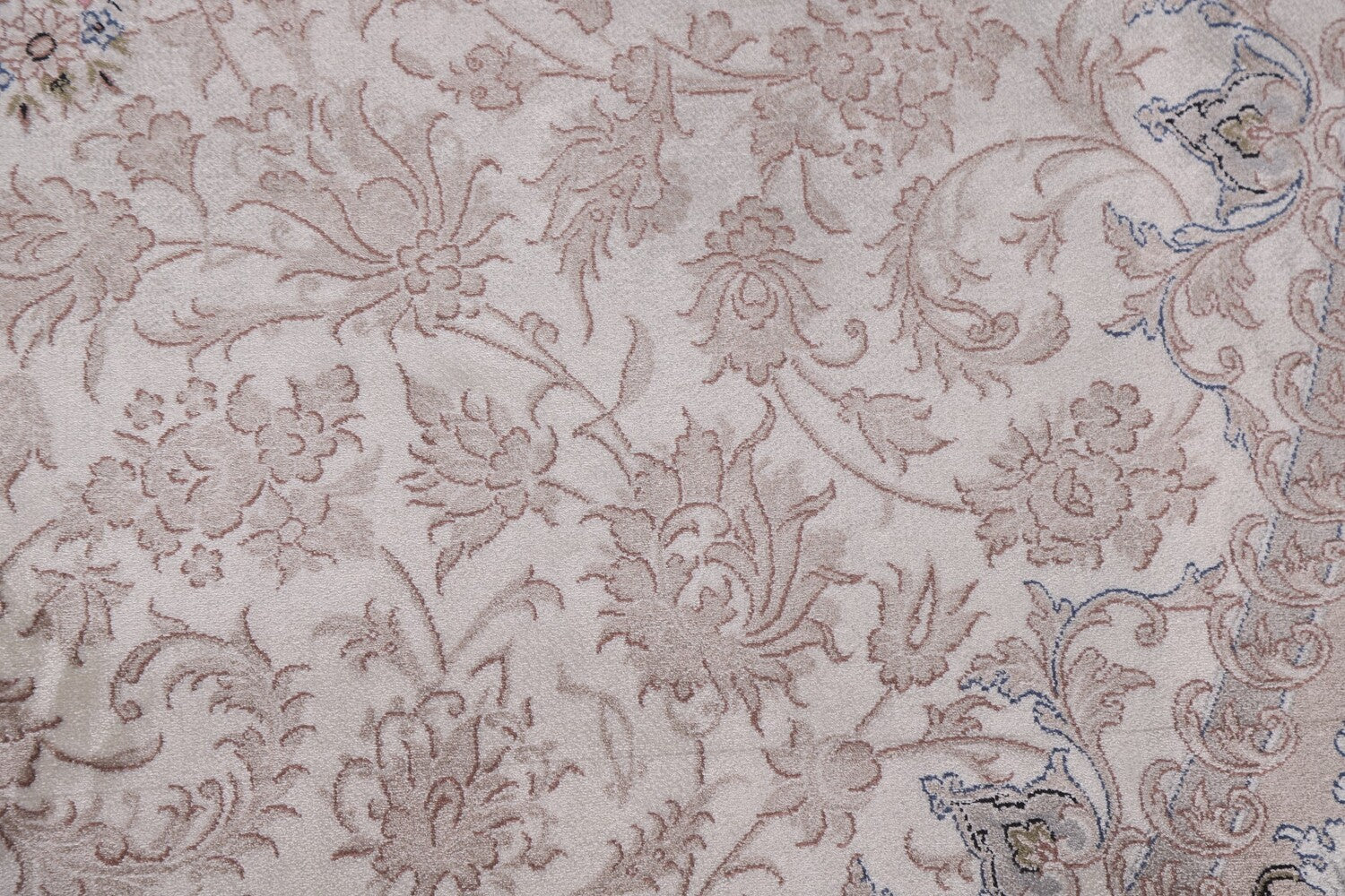 A Beautiful Genuine Turkey Qum rug is Machine Made by skillful weavers in Turkey with 90% Silk - 10% Polyester Material. This rug is in condition. dimensions are 9' 7'' X 6' 6'' in foot and 292 X 198 in centimeter. the primary color is Beige & Ivories.