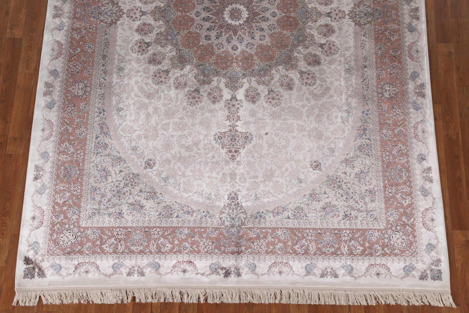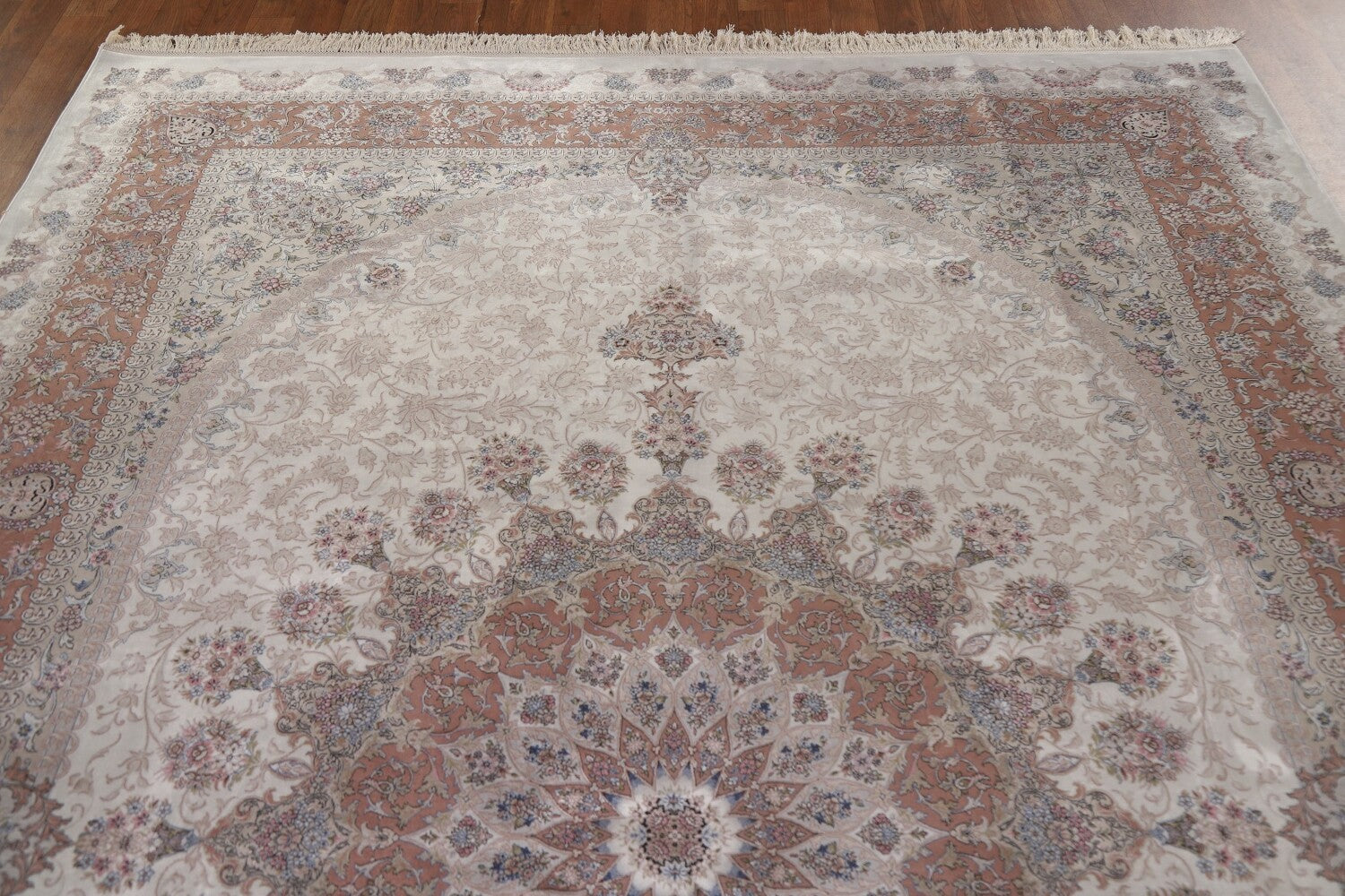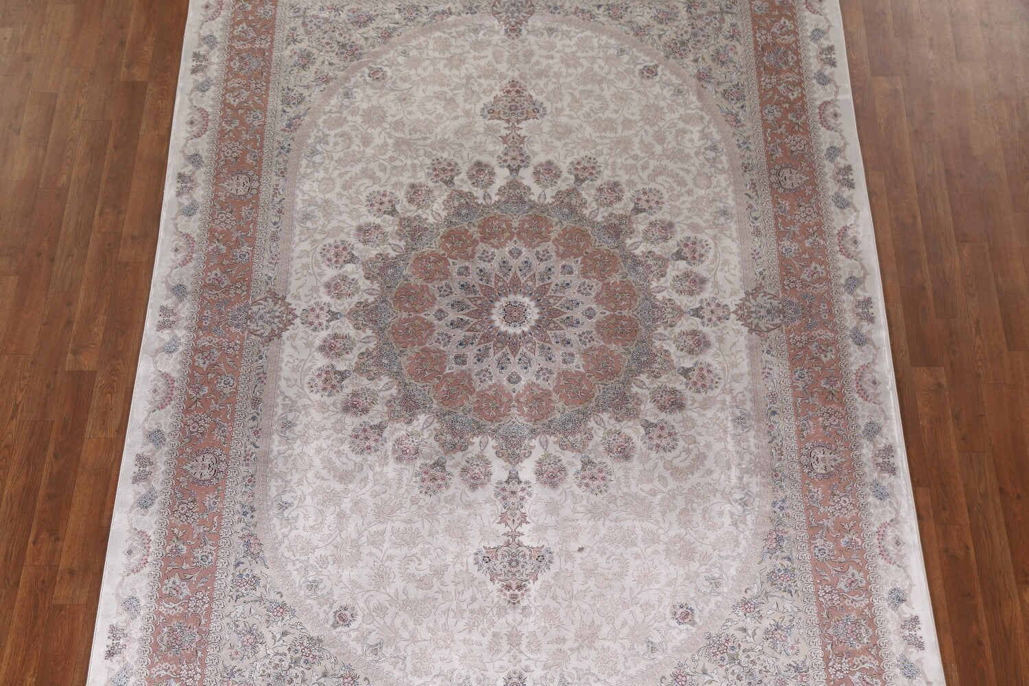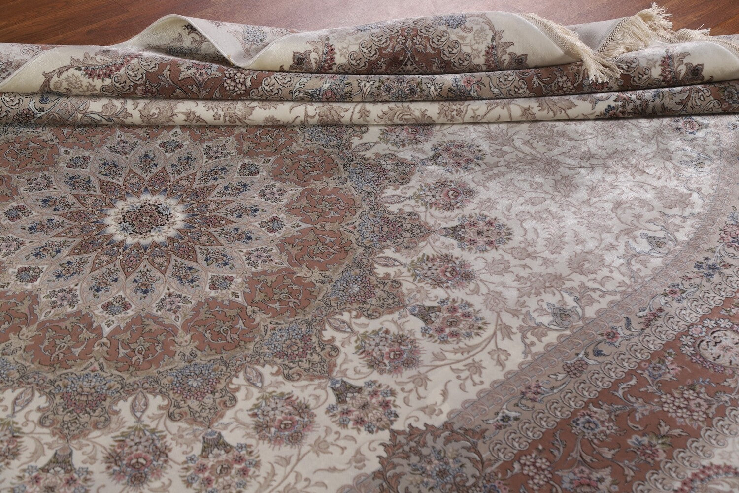 A Beautiful Genuine Turkey Qum rug is Machine Made by skillful weavers in Turkey with 90% Silk - 10% Polyester Material. This rug is in condition. dimensions are 9' 7'' X 6' 6'' in foot and 292 X 198 in centimeter. the primary color is Beige & Ivories.