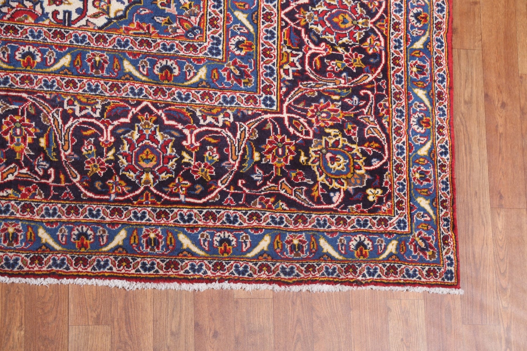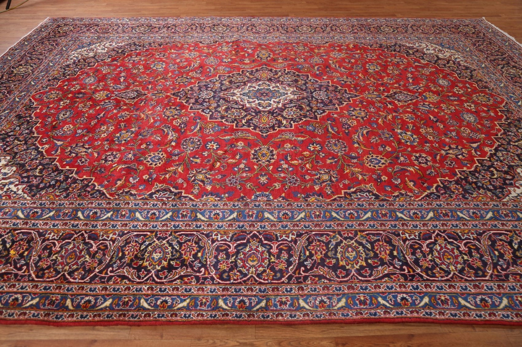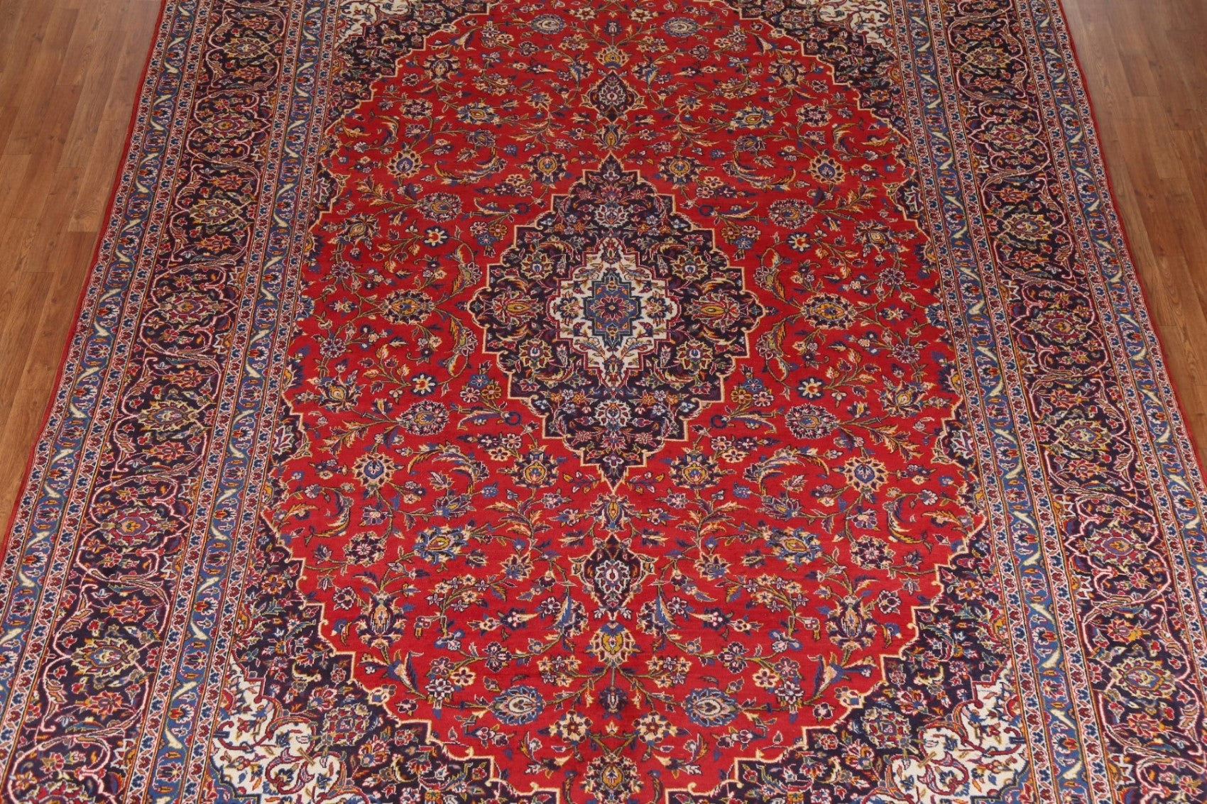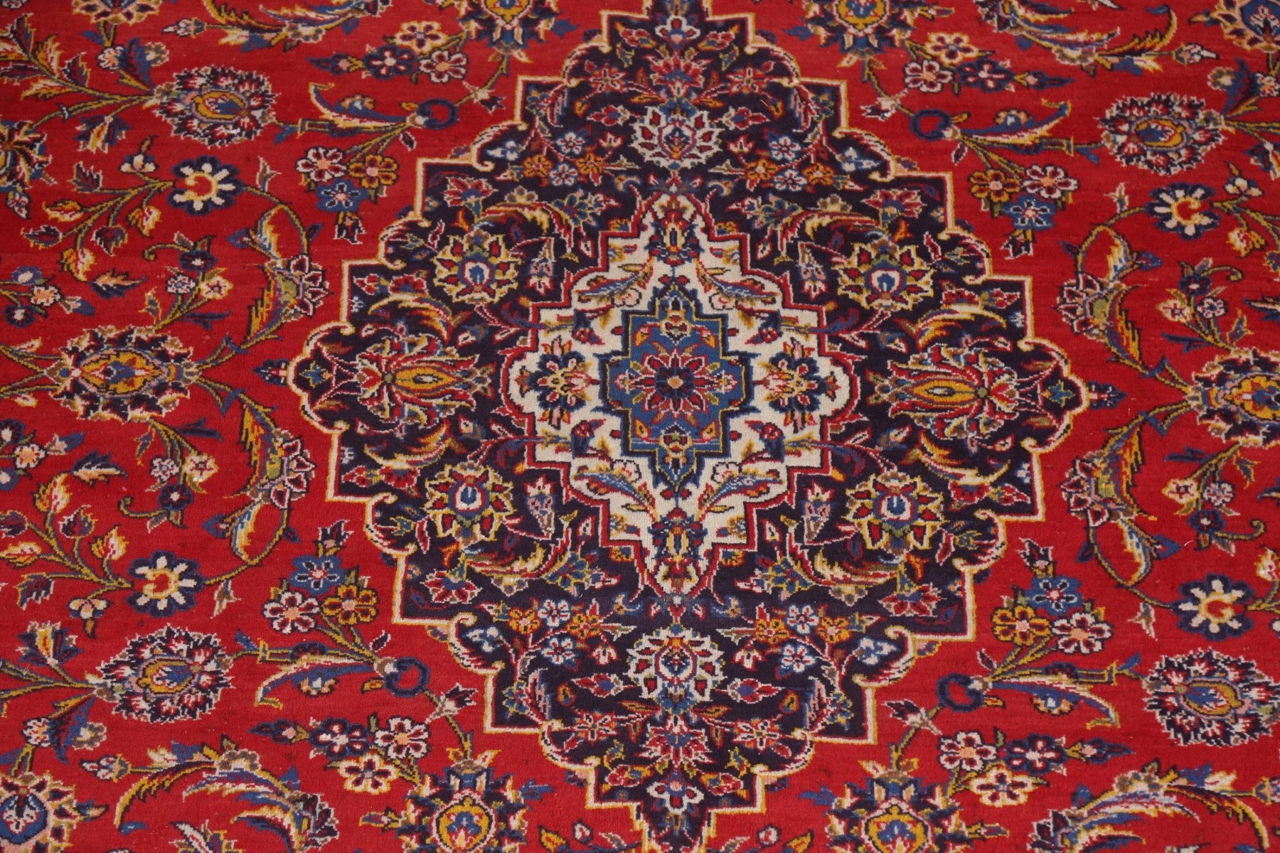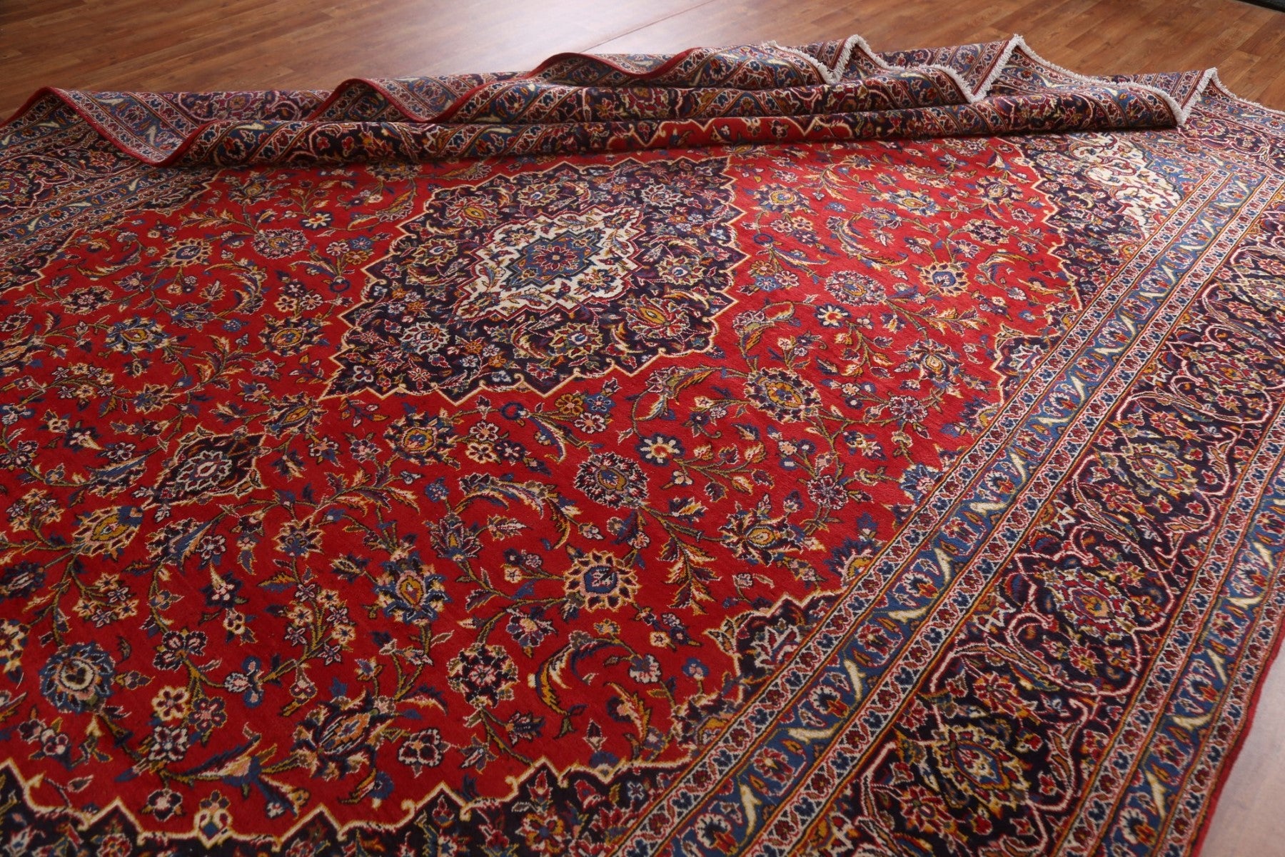 A Beautiful Genuine Persia ( Persia ) Kashan rug is Hand Knotted by skillful weavers in Persia ( Persia ) with 100% Wool Material. This rug is in Very Good condition. dimensions are 12' 11'' X 9' 8'' in foot and 394 X 295 in centimeter. the primary color is Red.