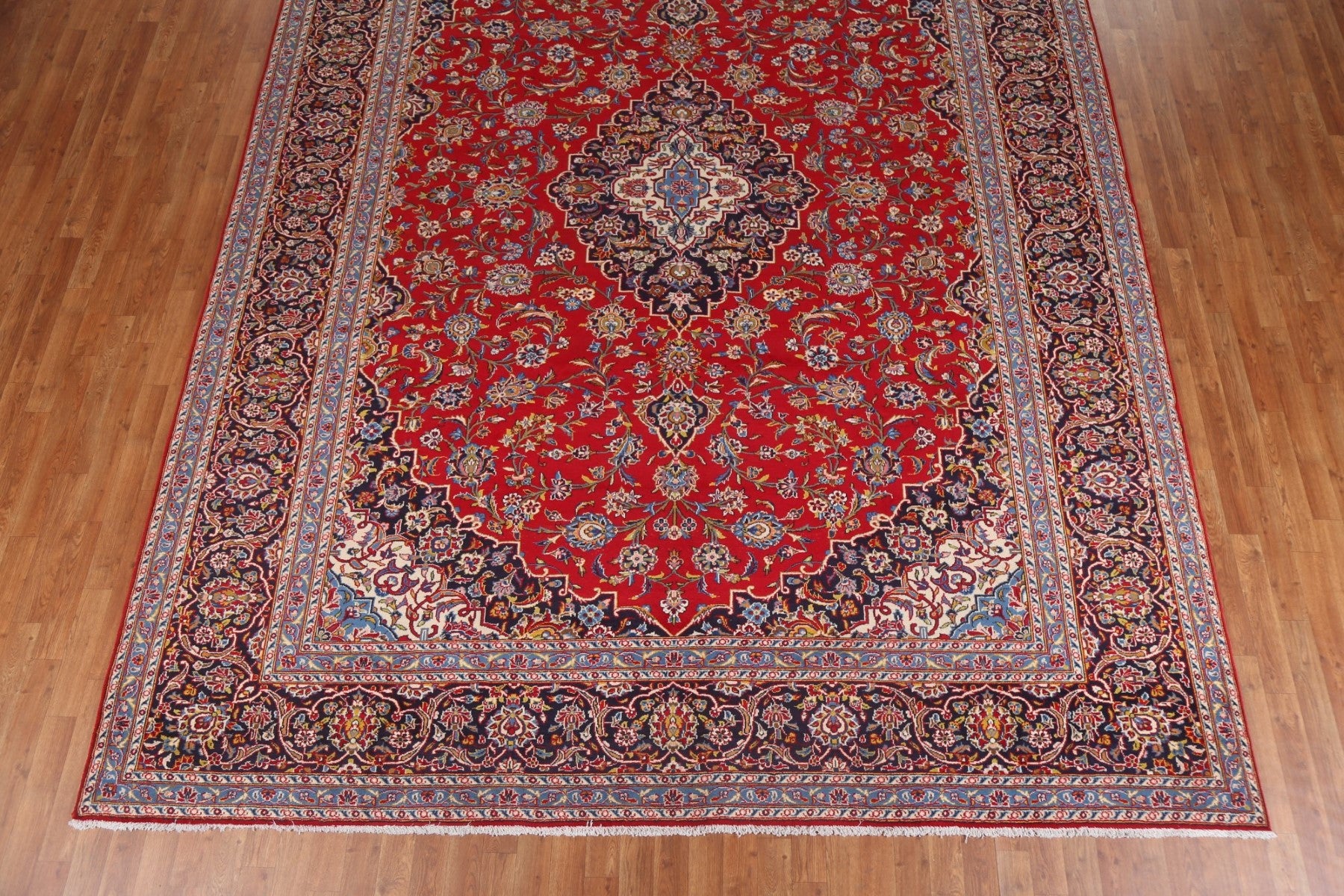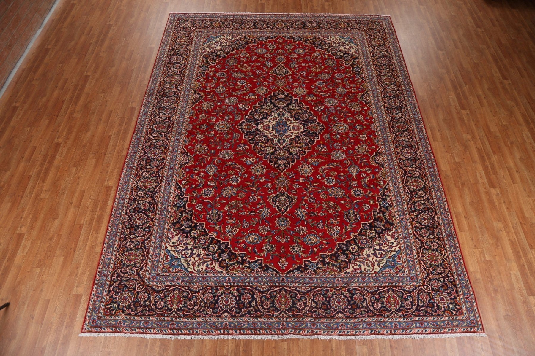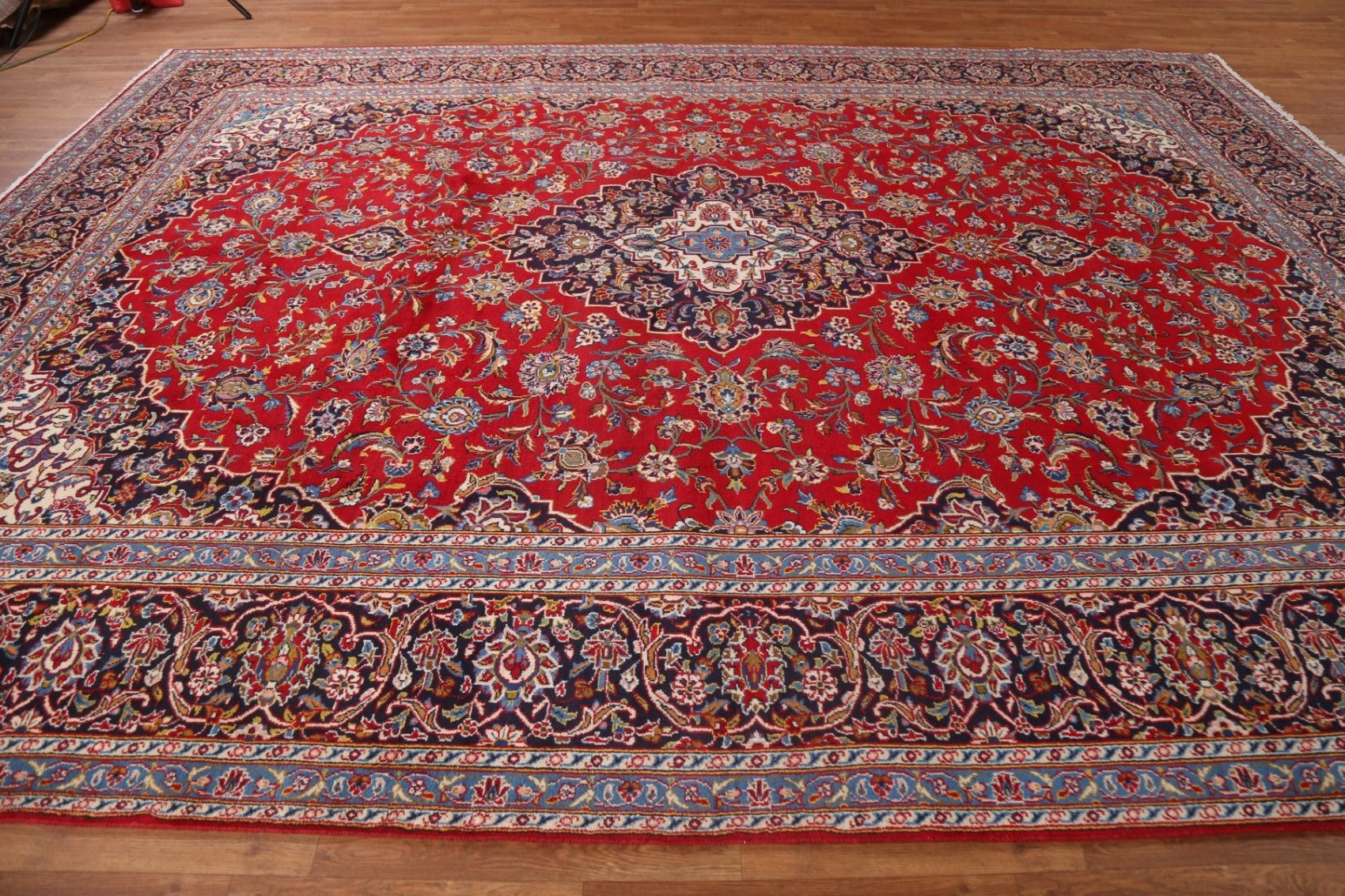 A Beautiful Genuine Persia ( Persia ) Kashan rug is Hand Knotted by skillful weavers in Persia ( Persia ) with 100% Wool Material. This rug is in Excellent condition. dimensions are 13' 0'' X 9' 10'' in foot and 396 X 300 in centimeter. the primary color is Red.