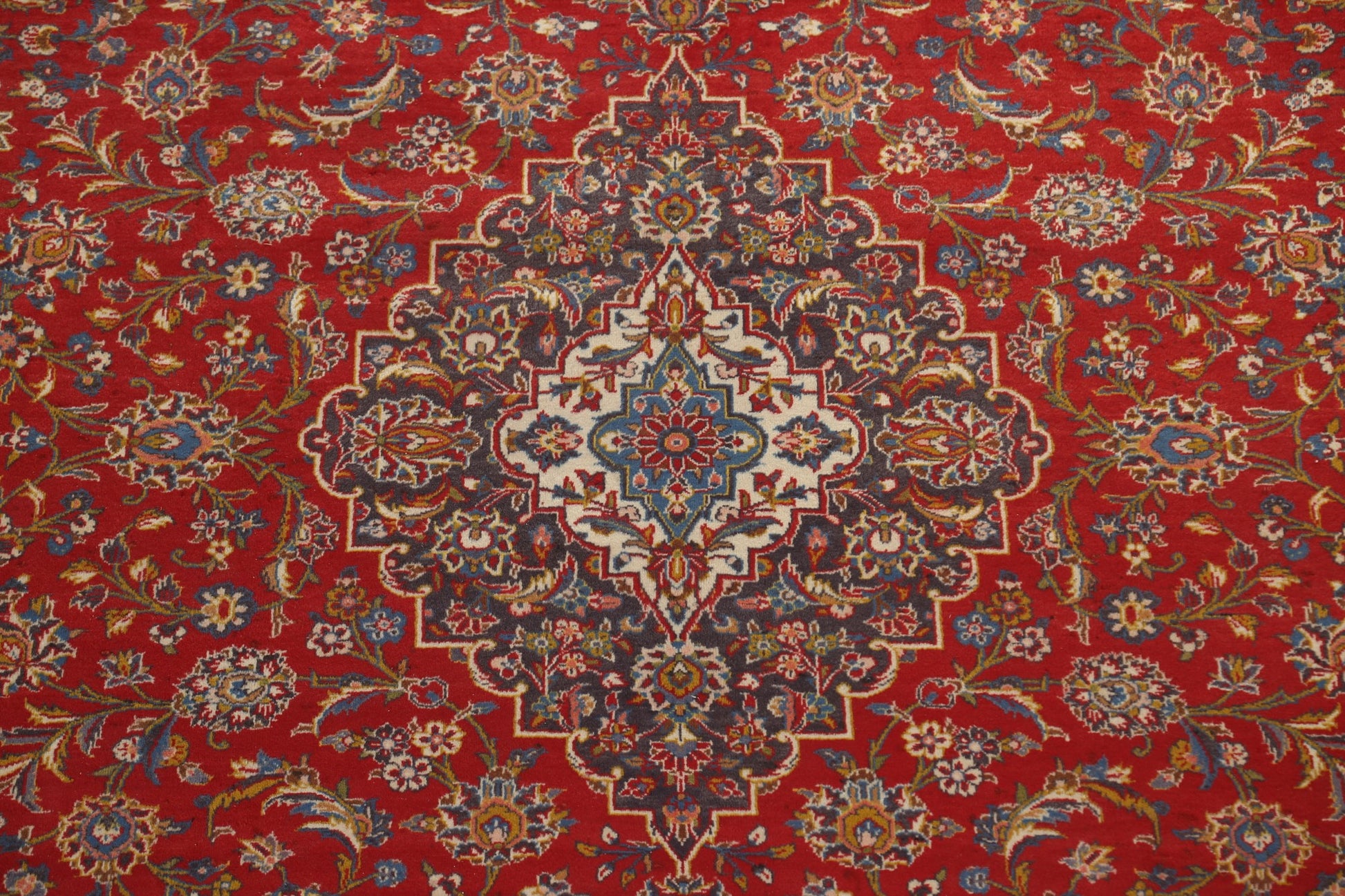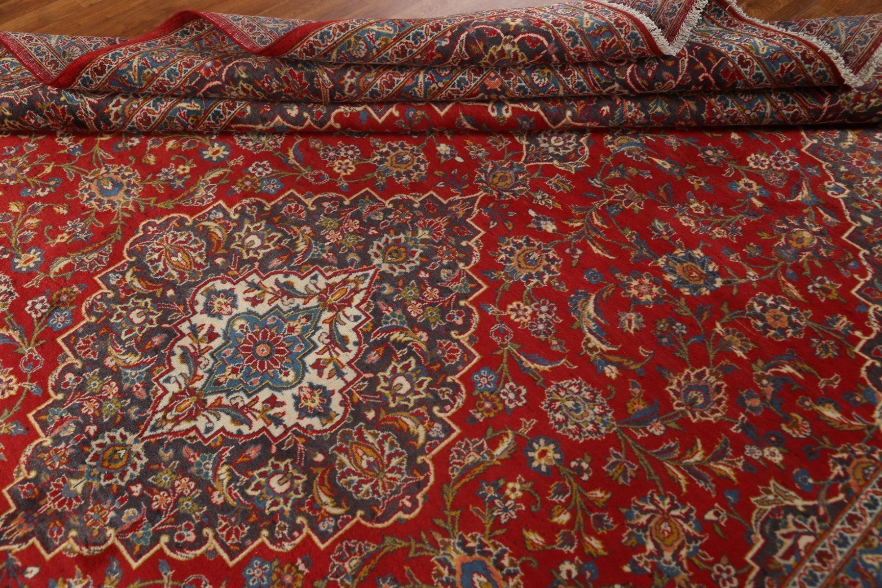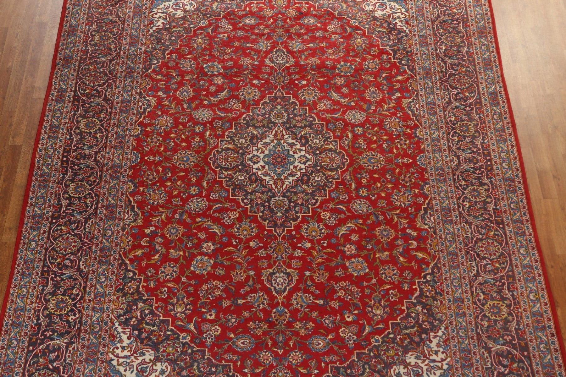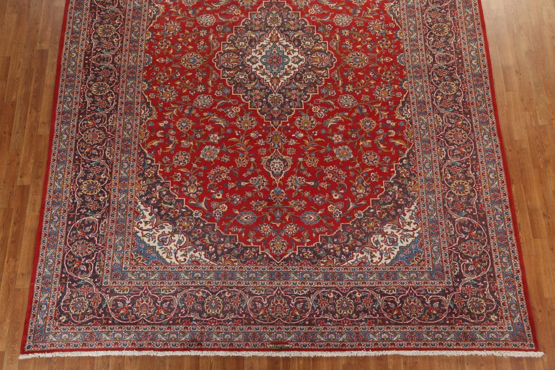 A Beautiful Genuine Persia ( Persia ) Kashan rug is Hand Knotted by skillful weavers in Persia ( Persia ) with 100% Wool Material. This rug is in Very Good condition. dimensions are 12' 9'' X 9' 7'' in foot and 389 X 292 in centimeter. the primary color is Red.