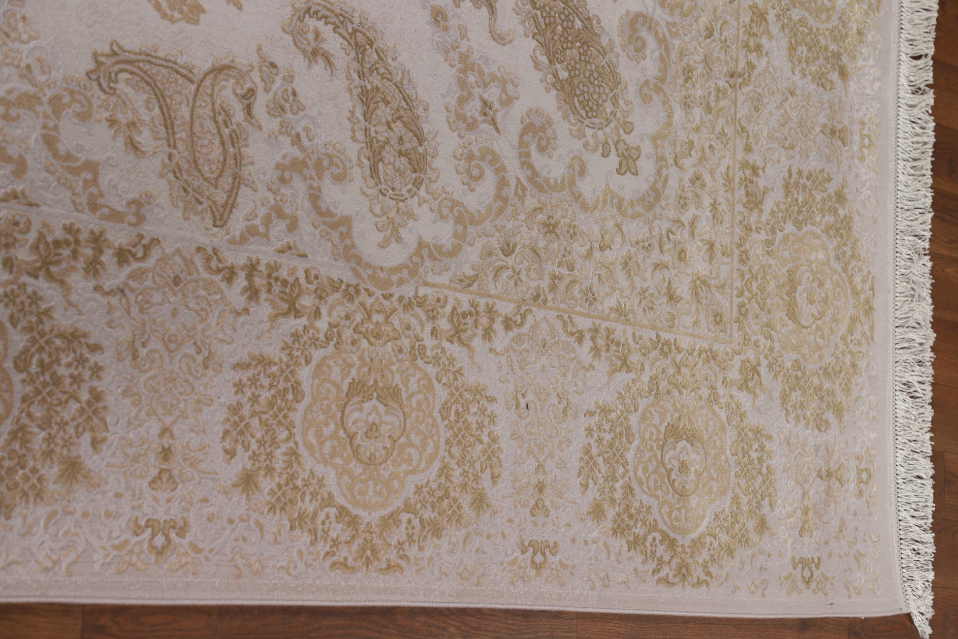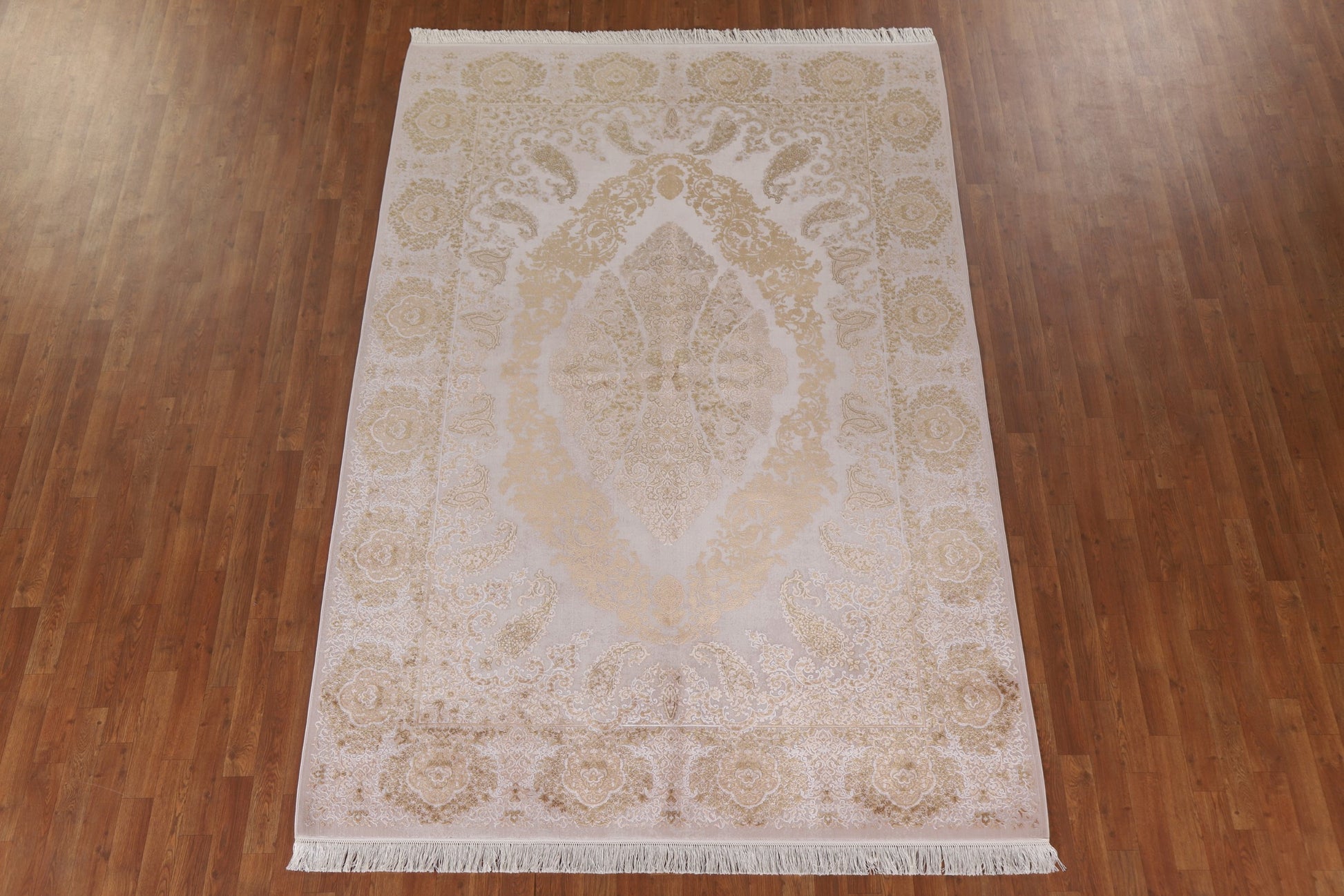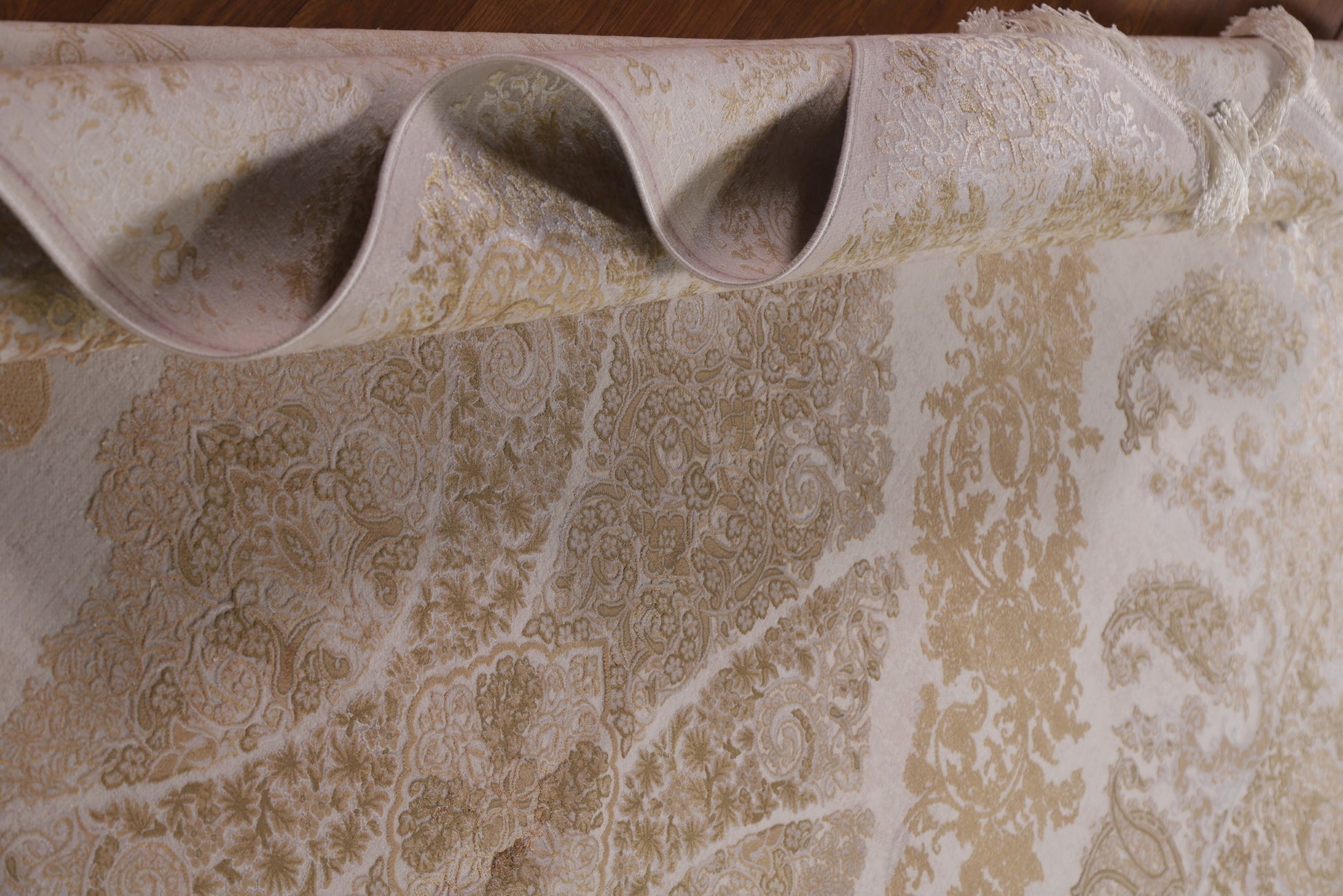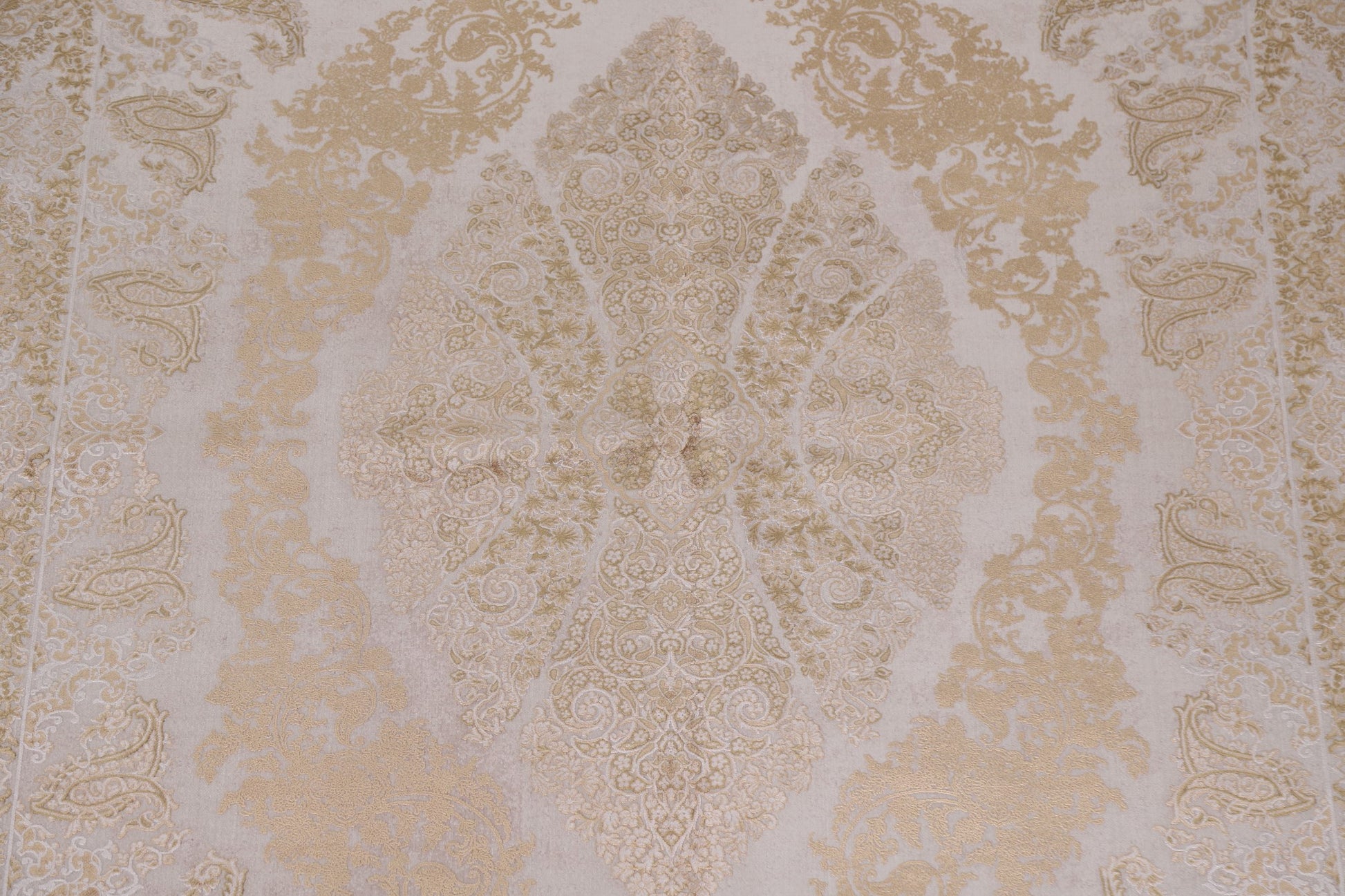 A Beautiful Genuine Turkey Qum rug is Machine Made by skillful weavers in Turkey with 90% Silk - 10% Polyester Material. This rug is in condition. dimensions are 9' 7'' X 6' 5'' in foot and 292 X 196 in centimeter. the primary color is Beige & Ivories.