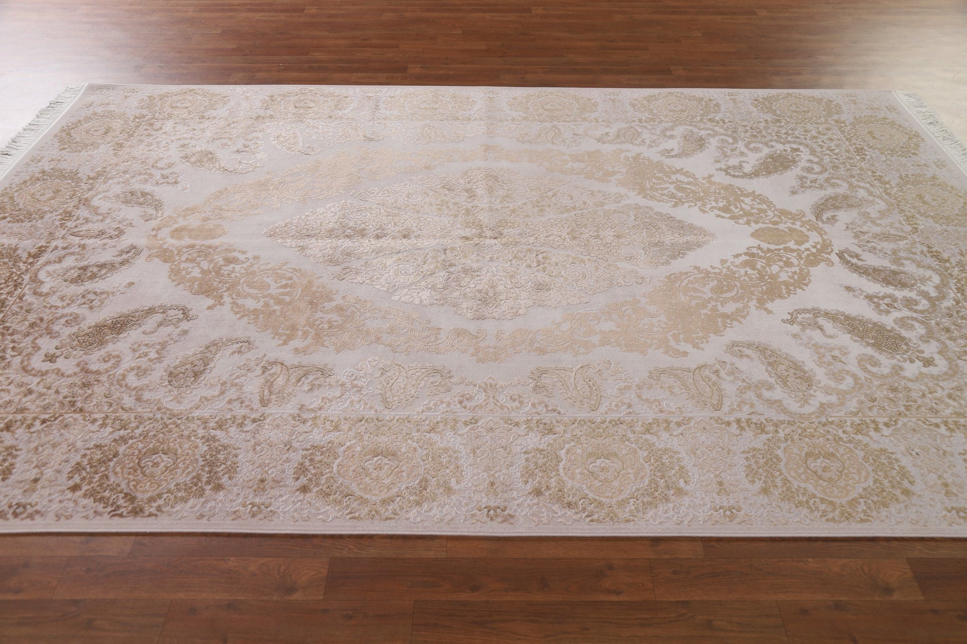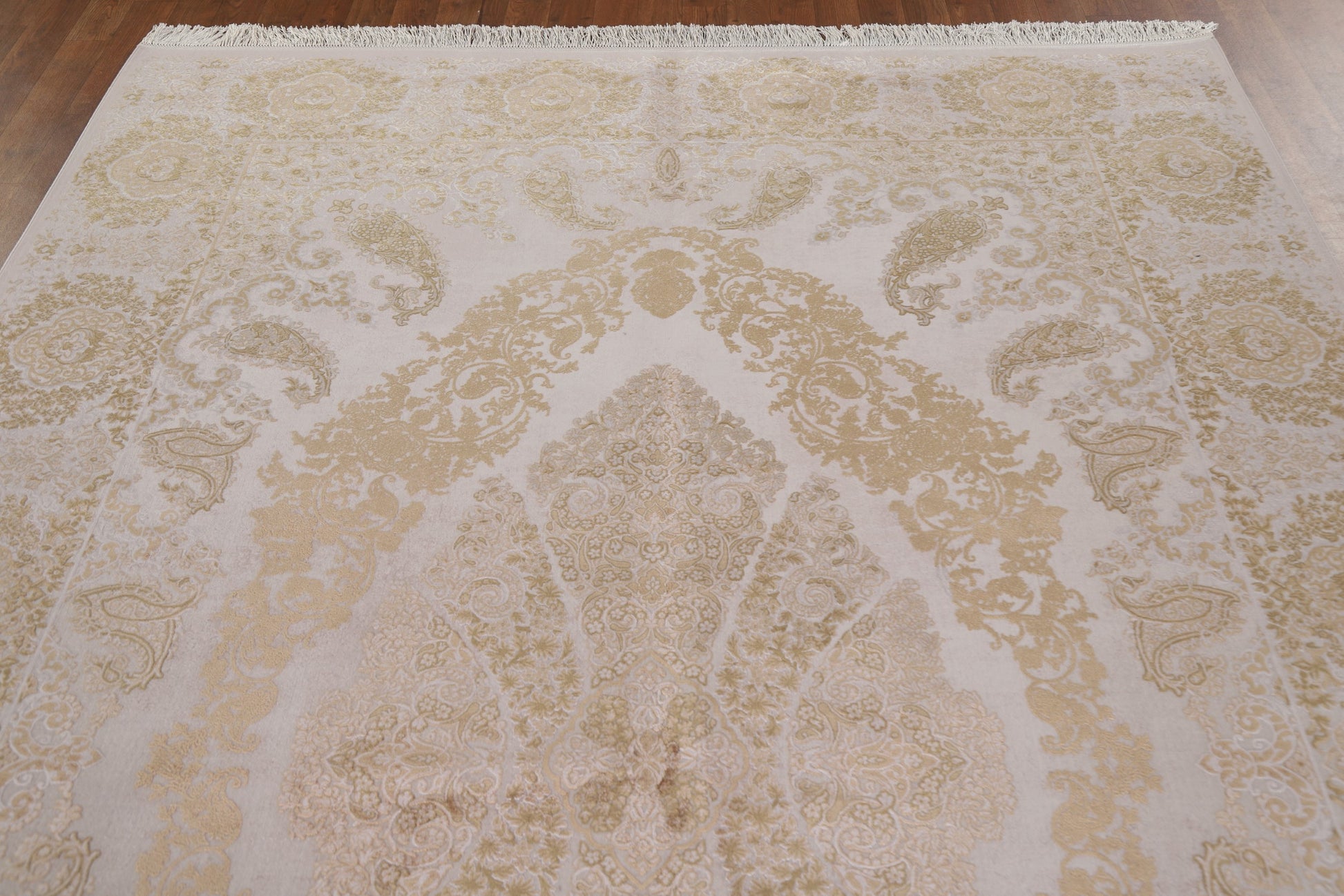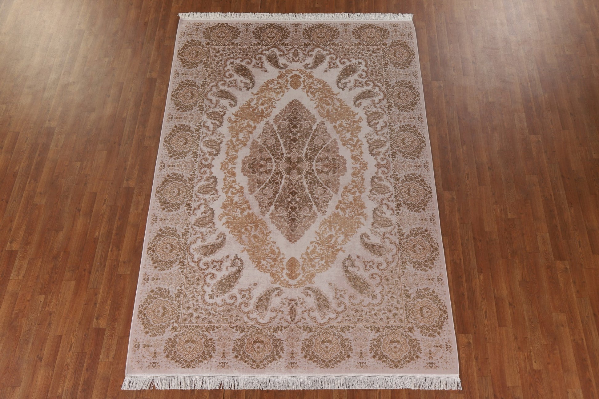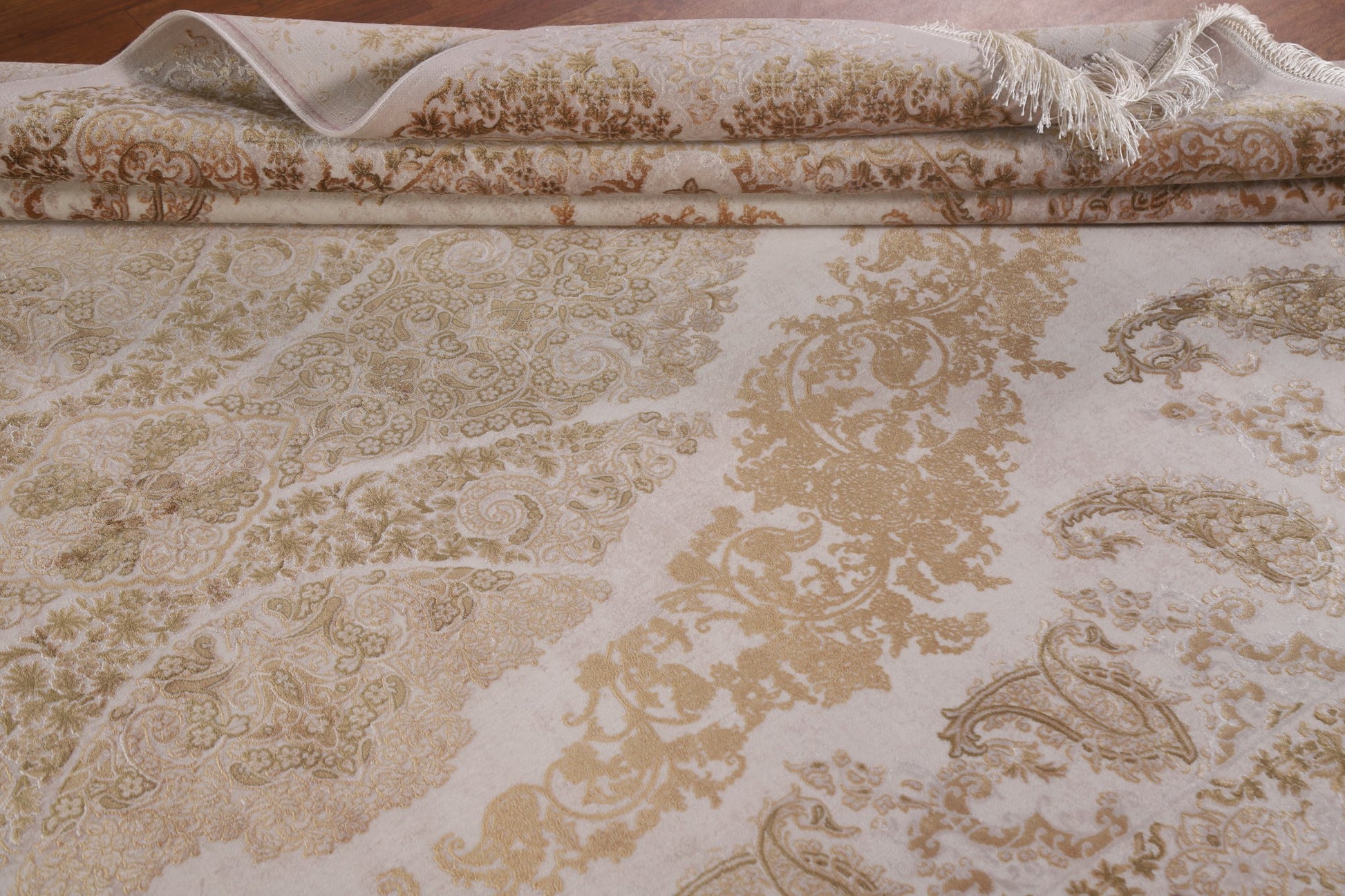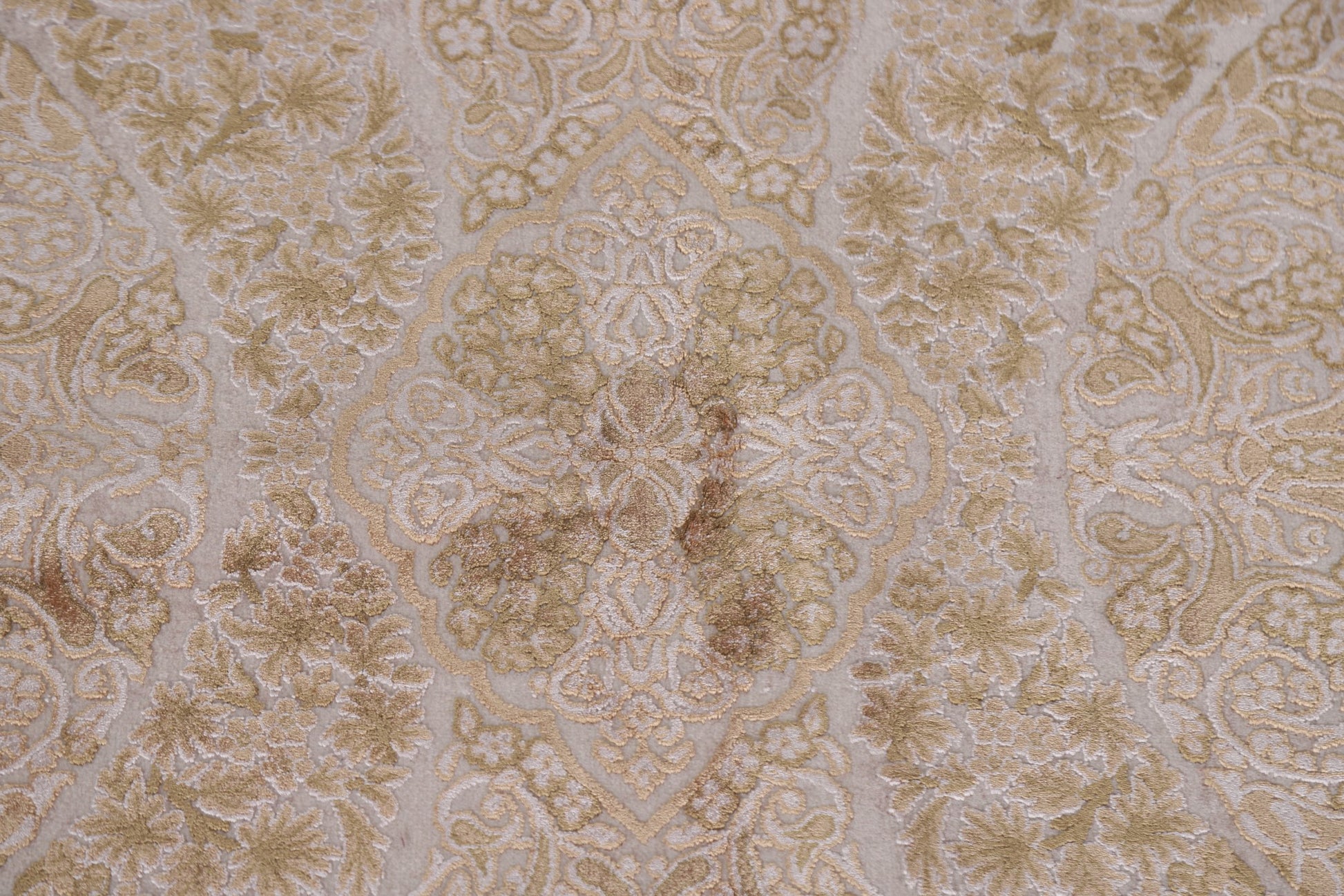 A Beautiful Genuine Turkey Qum rug is Machine Made by skillful weavers in Turkey with 90% Silk - 10% Polyester Material. This rug is in condition. dimensions are 9' 7'' X 6' 5'' in foot and 292 X 196 in centimeter. the primary color is Beige & Ivories.