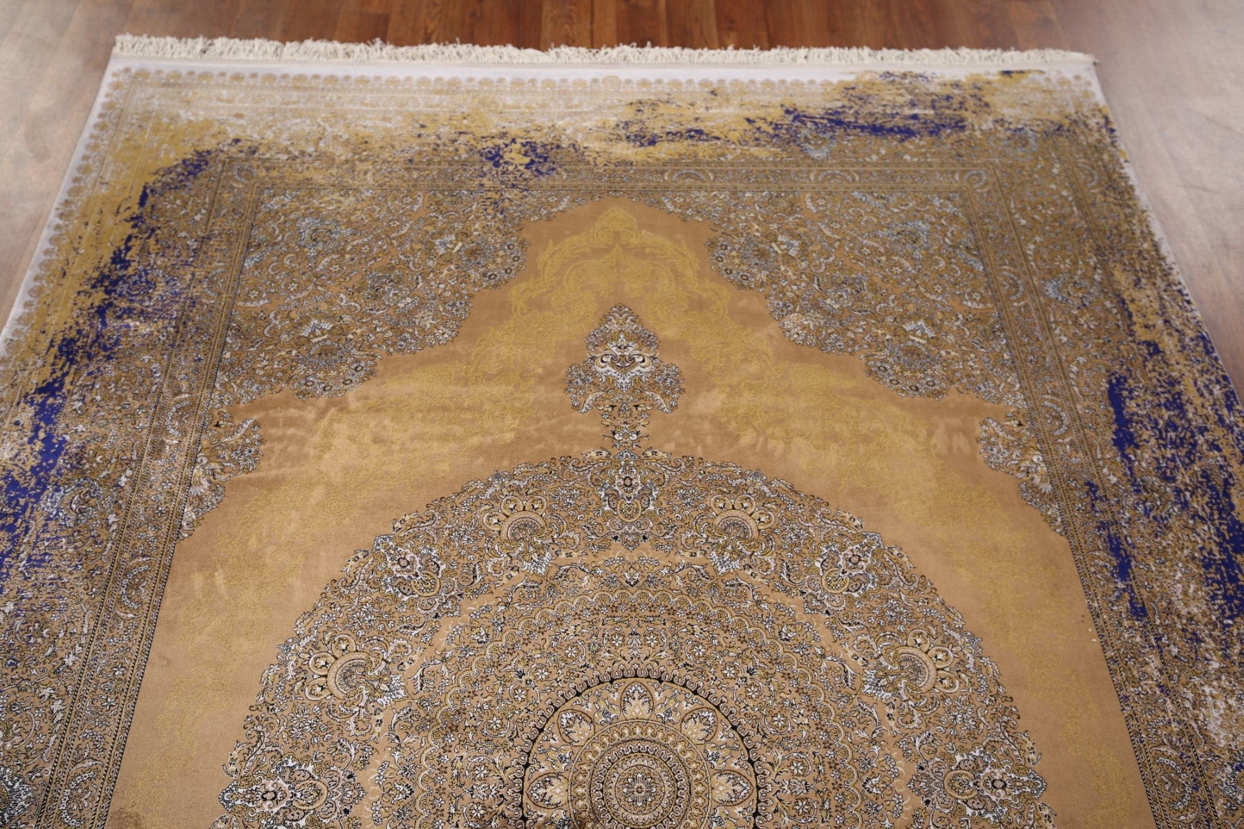 A Beautiful Genuine Turkey Qum rug is Machine Made by skillful weavers in Turkey with 90% Silk - 10% Polyester Material. This rug is in condition. dimensions are 7' 7'' X 5' 1'' in foot and 231 X 155 in centimeter. the primary color is Yellow & Gold.