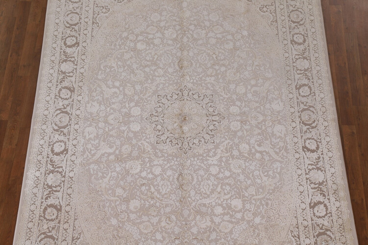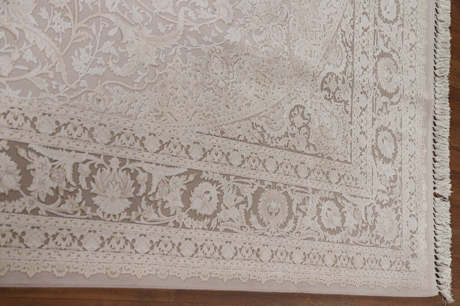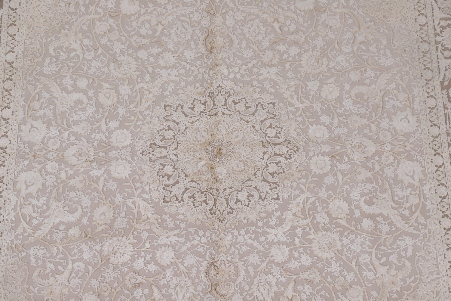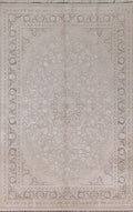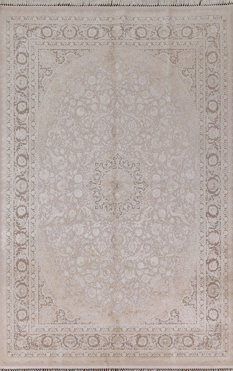 A Beautiful Genuine Turkey Tabriz rug is Machine Made by skillful weavers in Turkey with 90% Silk - 10% Polyester Material. This rug is in condition. dimensions are 9' 7'' X 6' 5'' in foot and 292 X 196 in centimeter. the primary color is Beige & Ivories.