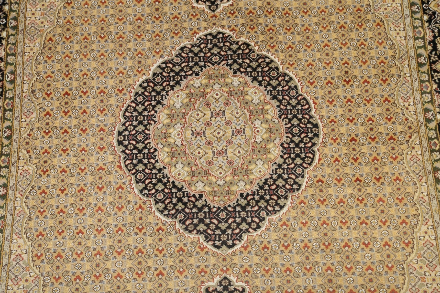 A Beautiful Genuine Pakistan Tabriz rug is Hand Knotted by skillful weavers in Pakistan with 100% Wool Material. This rug is in New, First Quality condition. dimensions are 9' 2'' X 6' 2'' in foot and 279 X 188 in centimeter. the primary color is Brown.