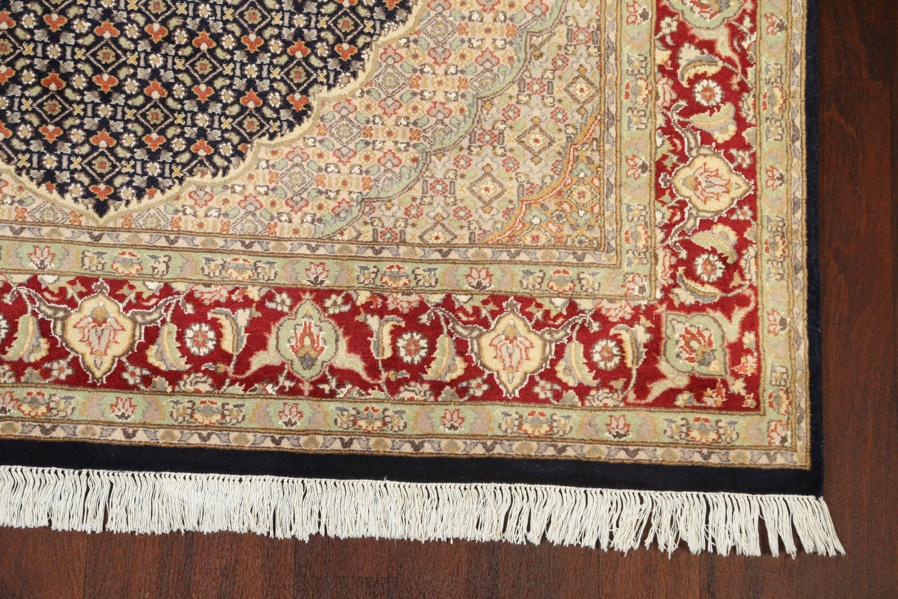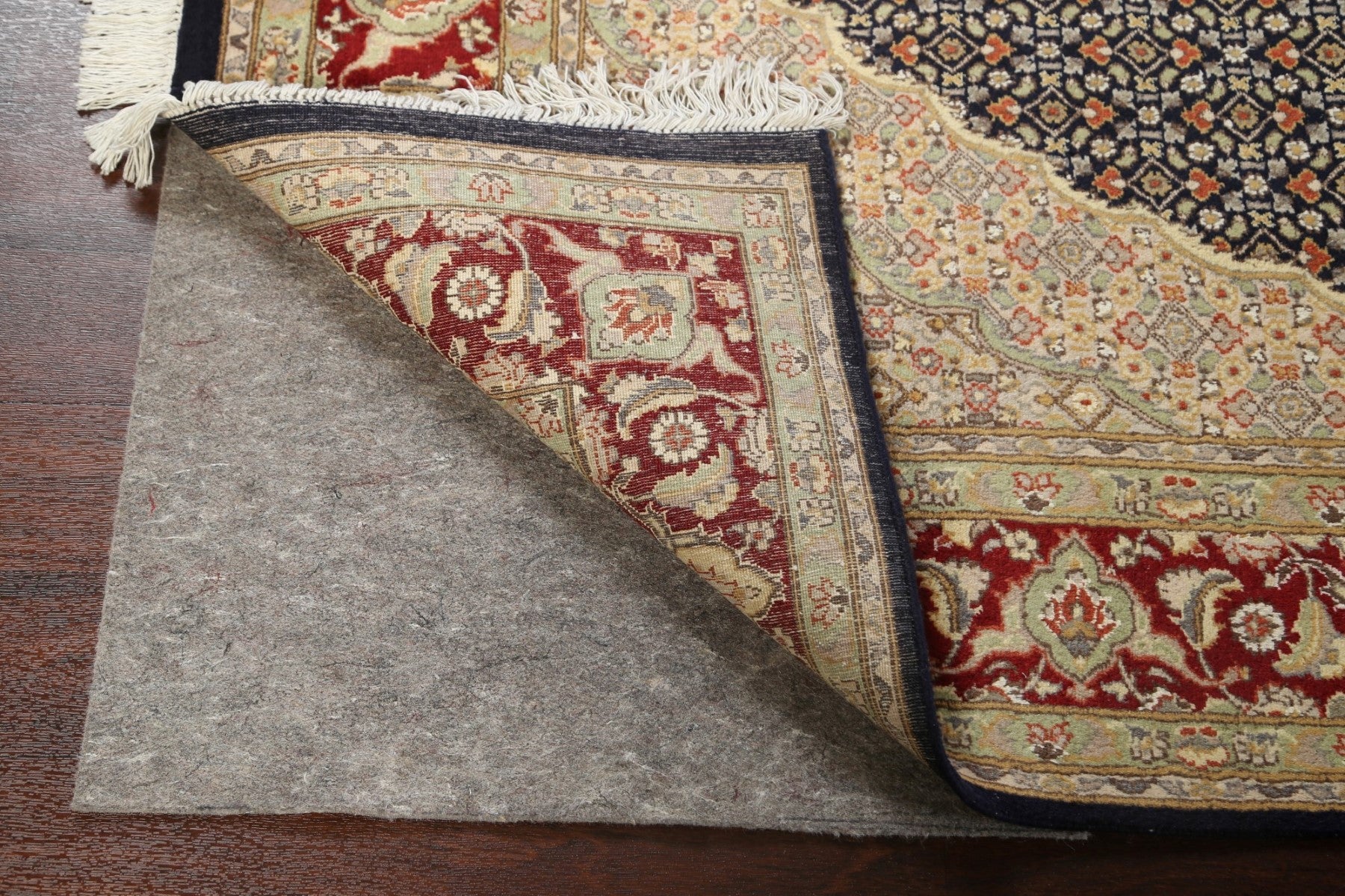 A Beautiful Genuine Pakistan Tabriz rug is Hand Knotted by skillful weavers in Pakistan with Wool & Silk Material. This rug is in New, First Quality condition. dimensions are 9' 3'' X 6' 0'' in foot and 282 X 183 in centimeter. the primary color is Navy Blue & Blues.