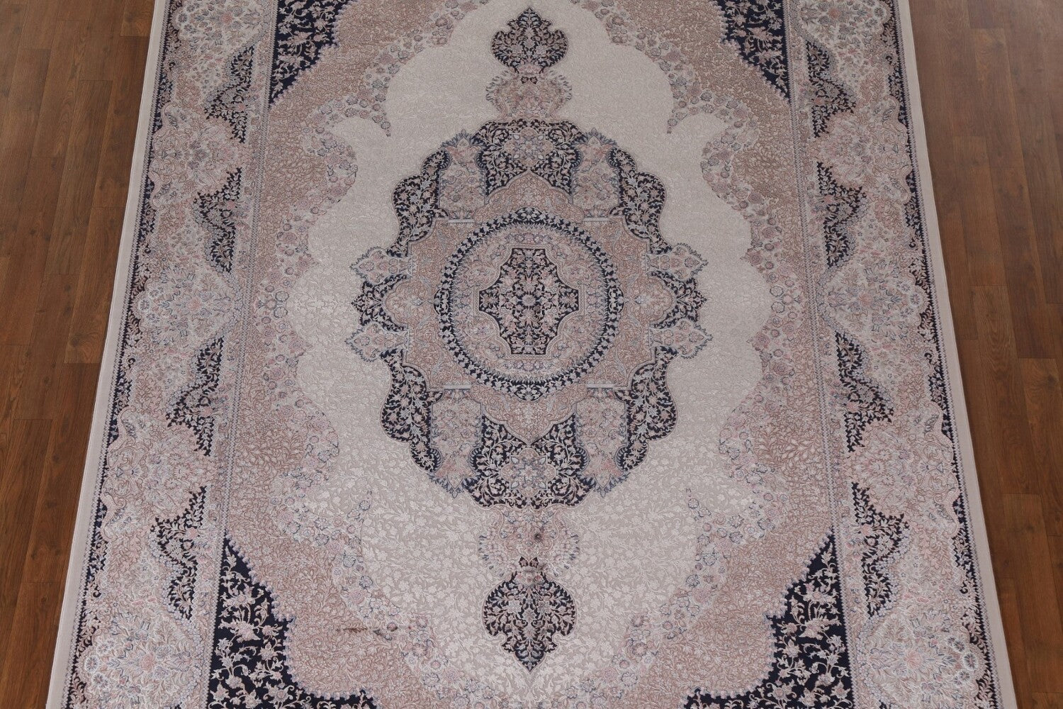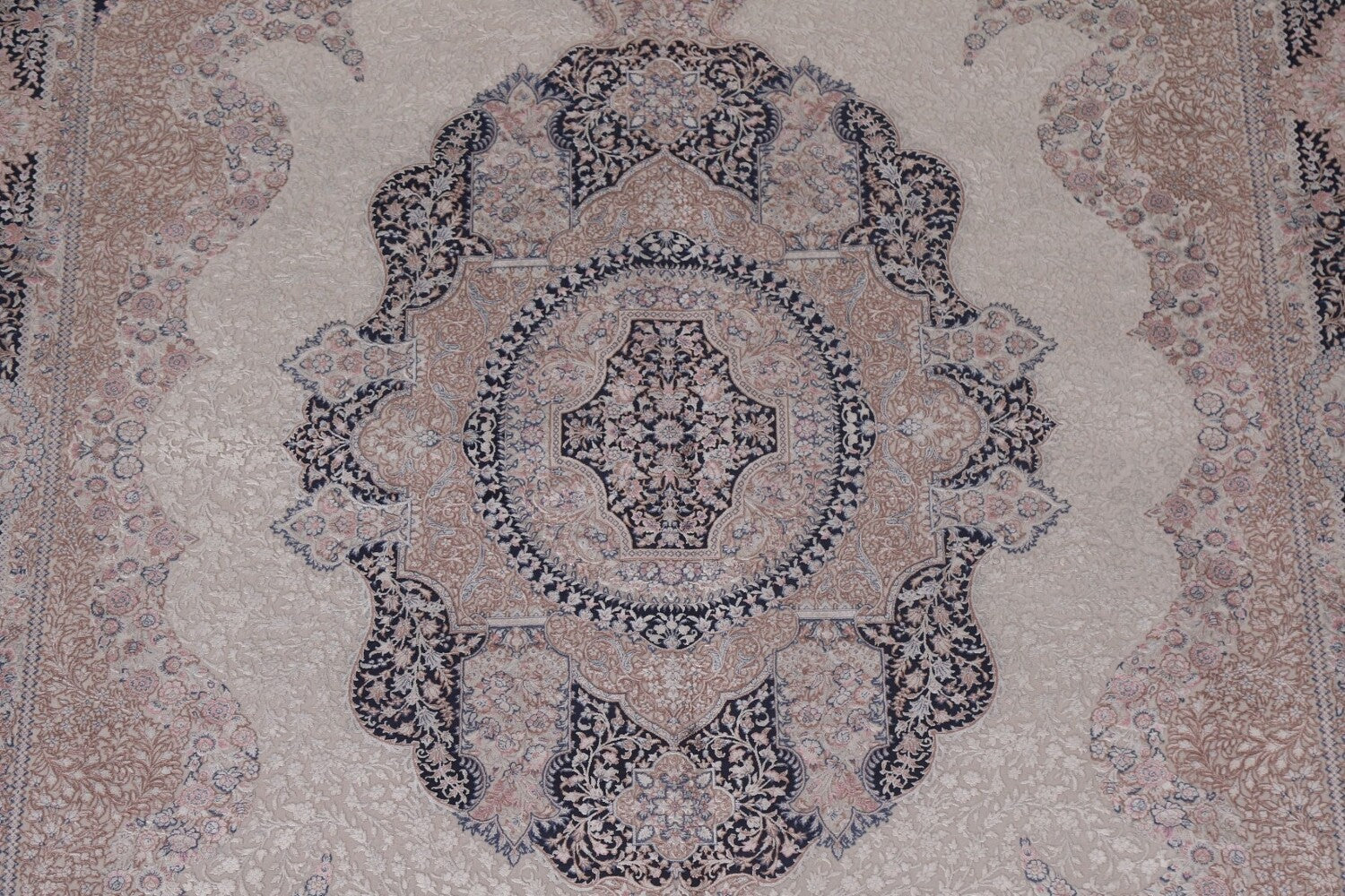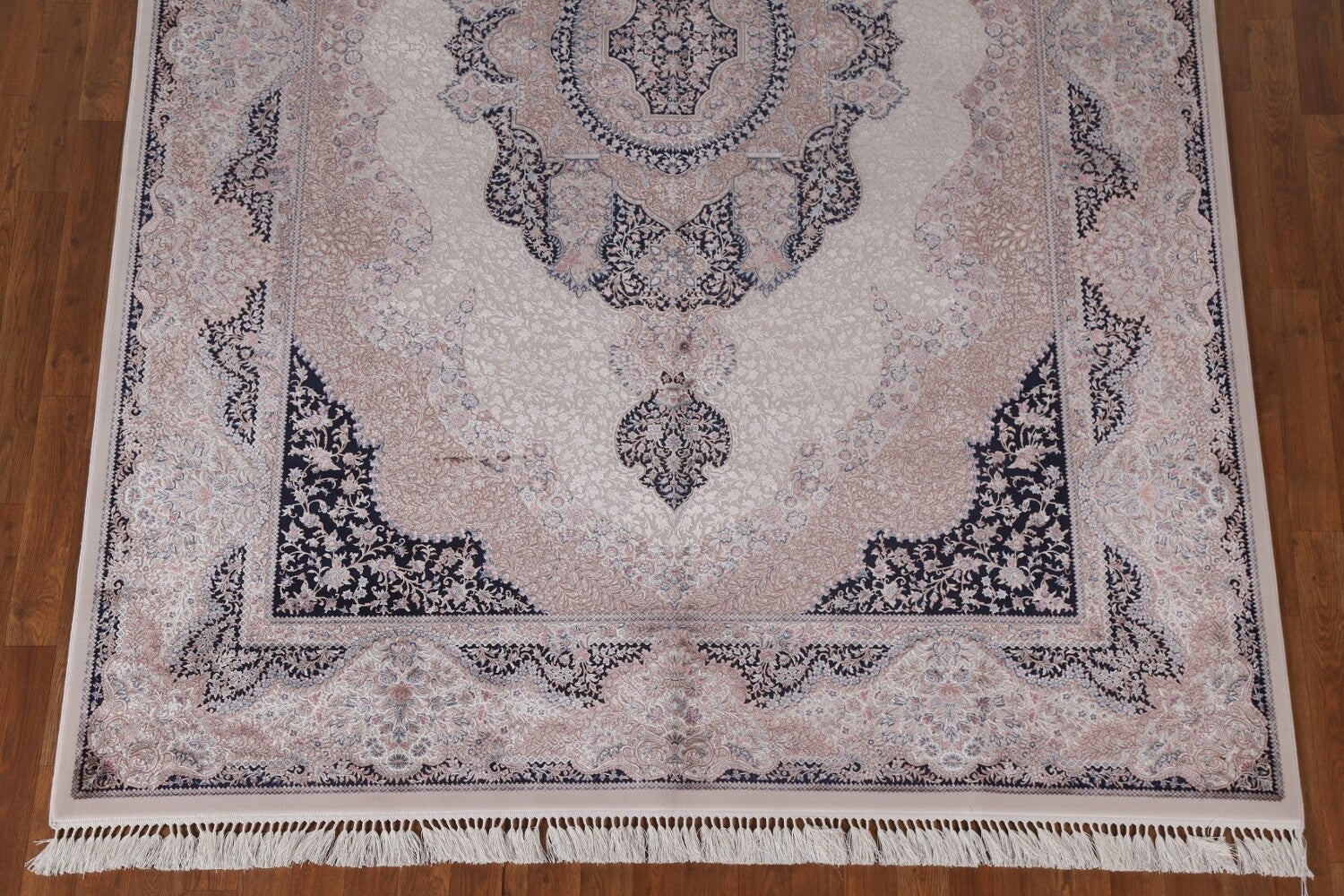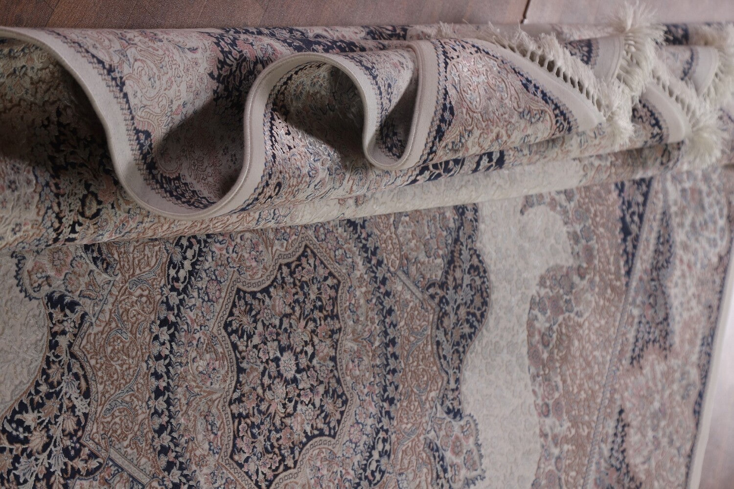 A Beautiful Genuine Turkey Tabriz rug is Machine Made by skillful weavers in Turkey with 90% Silk - 10% Polyester Material. This rug is in condition. dimensions are 9' 7'' X 6' 7'' in foot and 292 X 201 in centimeter. the primary color is Beige & Ivories.