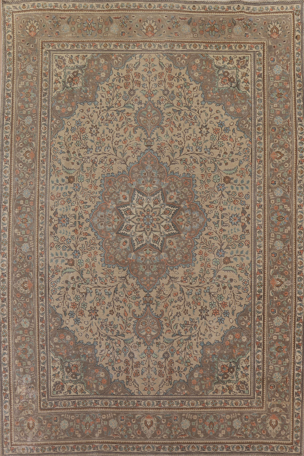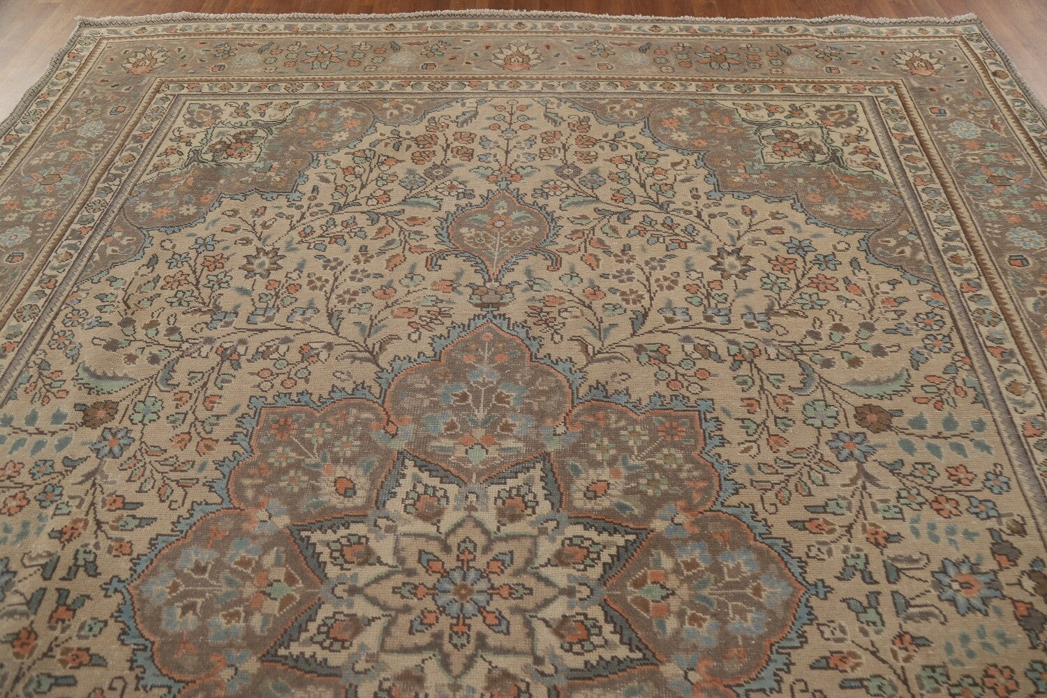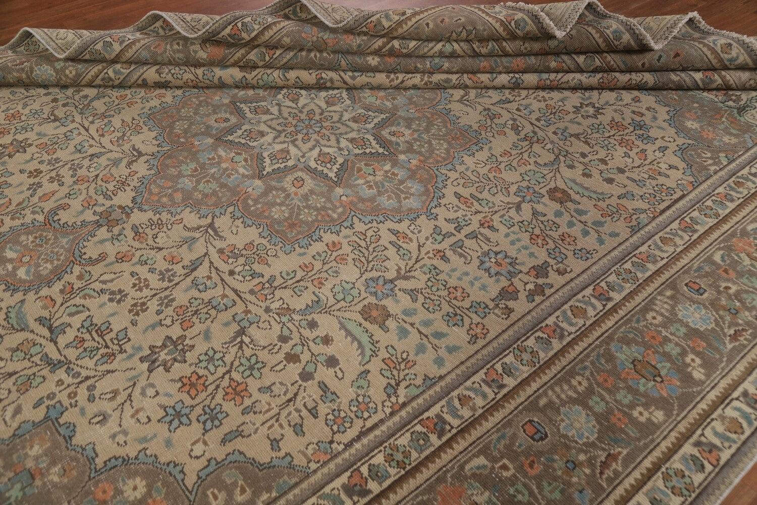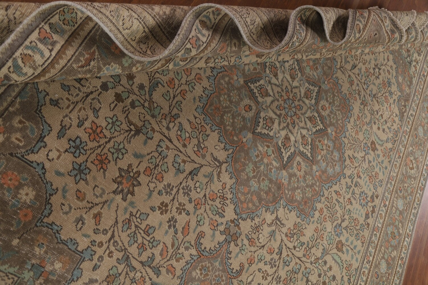 A Beautiful Genuine Persia ( Persia ) Tabriz rug is Hand Knotted by skillful weavers in Persia ( Persia ) with 100% Wool Material. This rug is in Very Good (Evenly Low Pile) condition. dimensions are 12' 6'' X 9' 8'' in foot and 381 X 295 in centimeter. the primary color is Beige & Ivories.
