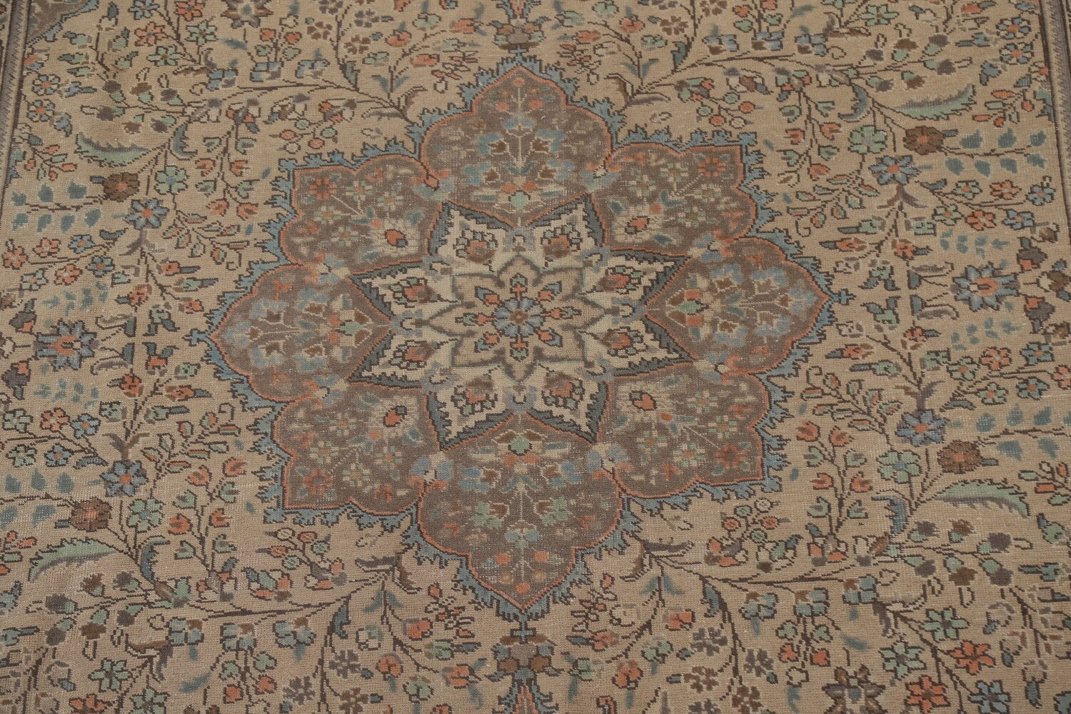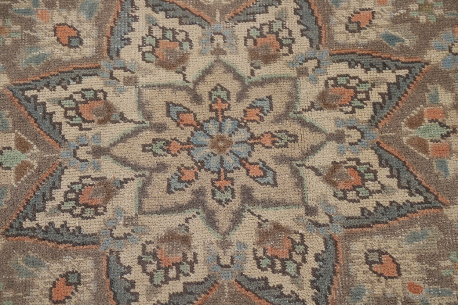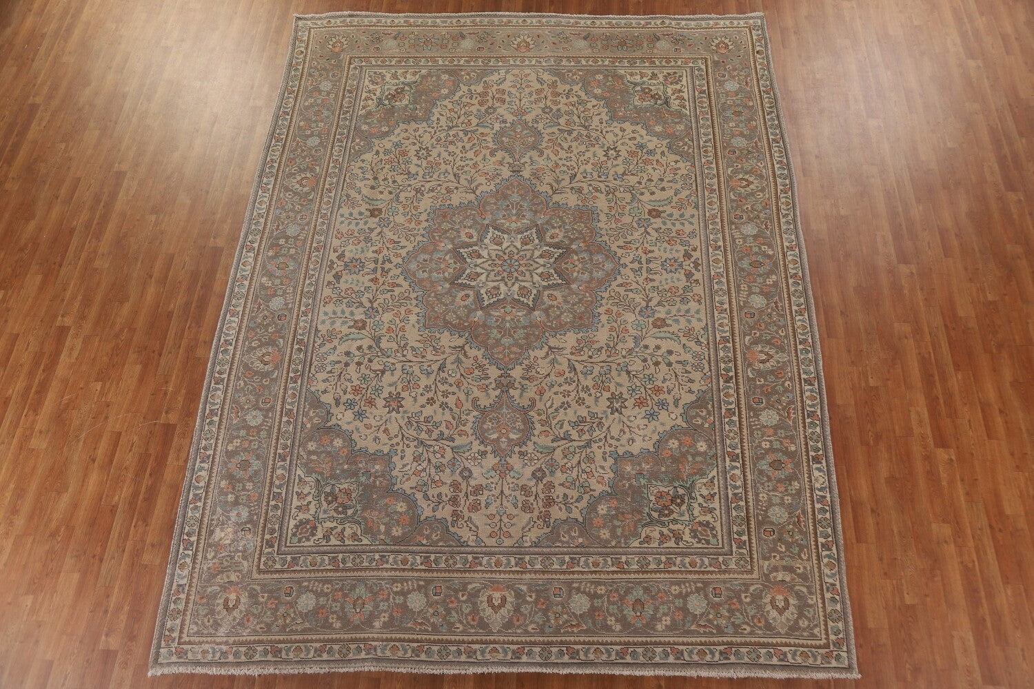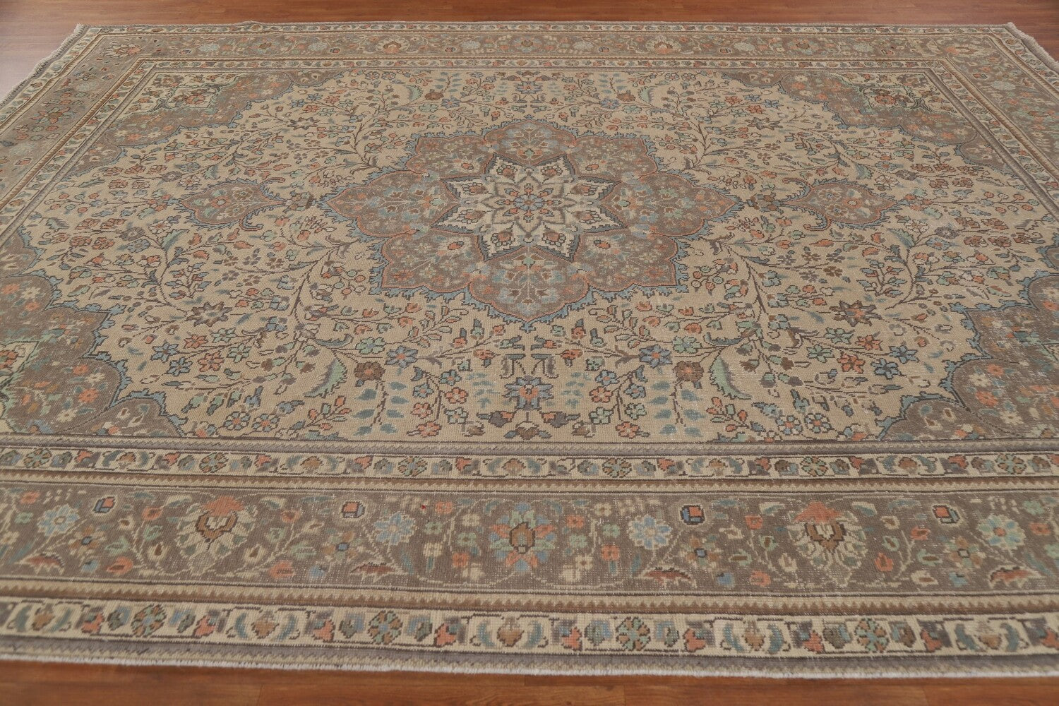A Beautiful Genuine Persia ( Persia ) Tabriz rug is Hand Knotted by skillful weavers in Persia ( Persia ) with 100% Wool Material. This rug is in Very Good (Evenly Low Pile) condition. dimensions are 12' 6'' X 9' 8'' in foot and 381 X 295 in centimeter. the primary color is Beige & Ivories.