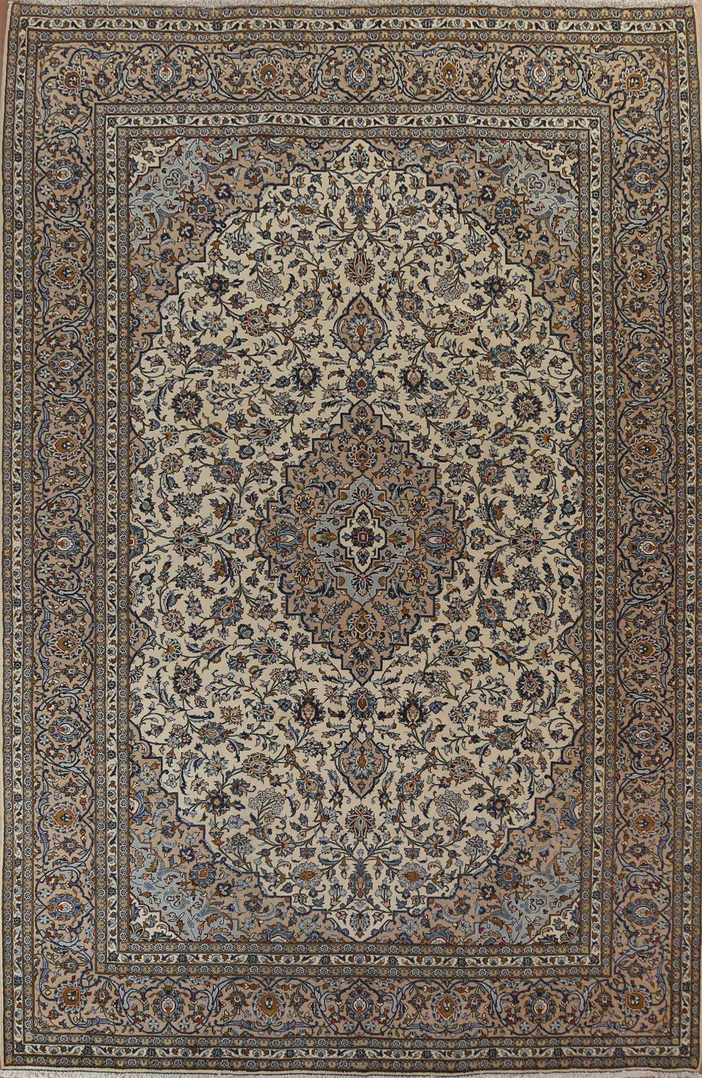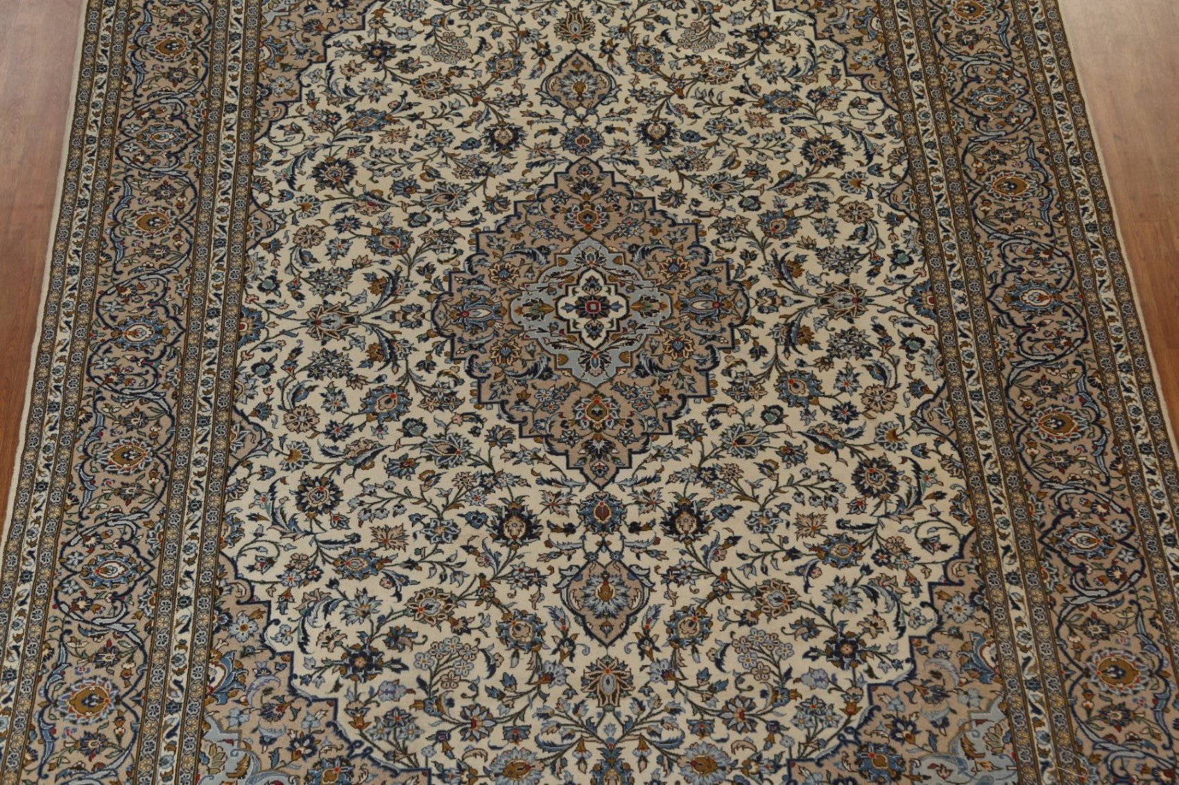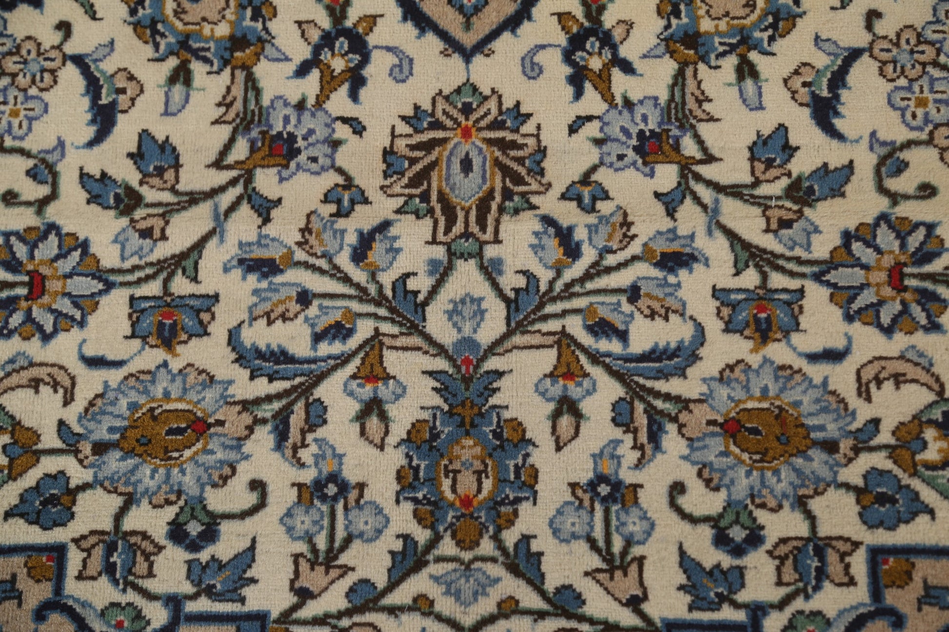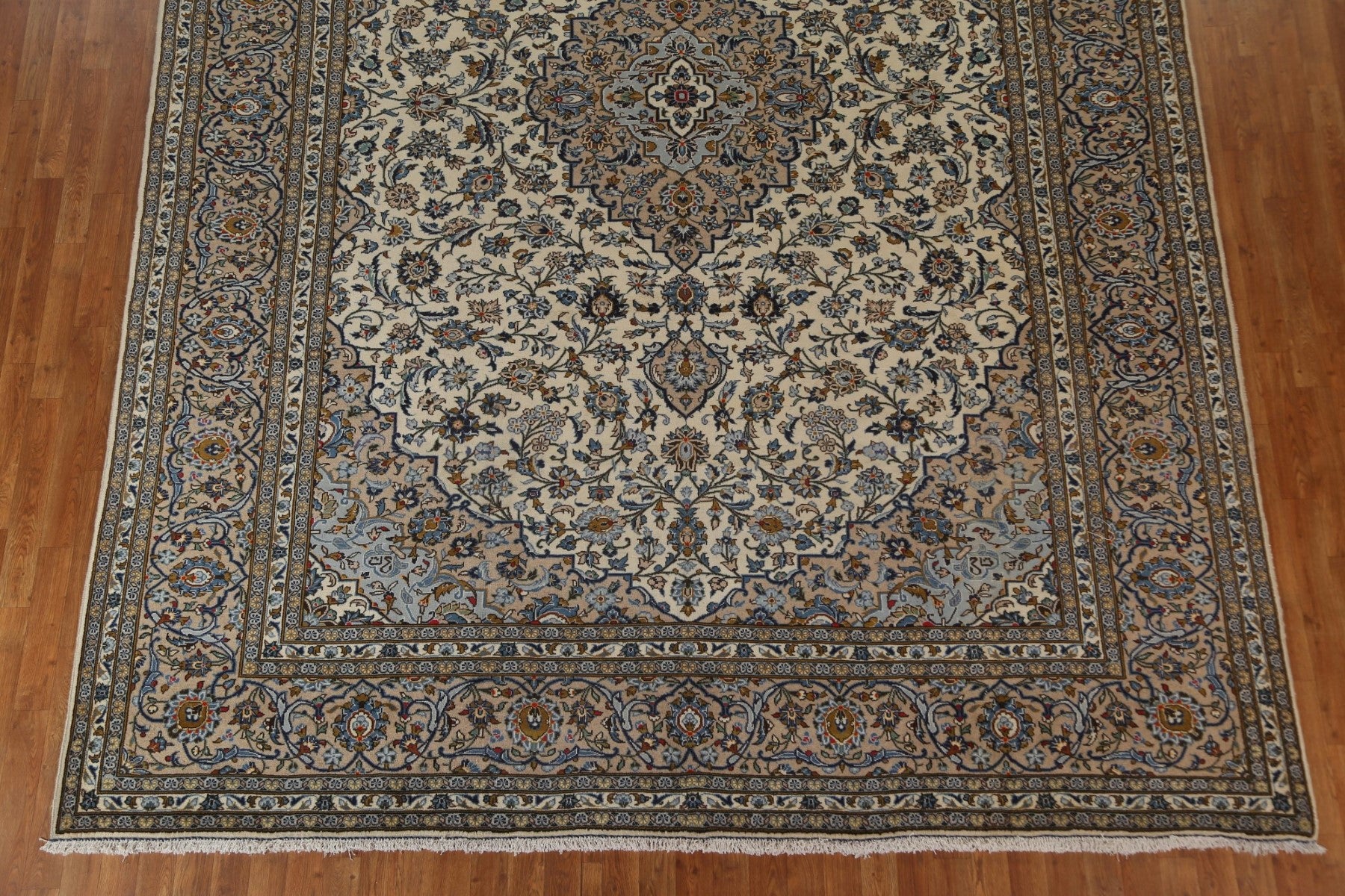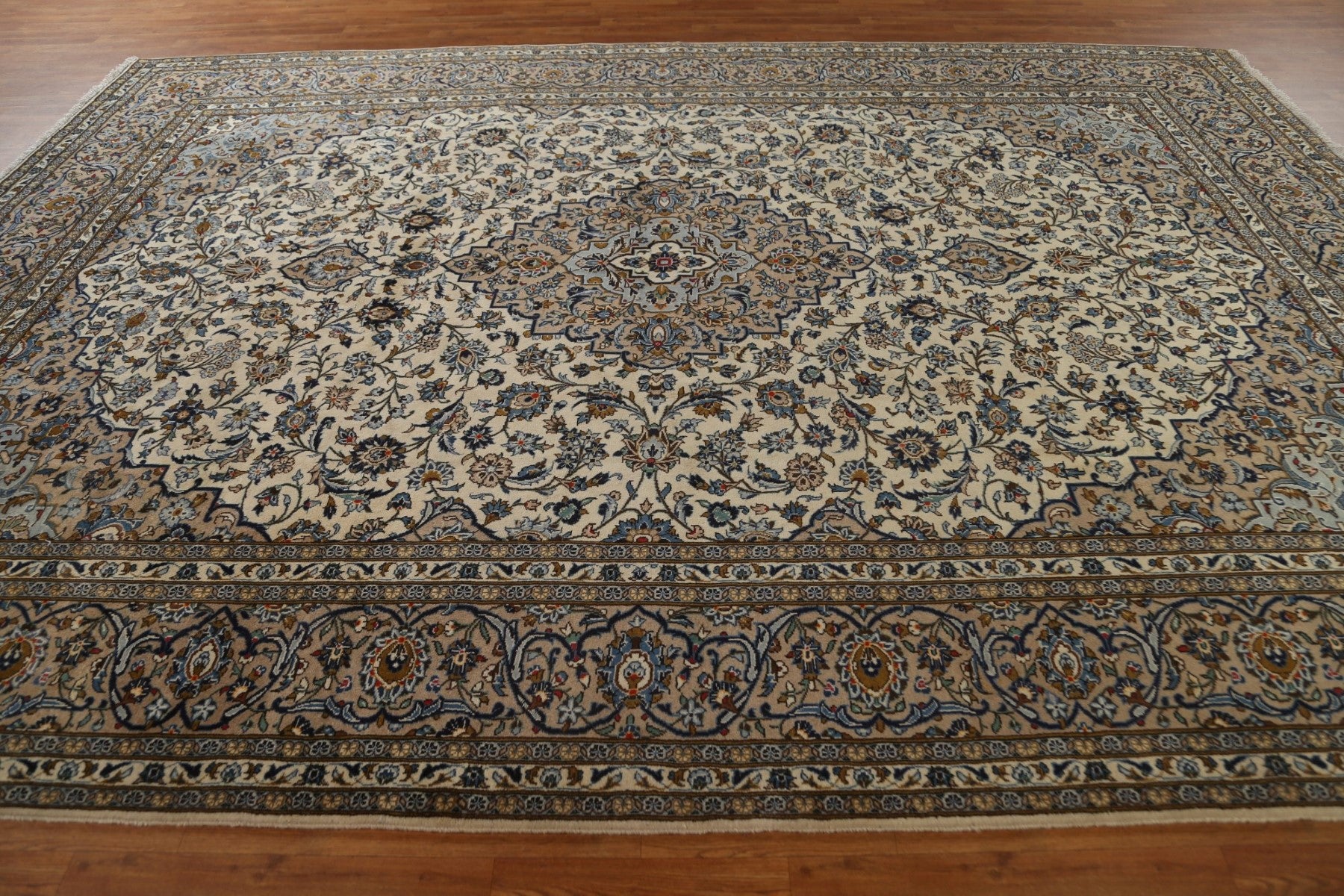 A Beautiful Genuine Persia ( Persia ) Kashan rug is Hand Knotted by skillful weavers in Persia ( Persia ) with 100% Wool Material. This rug is in Very Good condition. dimensions are 13' 3'' X 9' 6'' in foot and 404 X 290 in centimeter. the primary color is Beige & Ivories.
