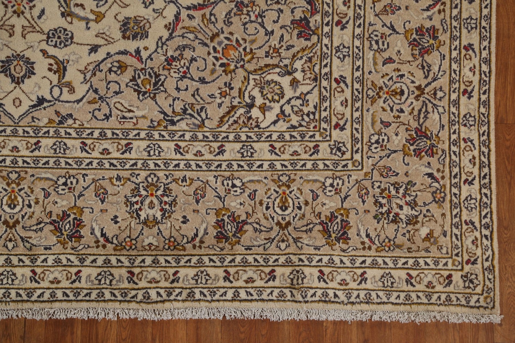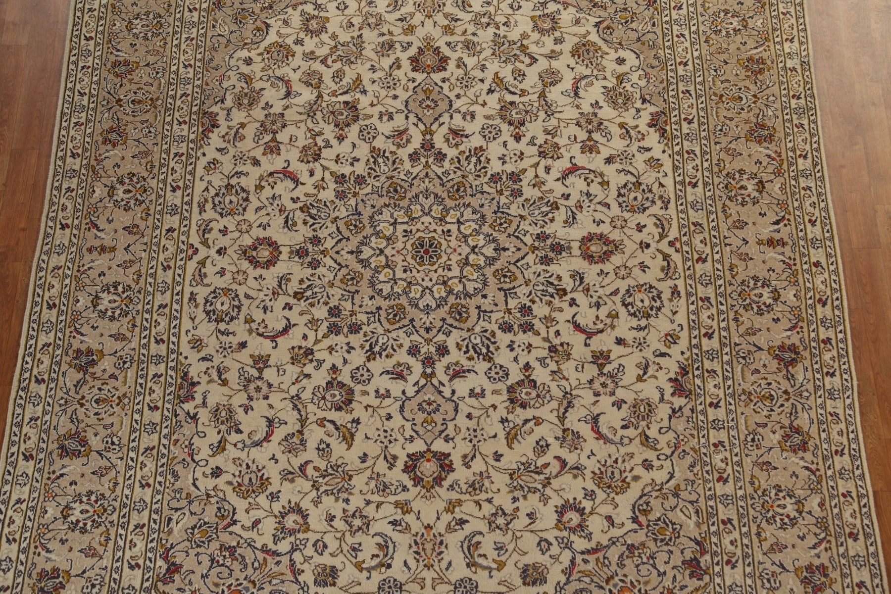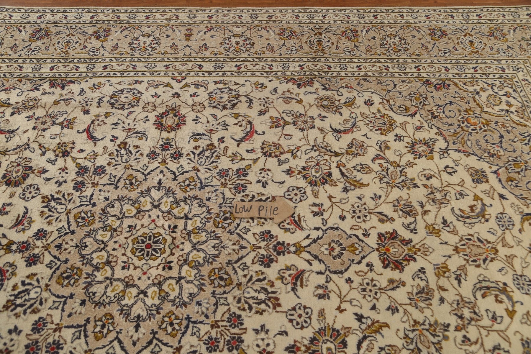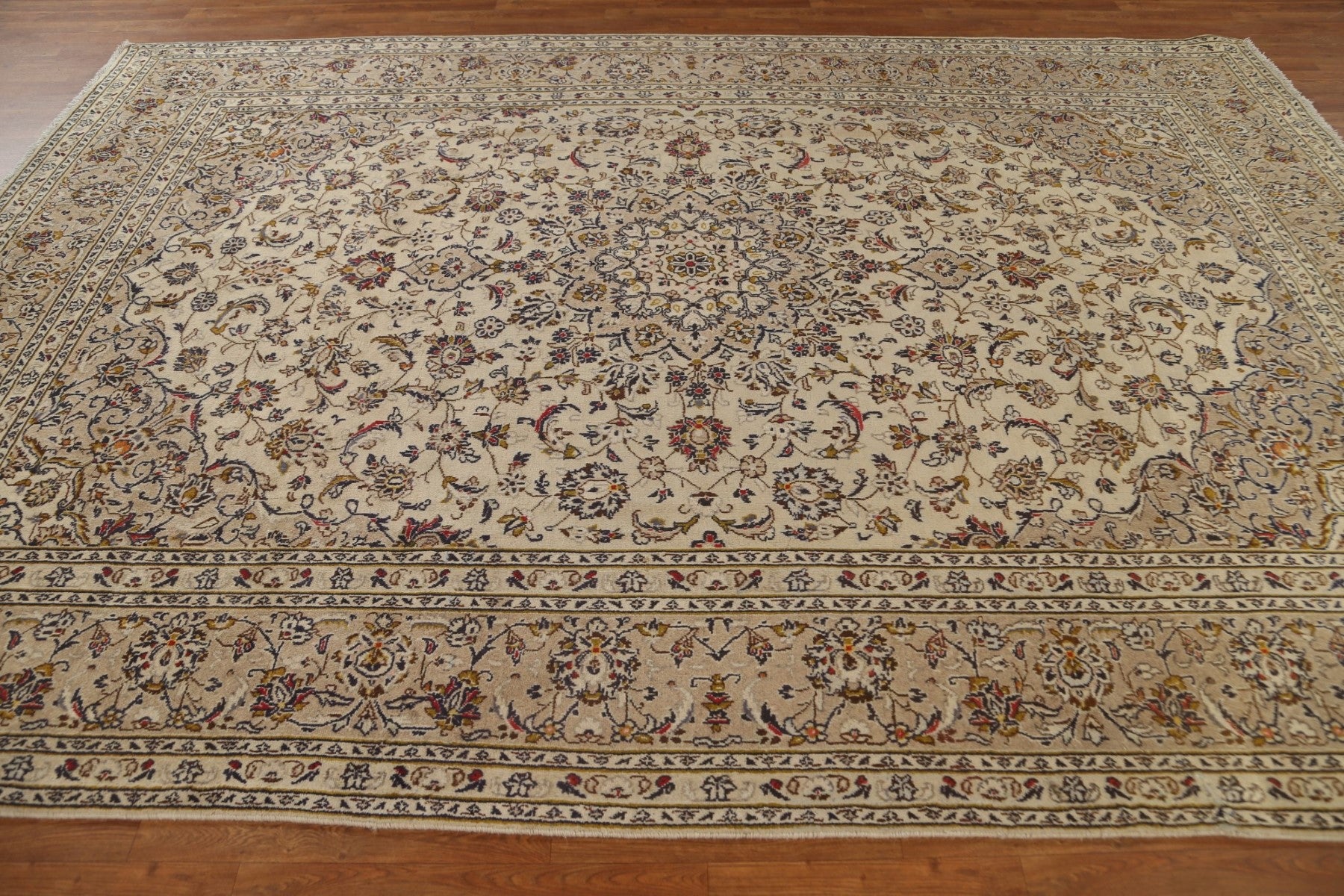 A Beautiful Genuine Persia ( Persia ) Kashan rug is Hand Knotted by skillful weavers in Persia ( Persia ) with 100% Wool Material. This rug is in Very Good (Low Pile) condition. dimensions are 11' 1'' X 7' 10'' in foot and 338 X 239 in centimeter. the primary color is Beige & Ivories.