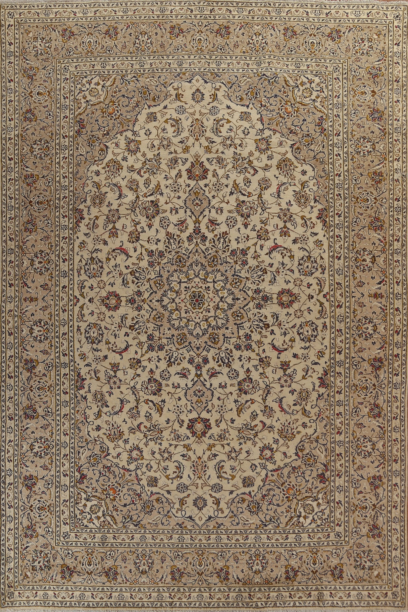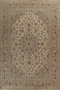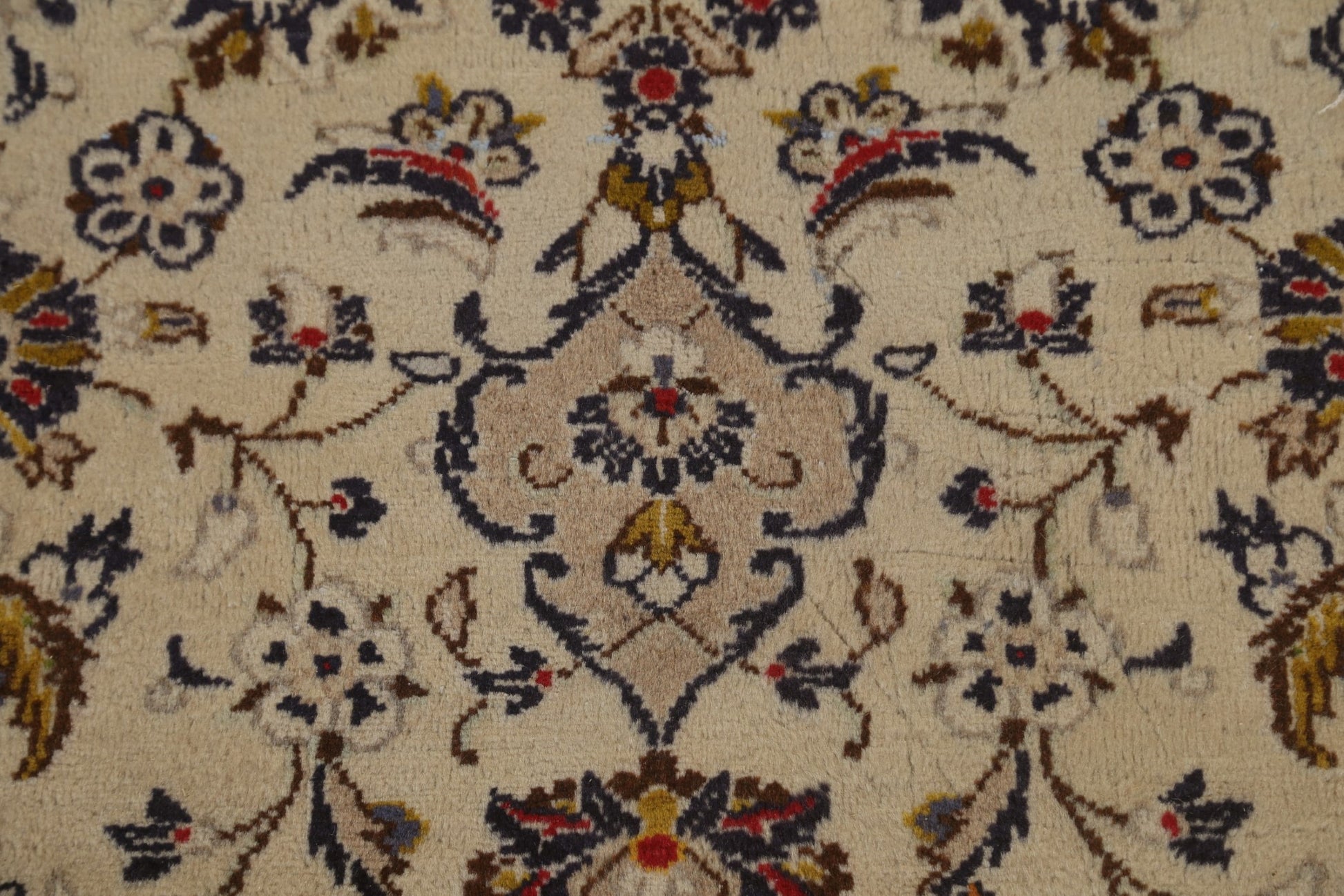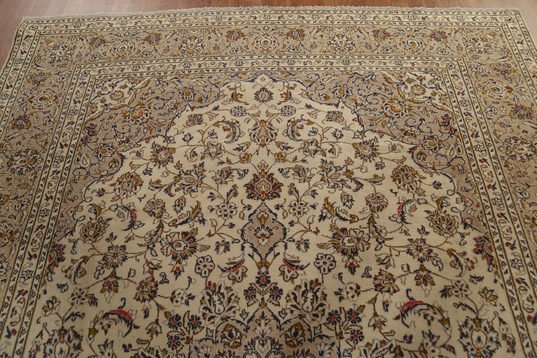 A Beautiful Genuine Persia ( Persia ) Kashan rug is Hand Knotted by skillful weavers in Persia ( Persia ) with 100% Wool Material. This rug is in Very Good (Low Pile) condition. dimensions are 11' 1'' X 7' 10'' in foot and 338 X 239 in centimeter. the primary color is Beige & Ivories.
