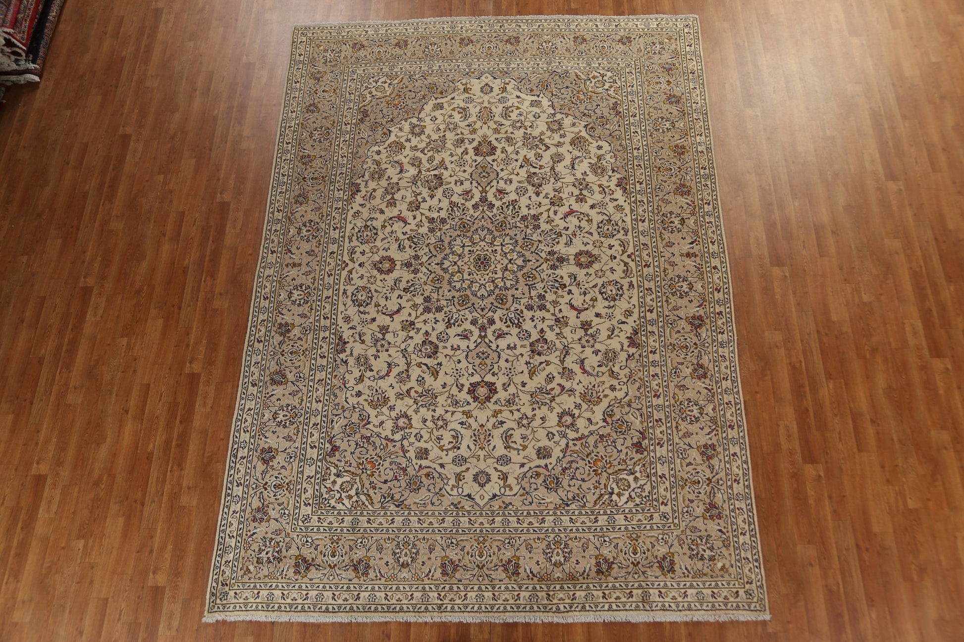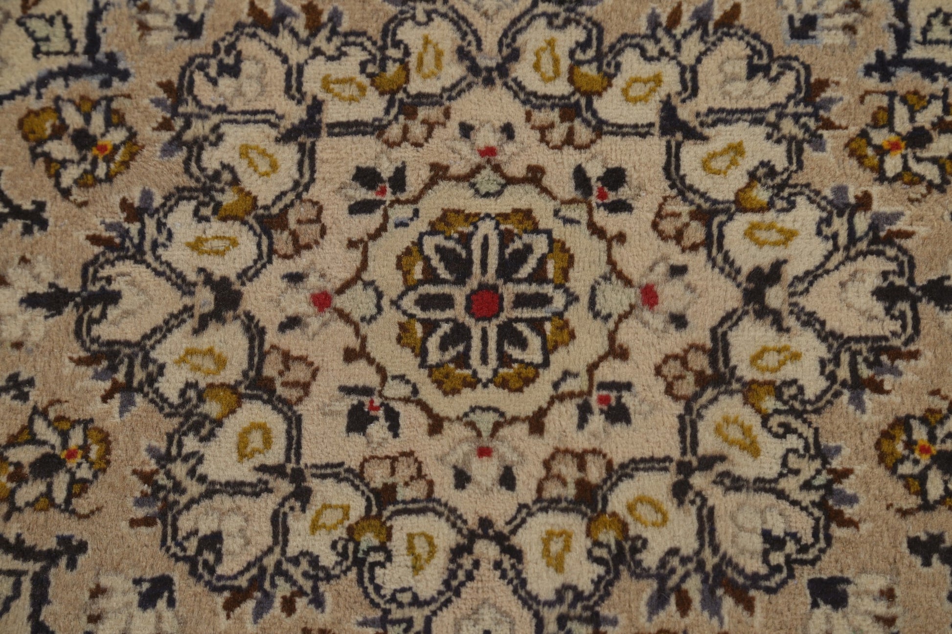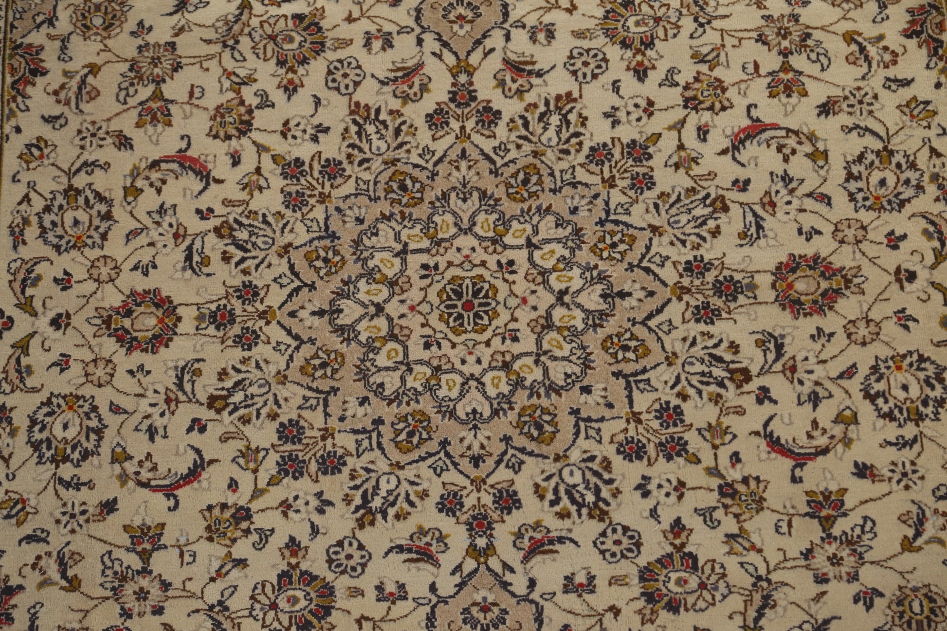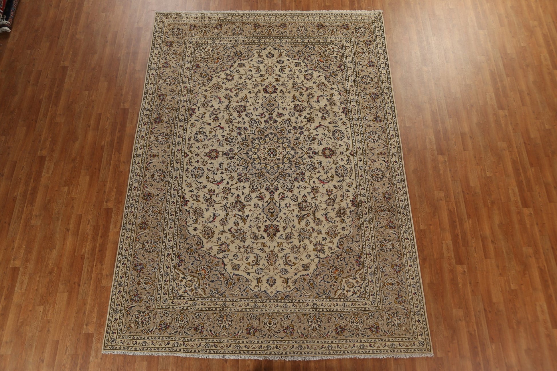A Beautiful Genuine Persia ( Persia ) Kashan rug is Hand Knotted by skillful weavers in Persia ( Persia ) with 100% Wool Material. This rug is in Very Good (Low Pile) condition. dimensions are 11' 1'' X 7' 10'' in foot and 338 X 239 in centimeter. the primary color is Beige & Ivories.