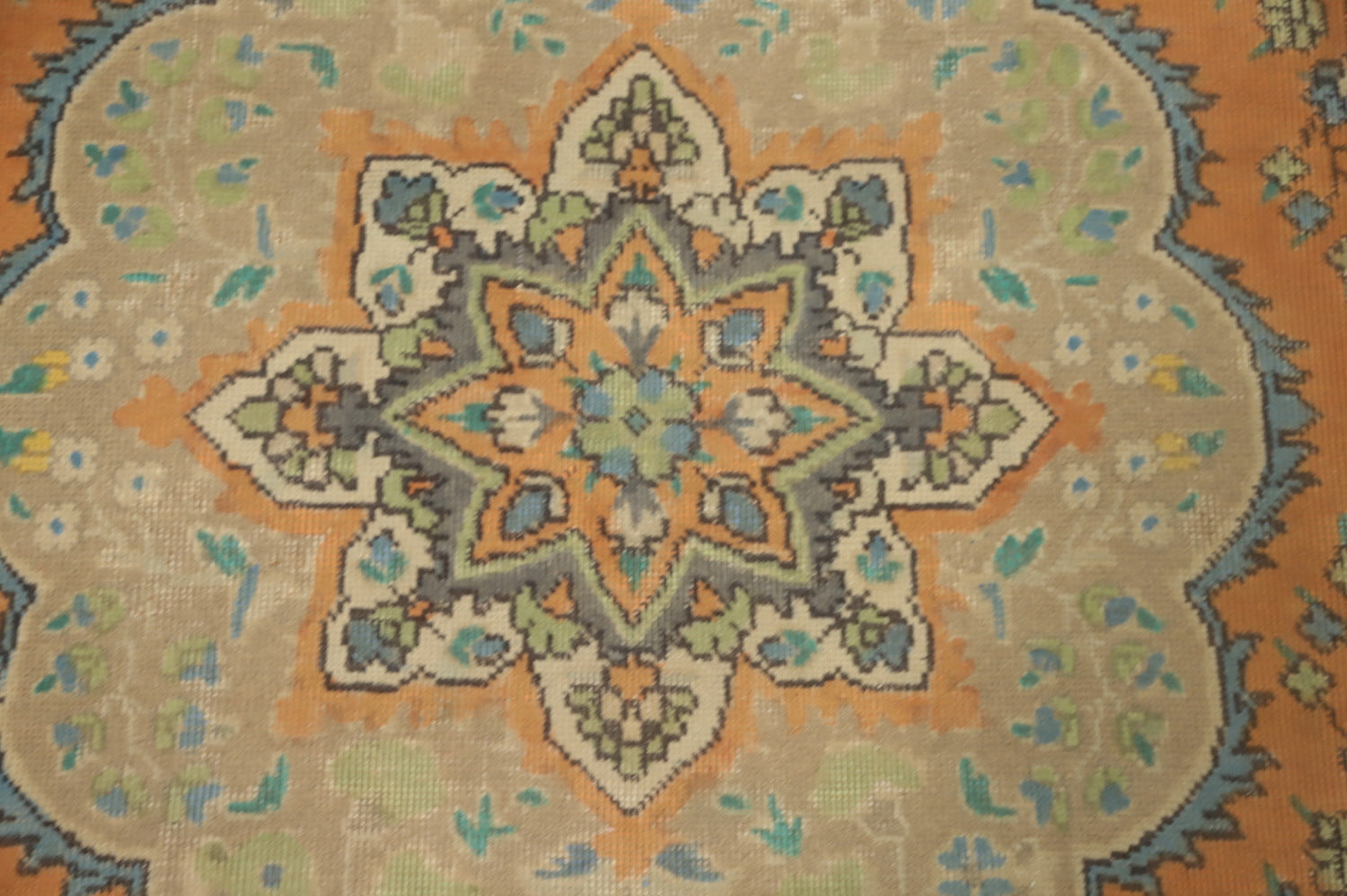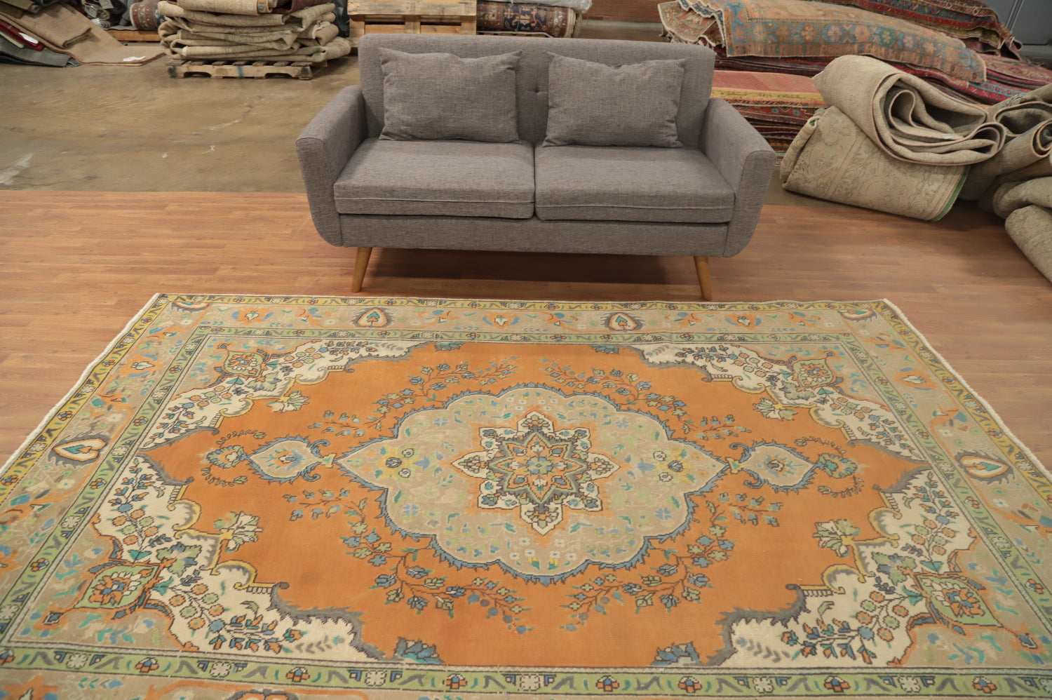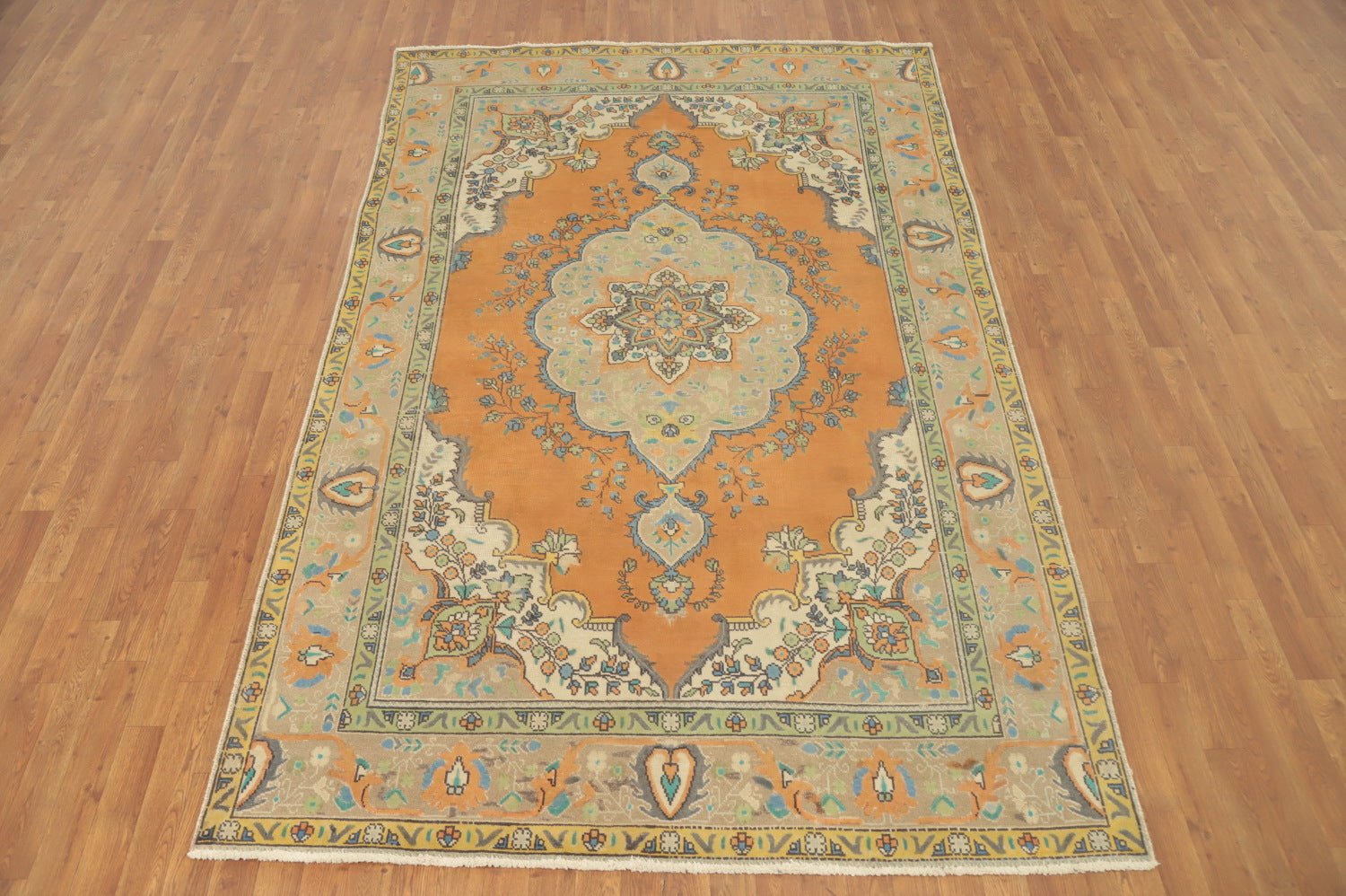 A Beautiful Genuine Persia ( Persia ) Tabriz rug is Hand Knotted by skillful weavers in Persia ( Persia ) with 100% Wool Material. This rug is in Very Good (Evenly Low Pile) condition. dimensions are 9' 7'' X 6' 1'' in foot and 292 X 185 in centimeter. the primary color is Oranges & Rust.