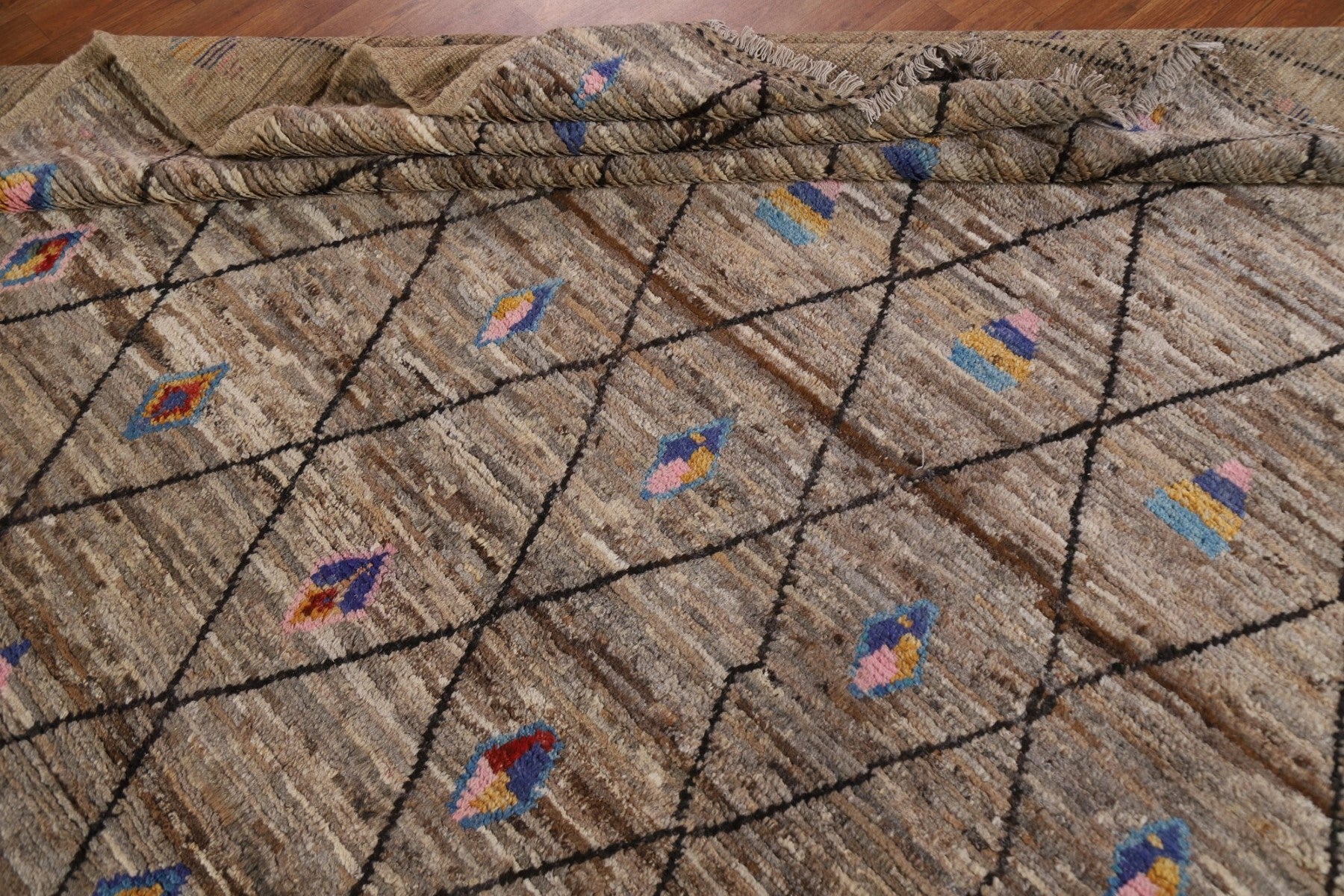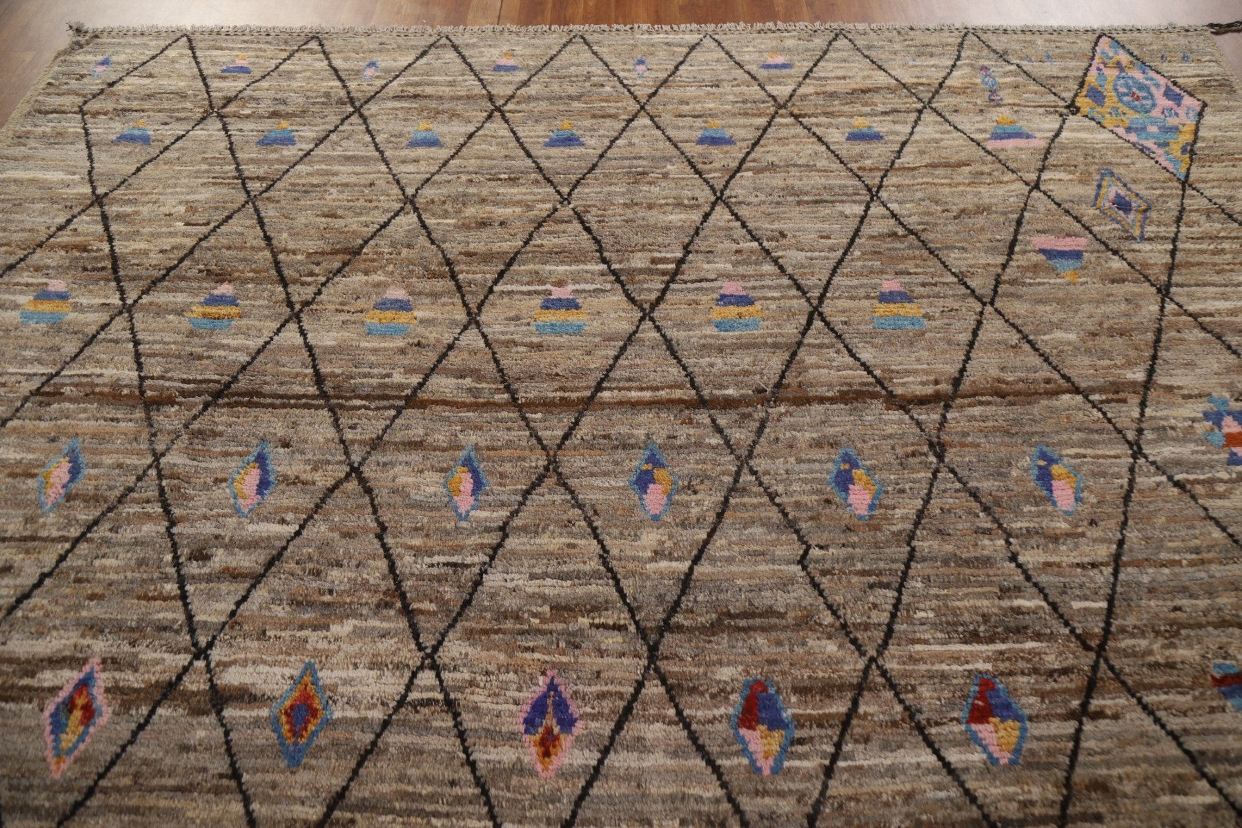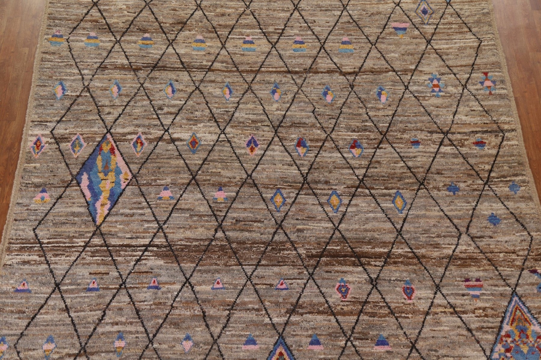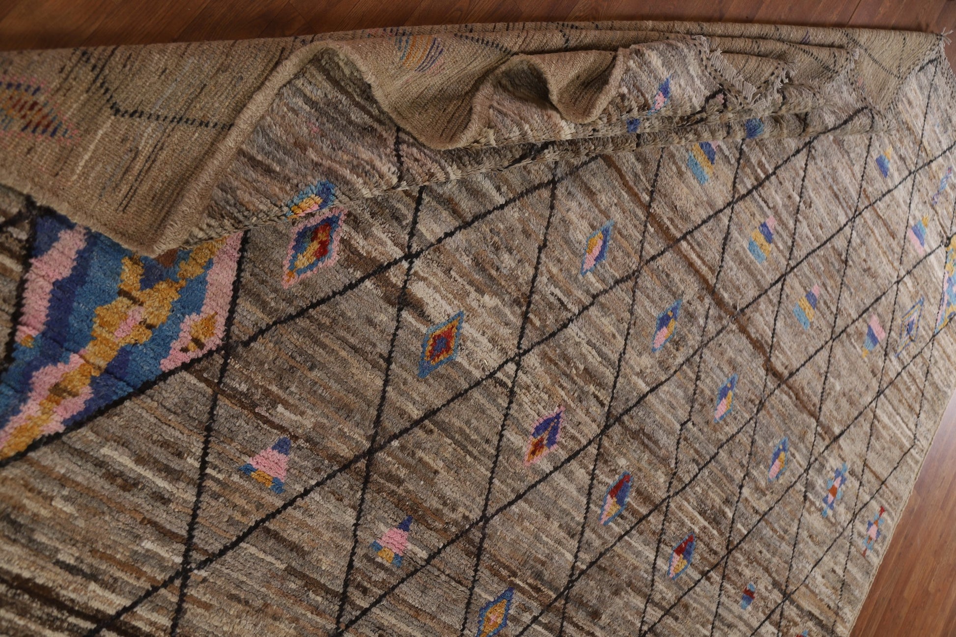 A Beautiful Genuine Pakistan Moroccan rug is Hand Knotted by skillful weavers in Pakistan with 100% Wool Material. This rug is in condition. dimensions are 11' 7'' X 9' 7'' in foot and 353 X 292 in centimeter. the primary color is Brown.