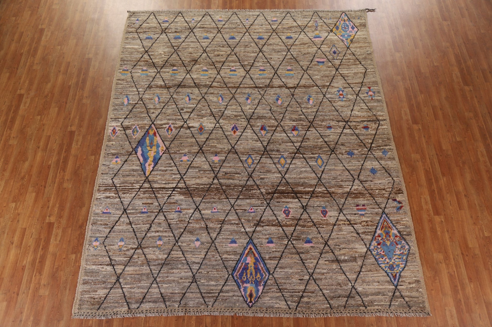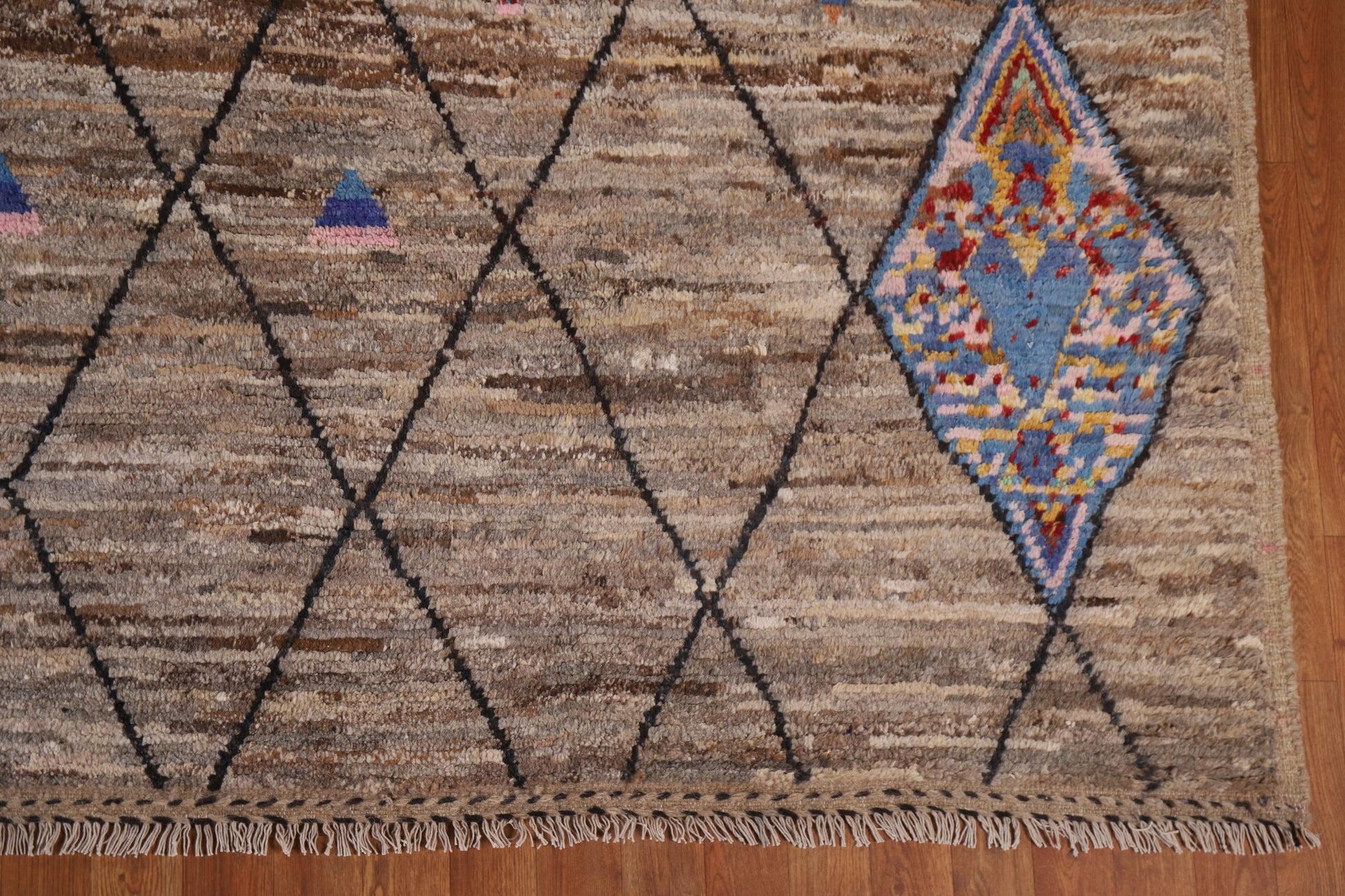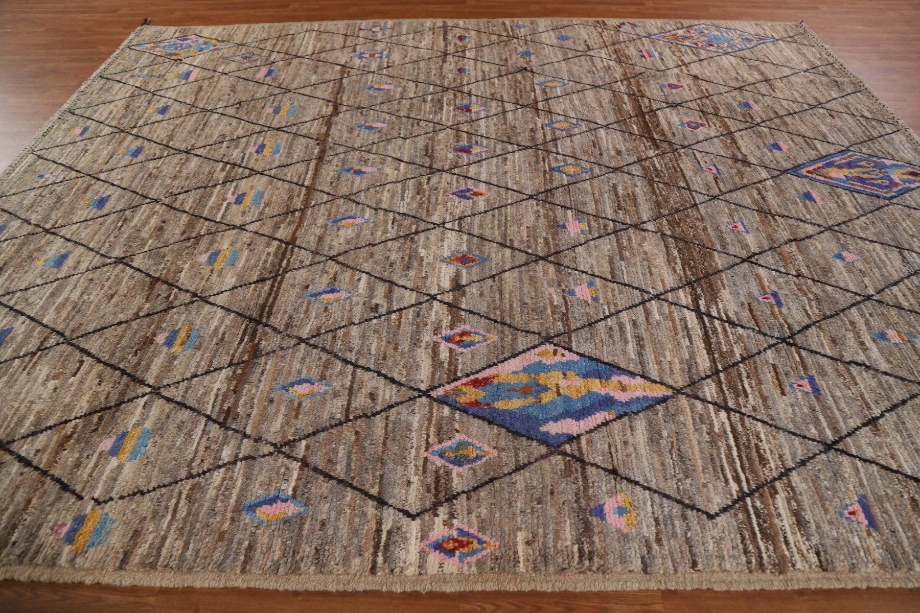 A Beautiful Genuine Pakistan Moroccan rug is Hand Knotted by skillful weavers in Pakistan with 100% Wool Material. This rug is in condition. dimensions are 11' 7'' X 9' 7'' in foot and 353 X 292 in centimeter. the primary color is Brown.