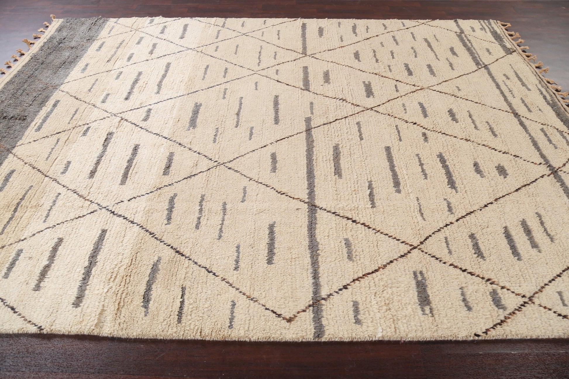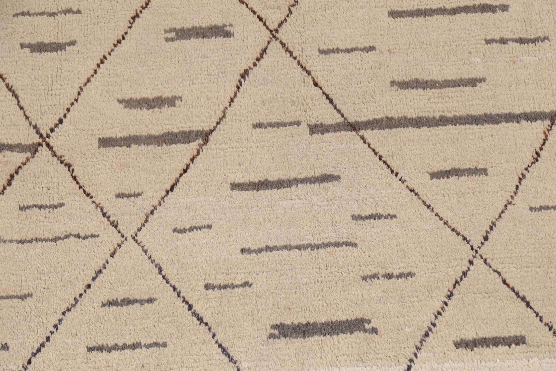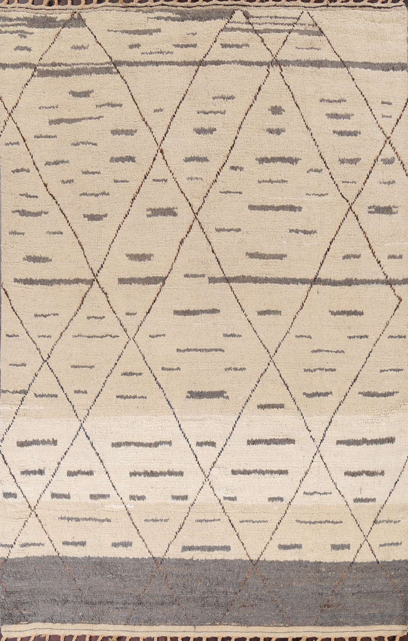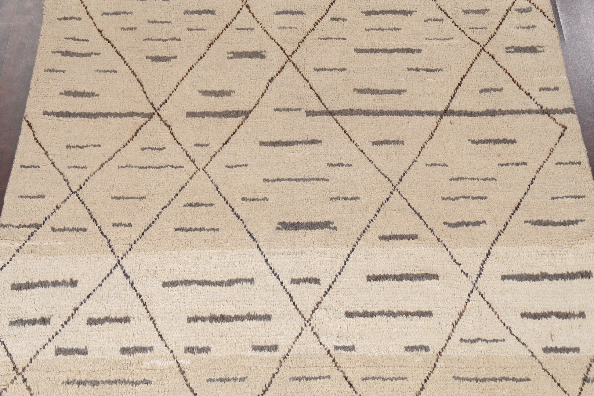 A Beautiful Genuine Pakistan Moroccan rug is Hand Knotted by skillful weavers in Pakistan with 100% Wool Material. This rug is in New, First Quality condition. dimensions are 10' 9'' X 8' 0'' in foot and 328 X 244 in centimeter. the primary color is Beige & Ivories.