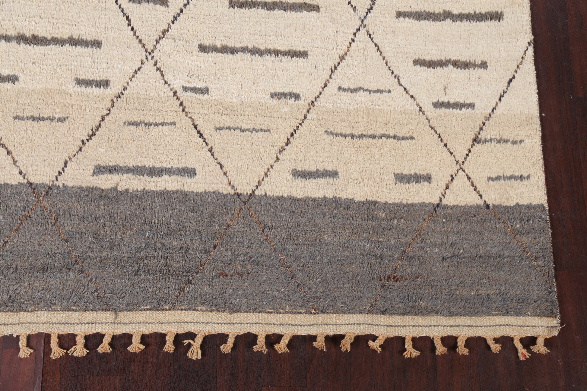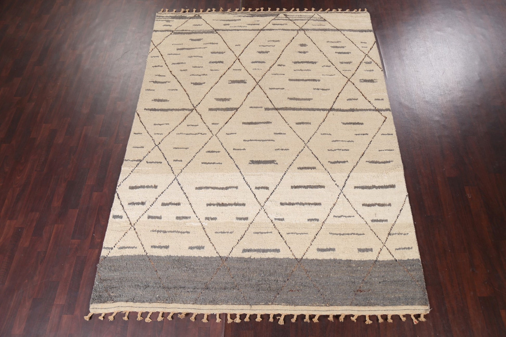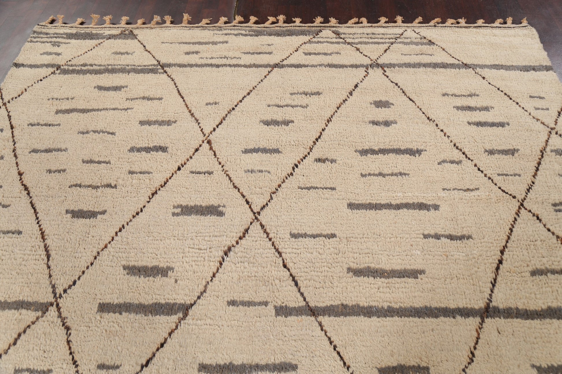 A Beautiful Genuine Pakistan Moroccan rug is Hand Knotted by skillful weavers in Pakistan with 100% Wool Material. This rug is in New, First Quality condition. dimensions are 10' 9'' X 8' 0'' in foot and 328 X 244 in centimeter. the primary color is Beige & Ivories.