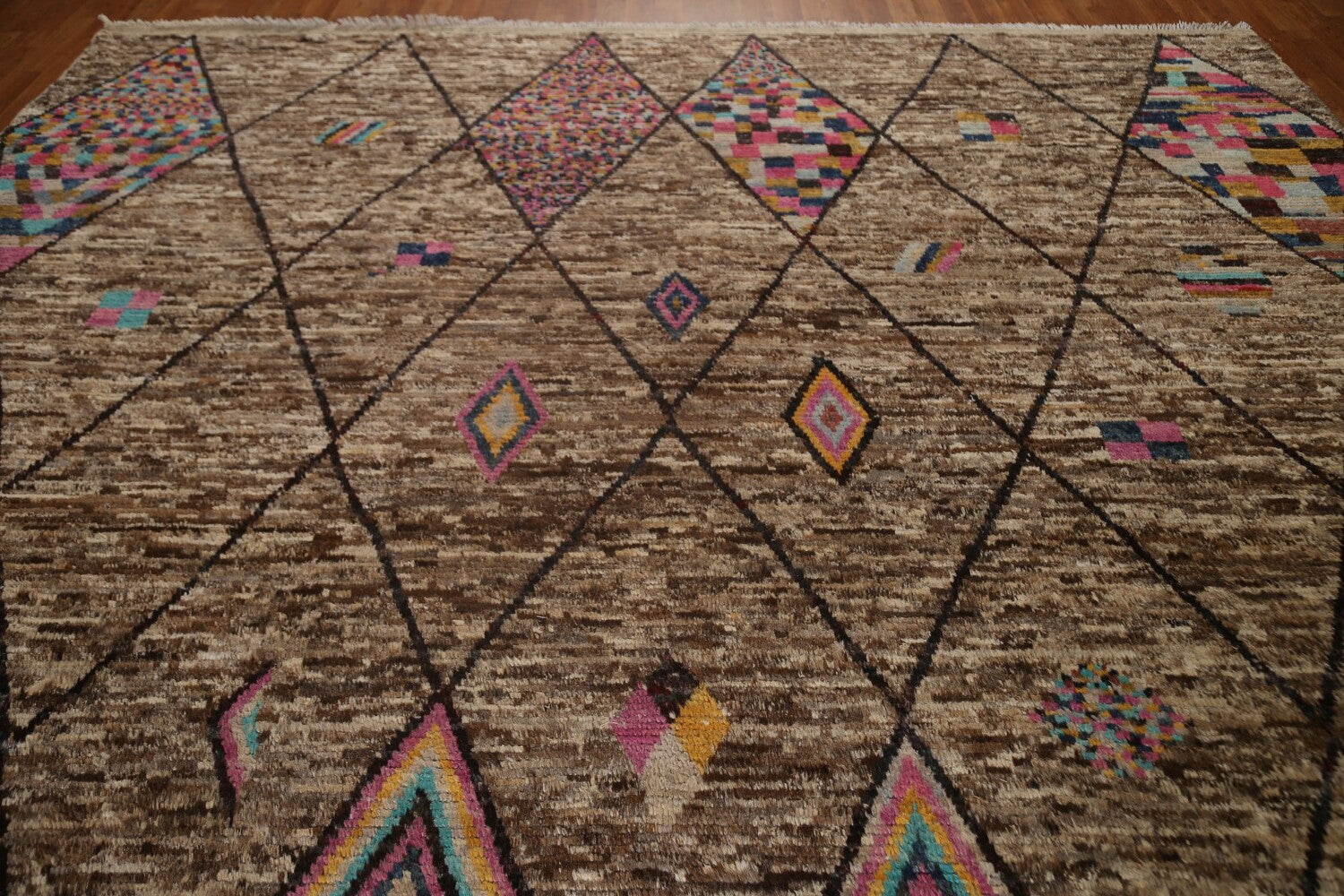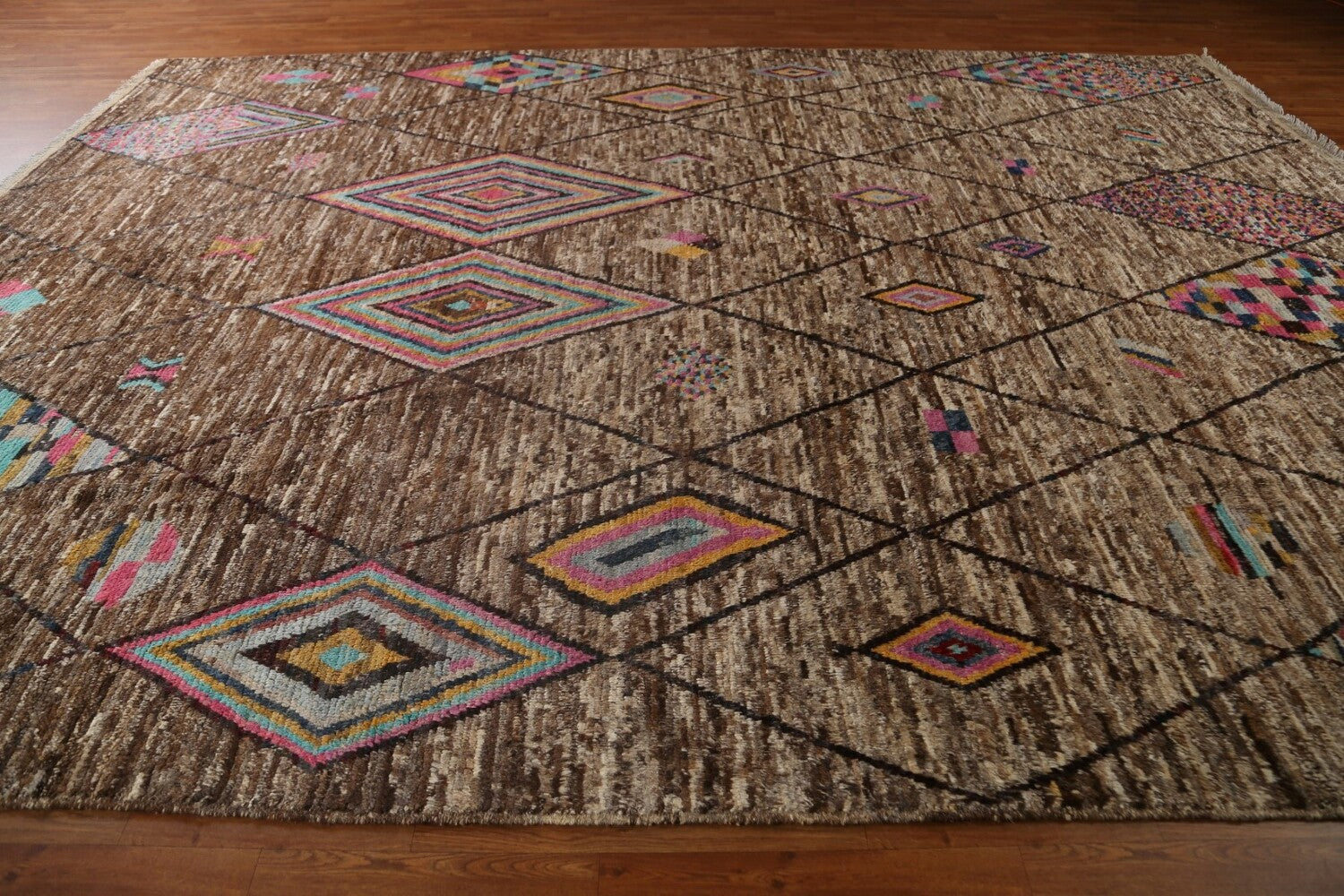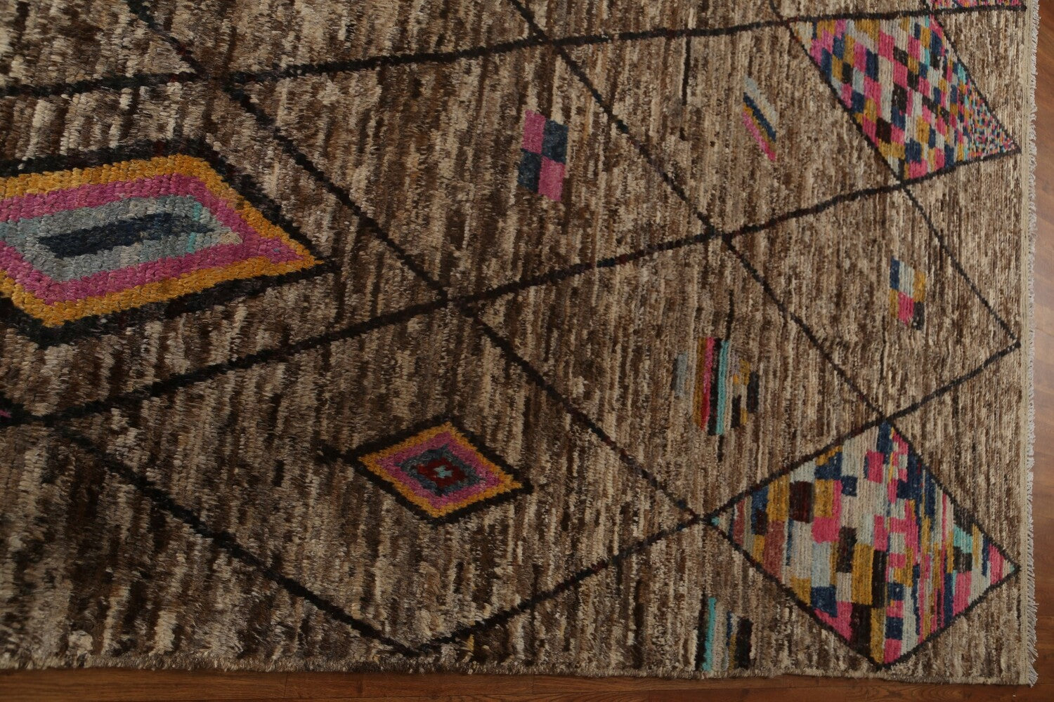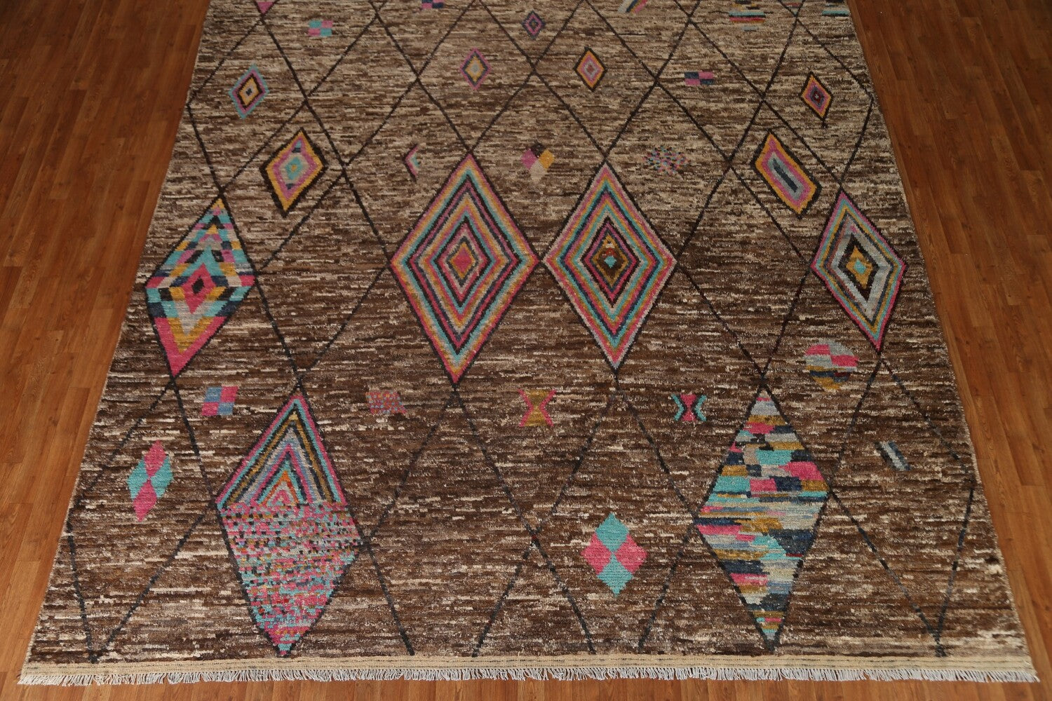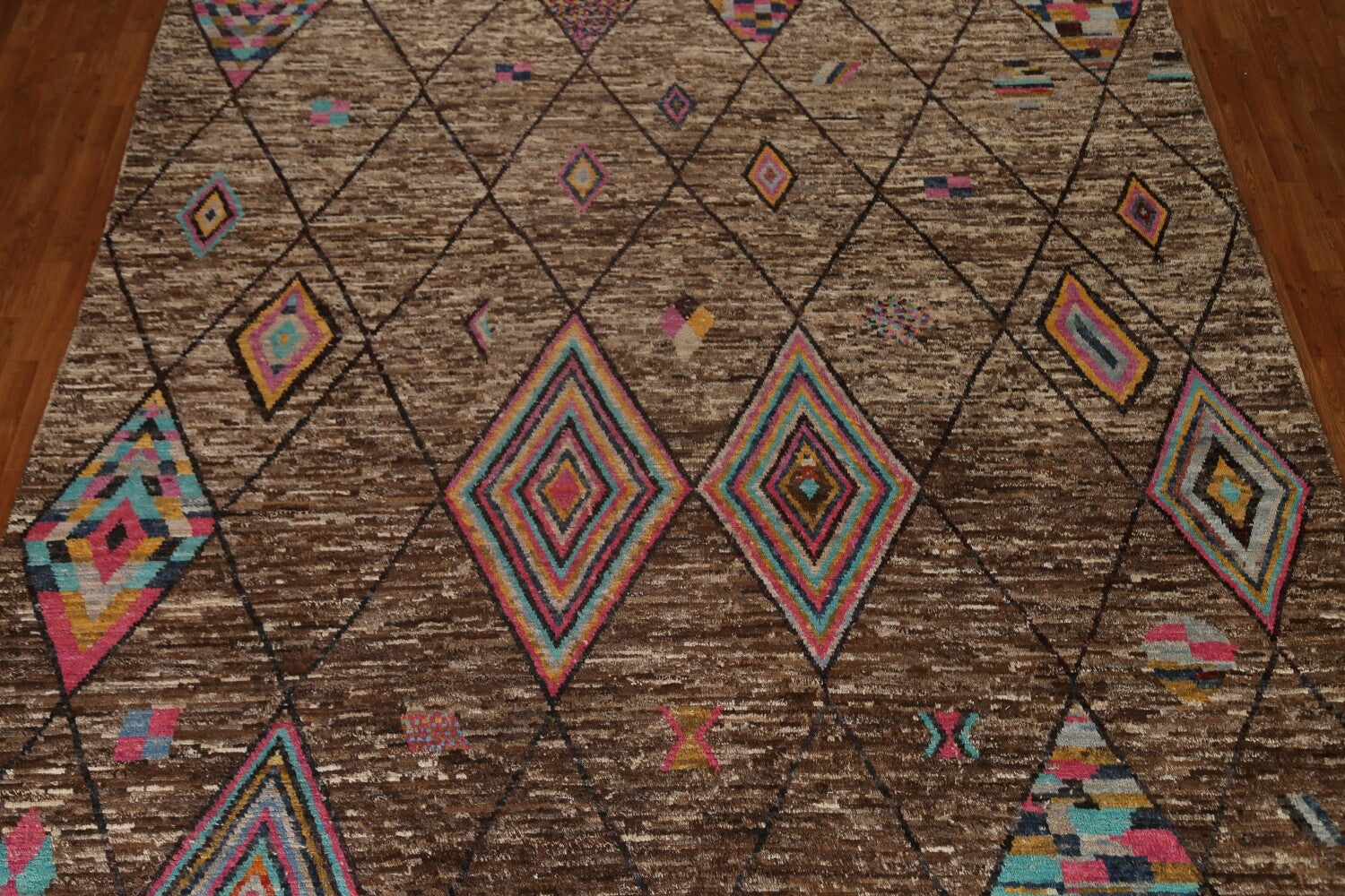 A Beautiful Genuine Pakistan Moroccan rug is Hand Knotted by skillful weavers in Pakistan with 100% Wool Material. This rug is in condition. dimensions are 13' 11'' X 10' 5'' in foot and 424 X 318 in centimeter. the primary color is Brown.