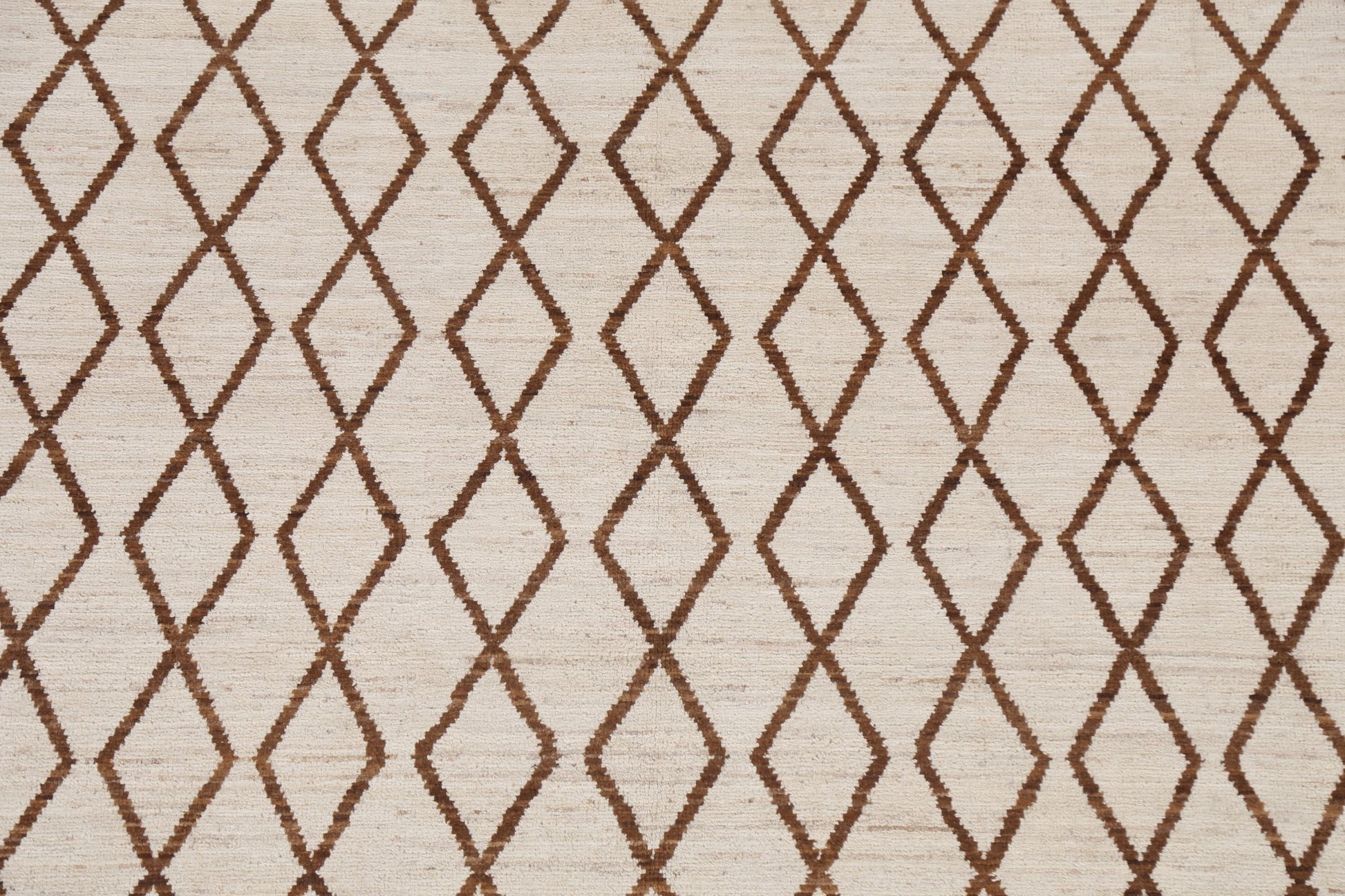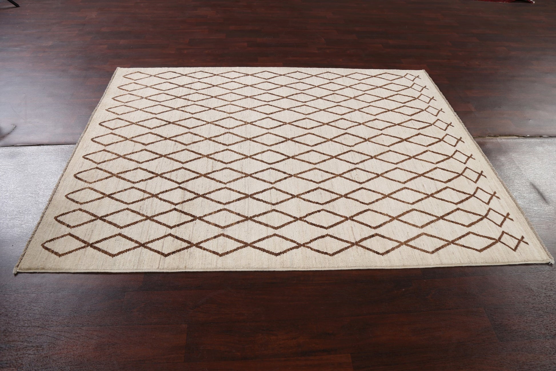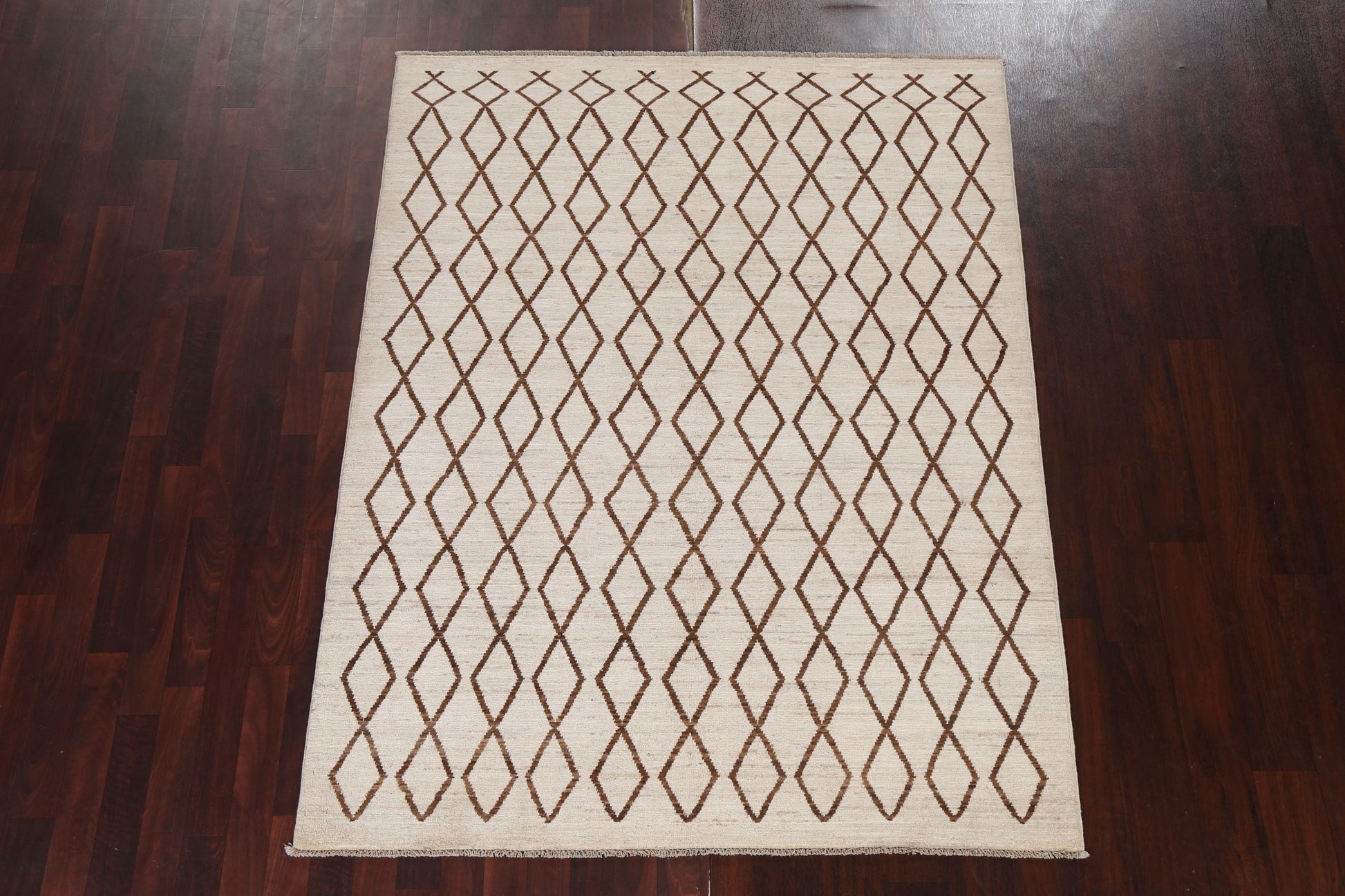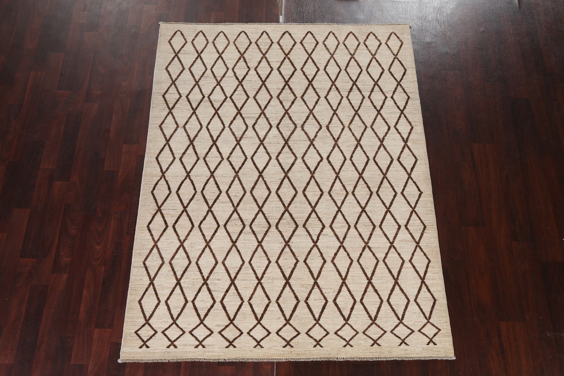A Beautiful Genuine Pakistan Moroccan rug is Hand Knotted by skillful weavers in Pakistan with 100% Wool Material. This rug is in New, First Quality condition. dimensions are 6' 7'' X 5' 1'' in foot and 201 X 155 in centimeter. the primary color is Beige & Ivories.