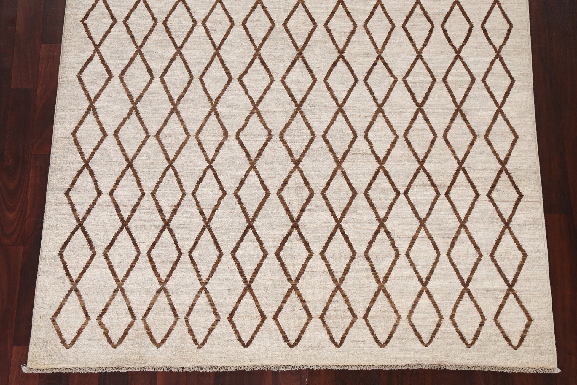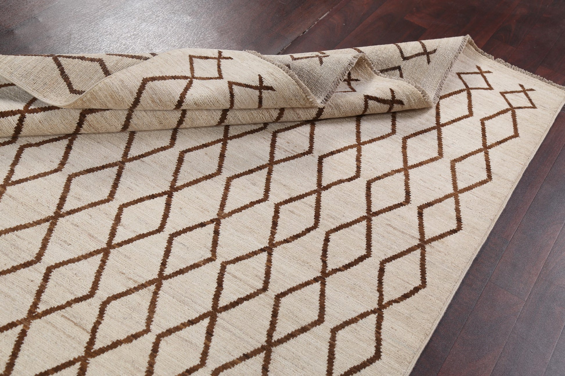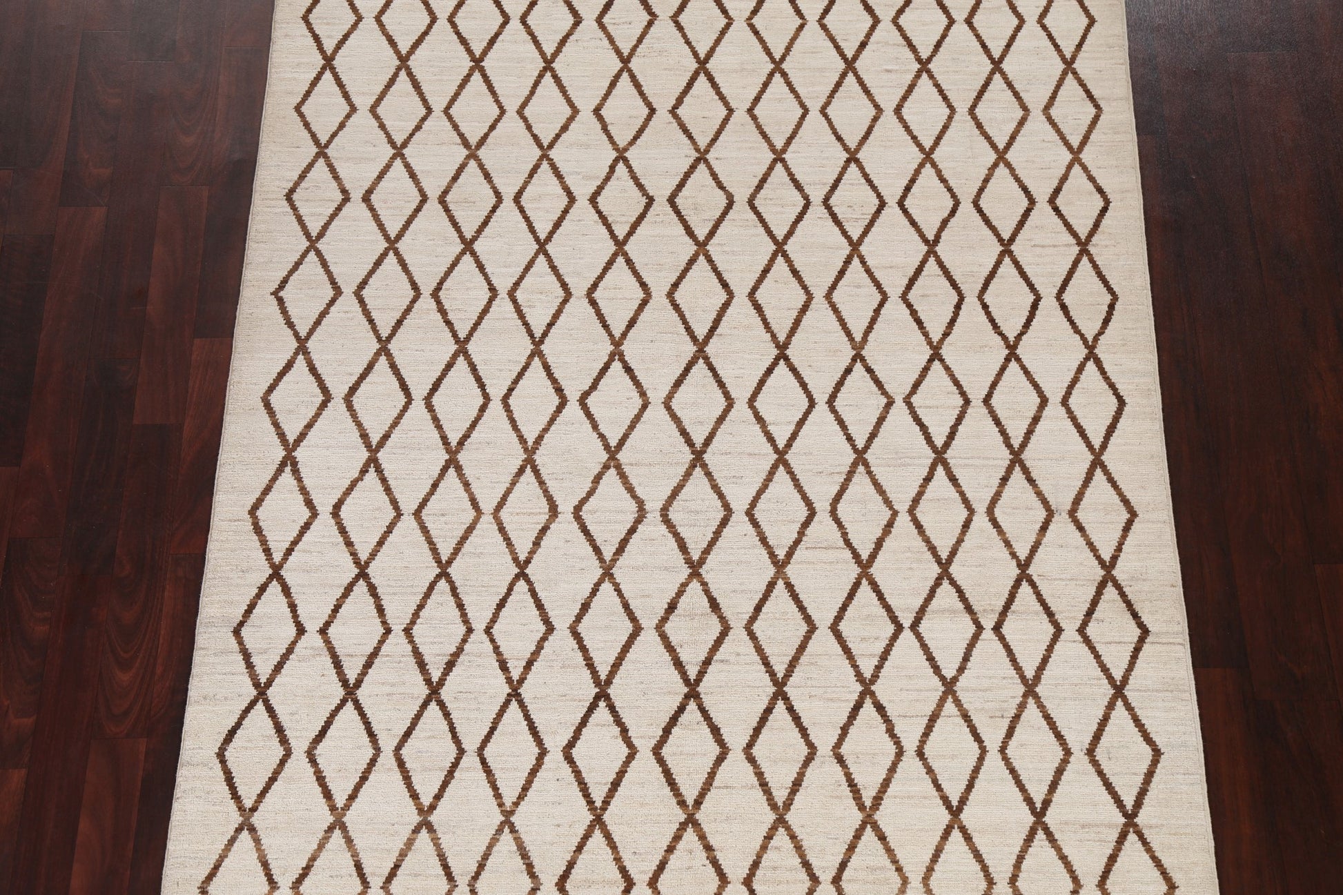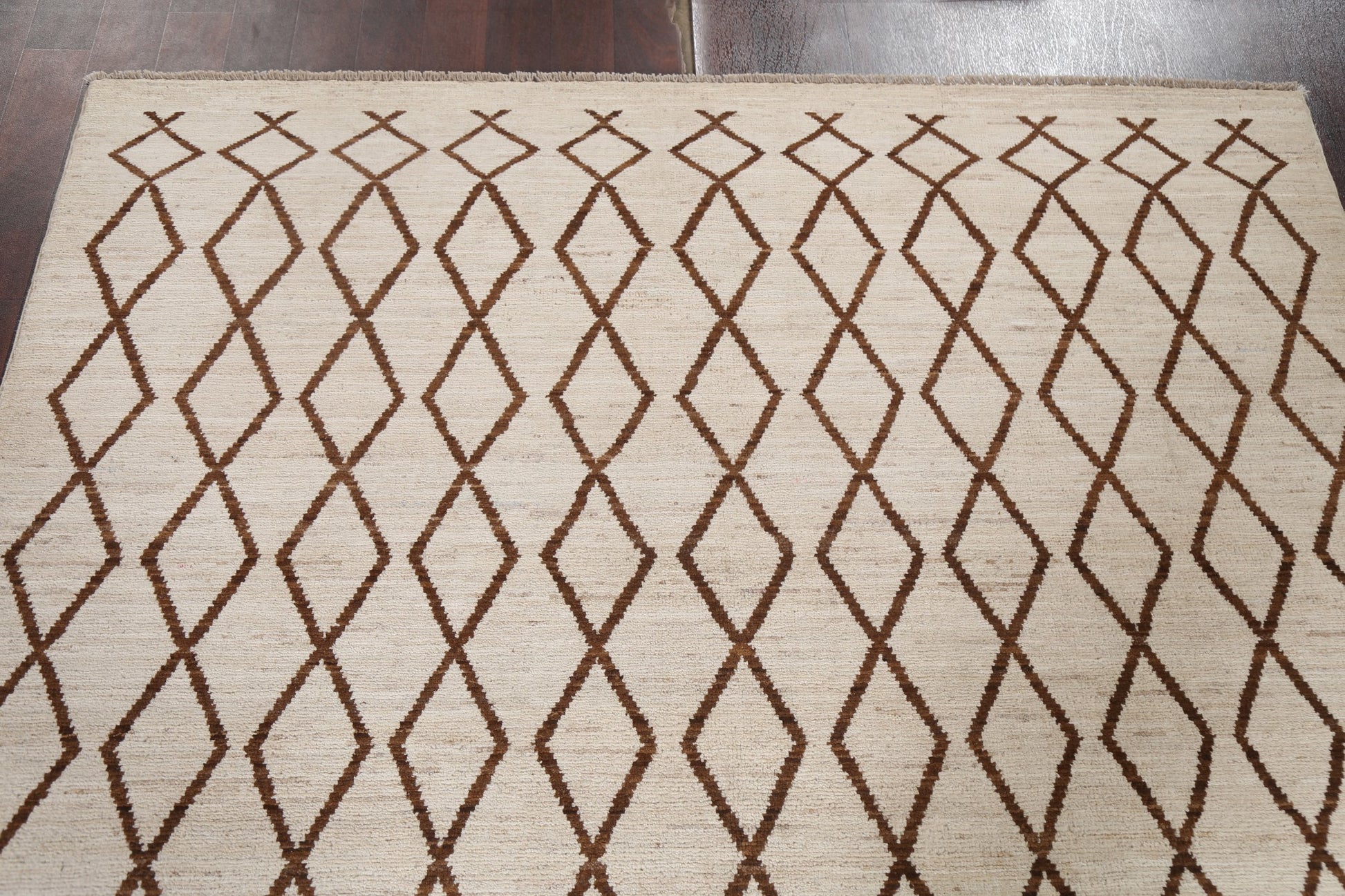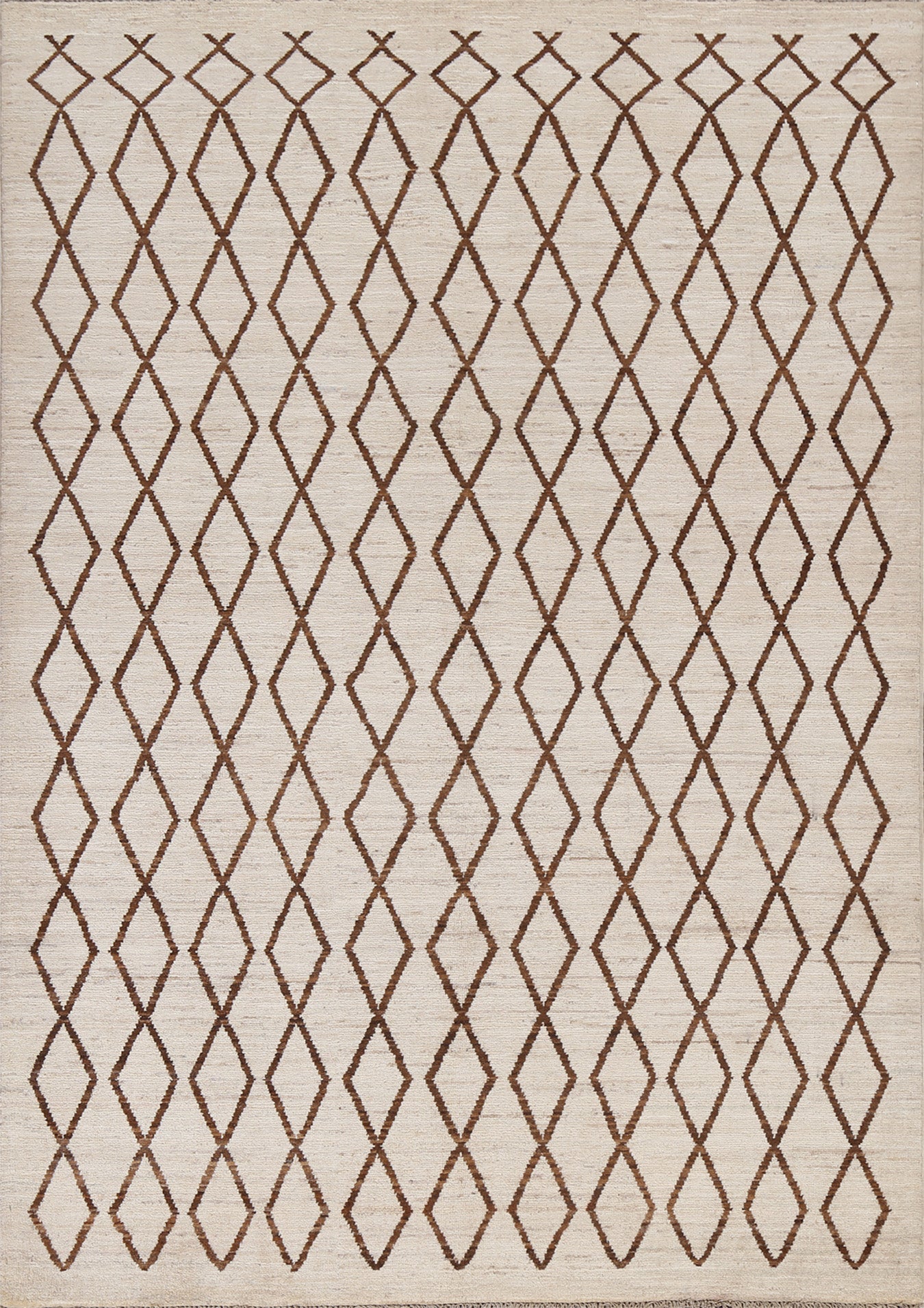 A Beautiful Genuine Pakistan Moroccan rug is Hand Knotted by skillful weavers in Pakistan with 100% Wool Material. This rug is in New, First Quality condition. dimensions are 6' 7'' X 5' 1'' in foot and 201 X 155 in centimeter. the primary color is Beige & Ivories.