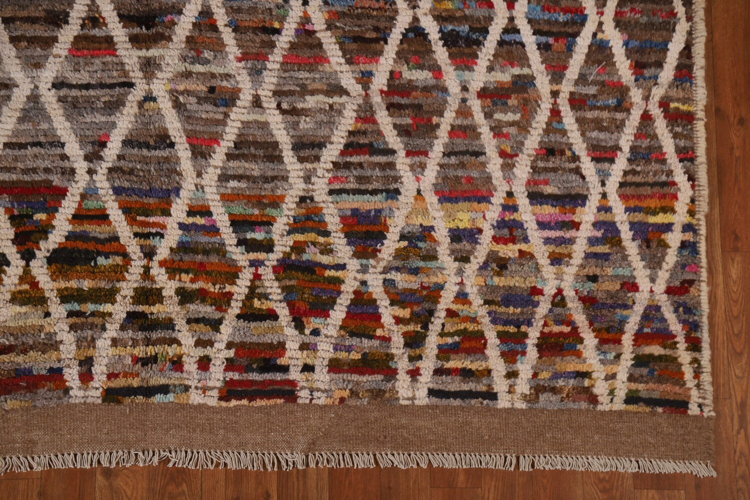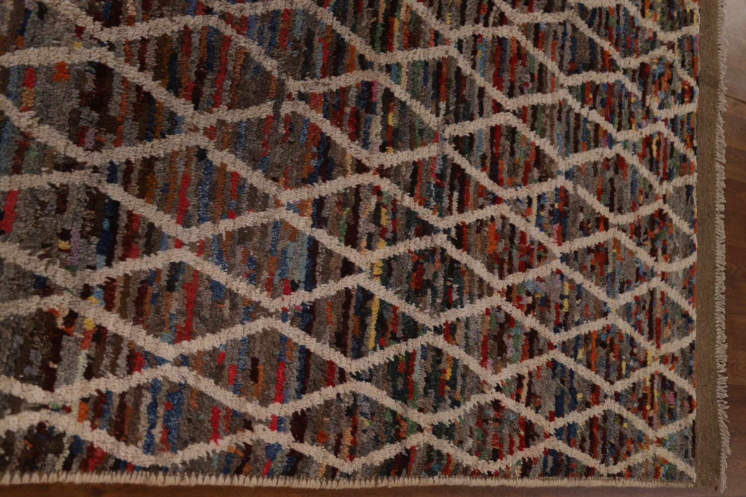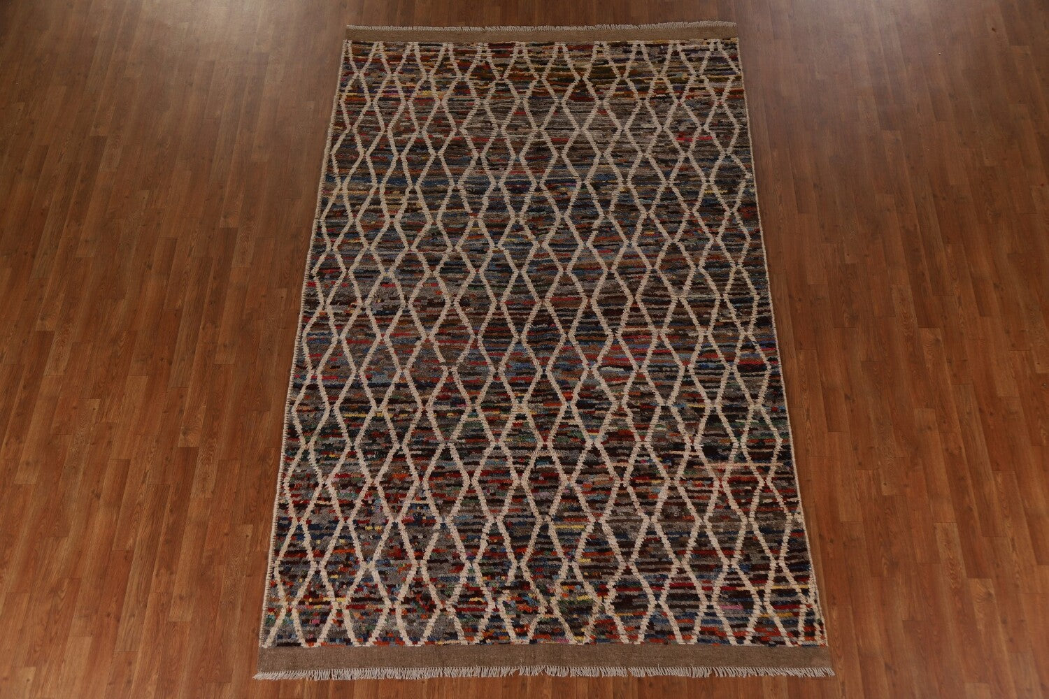 A Beautiful Genuine Pakistan Moroccan rug is Hand Knotted by skillful weavers in Pakistan with 100% Wool Material. This rug is in condition. dimensions are 9' 7'' X 6' 3'' in foot and 292 X 191 in centimeter. the primary color is Black.