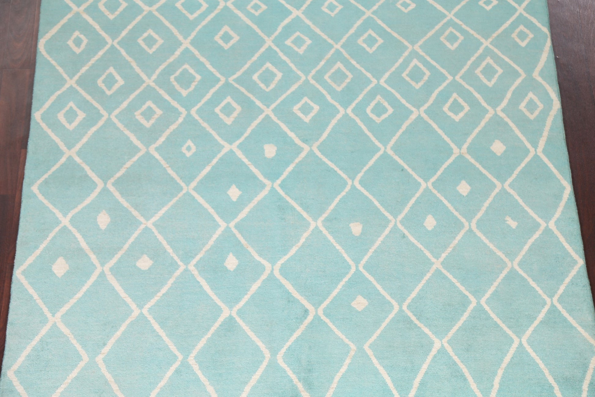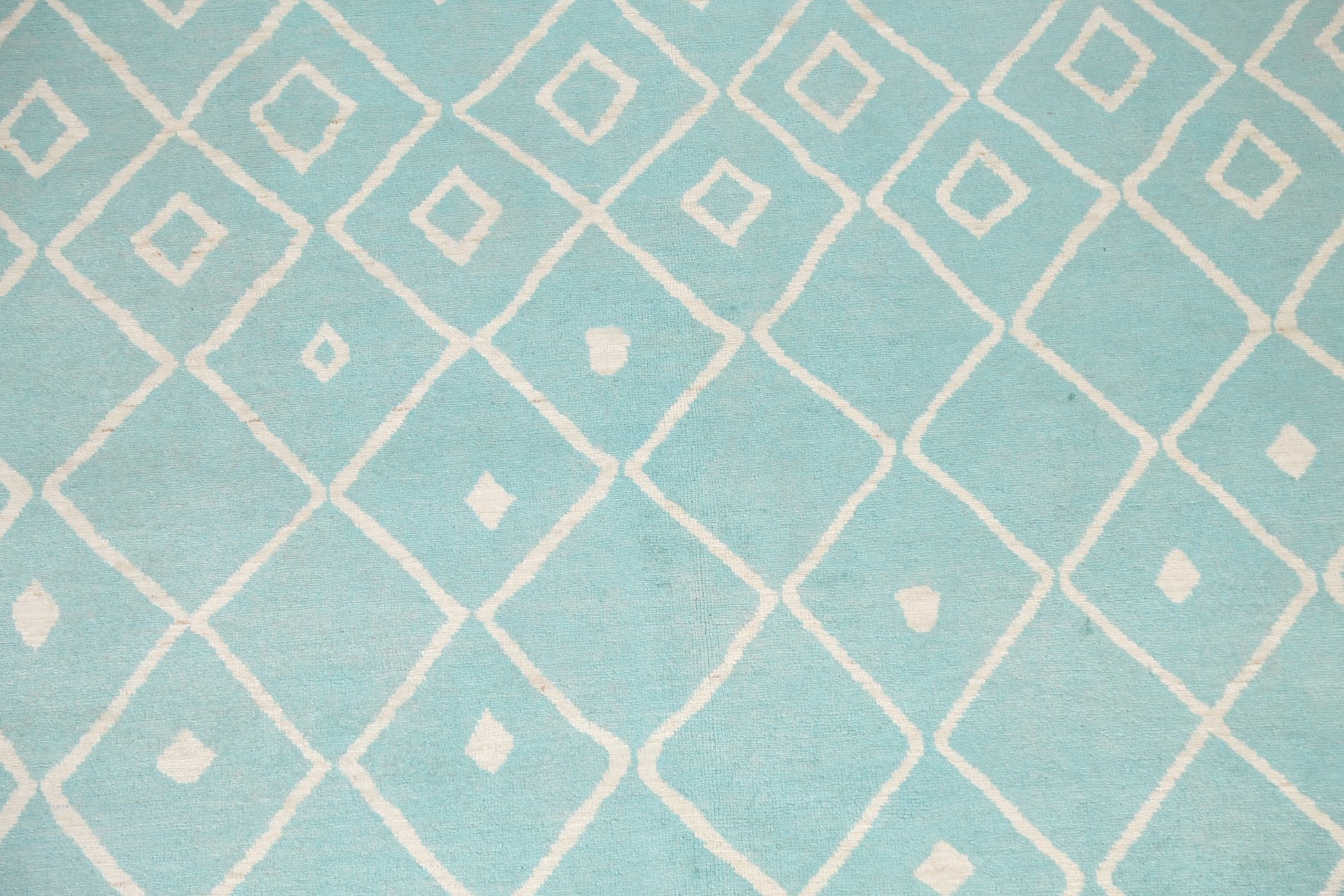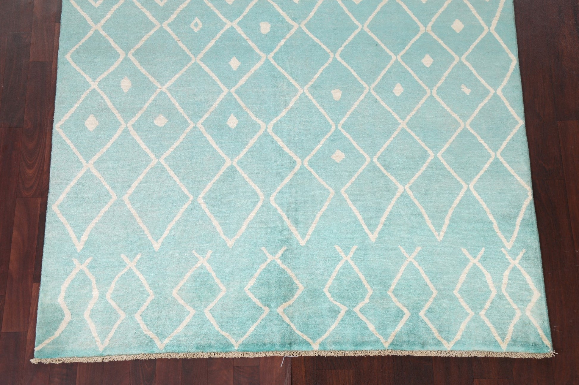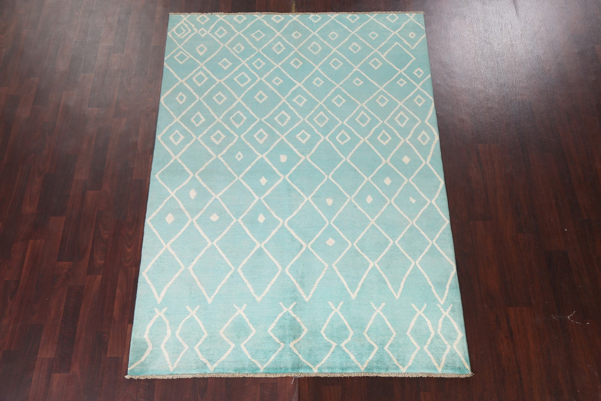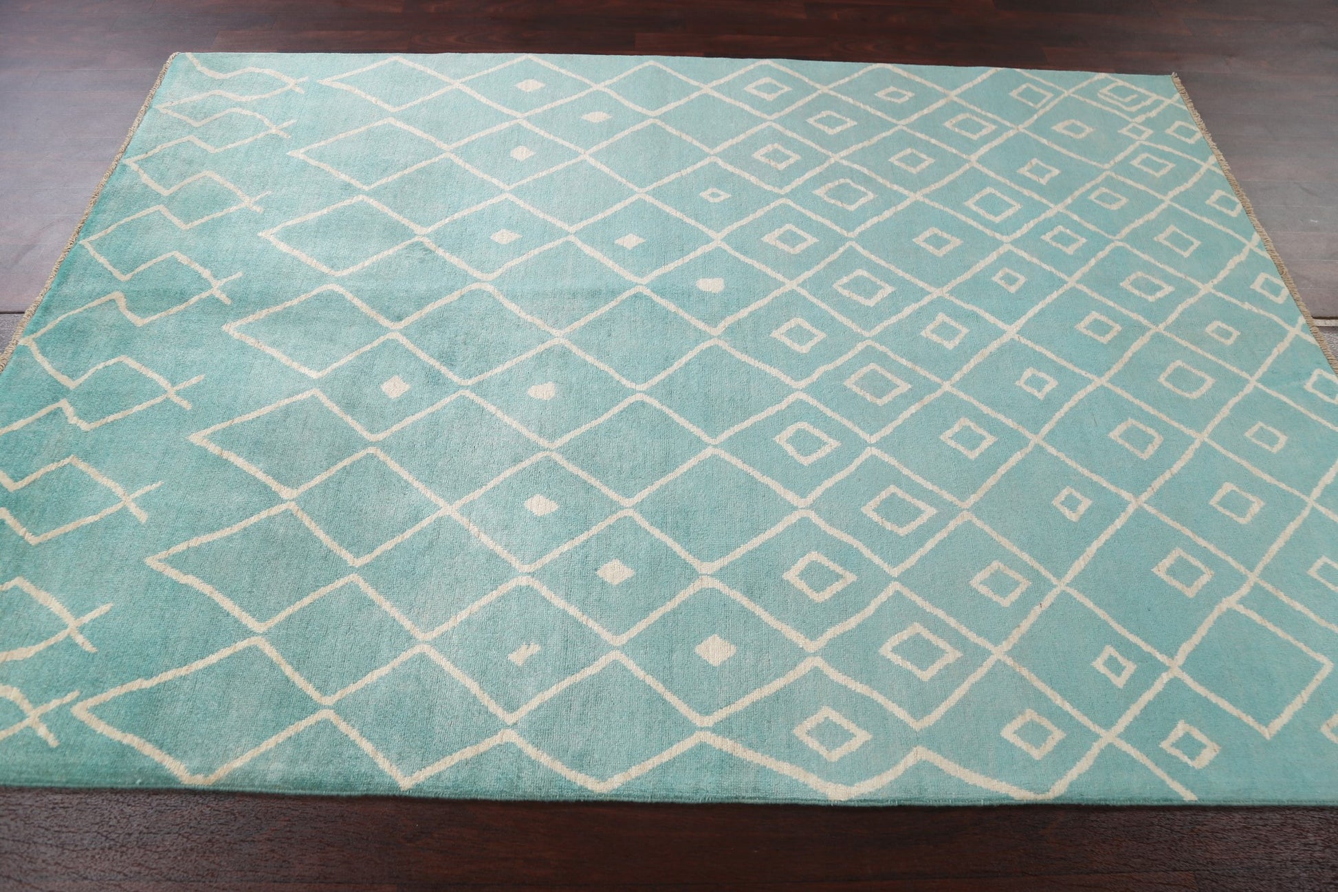 A Beautiful Genuine Pakistan Moroccan rug is Hand Knotted by skillful weavers in Pakistan with 100% Wool Material. This rug is in New, First Quality condition. dimensions are 7' 9'' X 5' 6'' in foot and 236 X 168 in centimeter. the primary color is Navy Blue & Blues.