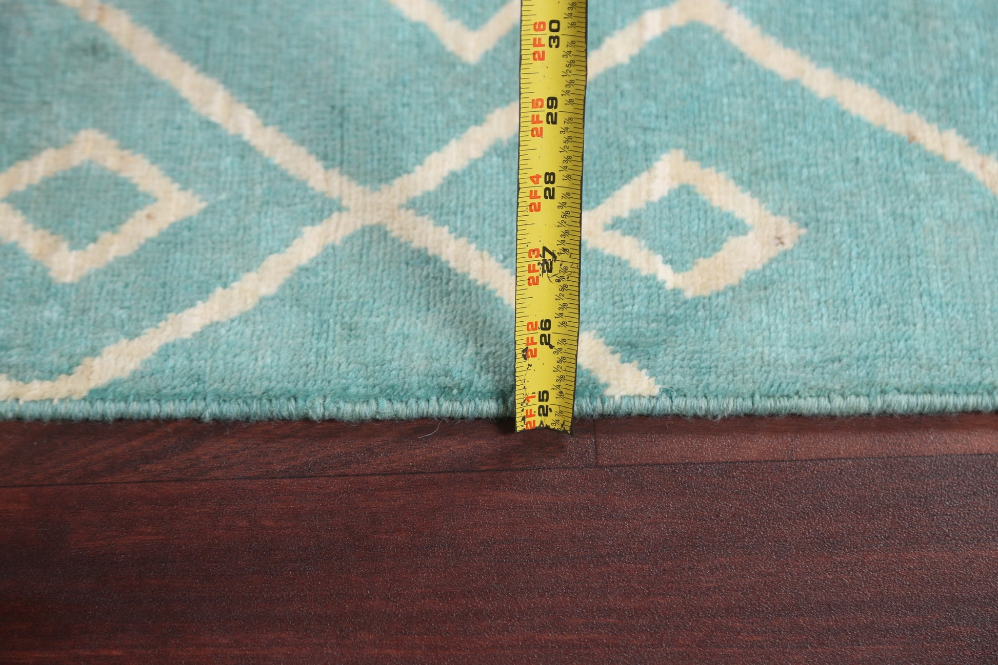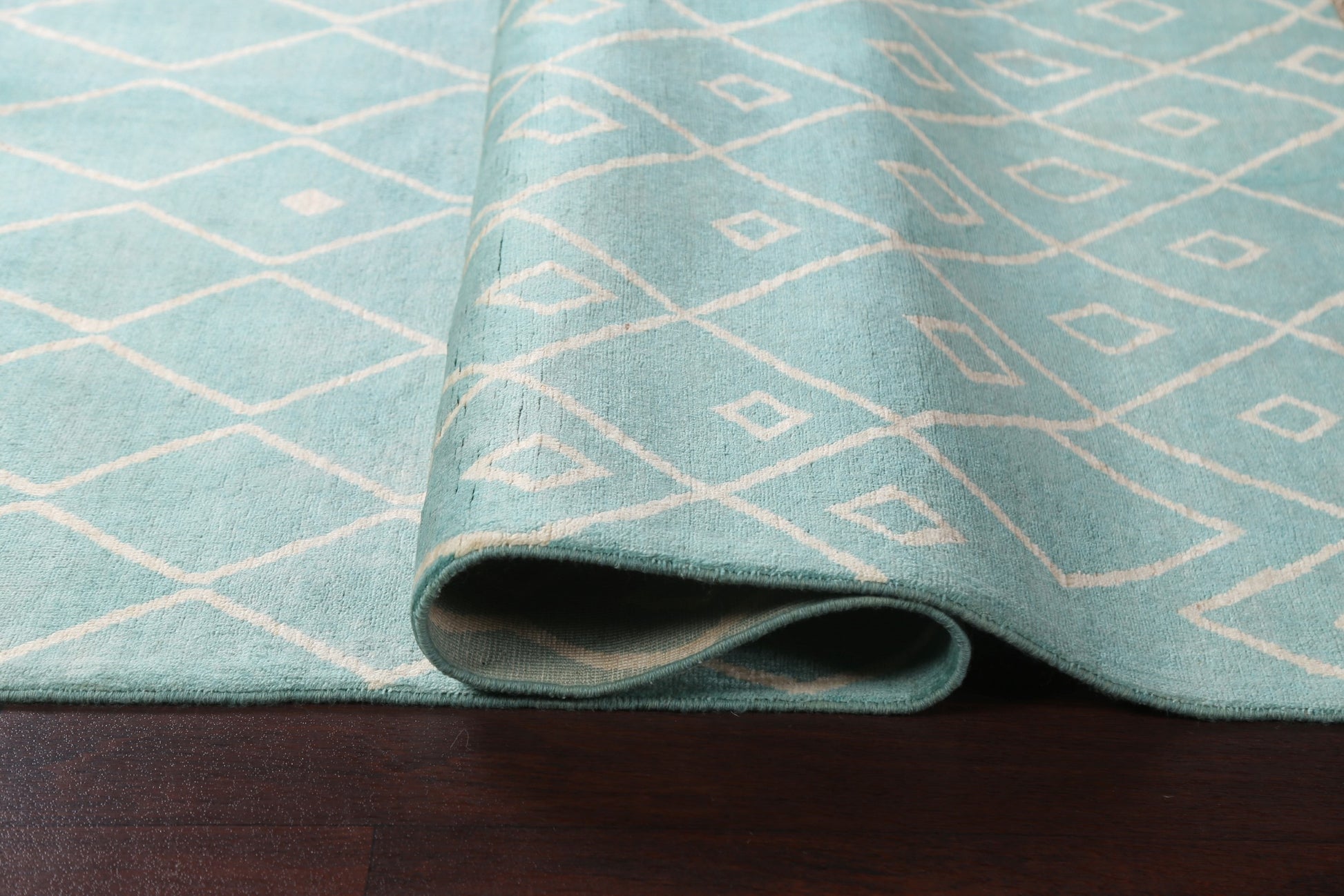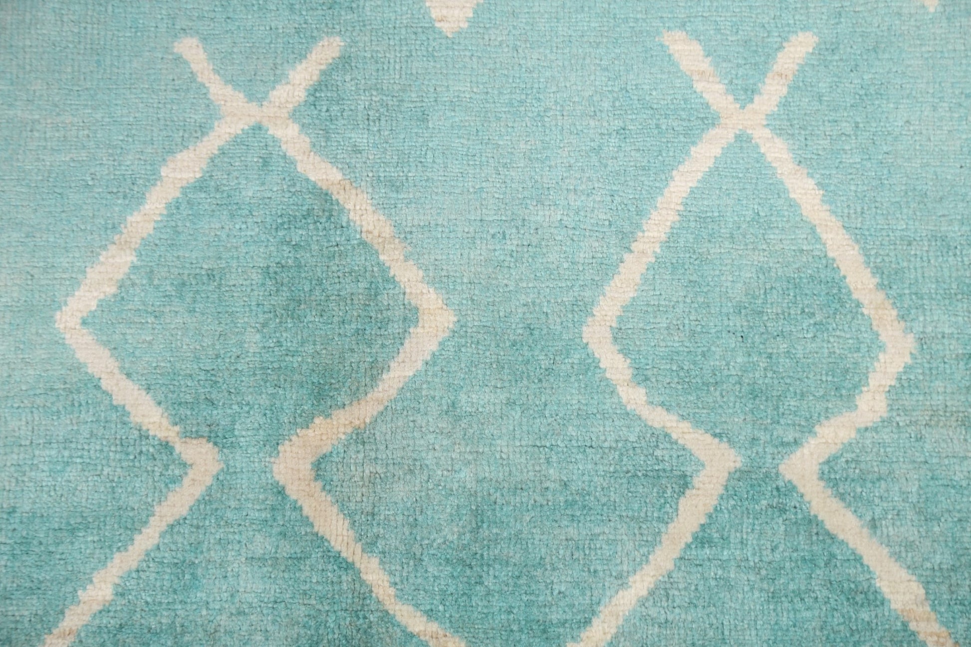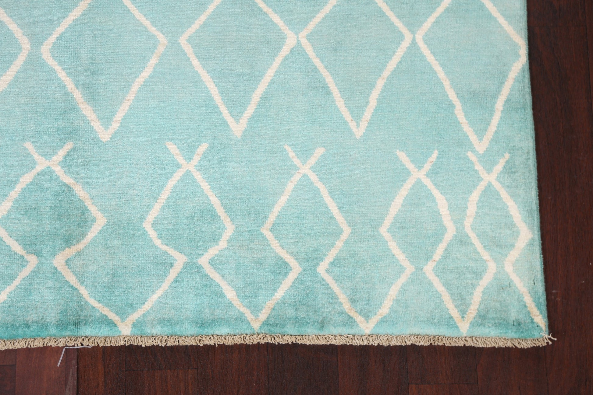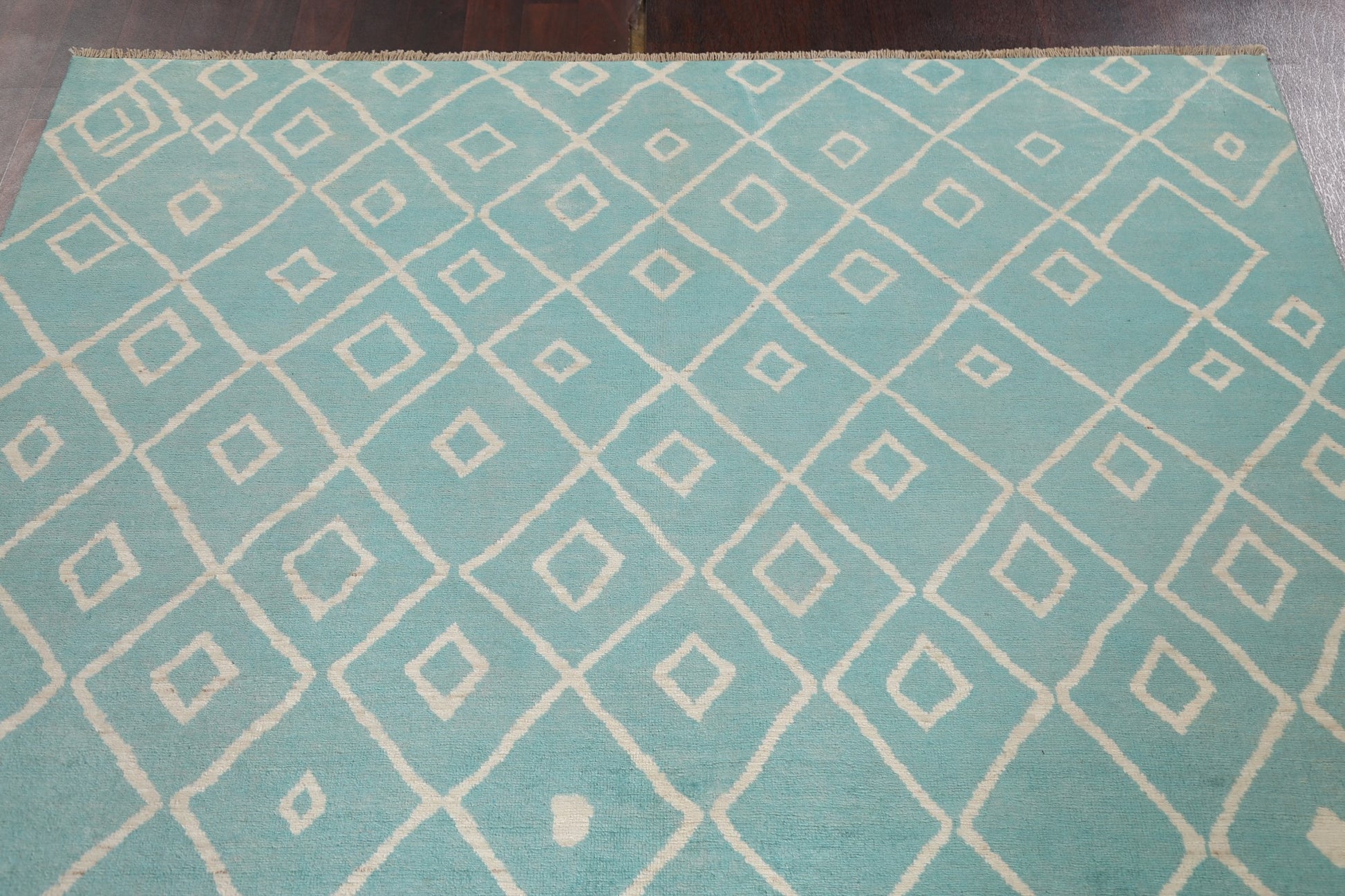 A Beautiful Genuine Pakistan Moroccan rug is Hand Knotted by skillful weavers in Pakistan with 100% Wool Material. This rug is in New, First Quality condition. dimensions are 7' 9'' X 5' 6'' in foot and 236 X 168 in centimeter. the primary color is Navy Blue & Blues.