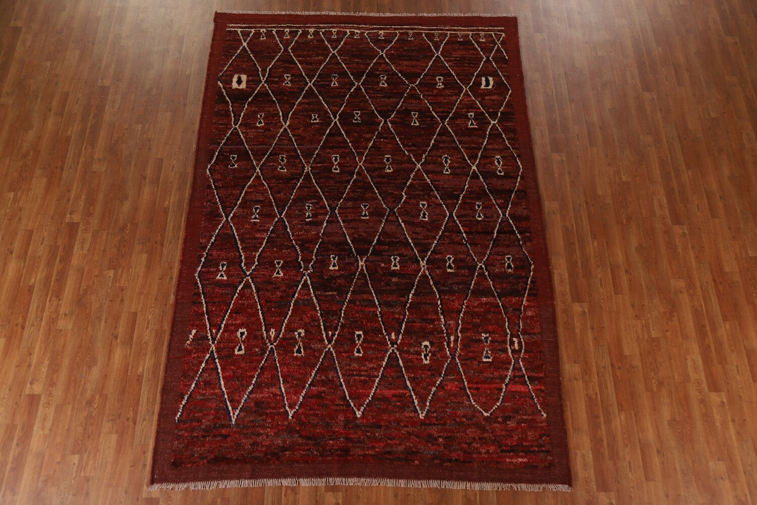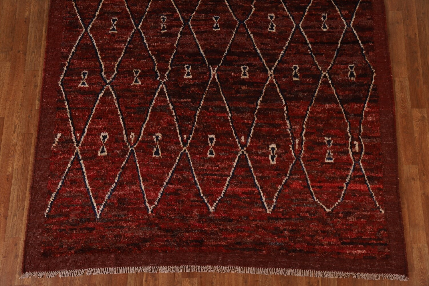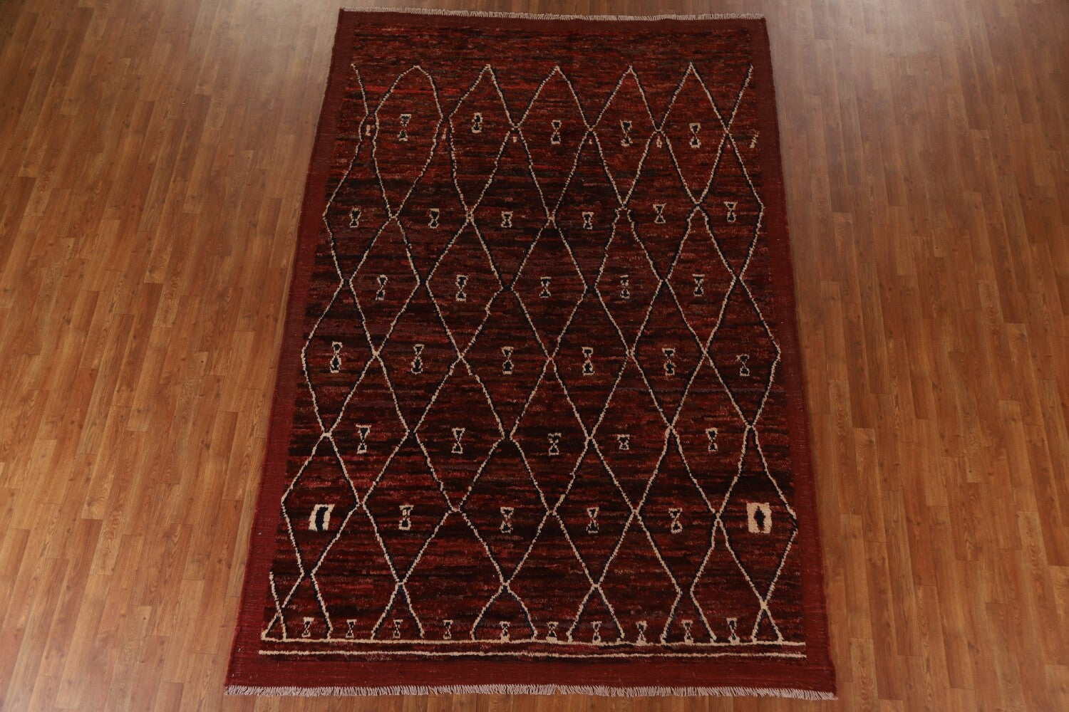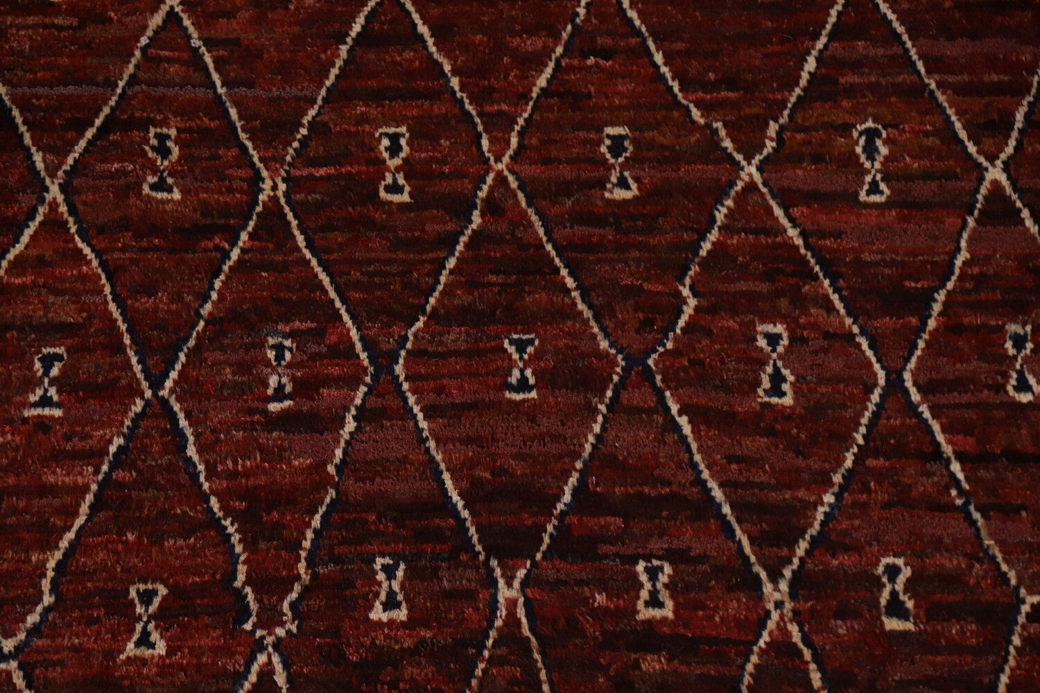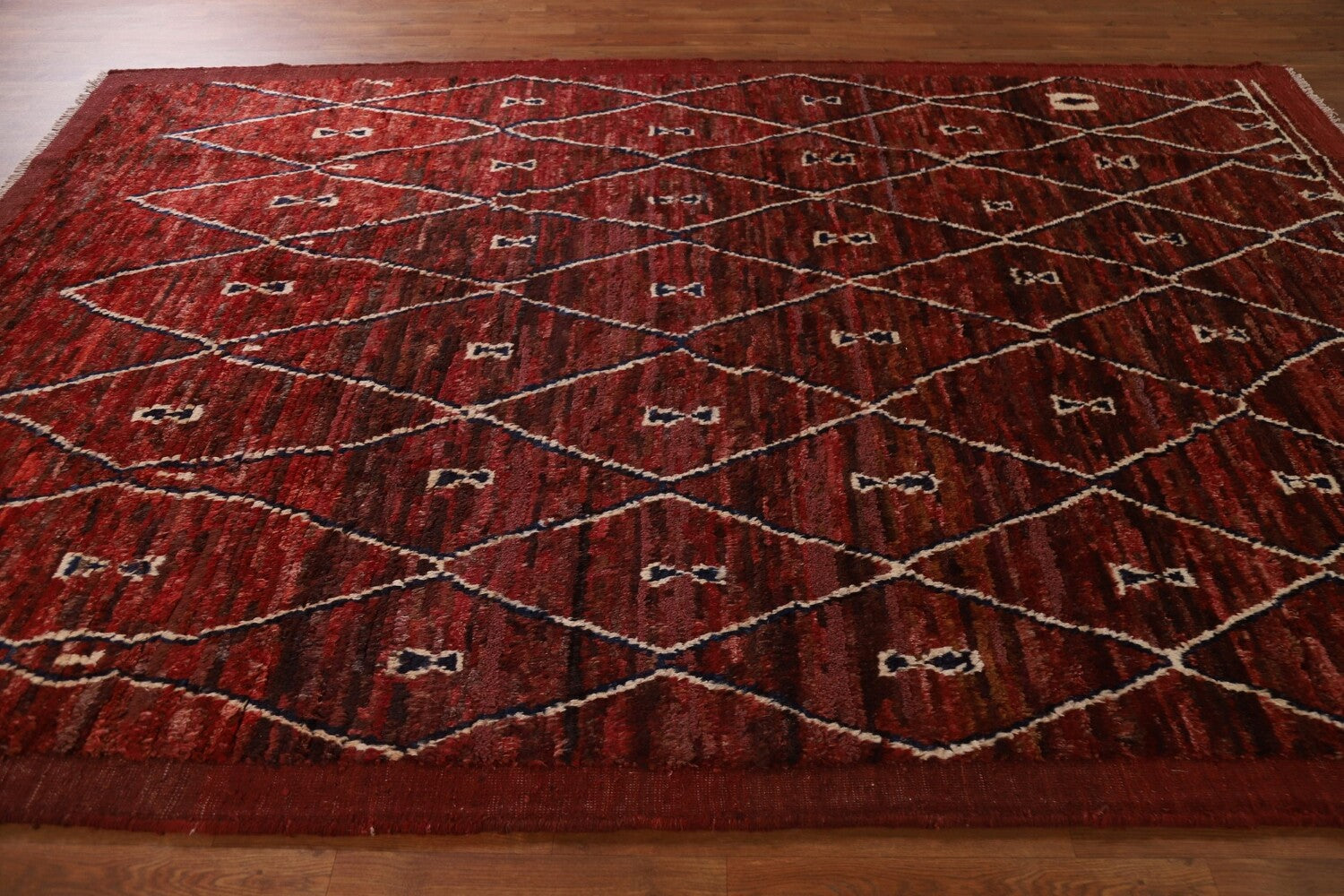 A Beautiful Genuine Pakistan Moroccan rug is Hand Knotted by skillful weavers in Pakistan with 100% Wool Material. This rug is in New, First Quality condition. dimensions are 10' 2'' X 6' 9'' in foot and 310 X 206 in centimeter. the primary color is Red.