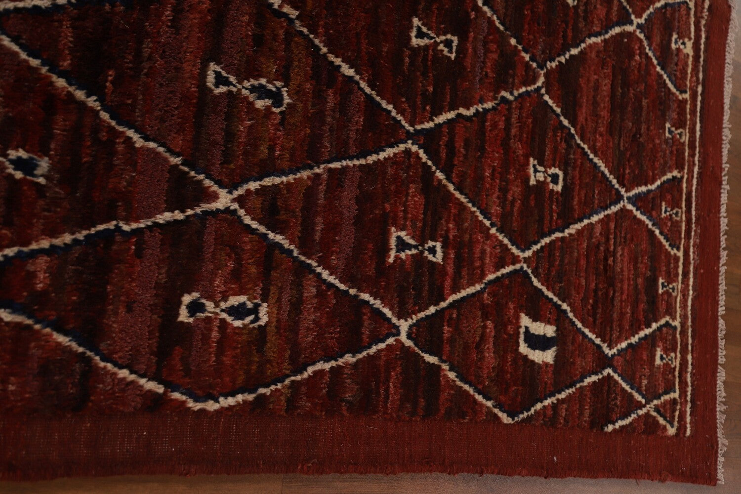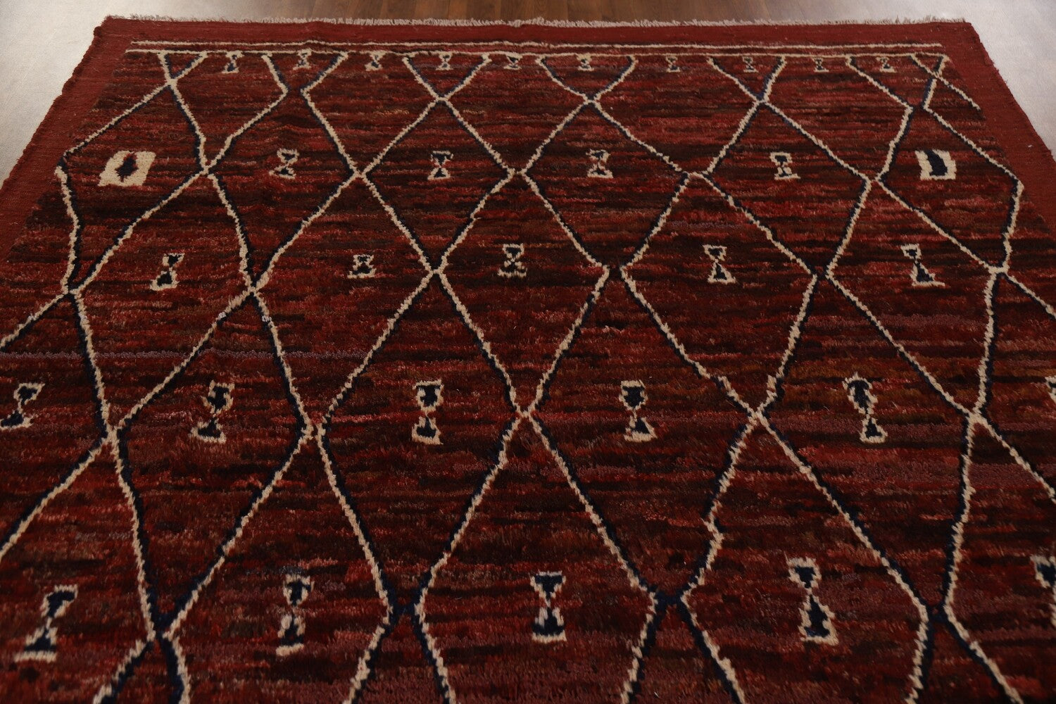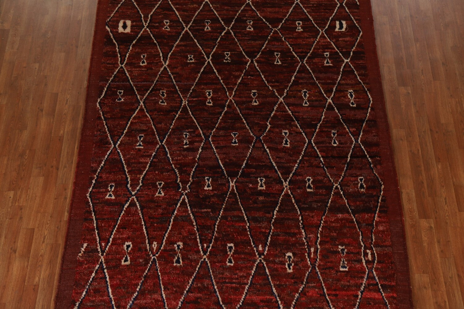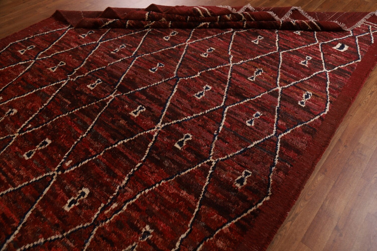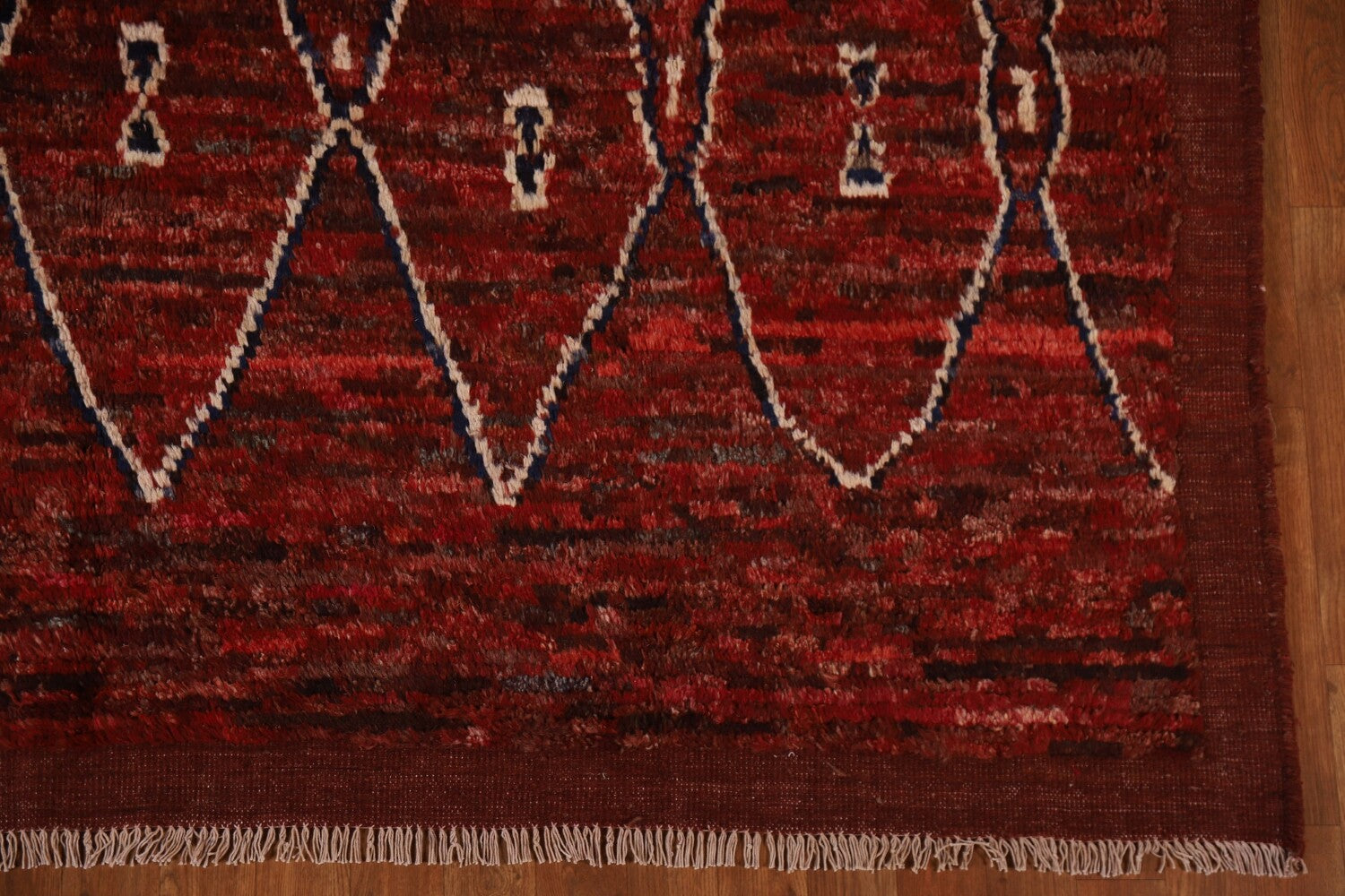 A Beautiful Genuine Pakistan Moroccan rug is Hand Knotted by skillful weavers in Pakistan with 100% Wool Material. This rug is in New, First Quality condition. dimensions are 10' 2'' X 6' 9'' in foot and 310 X 206 in centimeter. the primary color is Red.