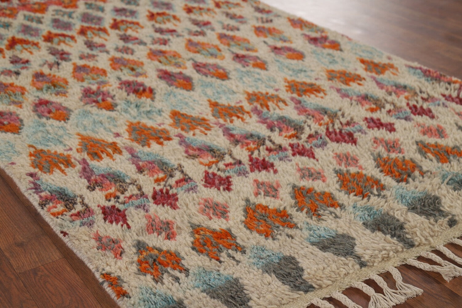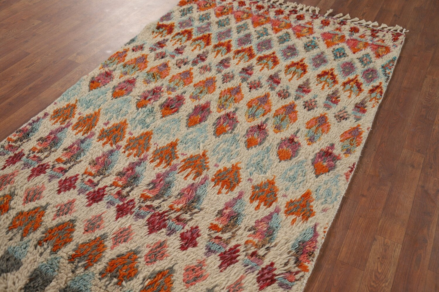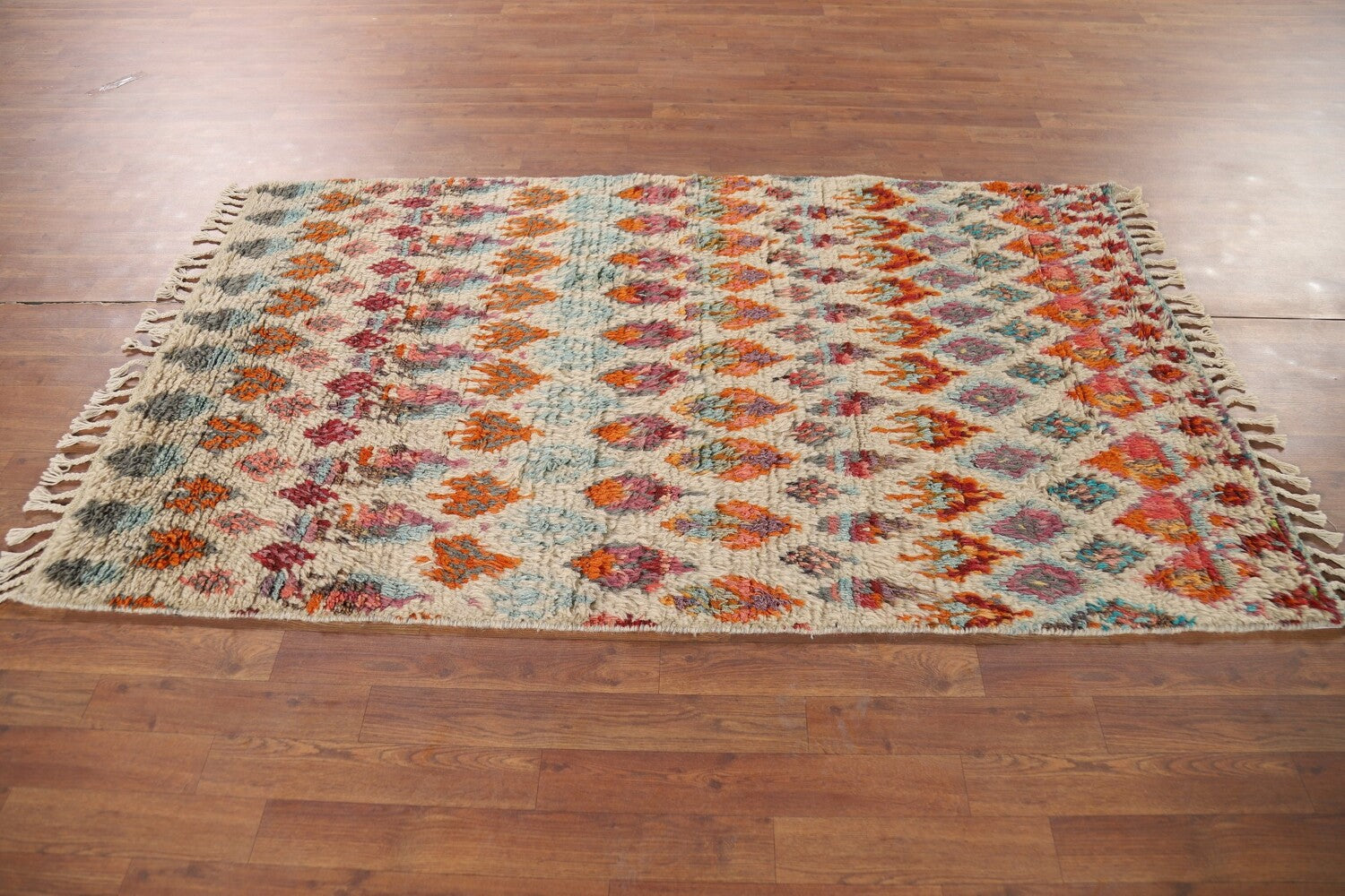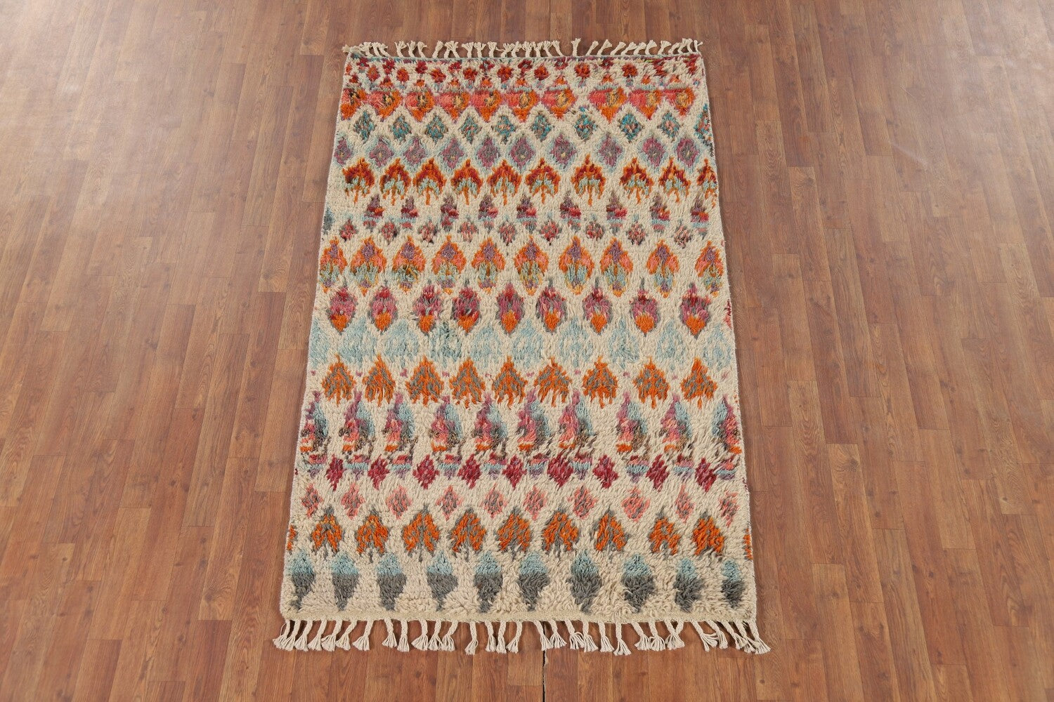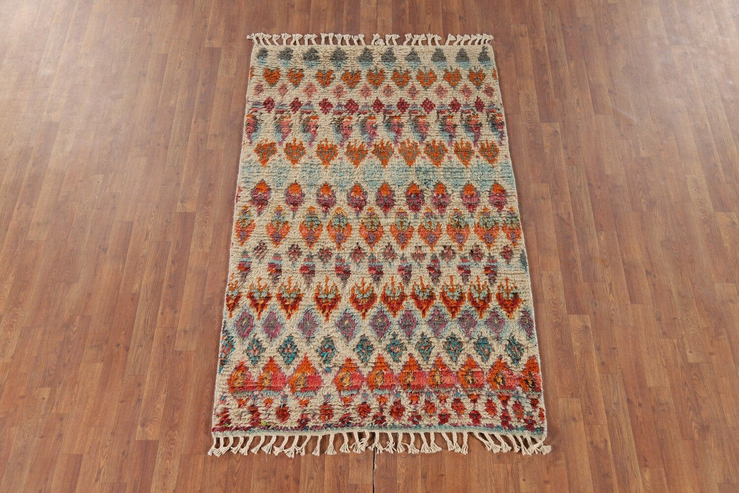 A Beautiful Genuine Pakistan Moroccan rug is Hand Knotted by skillful weavers in Pakistan with 100% Wool Material. This rug is in New, First Quality condition. dimensions are 6' 6'' X 3' 3'' in foot and 198 X 99 in centimeter. the primary color is Beige & Ivories.