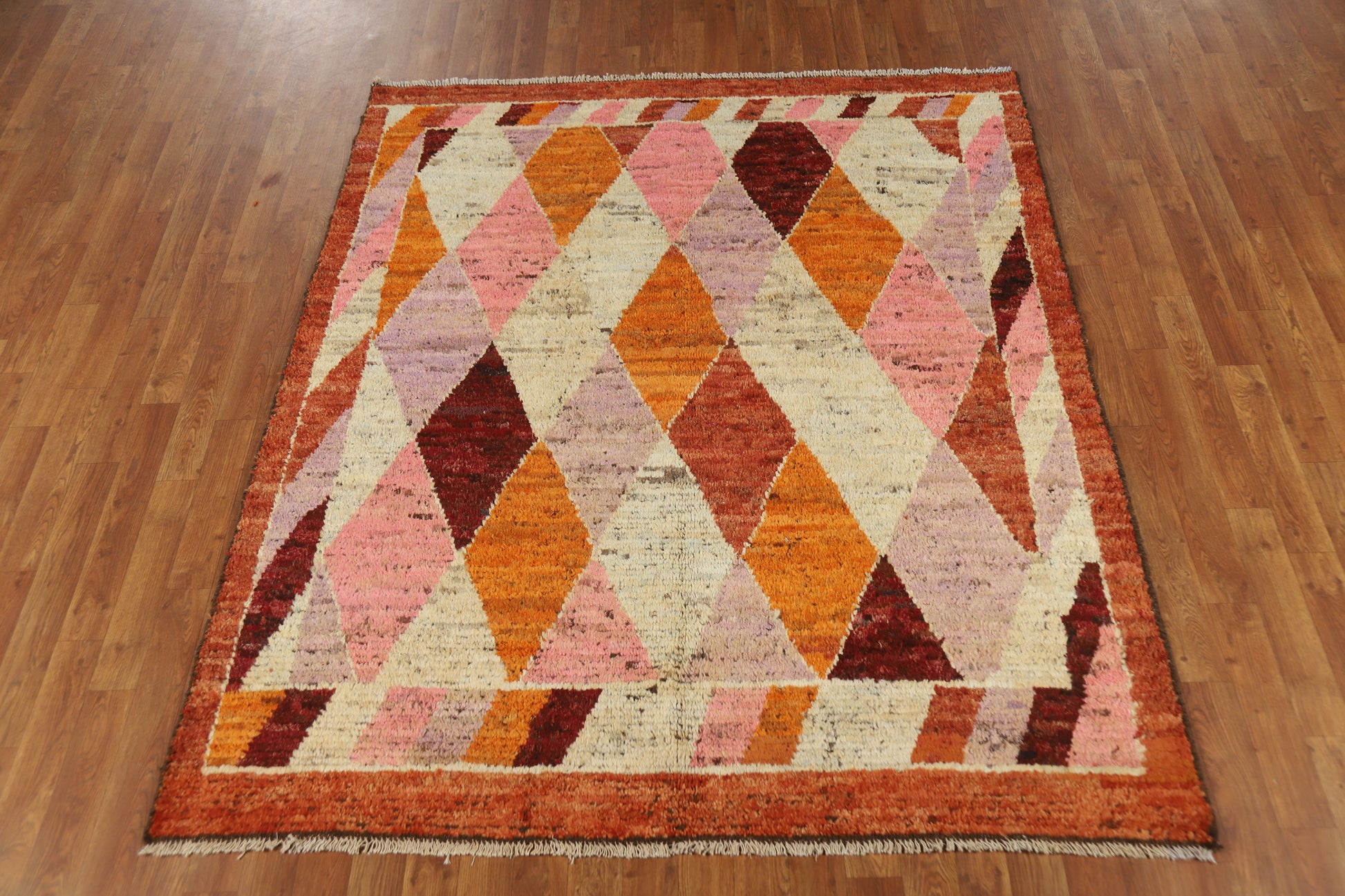 A Beautiful Genuine Pakistan Moroccan rug is Hand Knotted by skillful weavers in Pakistan with 100% Wool Material. This rug is in New, First Quality condition. dimensions are 6' 6'' X 5' 6'' in foot and 198 X 168 in centimeter. the primary color is Oranges & Rust.