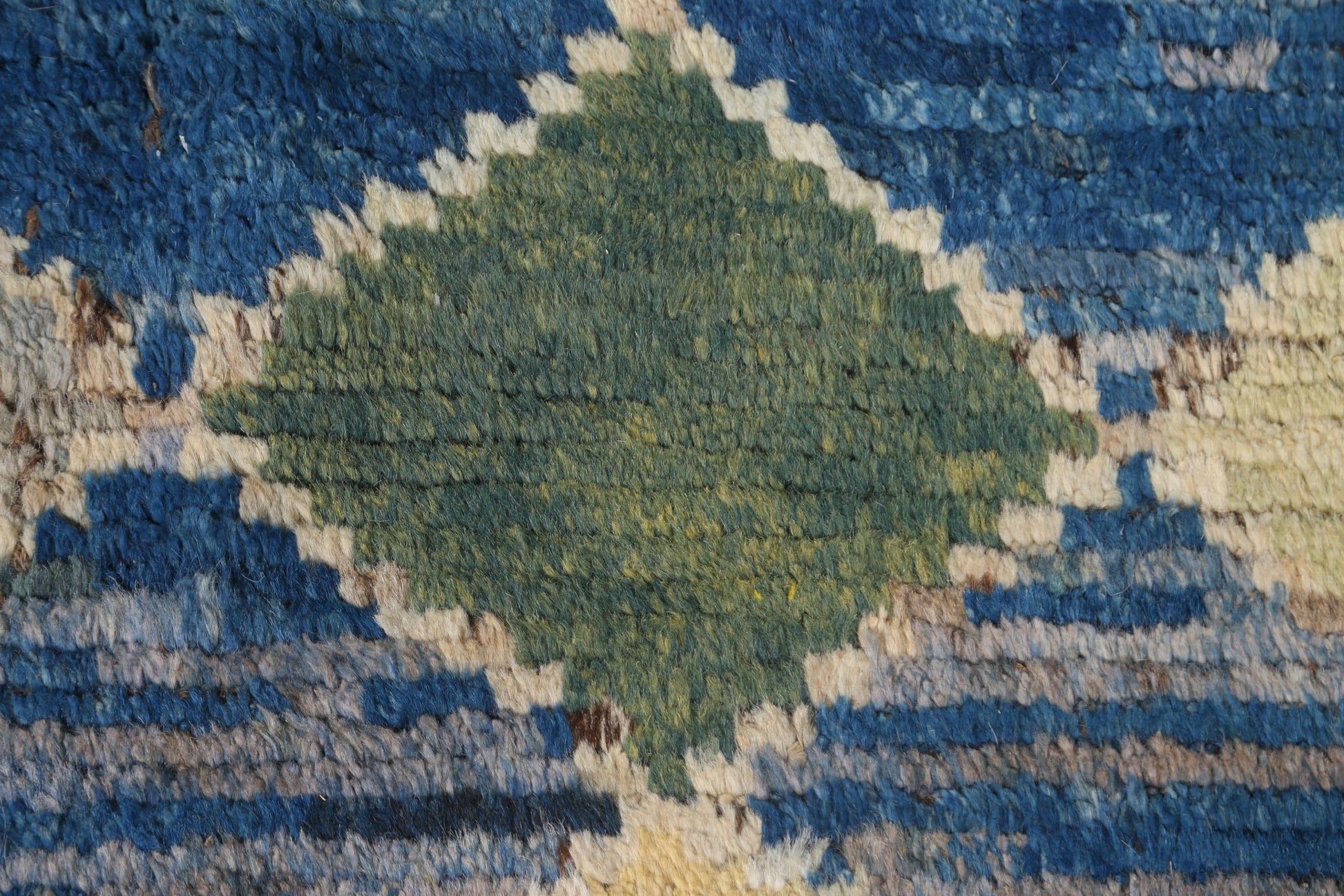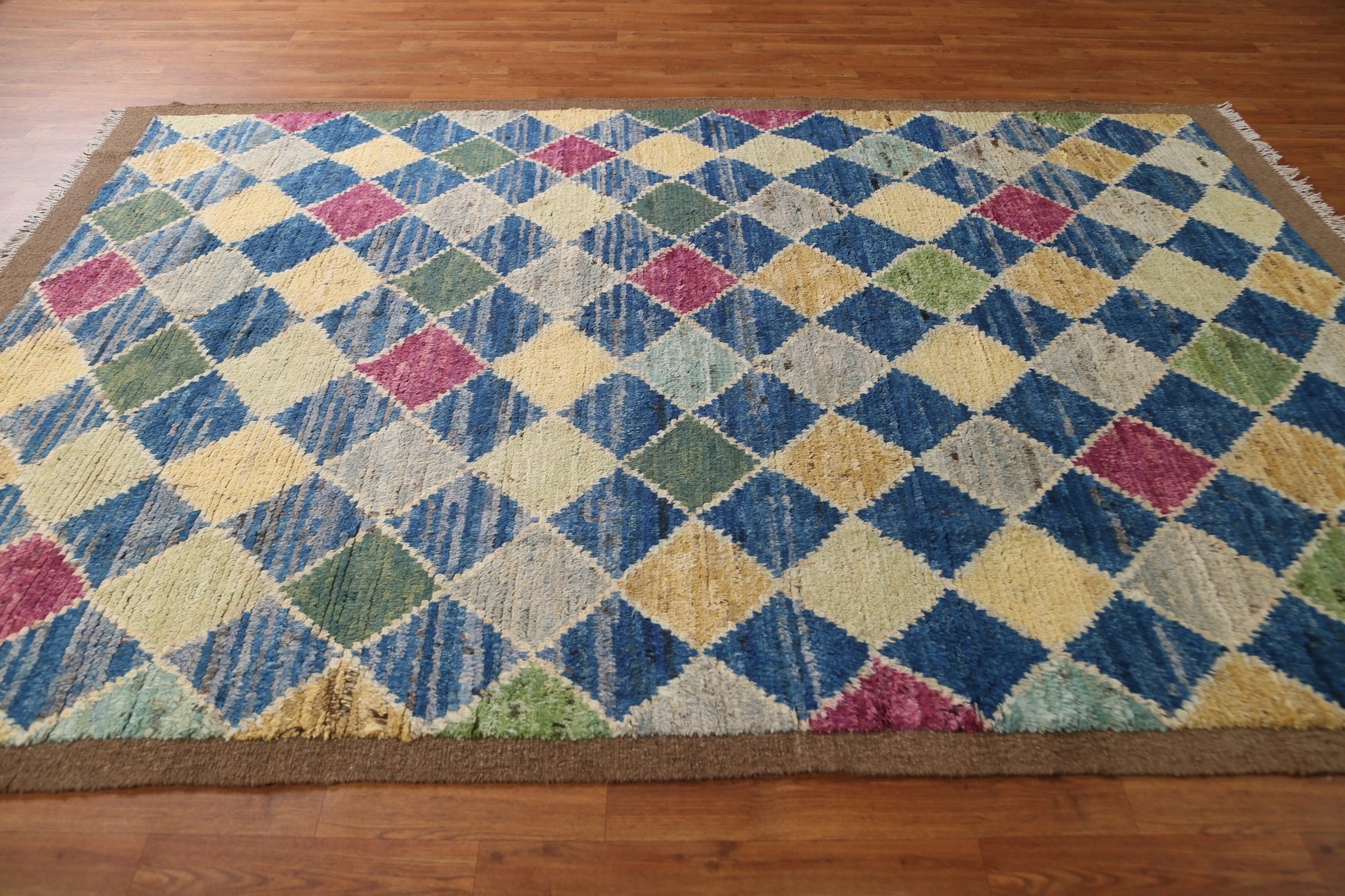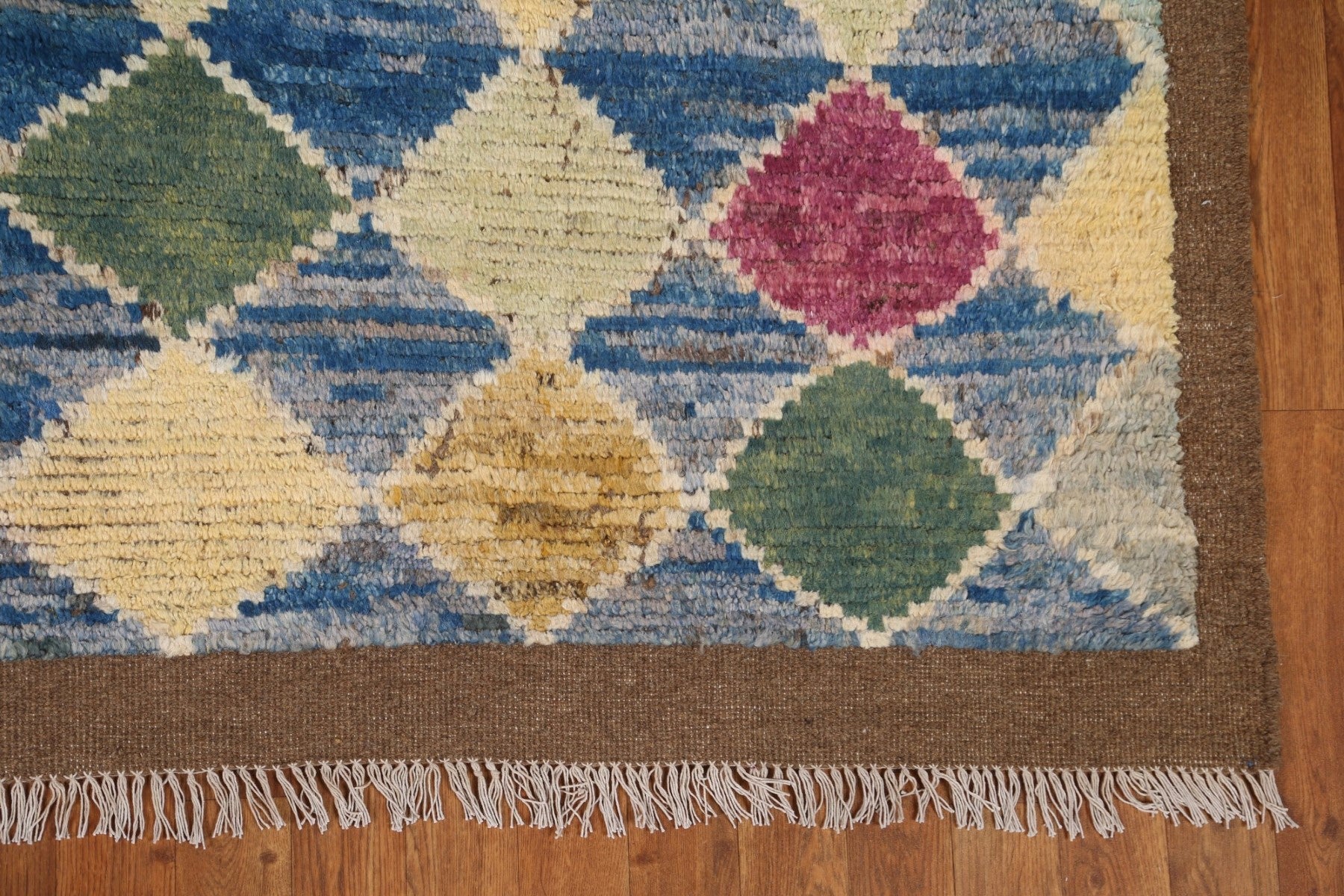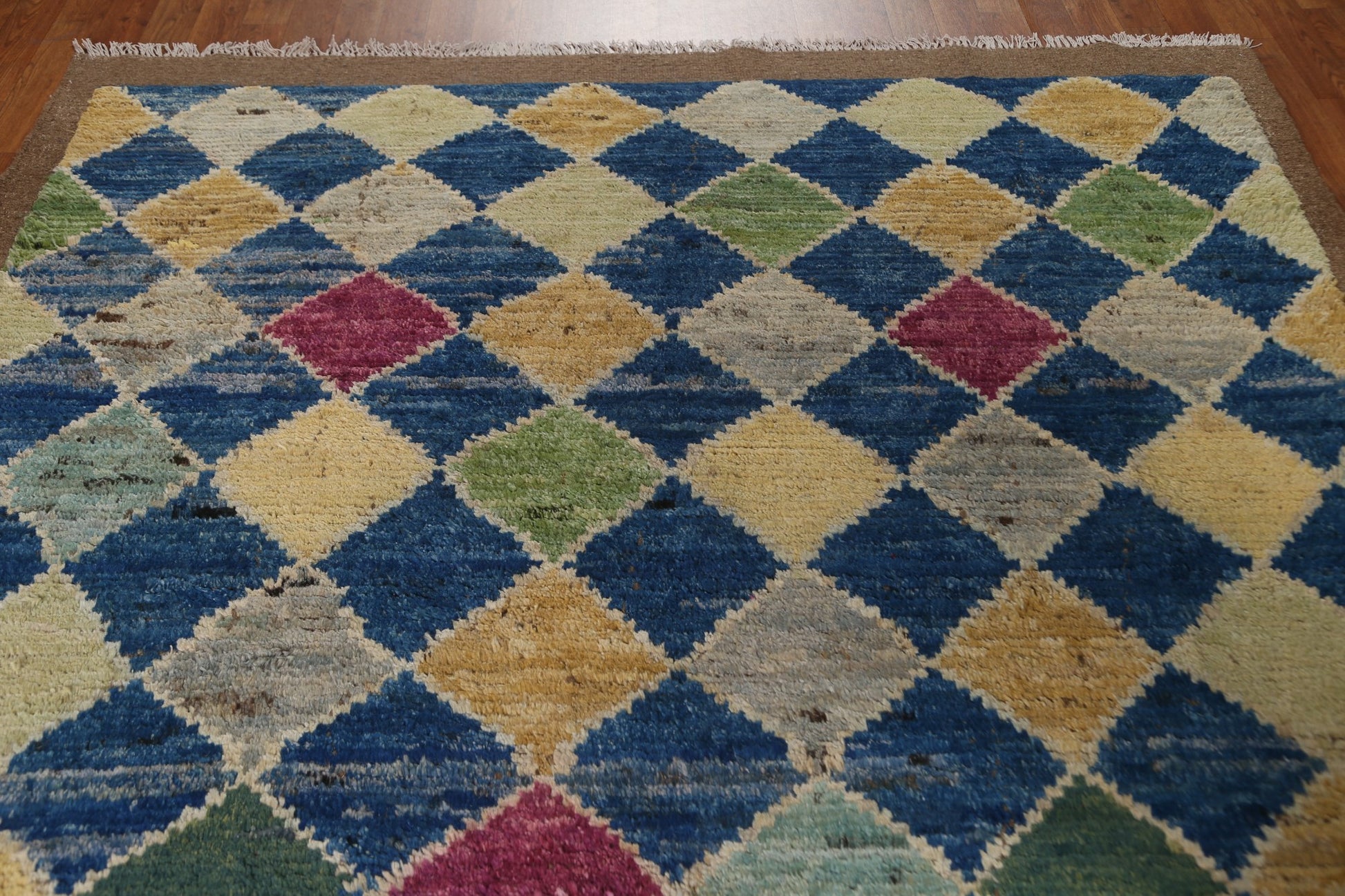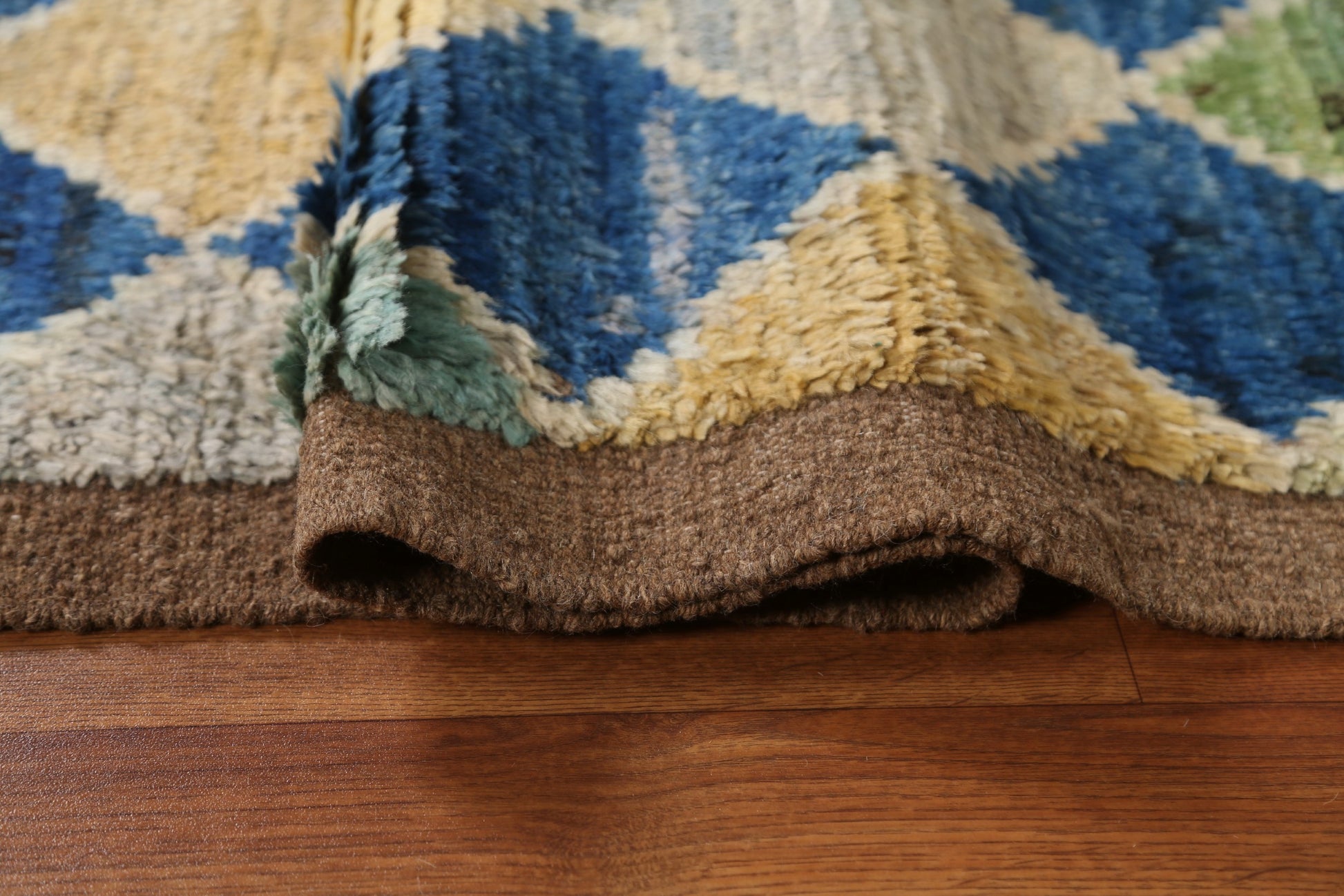 A Beautiful Genuine Pakistan Moroccan rug is Hand Knotted by skillful weavers in Pakistan with 100% Wool Material. This rug is in condition. dimensions are 9' 7'' X 7' 5'' in foot and 292 X 226 in centimeter. the primary color is Navy Blue & Blues.
