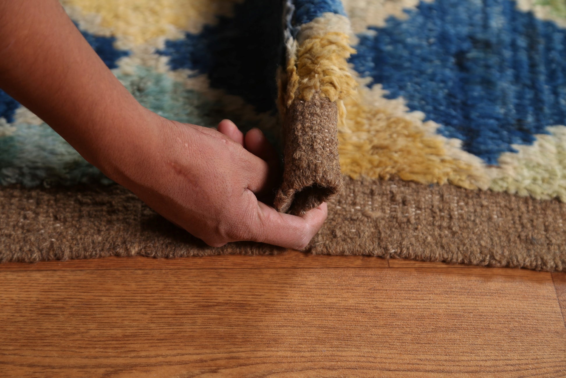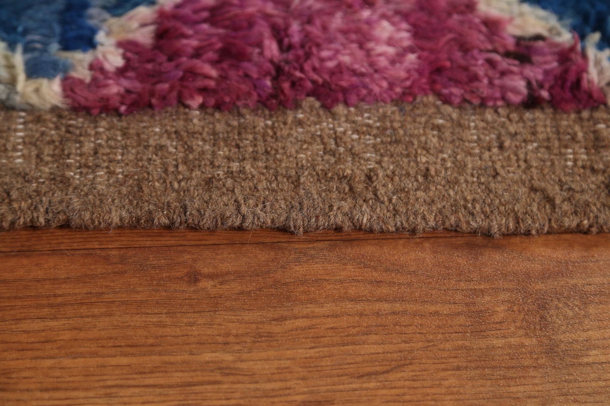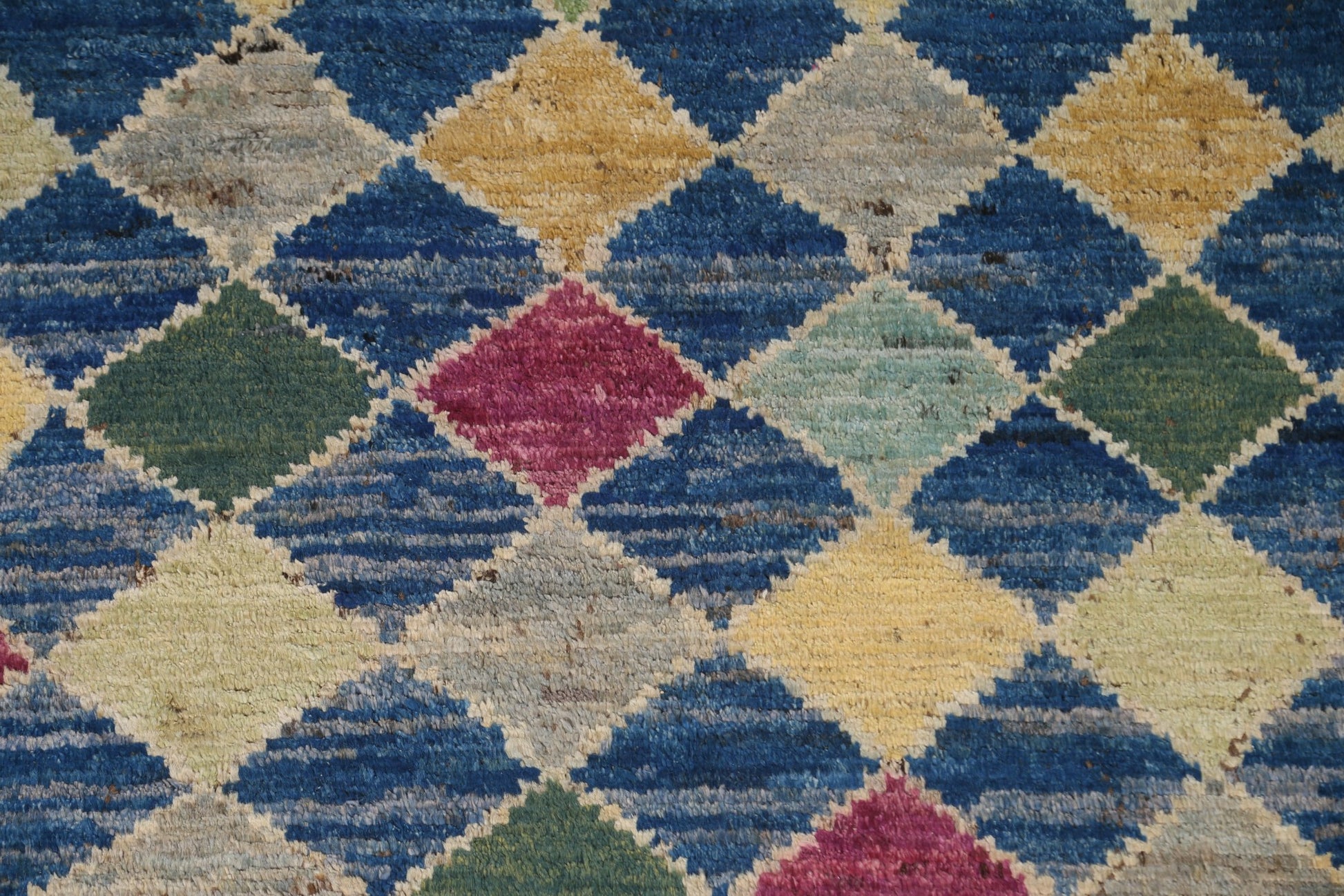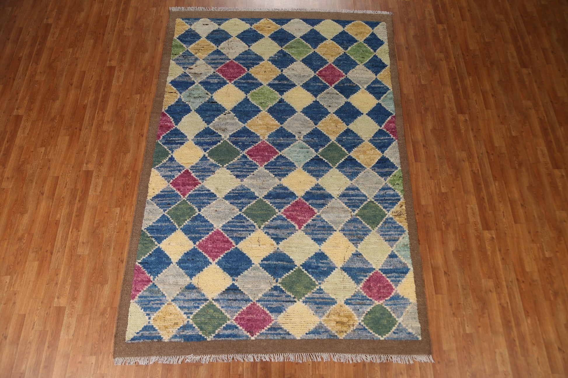 A Beautiful Genuine Pakistan Moroccan rug is Hand Knotted by skillful weavers in Pakistan with 100% Wool Material. This rug is in condition. dimensions are 9' 7'' X 7' 5'' in foot and 292 X 226 in centimeter. the primary color is Navy Blue & Blues.