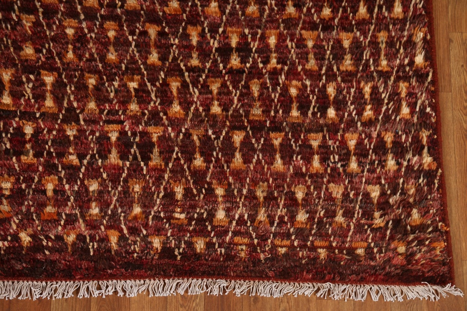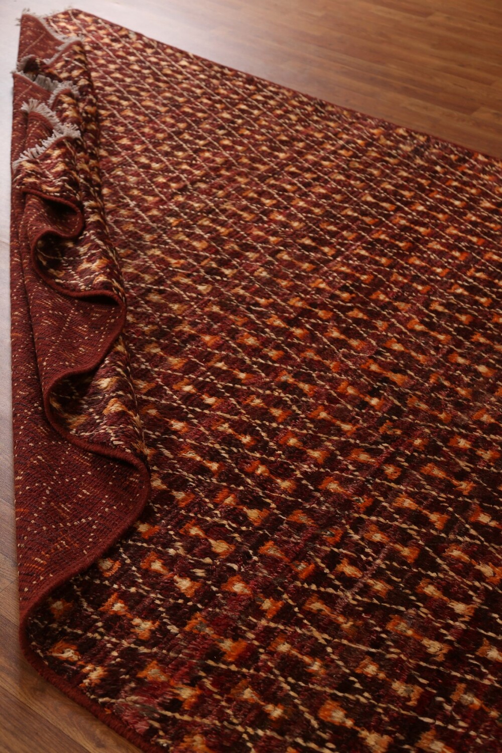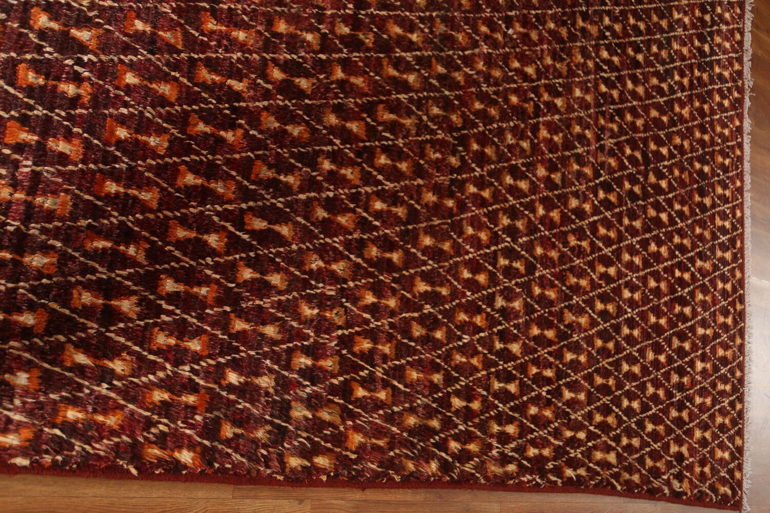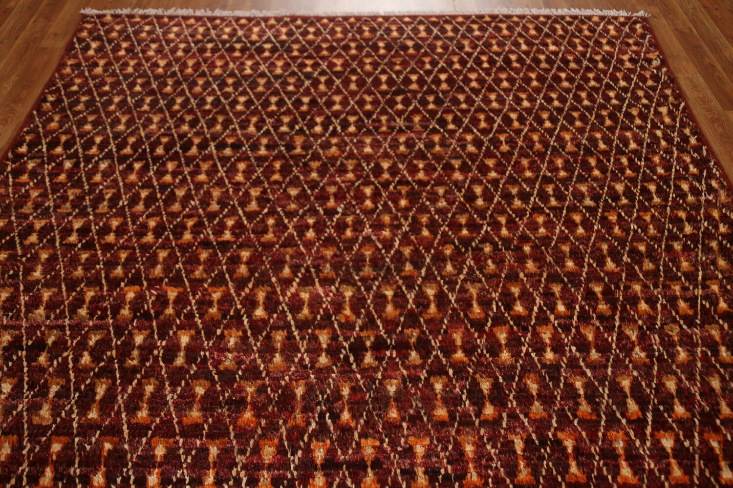 A Beautiful Genuine Pakistan Moroccan rug is Hand Knotted by skillful weavers in Pakistan with 100% Wool Material. This rug is in condition. dimensions are 9' 8'' X 6' 6'' in foot and 295 X 198 in centimeter. the primary color is Red.