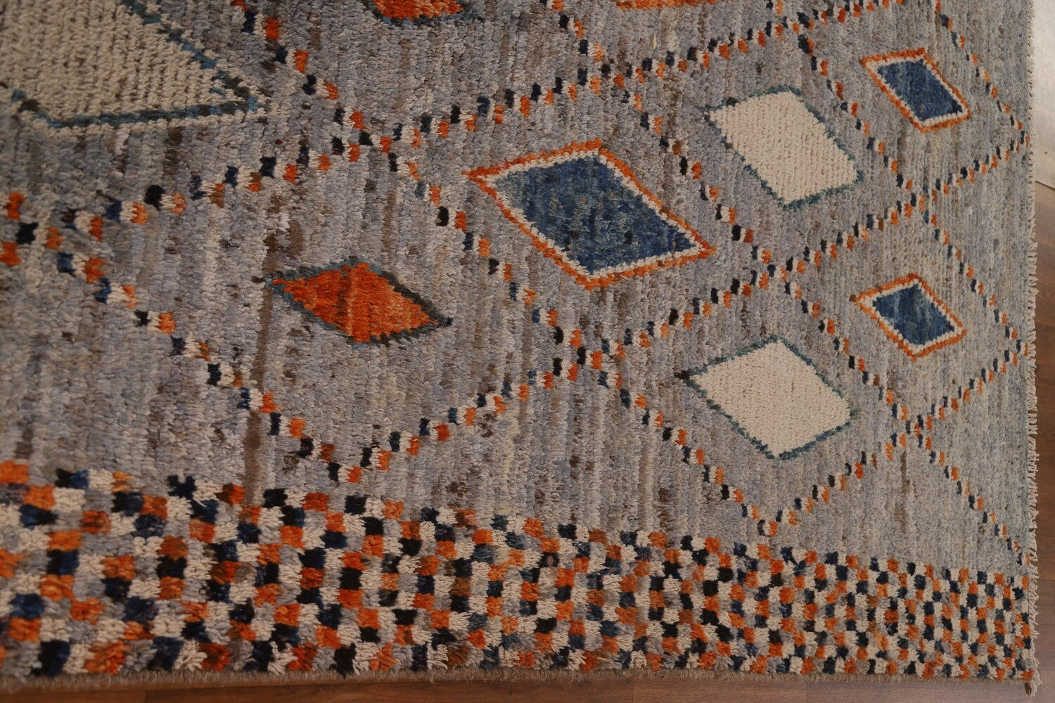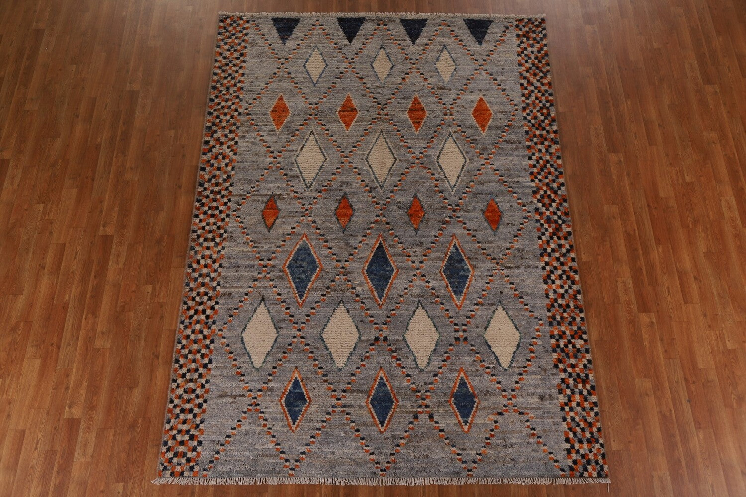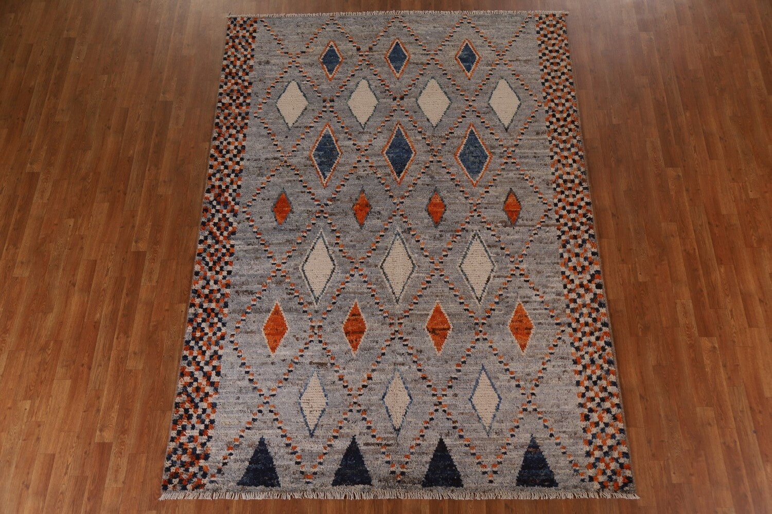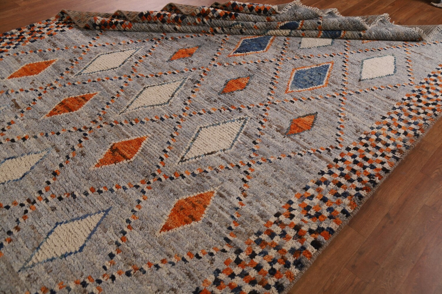 A Beautiful Genuine Pakistan Moroccan rug is Hand Knotted by skillful weavers in Pakistan with 100% Wool Material. This rug is in condition. dimensions are 9' 7'' X 6' 11'' in foot and 292 X 211 in centimeter. the primary color is Greys & Charcoal.