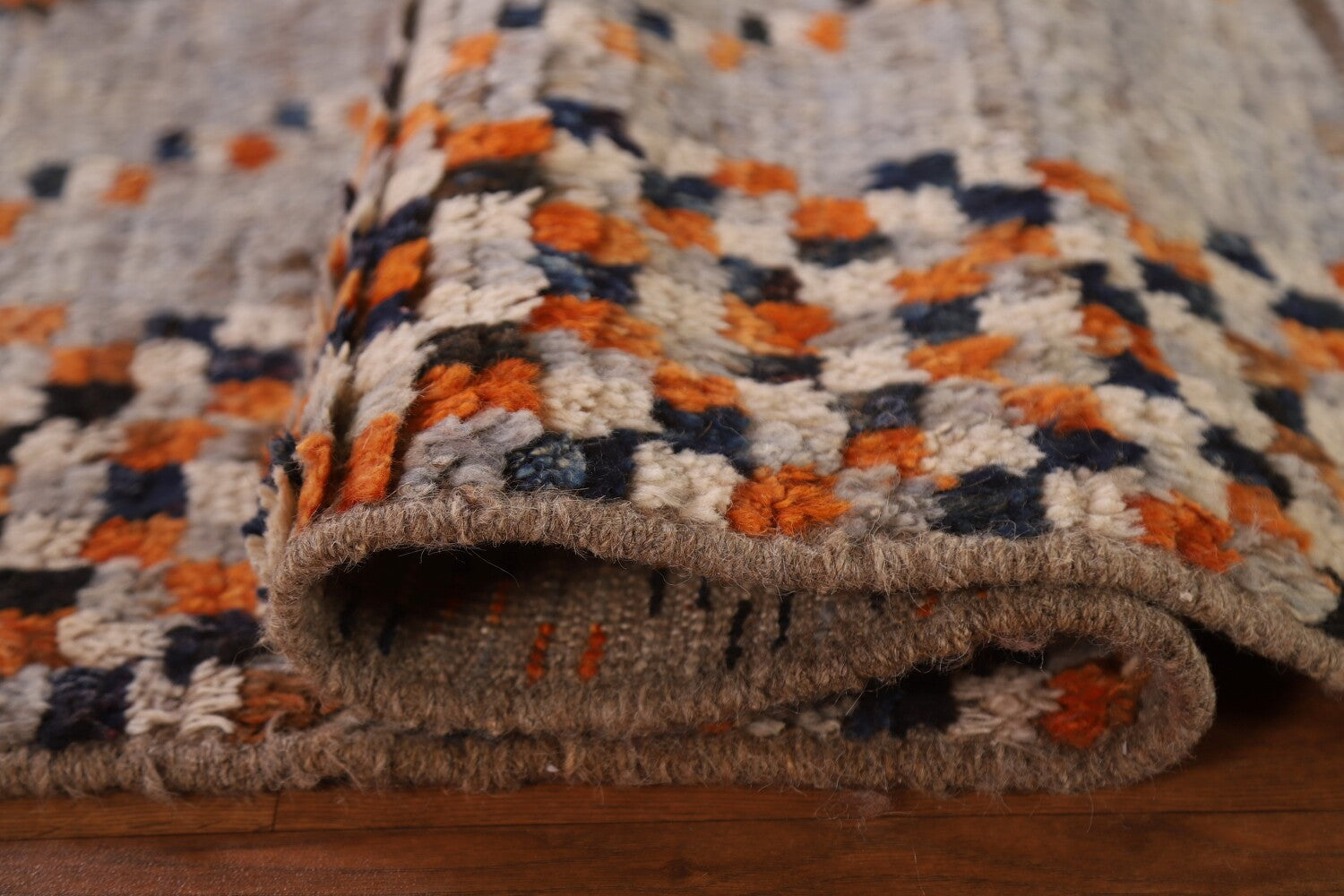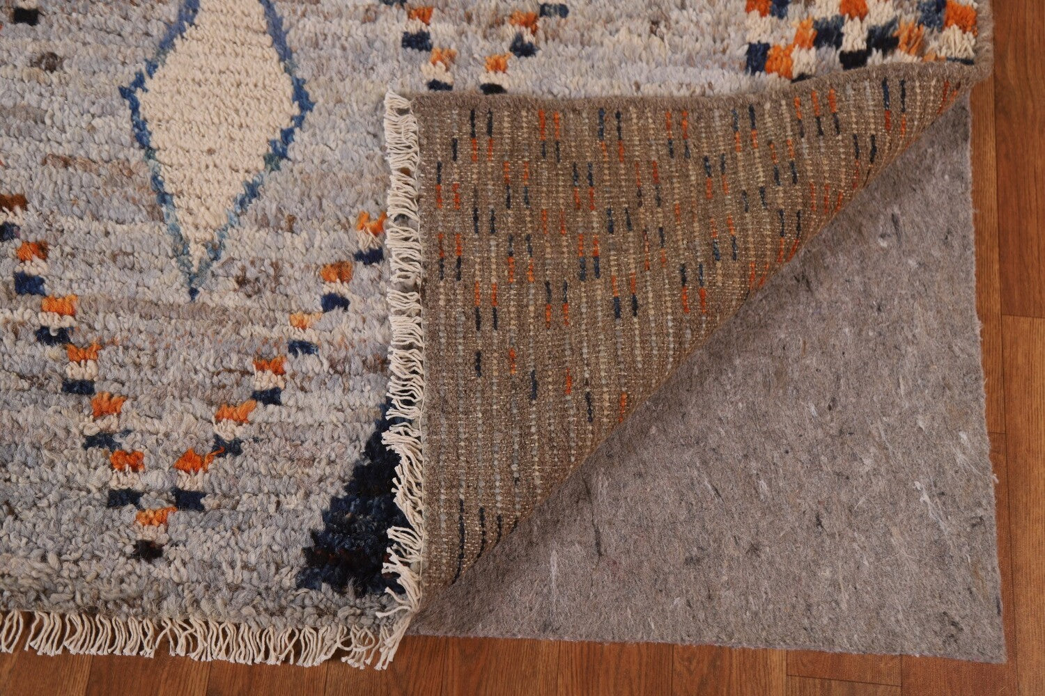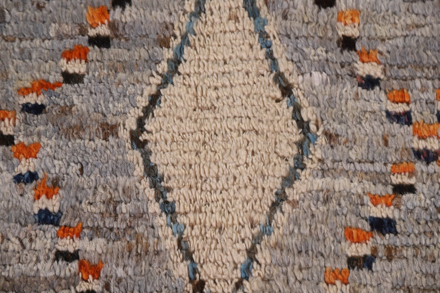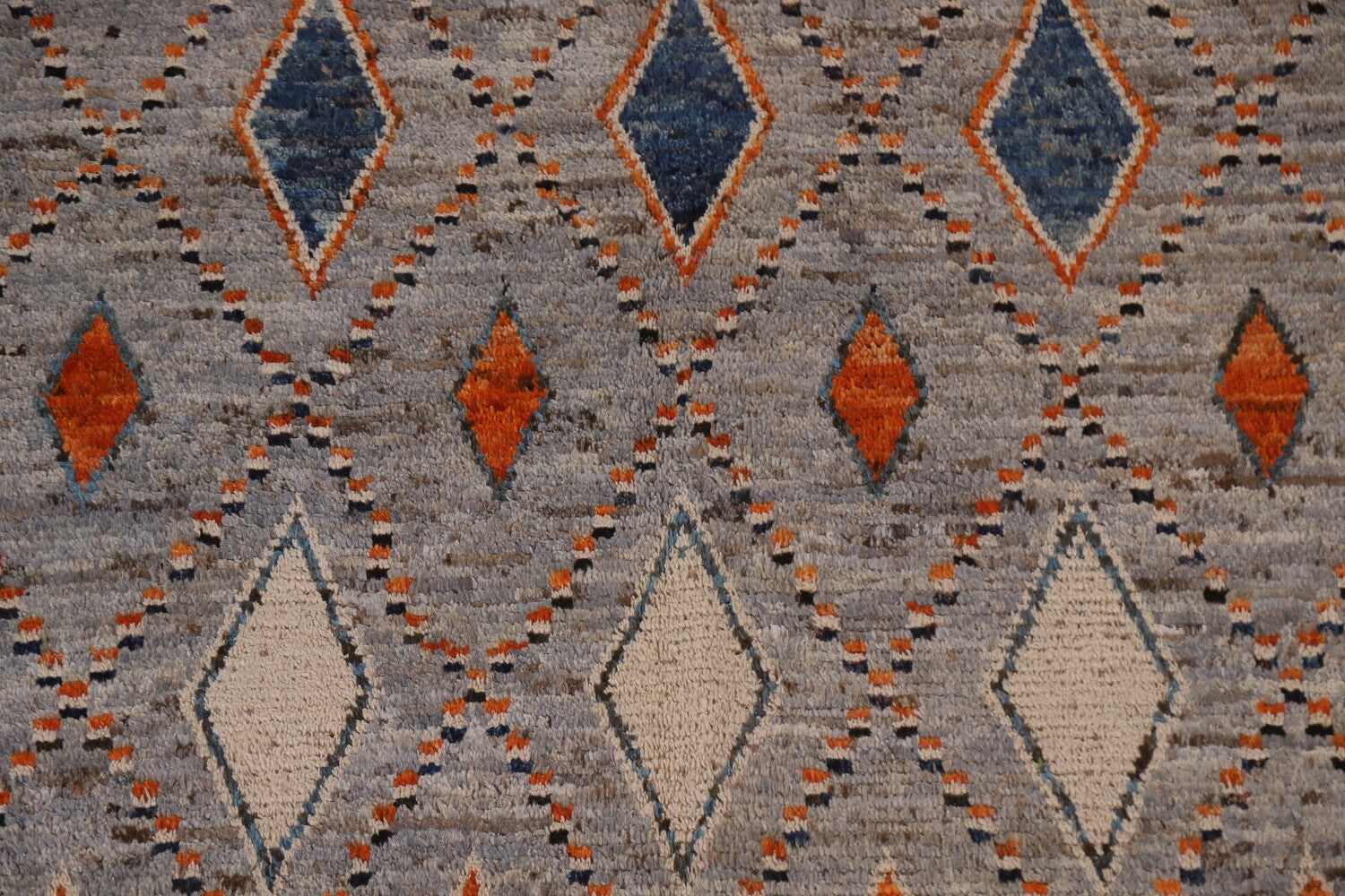 A Beautiful Genuine Pakistan Moroccan rug is Hand Knotted by skillful weavers in Pakistan with 100% Wool Material. This rug is in condition. dimensions are 9' 7'' X 6' 11'' in foot and 292 X 211 in centimeter. the primary color is Greys & Charcoal.