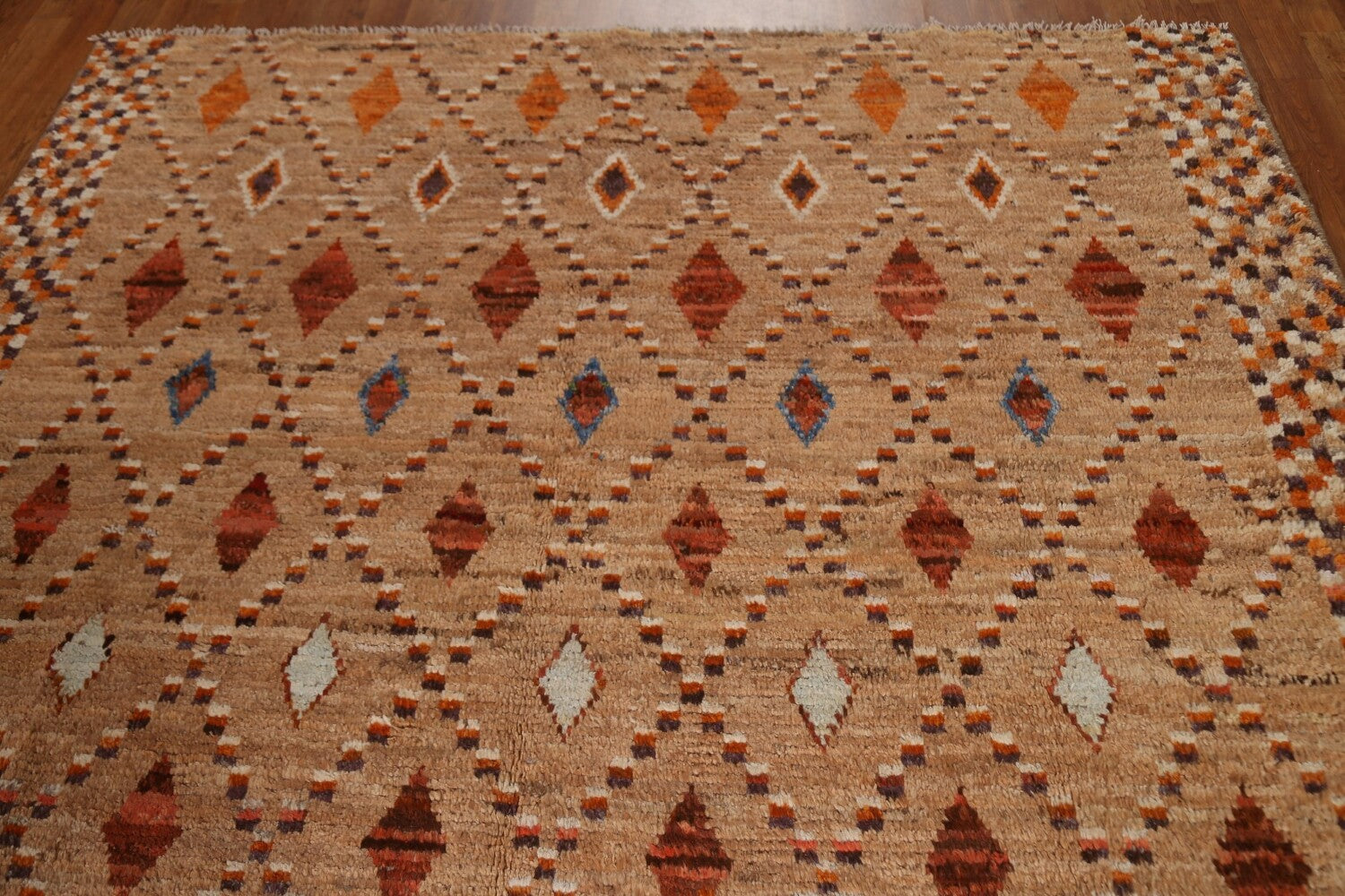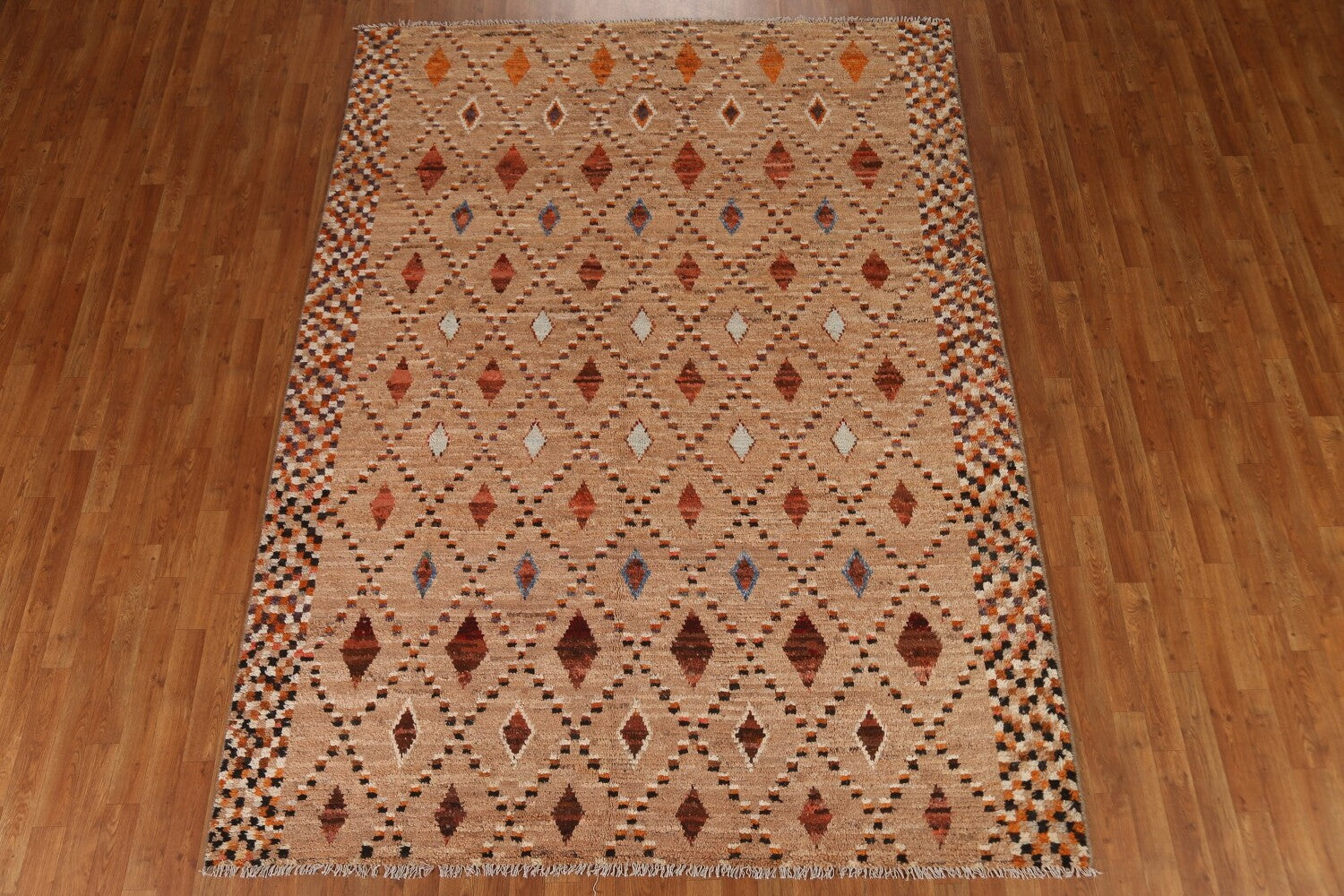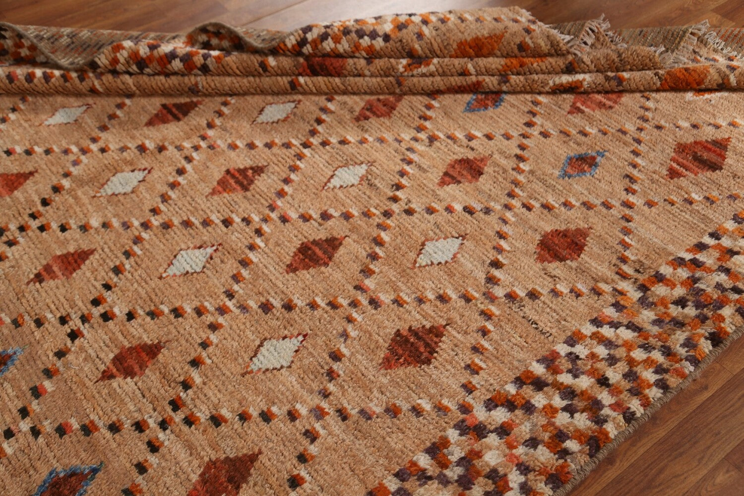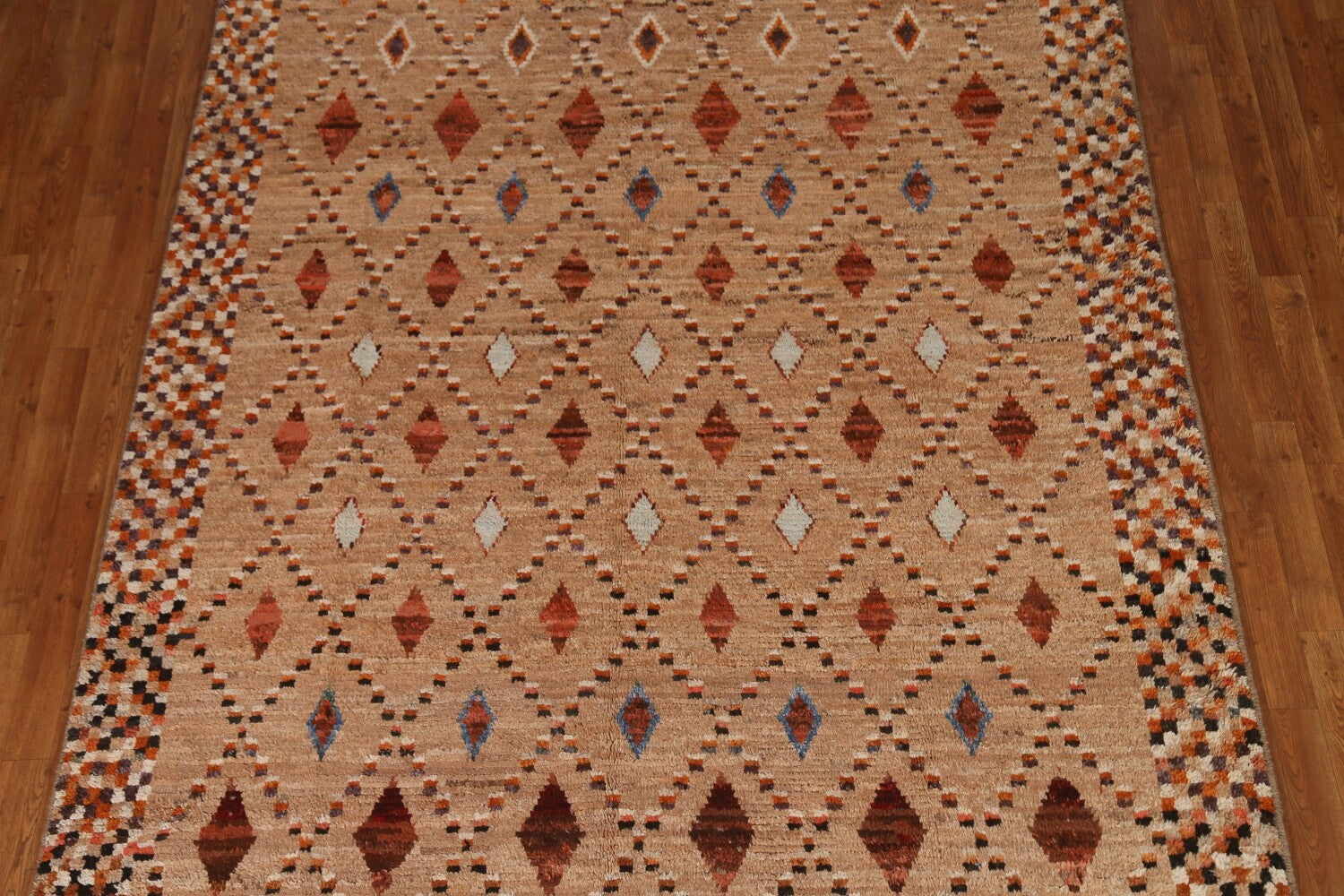 A Beautiful Genuine Pakistan Moroccan rug is Hand Knotted by skillful weavers in Pakistan with 100% Wool Material. This rug is in condition. dimensions are 9' 5'' X 7' 0'' in foot and 287 X 213 in centimeter. the primary color is Brown.