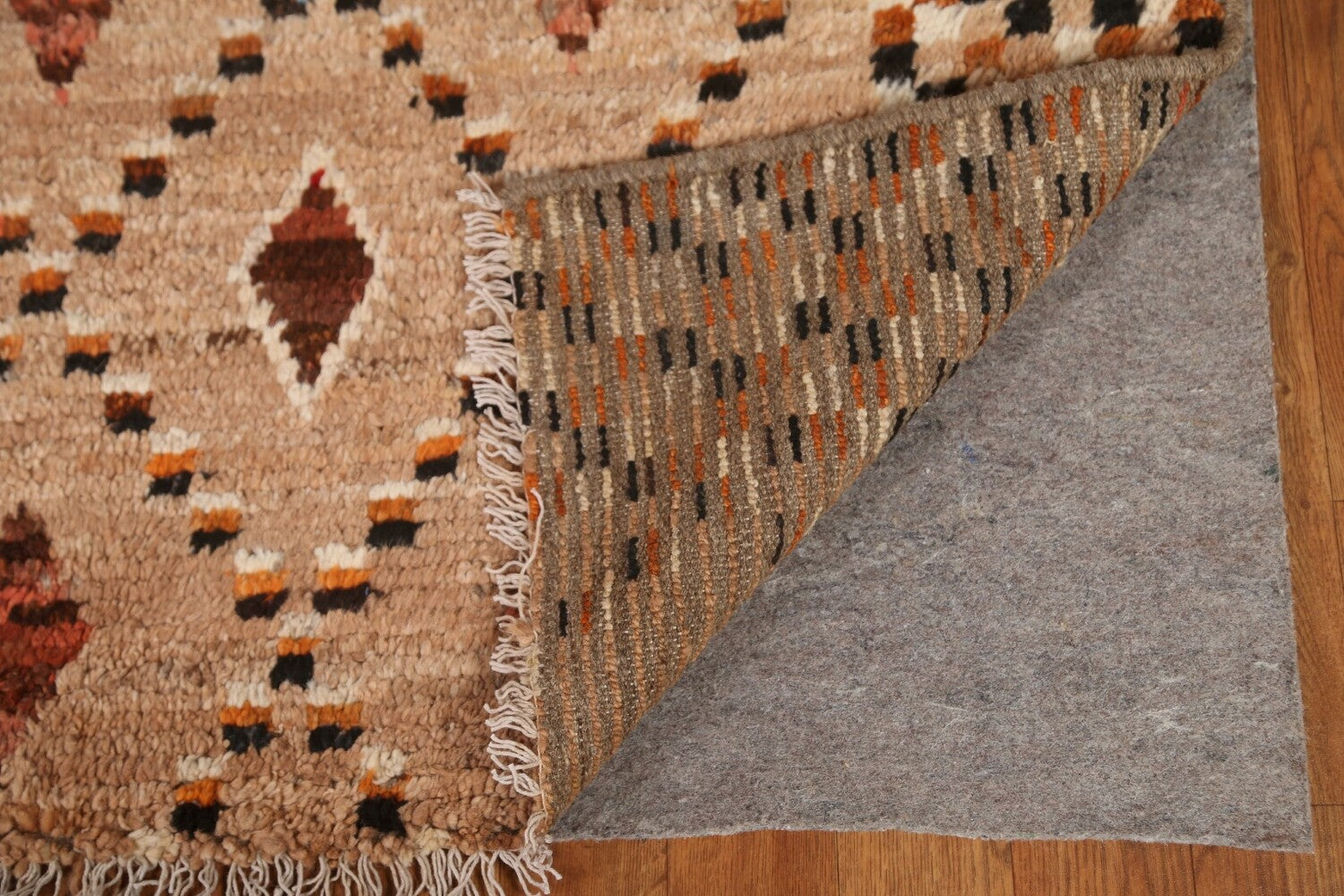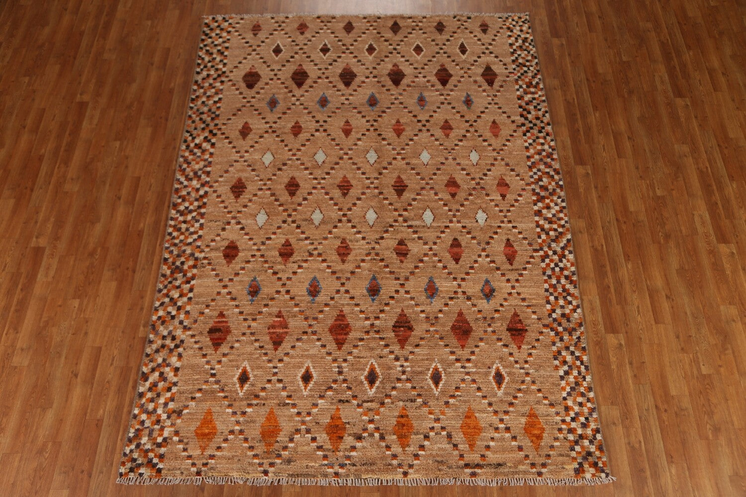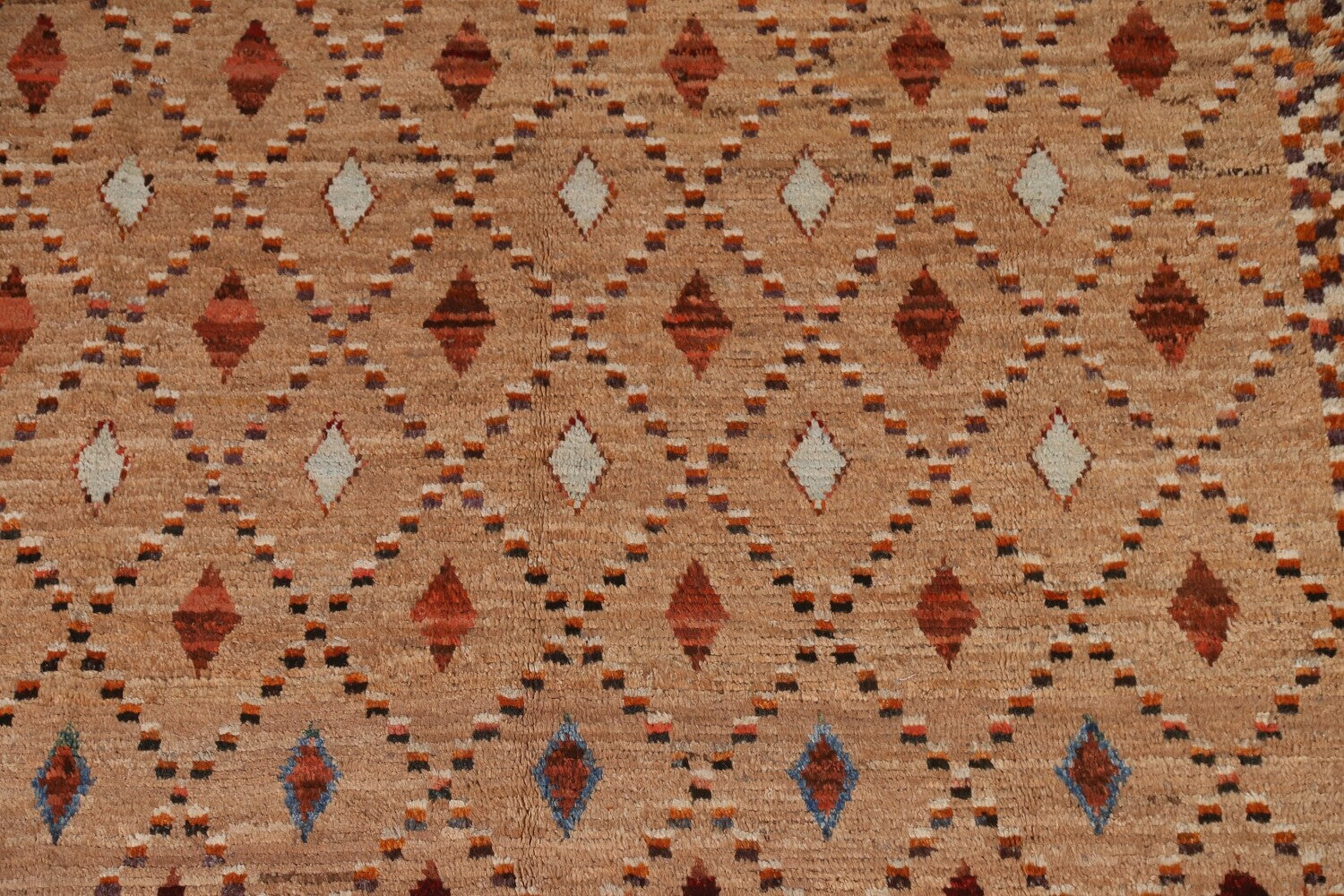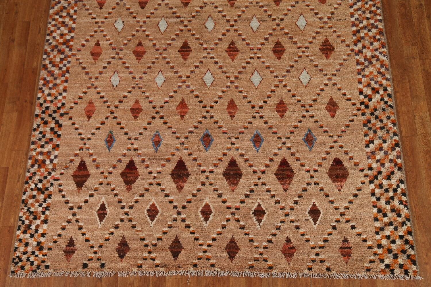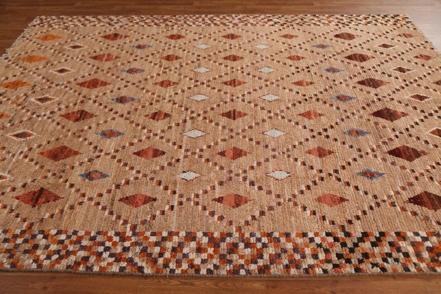 A Beautiful Genuine Pakistan Moroccan rug is Hand Knotted by skillful weavers in Pakistan with 100% Wool Material. This rug is in condition. dimensions are 9' 5'' X 7' 0'' in foot and 287 X 213 in centimeter. the primary color is Brown.