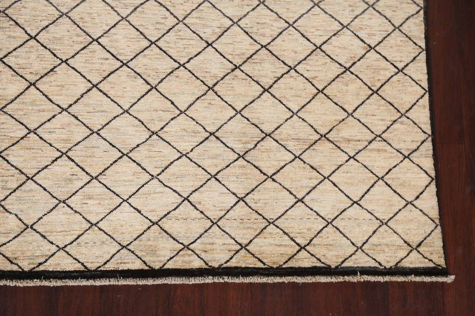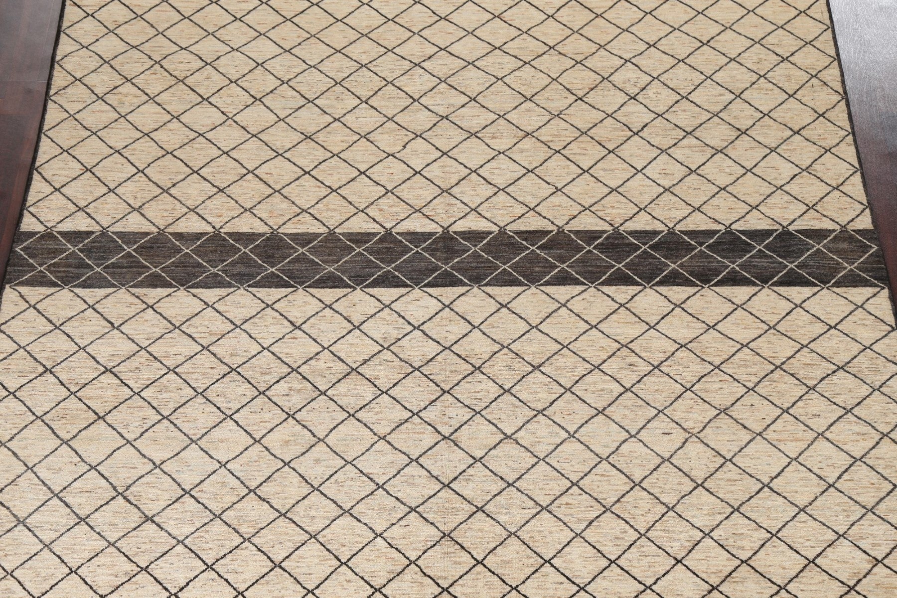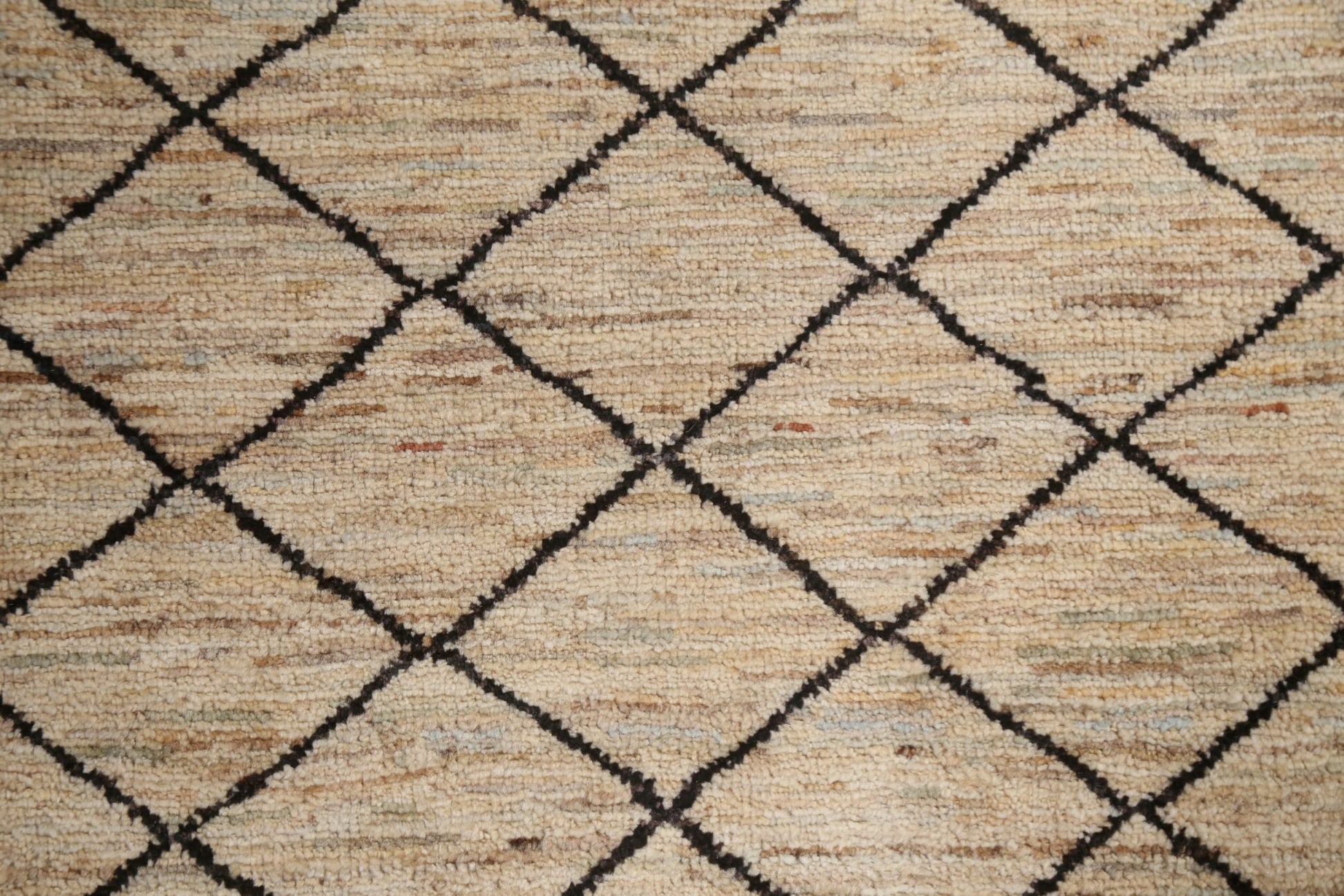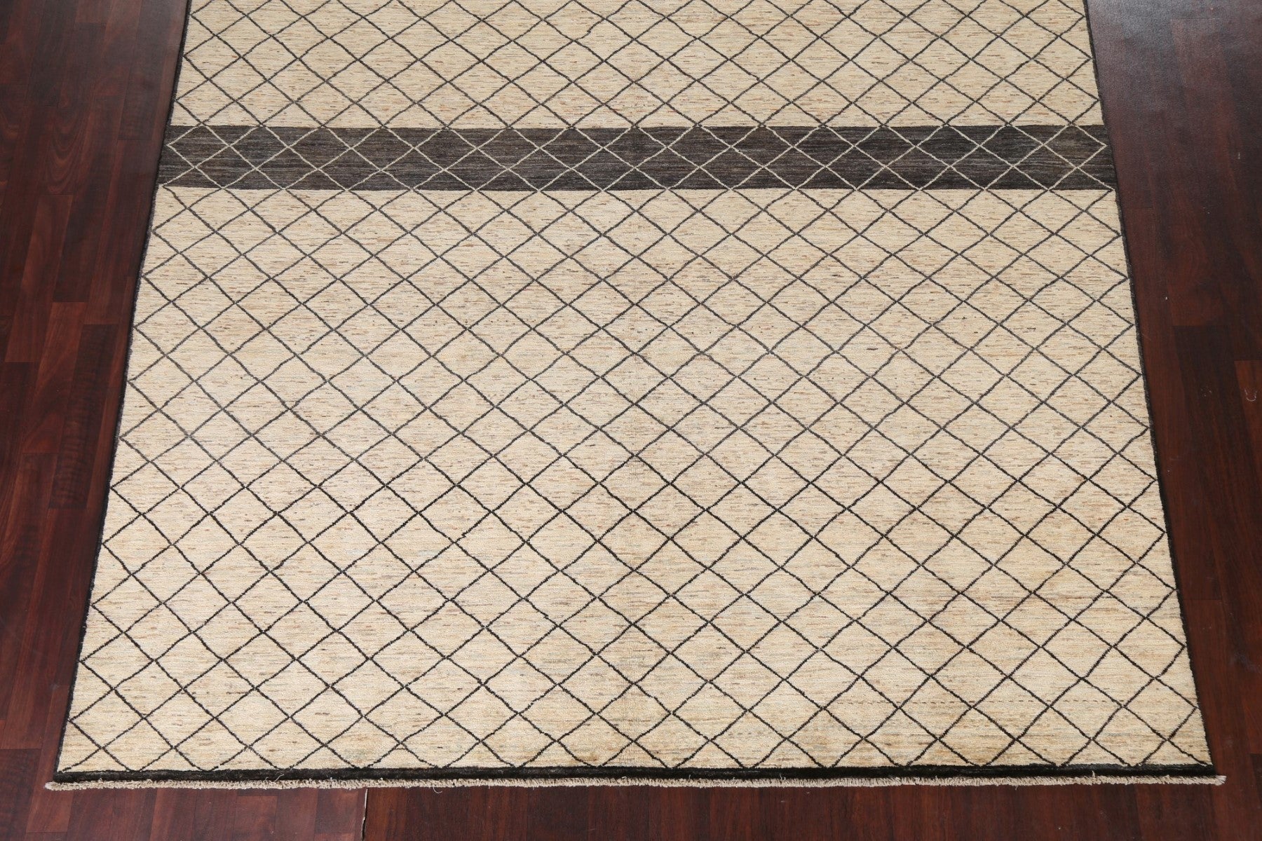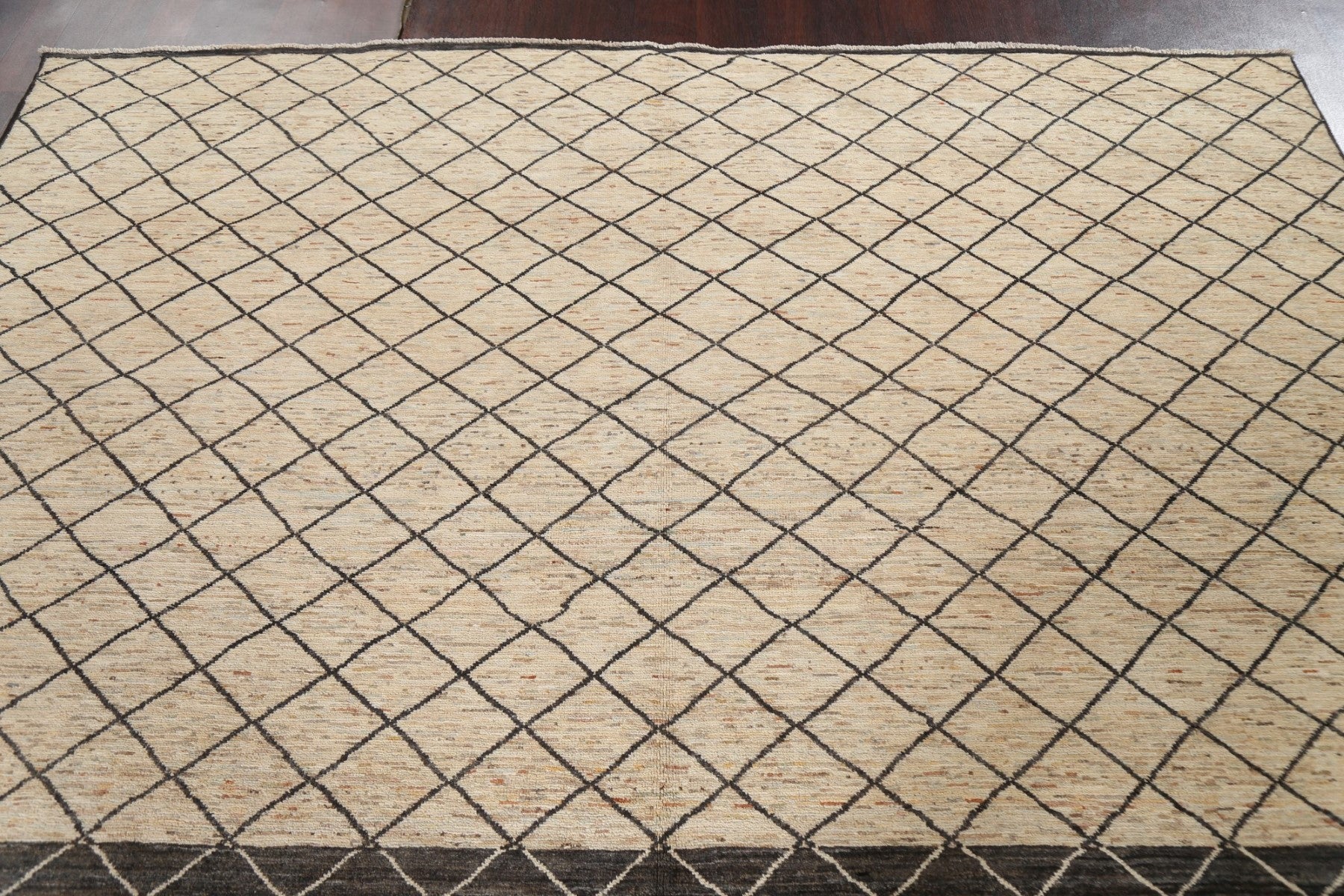 A Beautiful Genuine Pakistan Moroccan rug is Hand Knotted by skillful weavers in Pakistan with 100% Wool Material. This rug is in New, First Quality condition. dimensions are 10' 5'' X 7' 11'' in foot and 318 X 241 in centimeter. the primary color is Beige & Ivories.