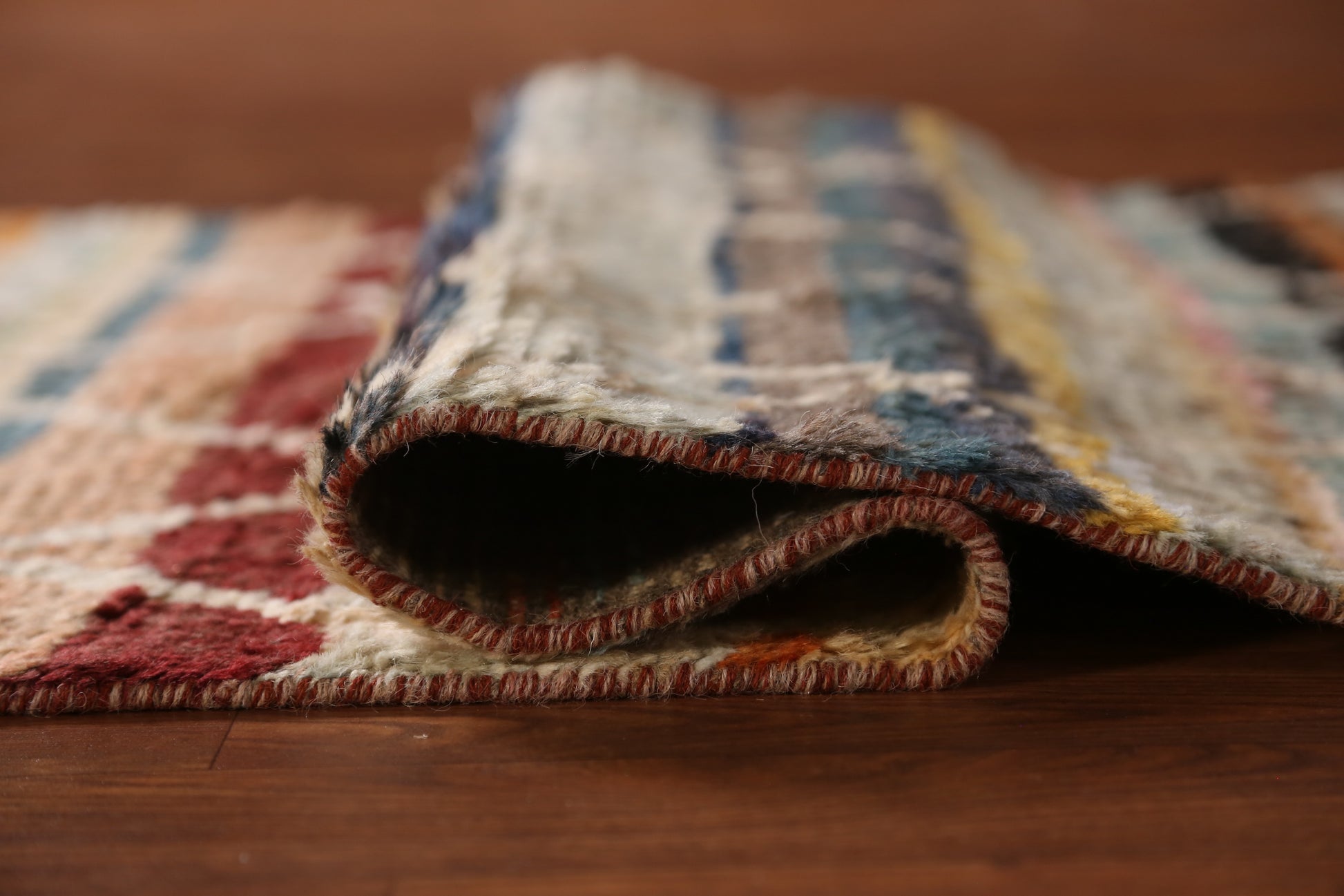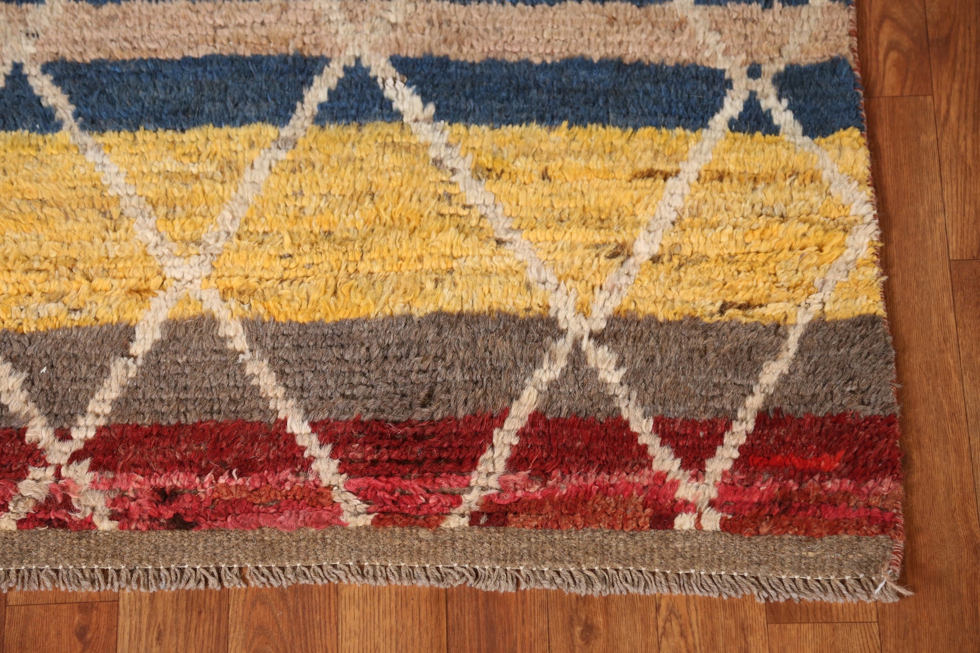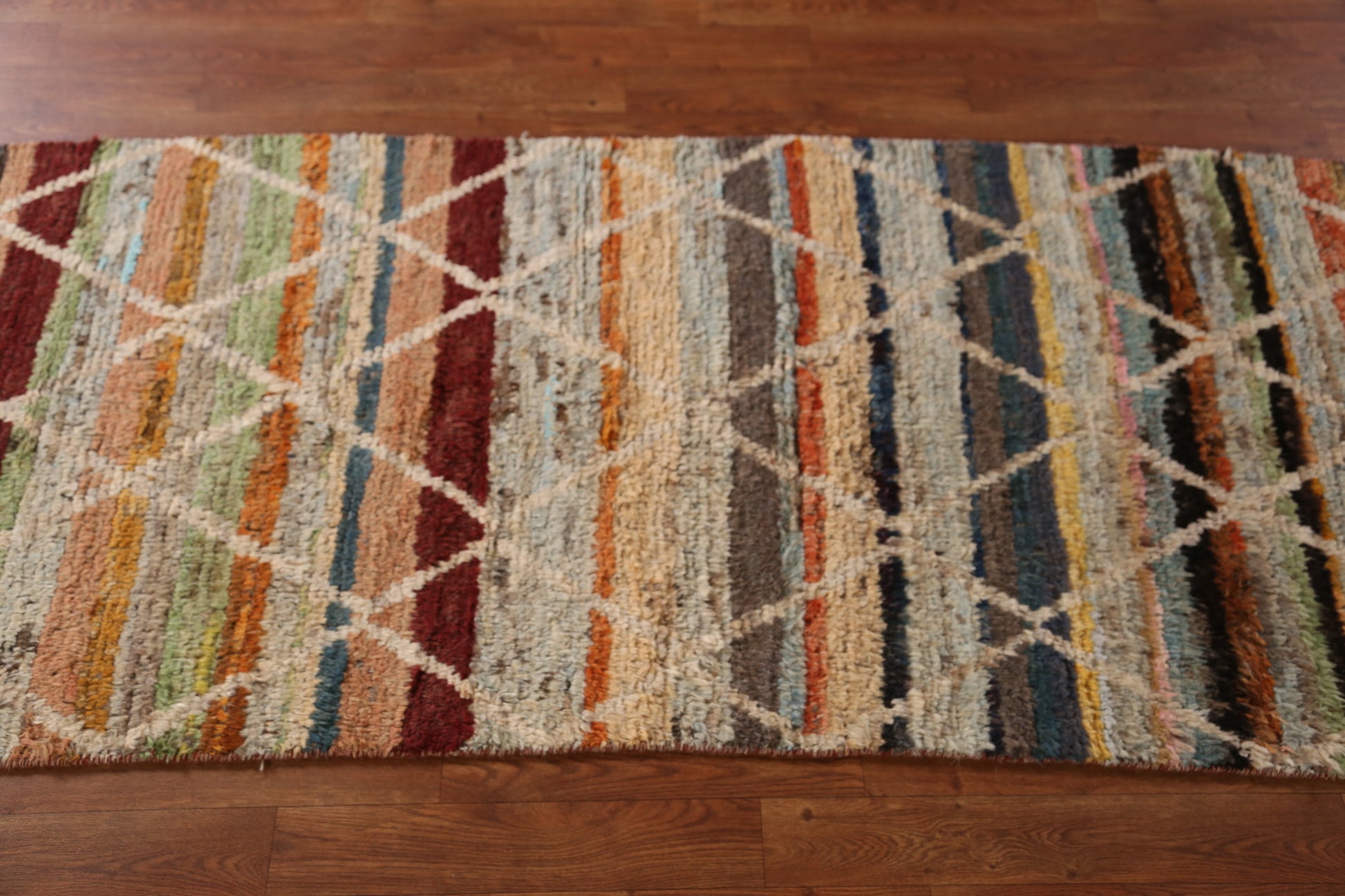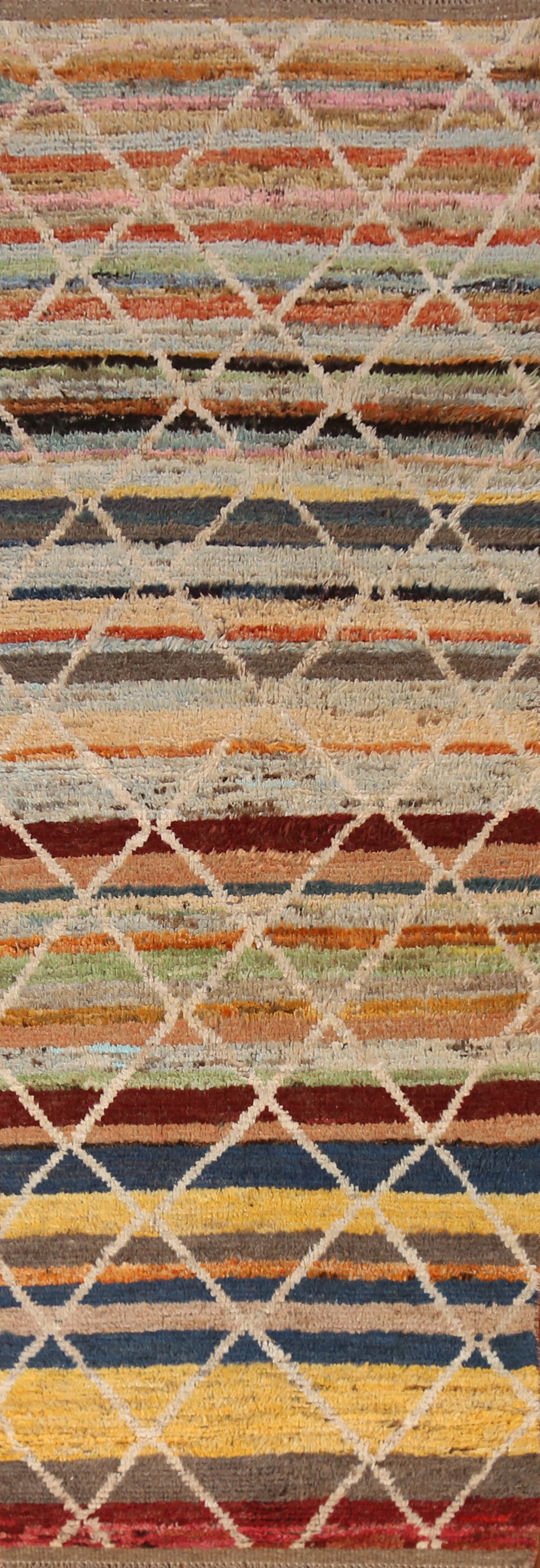 A Beautiful Genuine Pakistan Moroccan rug is Hand Knotted by skillful weavers in Pakistan with 100% Wool Material. This rug is in New, First Quality condition. dimensions are 10' 0'' X 2' 8'' in foot and 305 X 81 in centimeter. the primary color is Multi-Colored.