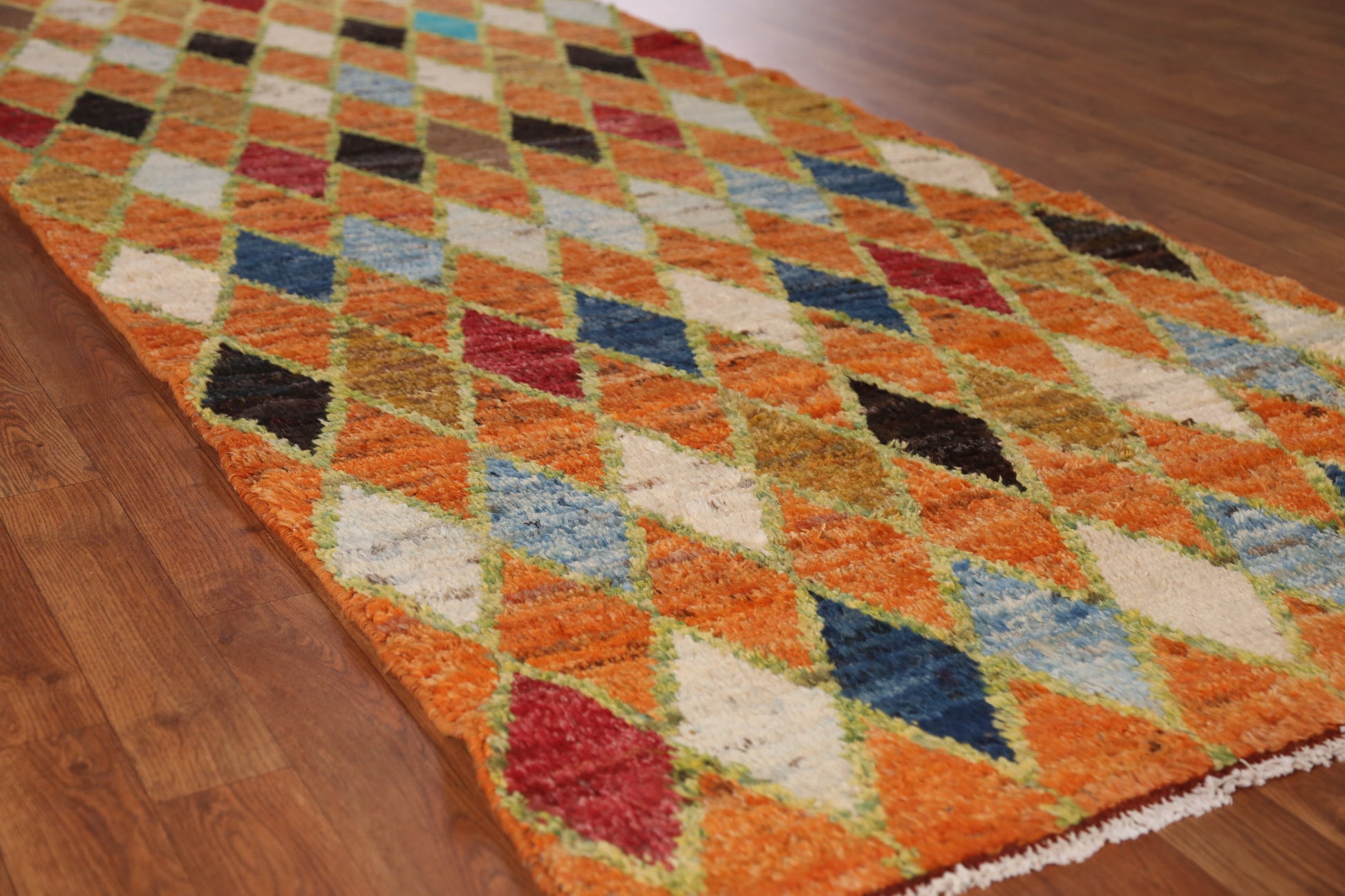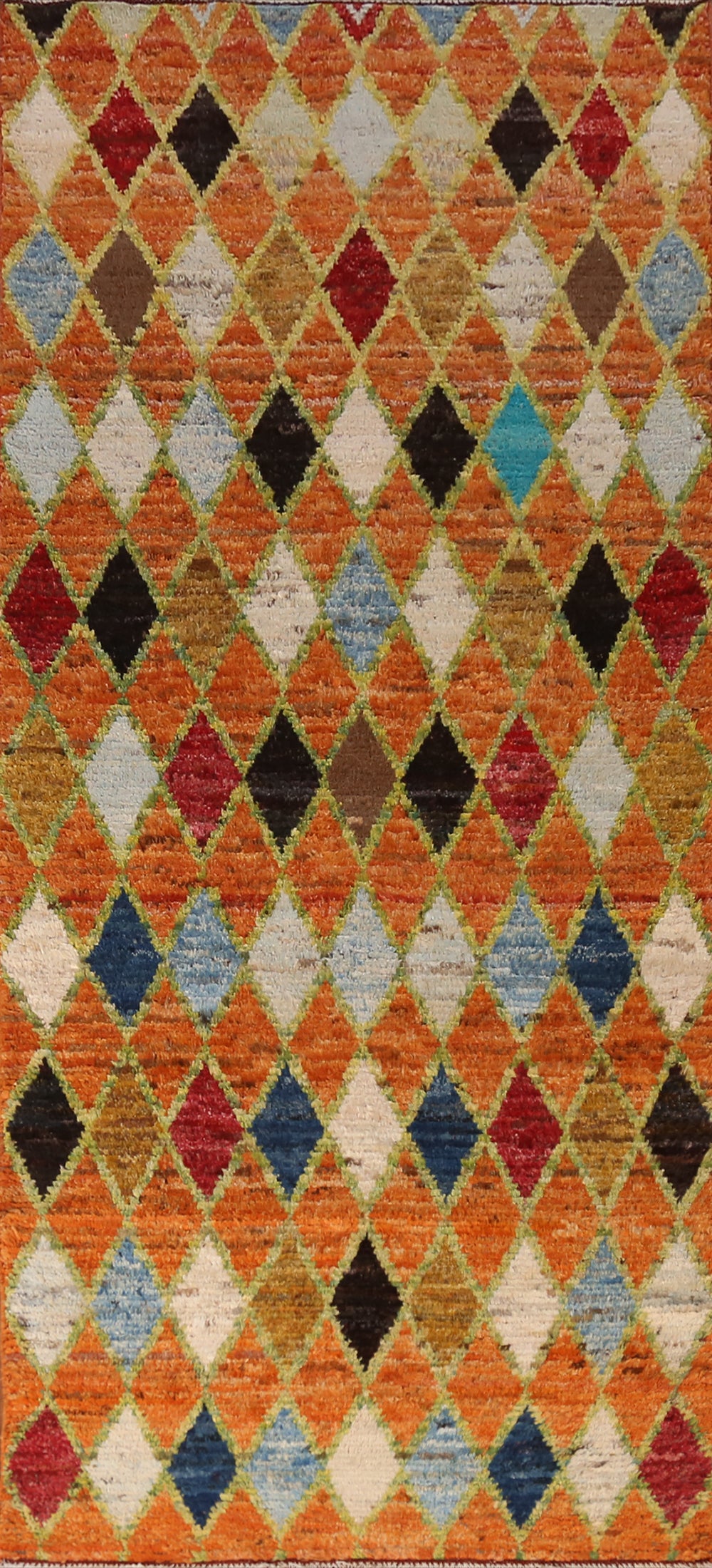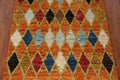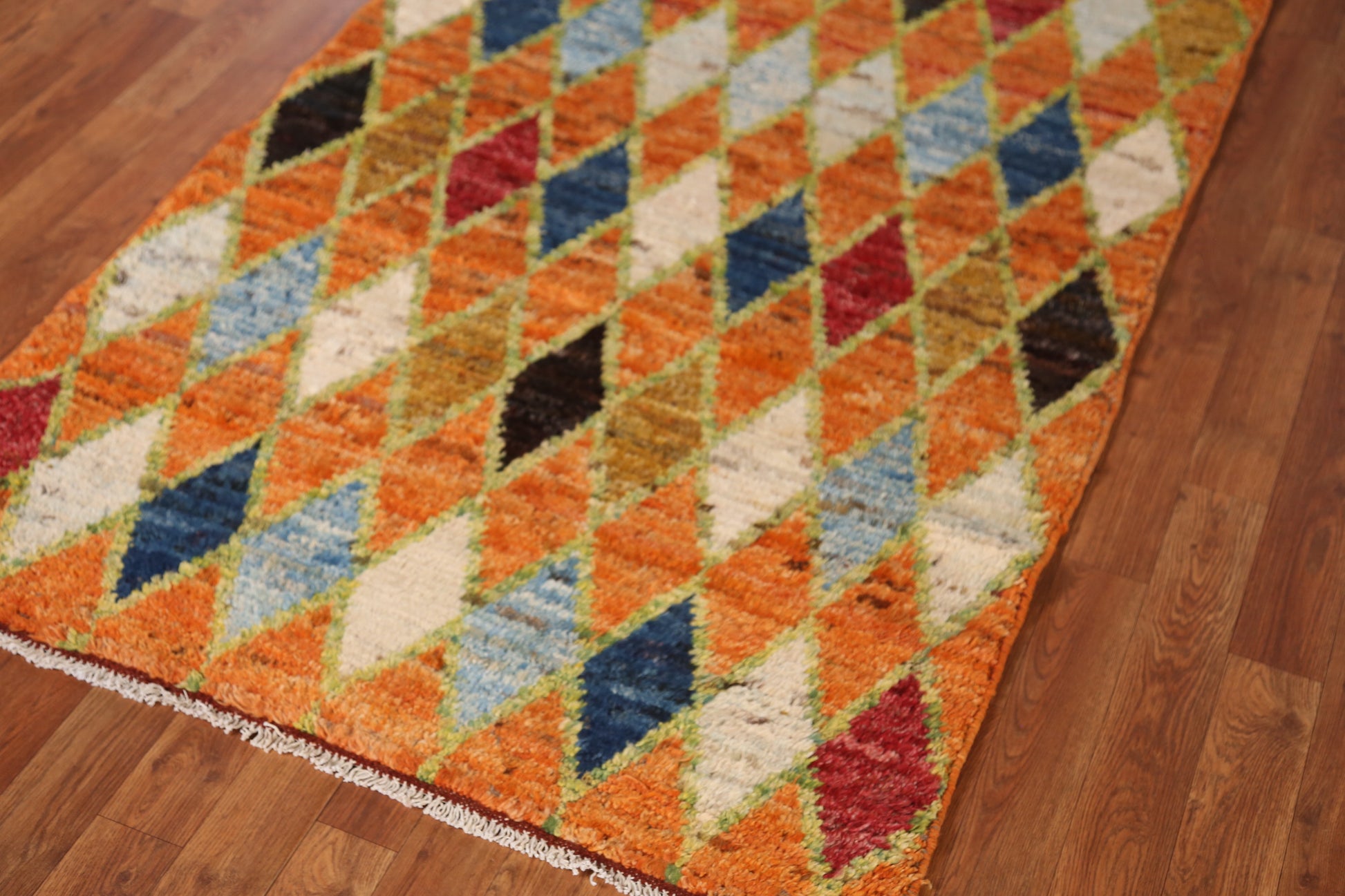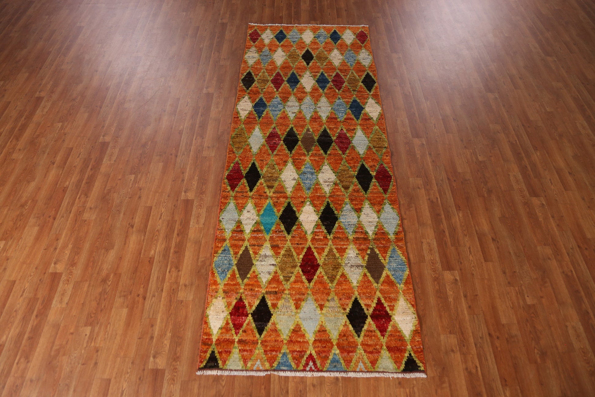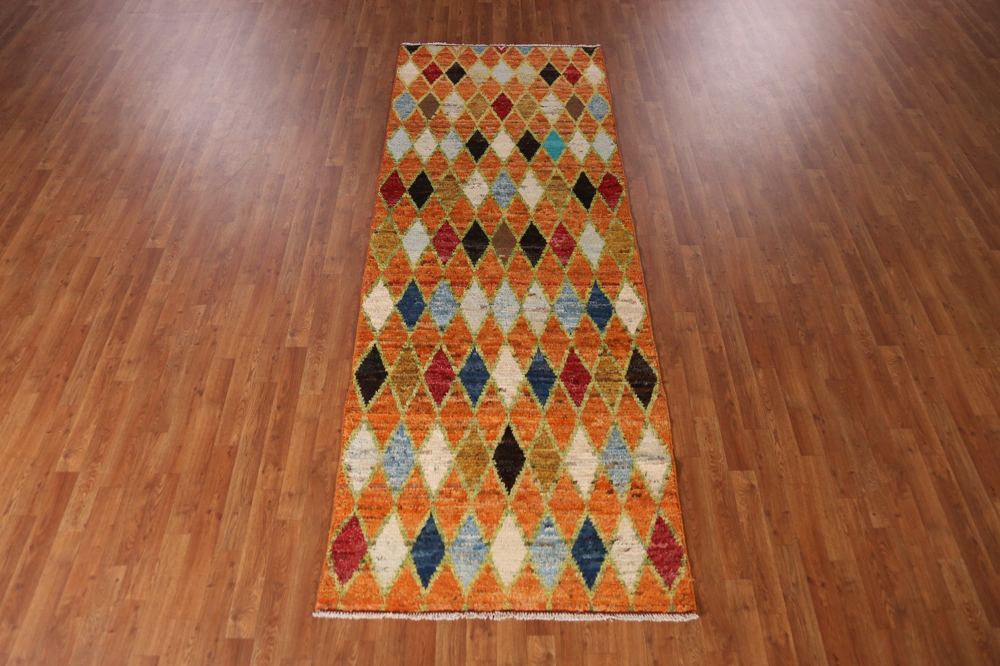 A Beautiful Genuine Pakistan Moroccan rug is Hand Knotted by skillful weavers in Pakistan with 100% Wool Material. This rug is in New, First Quality condition. dimensions are 9' 7'' X 3' 7'' in foot and 292 X 109 in centimeter. the primary color is Oranges & Rust.