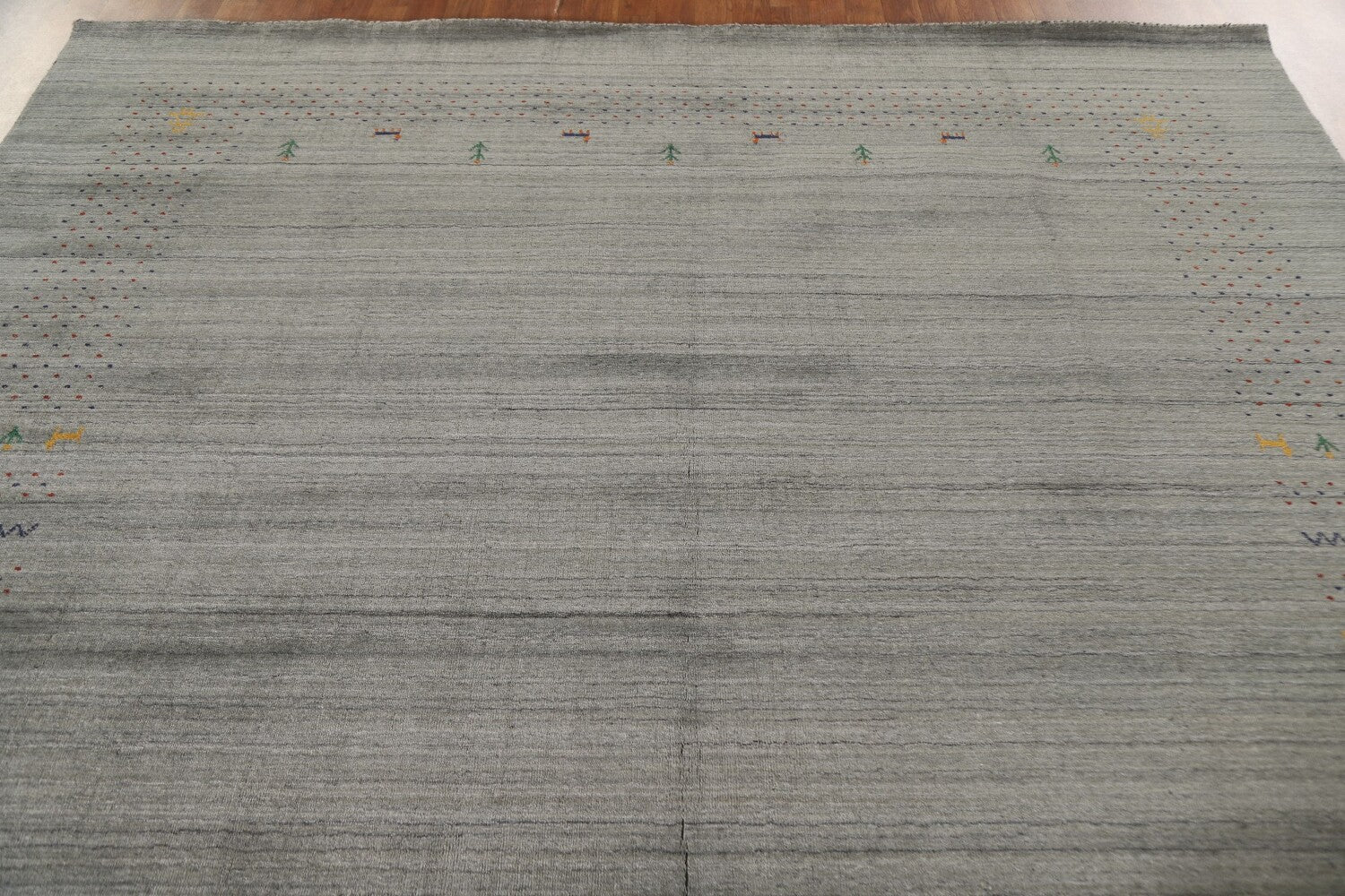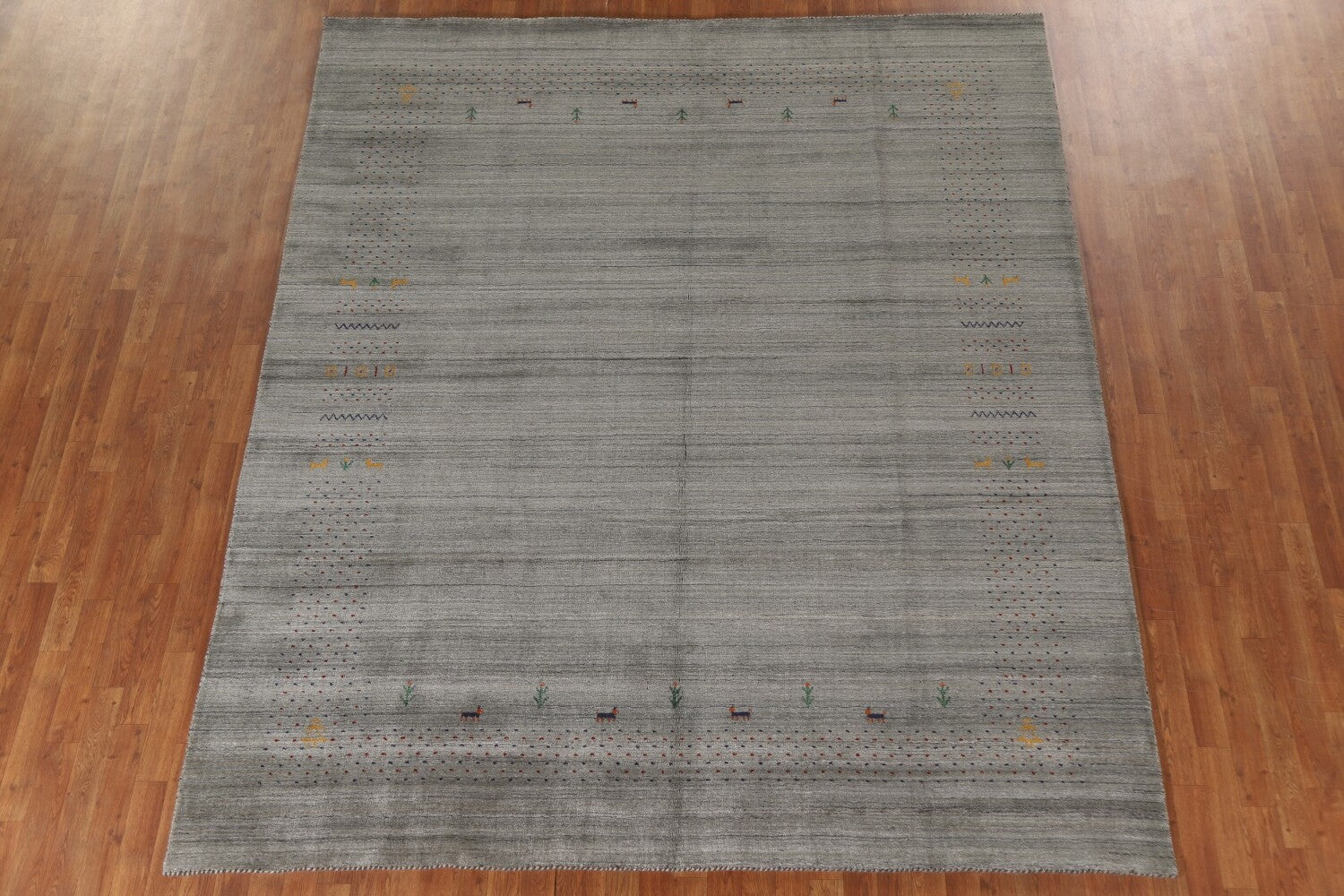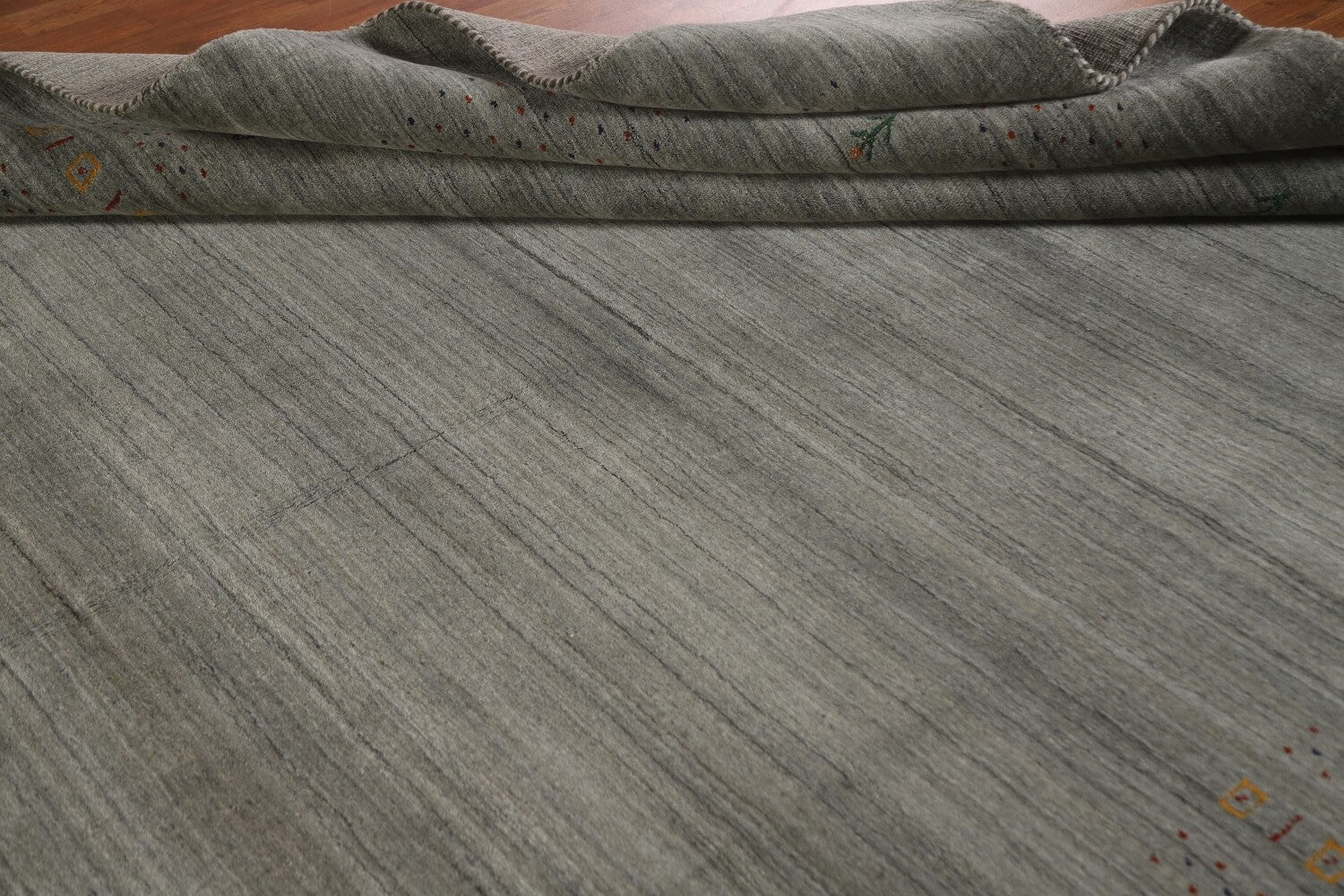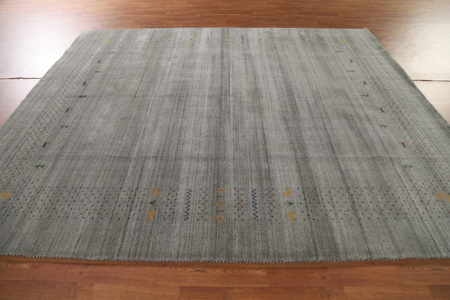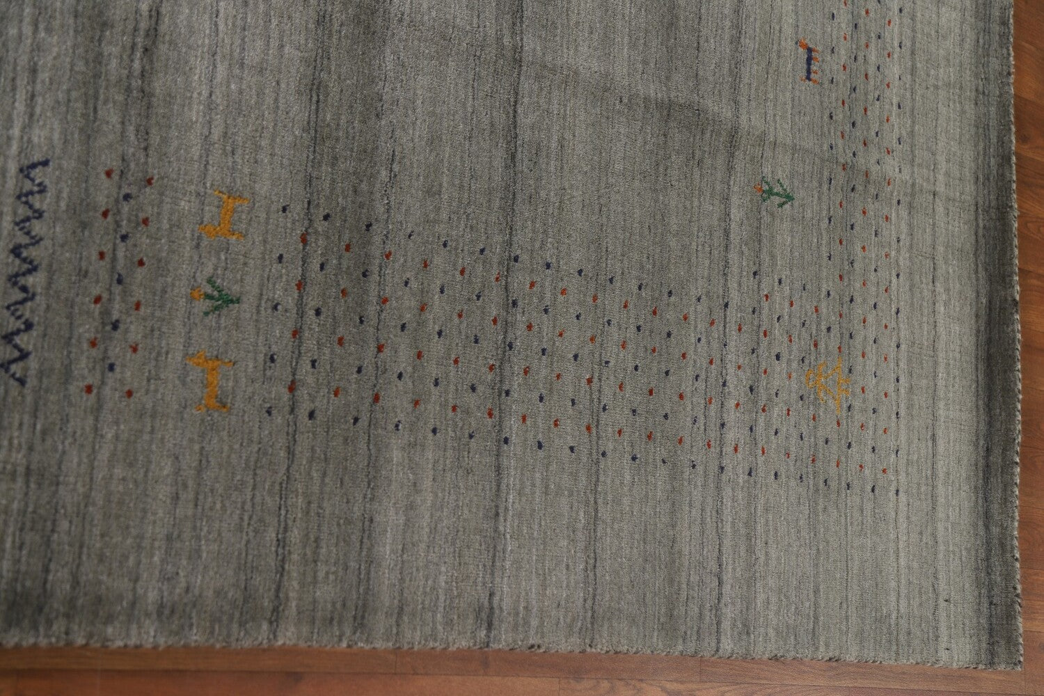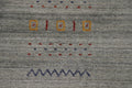 A Beautiful Genuine India Gabbeh rug is Hand Knotted by skillful weavers in India with 100% Wool Material. This rug is in condition. dimensions are 9' 9'' X 8' 3'' in foot and 297 X 251 in centimeter. the primary color is Greys & Charcoal.