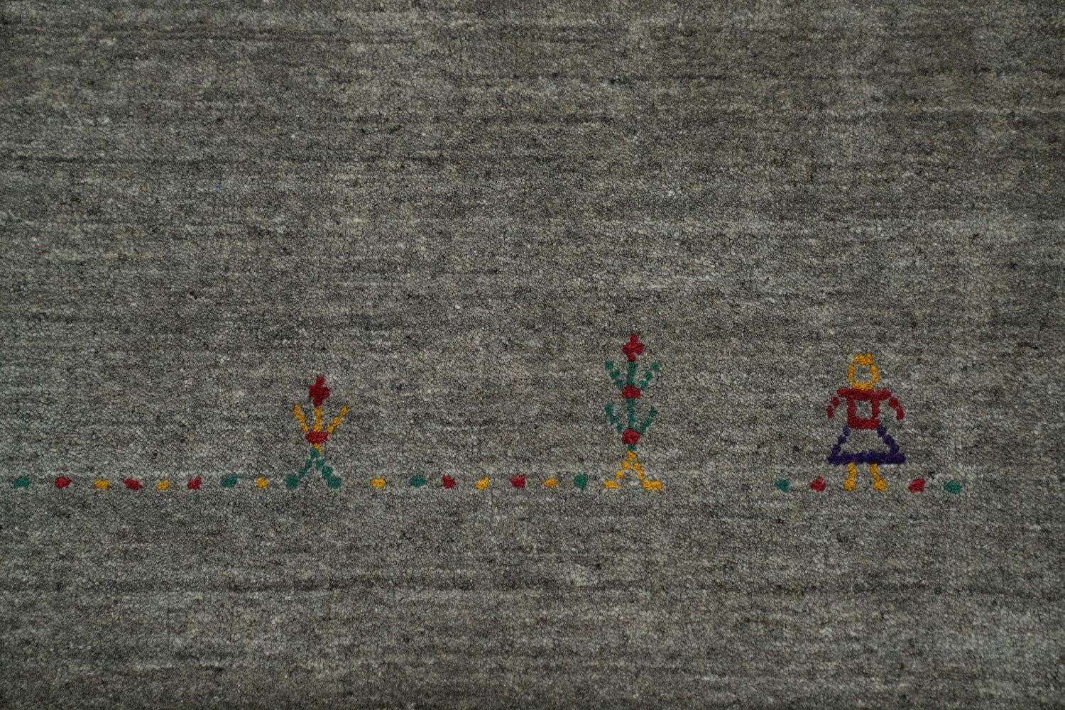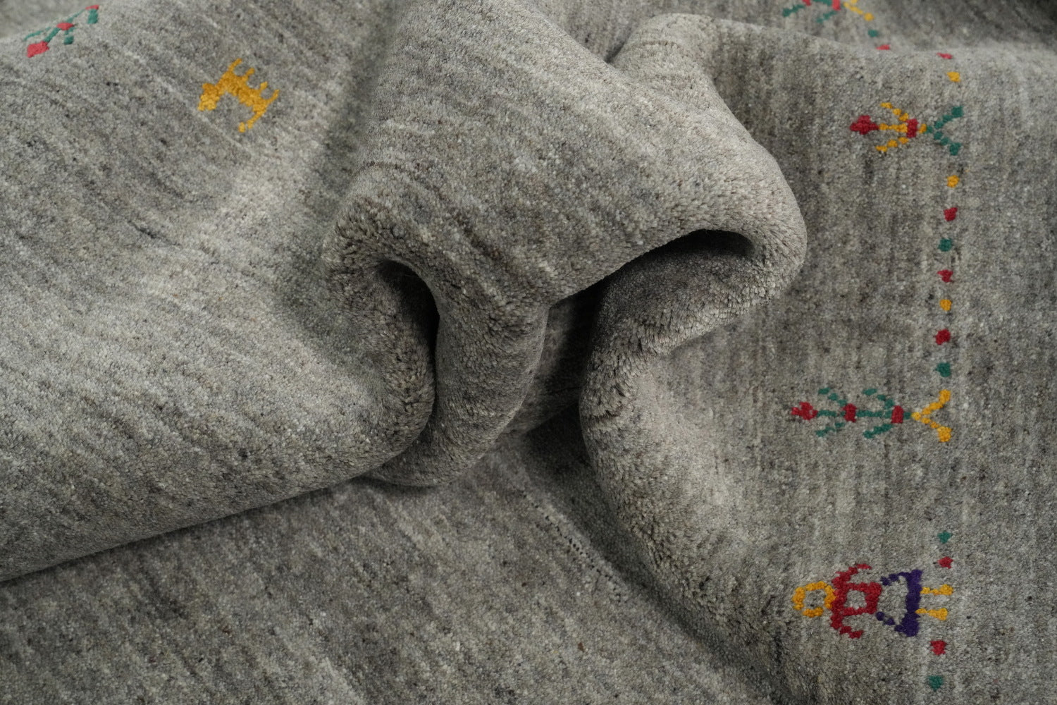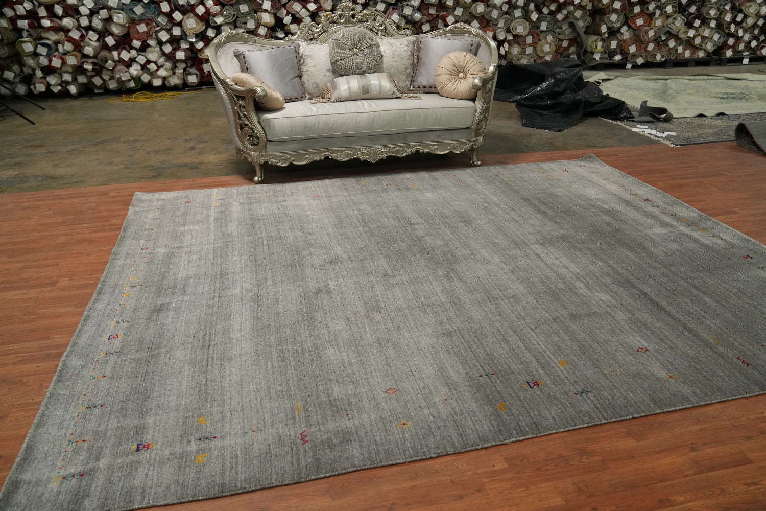 A Beautiful Genuine India Gabbeh rug is Hand Knotted by skillful weavers in India with 100% Wool Material. This rug is in New, First Quality condition. dimensions are 11' 6'' X 9' 1'' in foot and 351 X 277 in centimeter. the primary color is Greys & Charcoal.