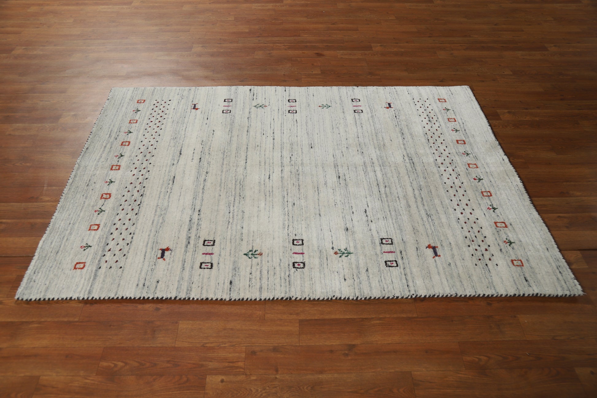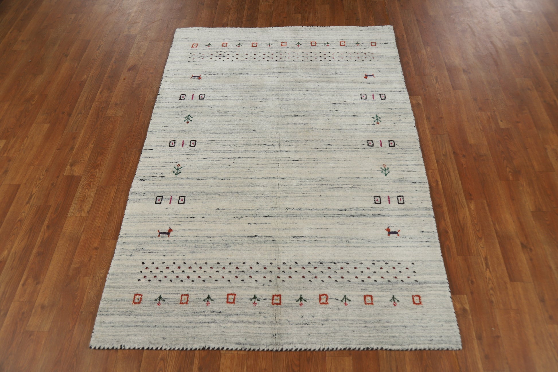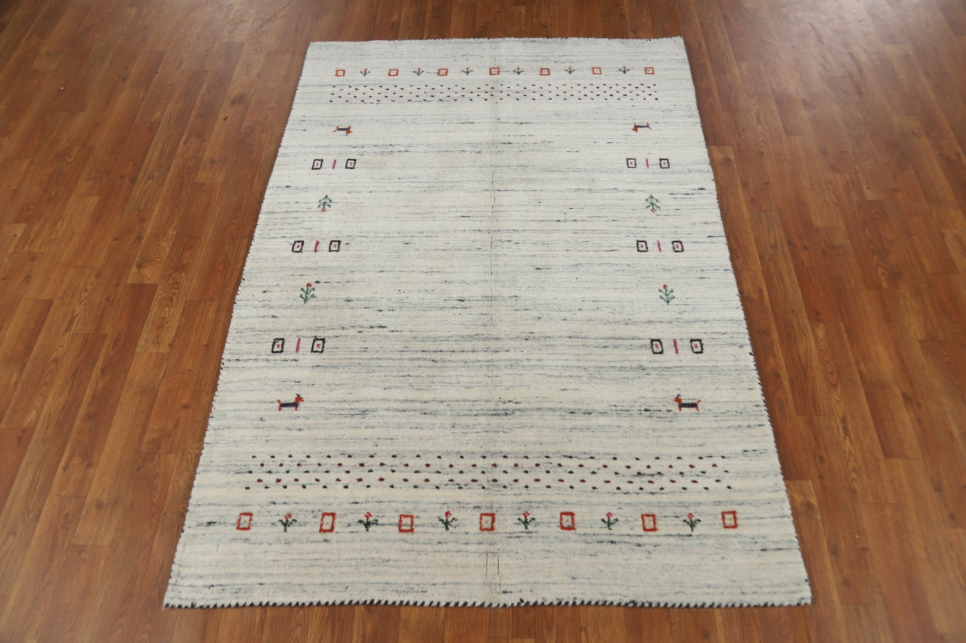A Beautiful Genuine India Gabbeh rug is Hand Knotted by skillful weavers in India with 100% Wool Material. This rug is in New, First Quality condition. dimensions are 5' 9'' X 4' 0'' in foot and 175 X 122 in centimeter. the primary color is Beige & Ivories.