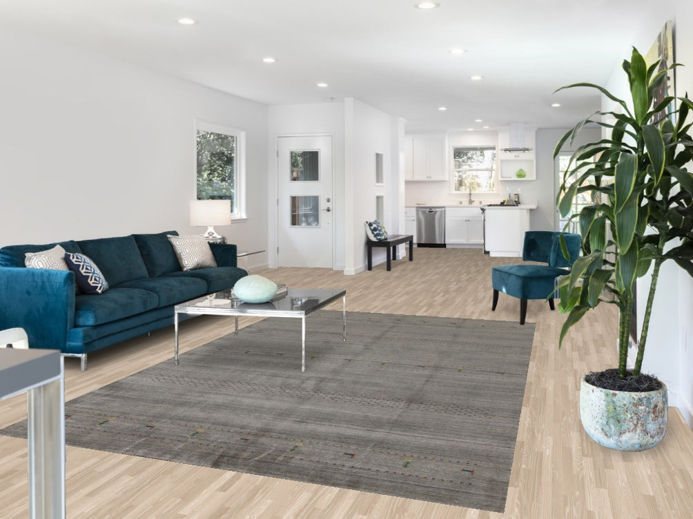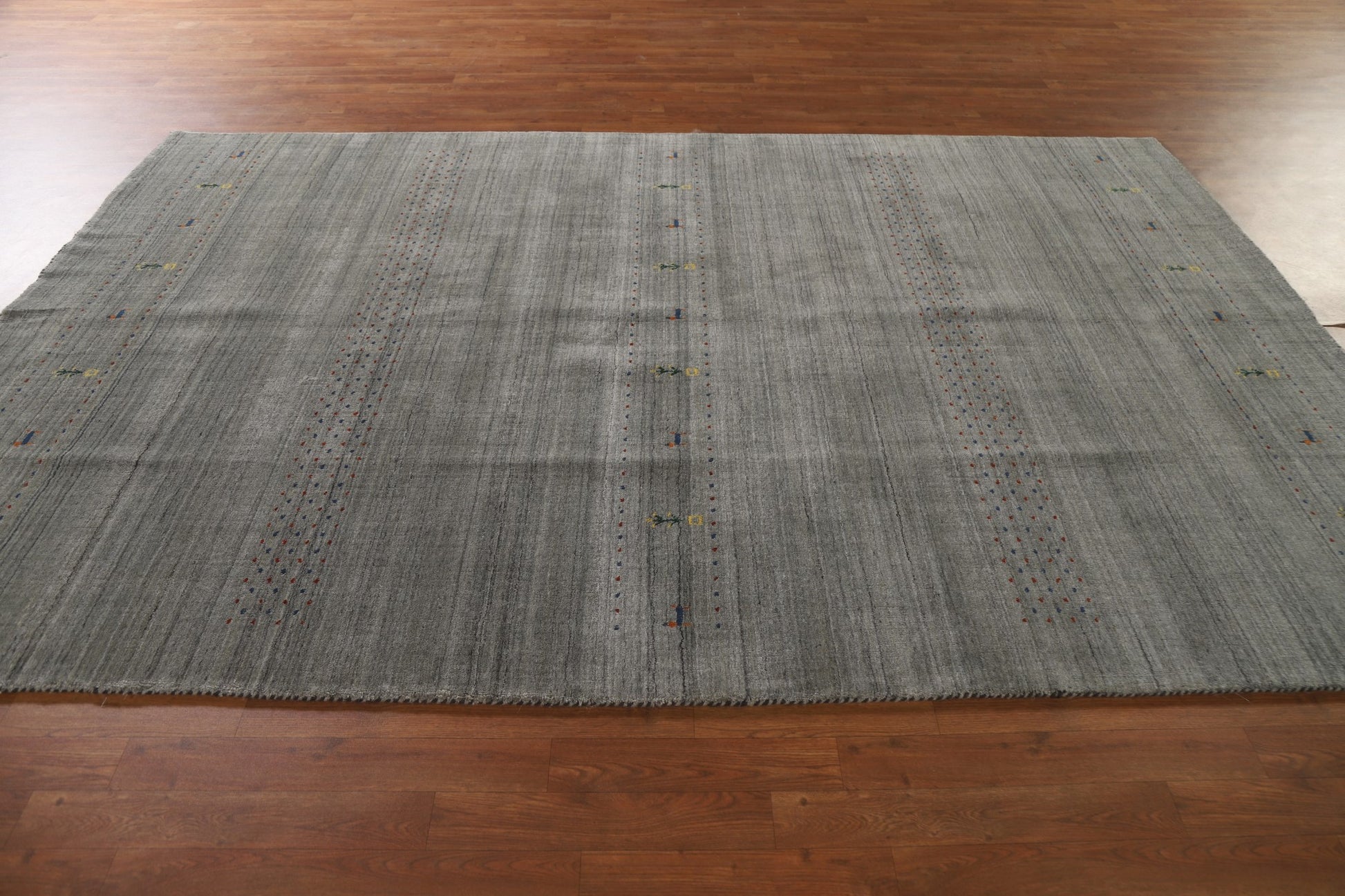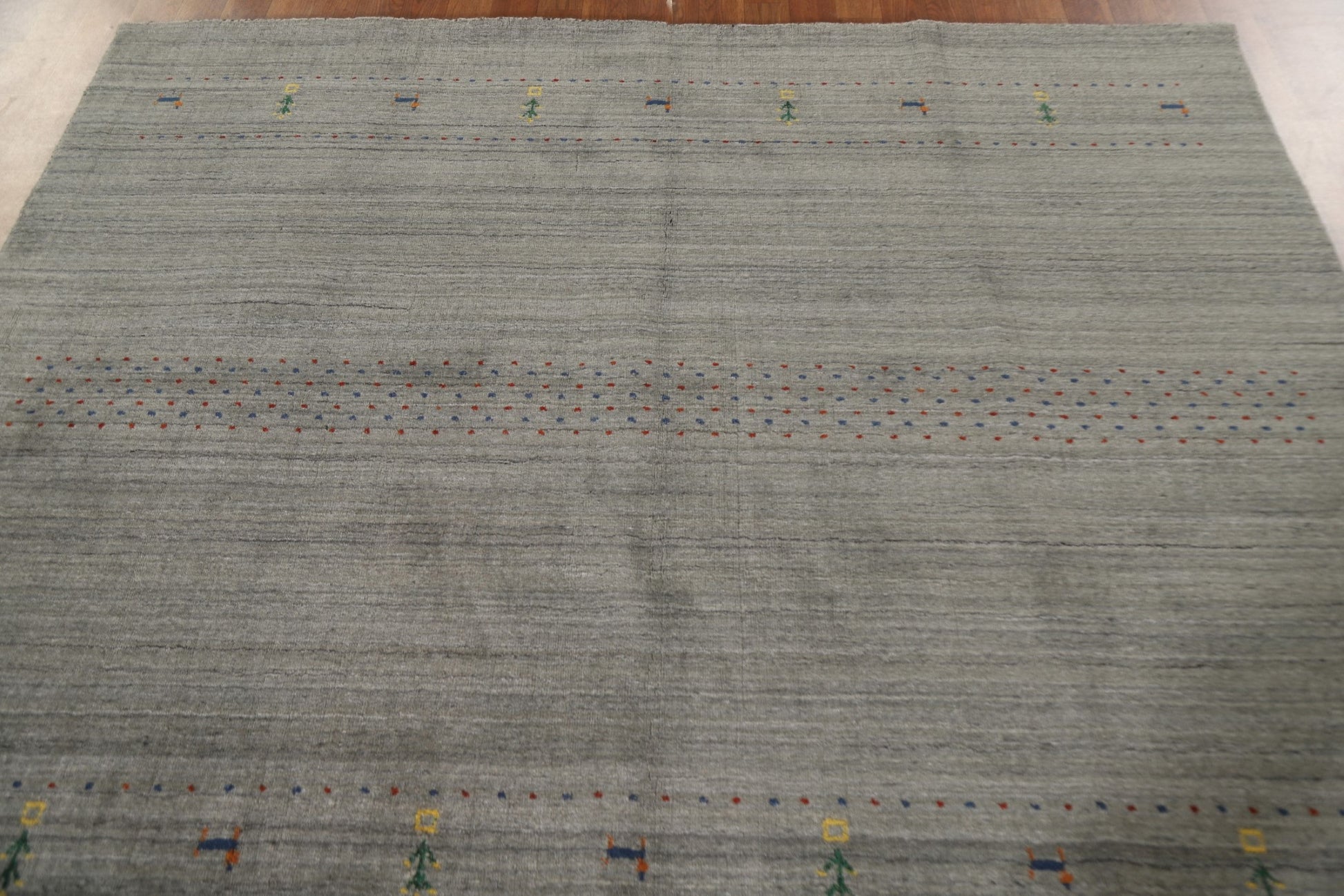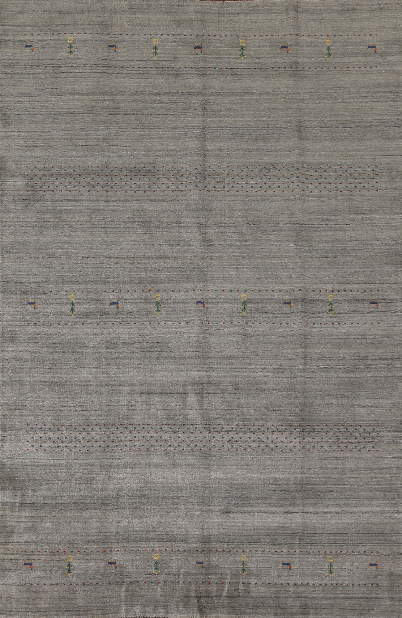 A Beautiful Genuine India Gabbeh rug is Hand Knotted by skillful weavers in India with 100% Wool Material. This rug is in New, First Quality condition. dimensions are 9' 9'' X 6' 6'' in foot and 297 X 198 in centimeter. the primary color is Greys & Charcoal.