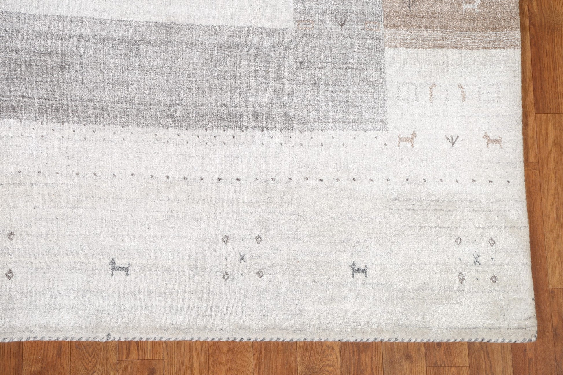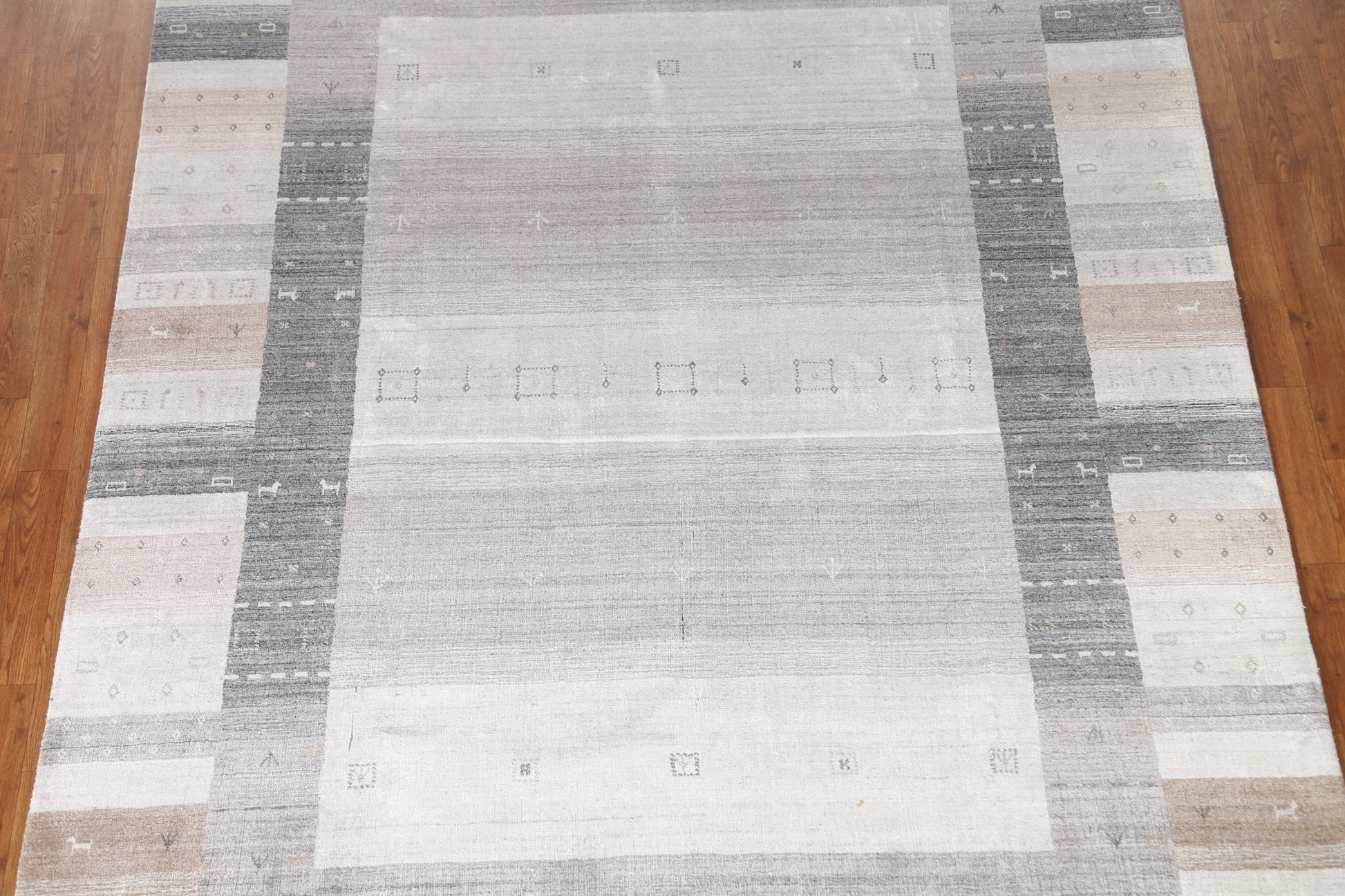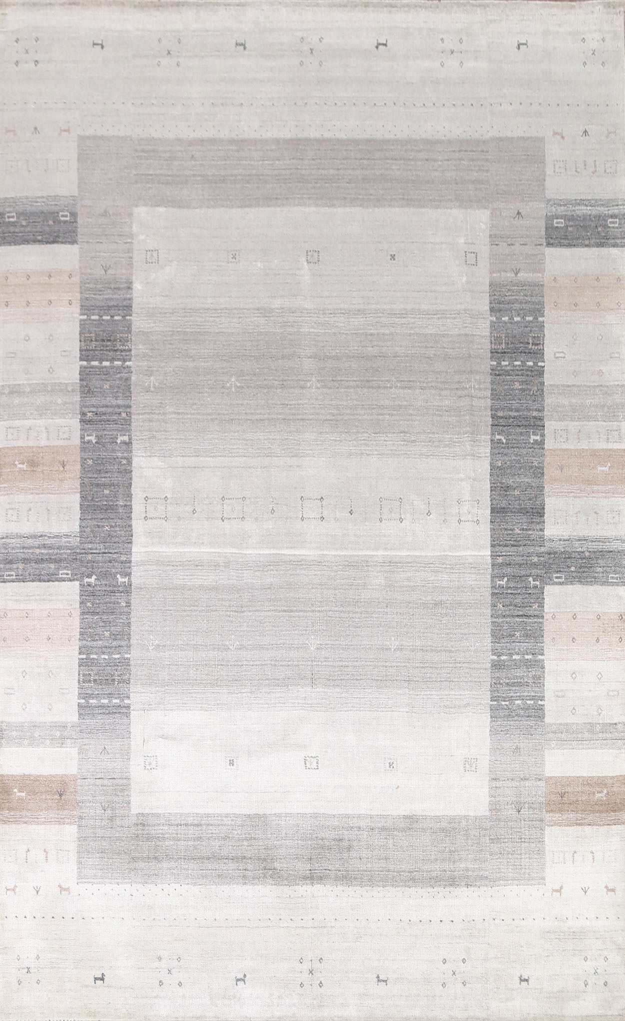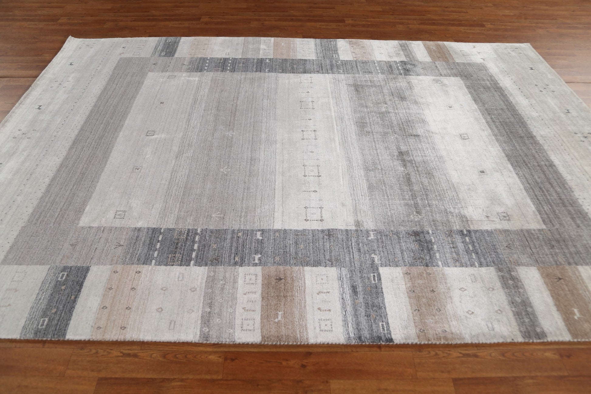 A Beautiful Genuine India Gabbeh rug is Hand Knotted by skillful weavers in India with 100% Wool Material. This rug is in New, First Quality condition. dimensions are 9' 10'' X 6' 8'' in foot and 300 X 203 in centimeter. the primary color is Greys & Charcoal.