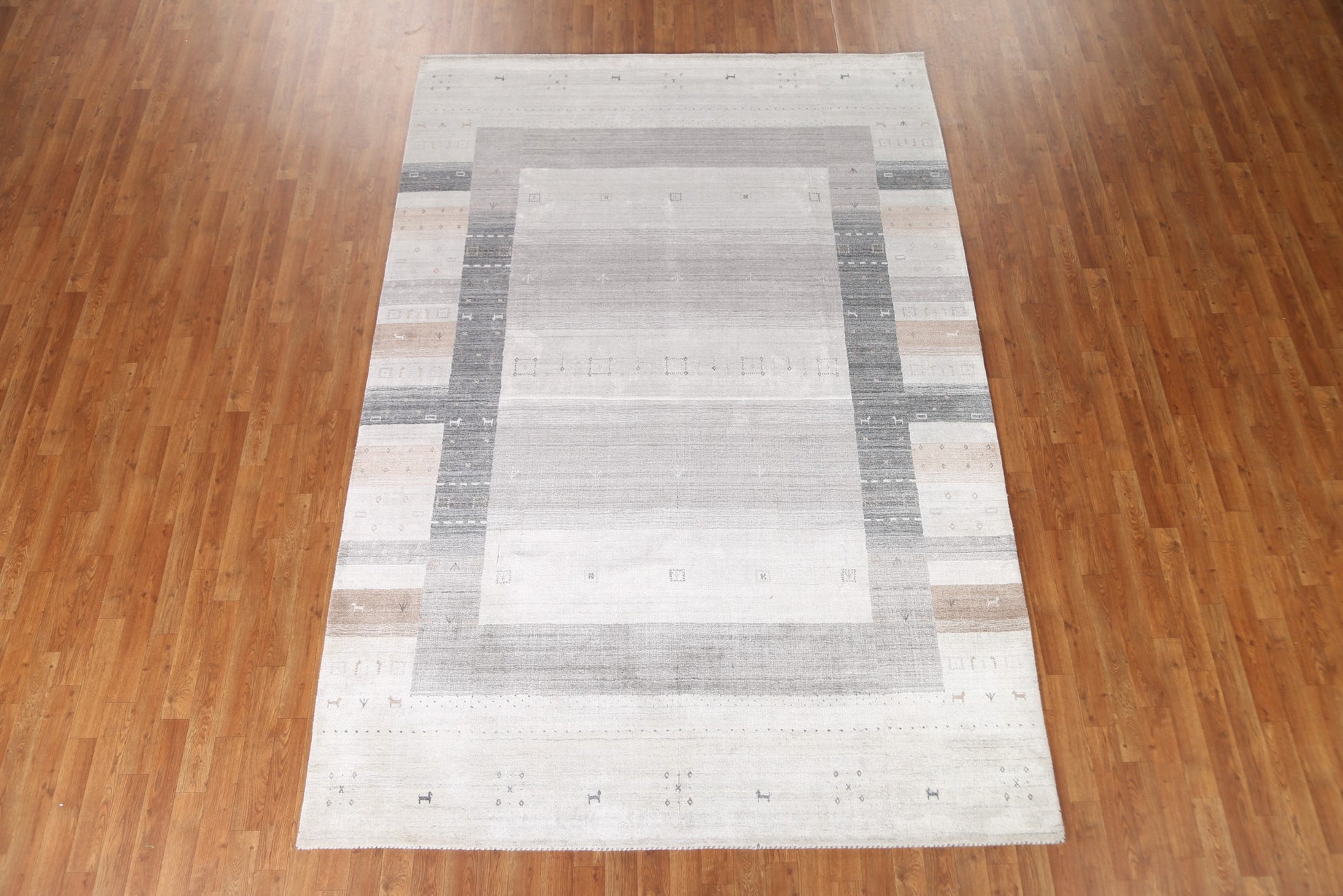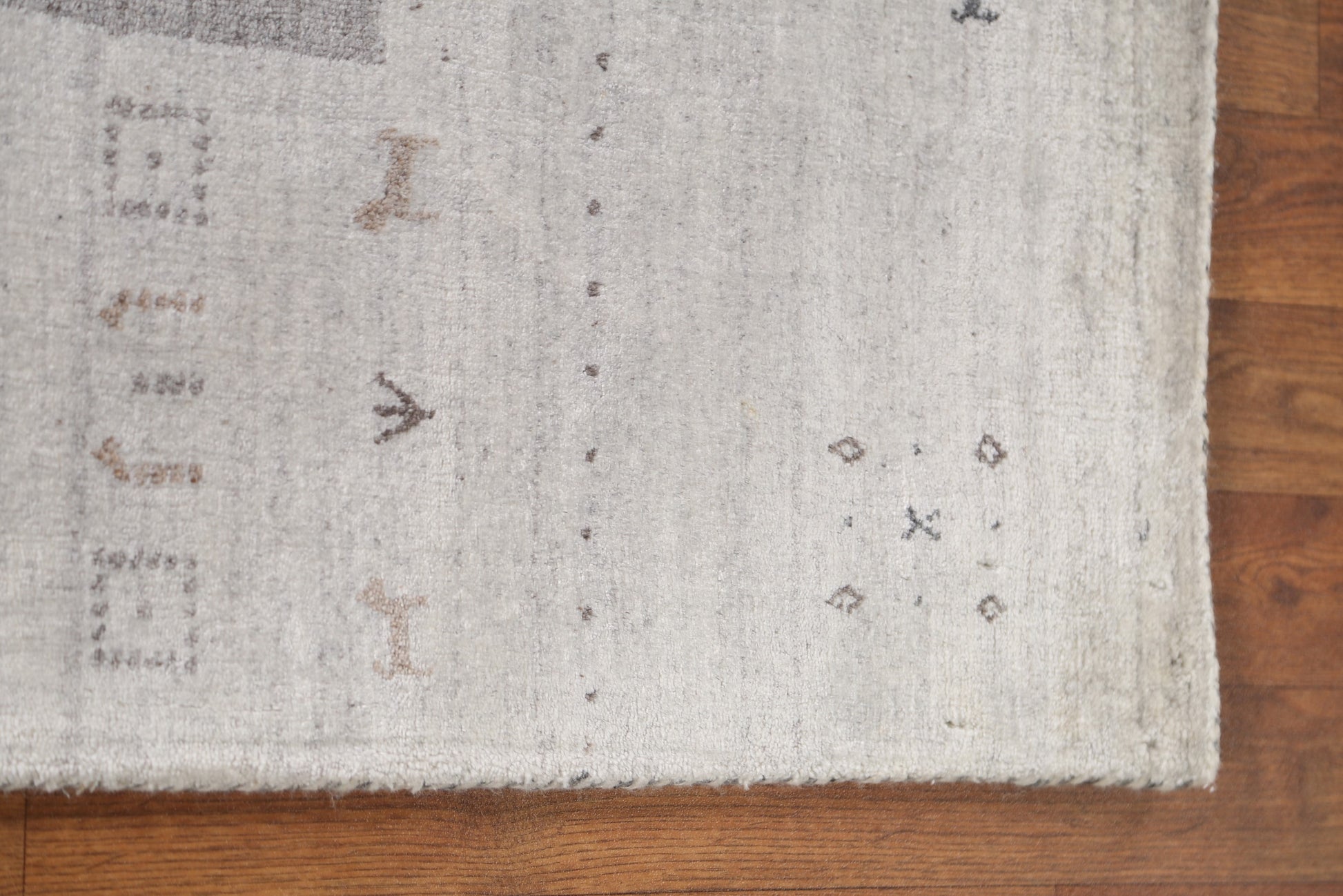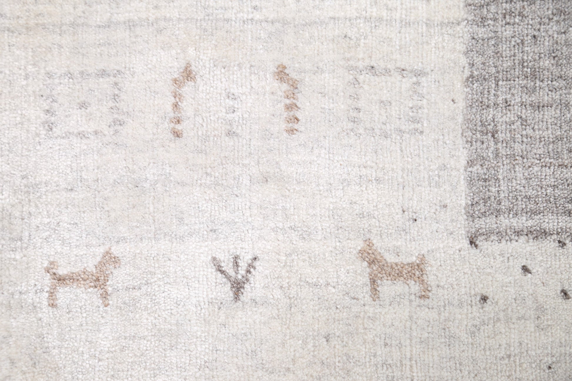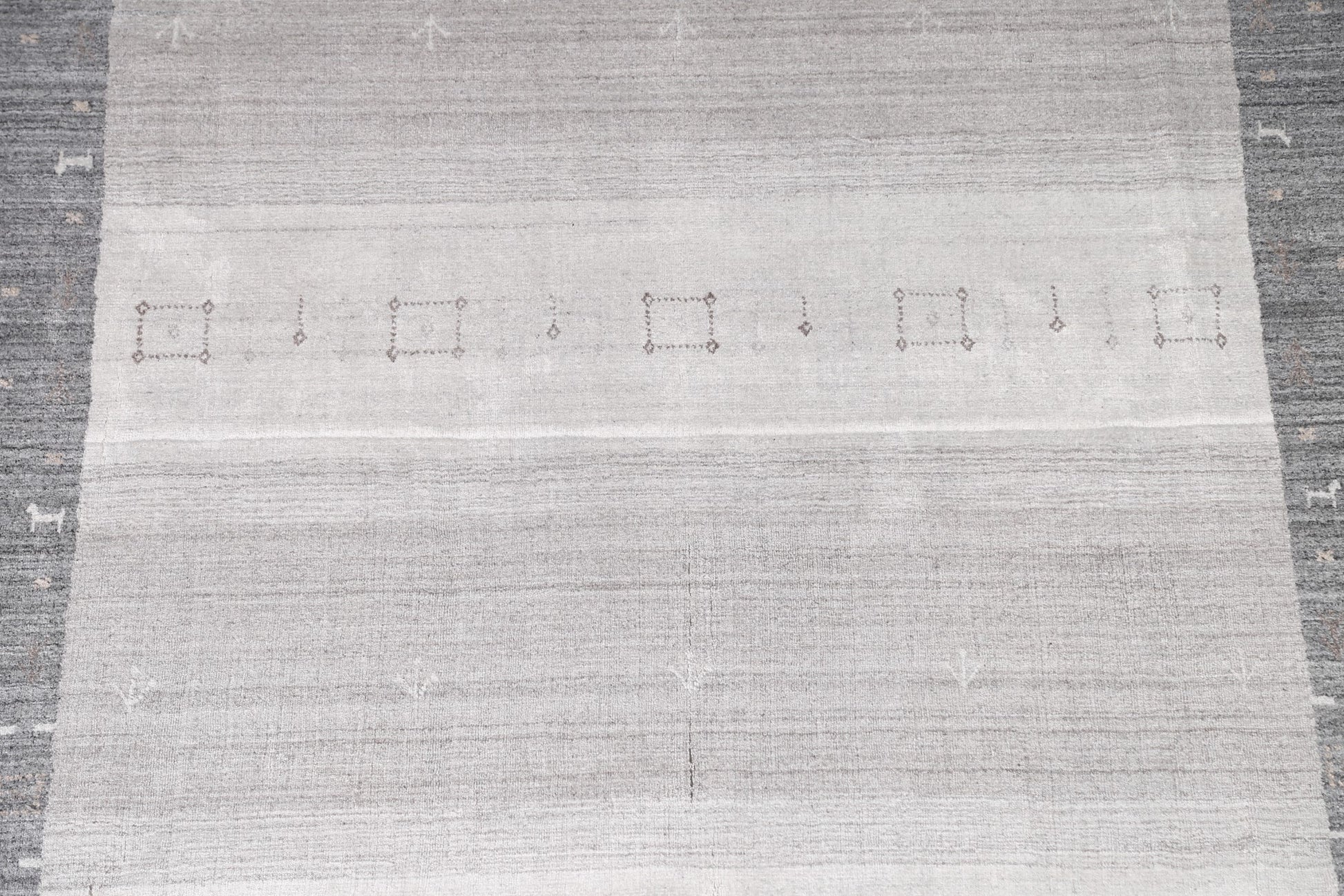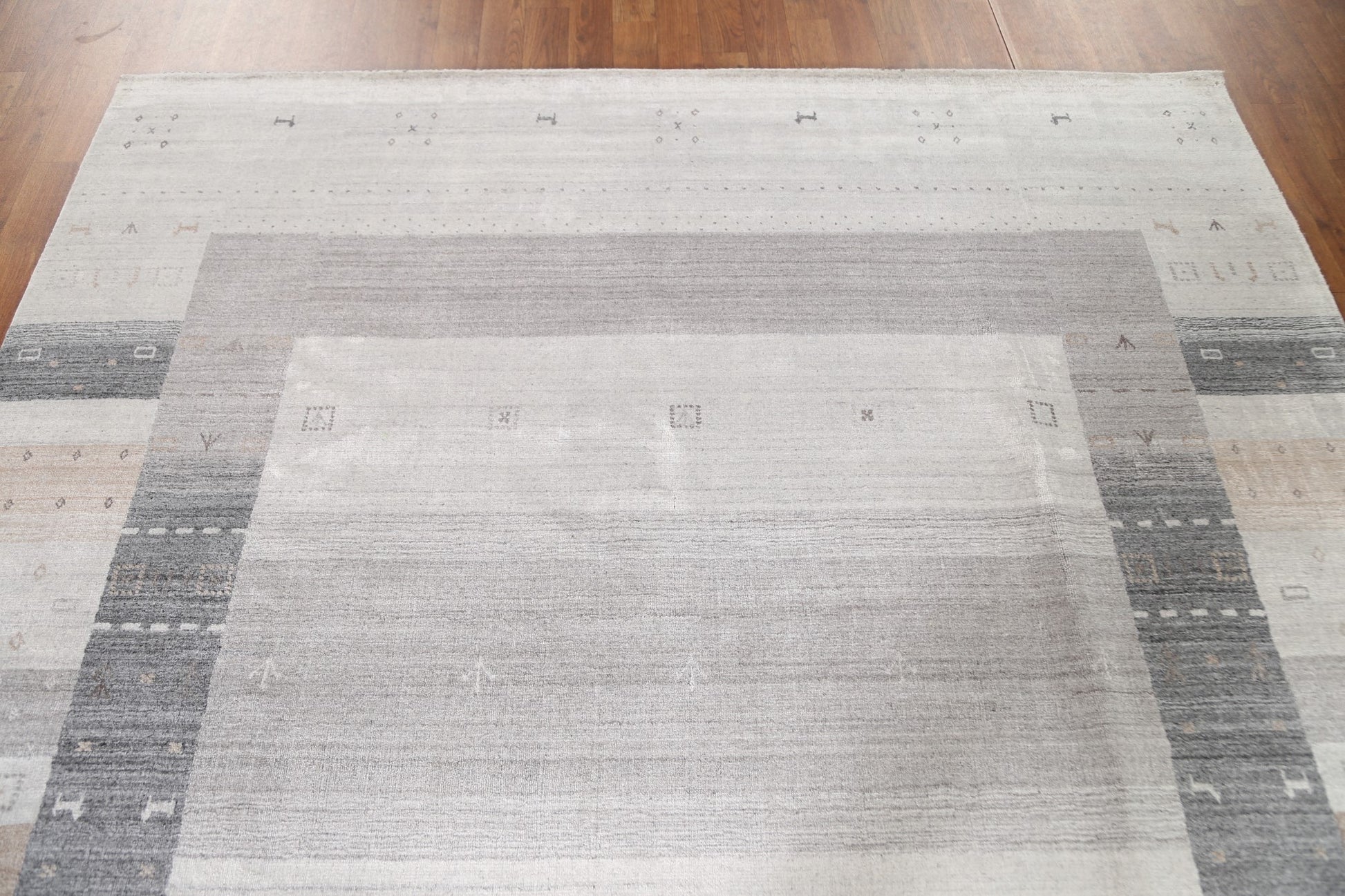 A Beautiful Genuine India Gabbeh rug is Hand Knotted by skillful weavers in India with 100% Wool Material. This rug is in New, First Quality condition. dimensions are 9' 10'' X 6' 8'' in foot and 300 X 203 in centimeter. the primary color is Greys & Charcoal.