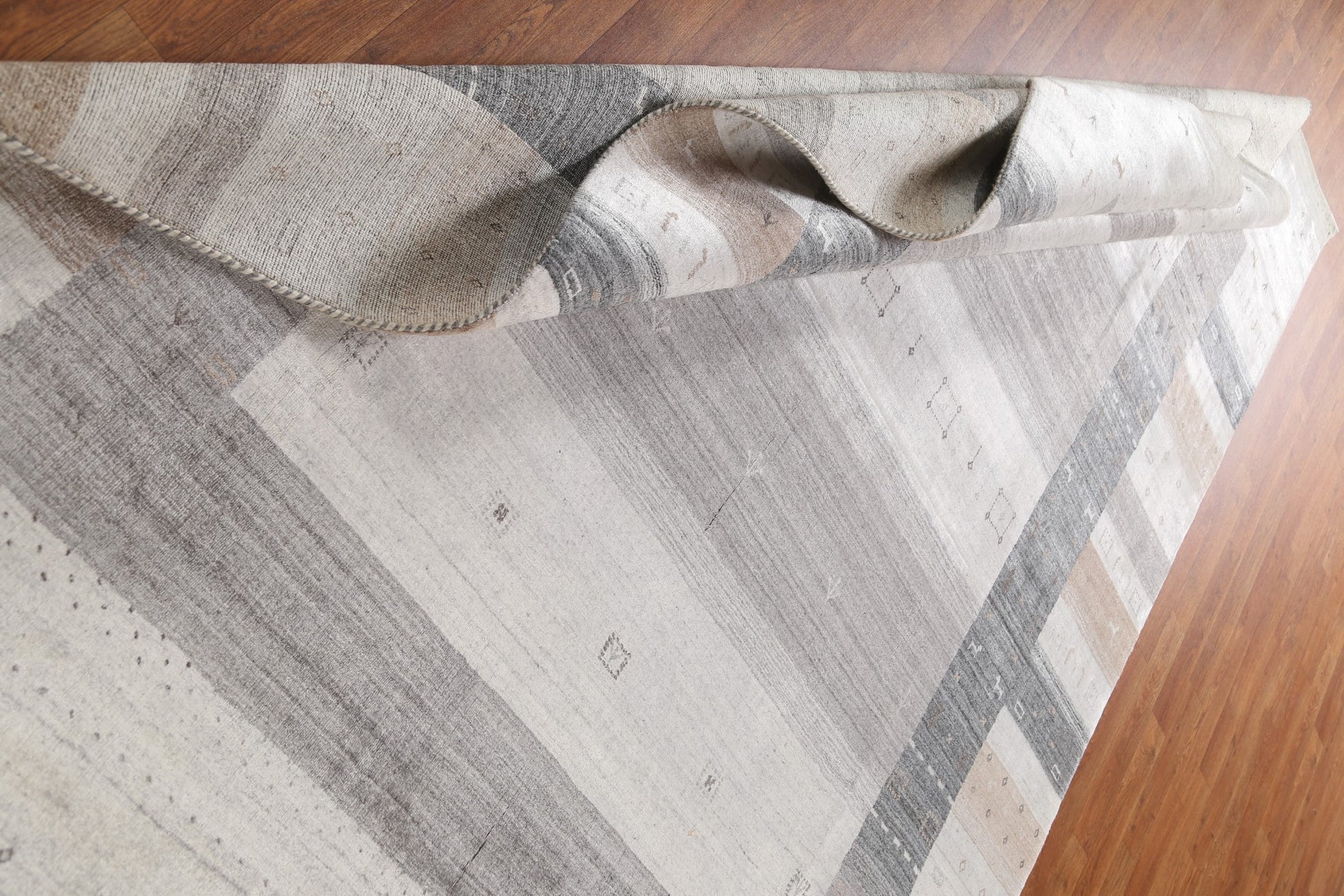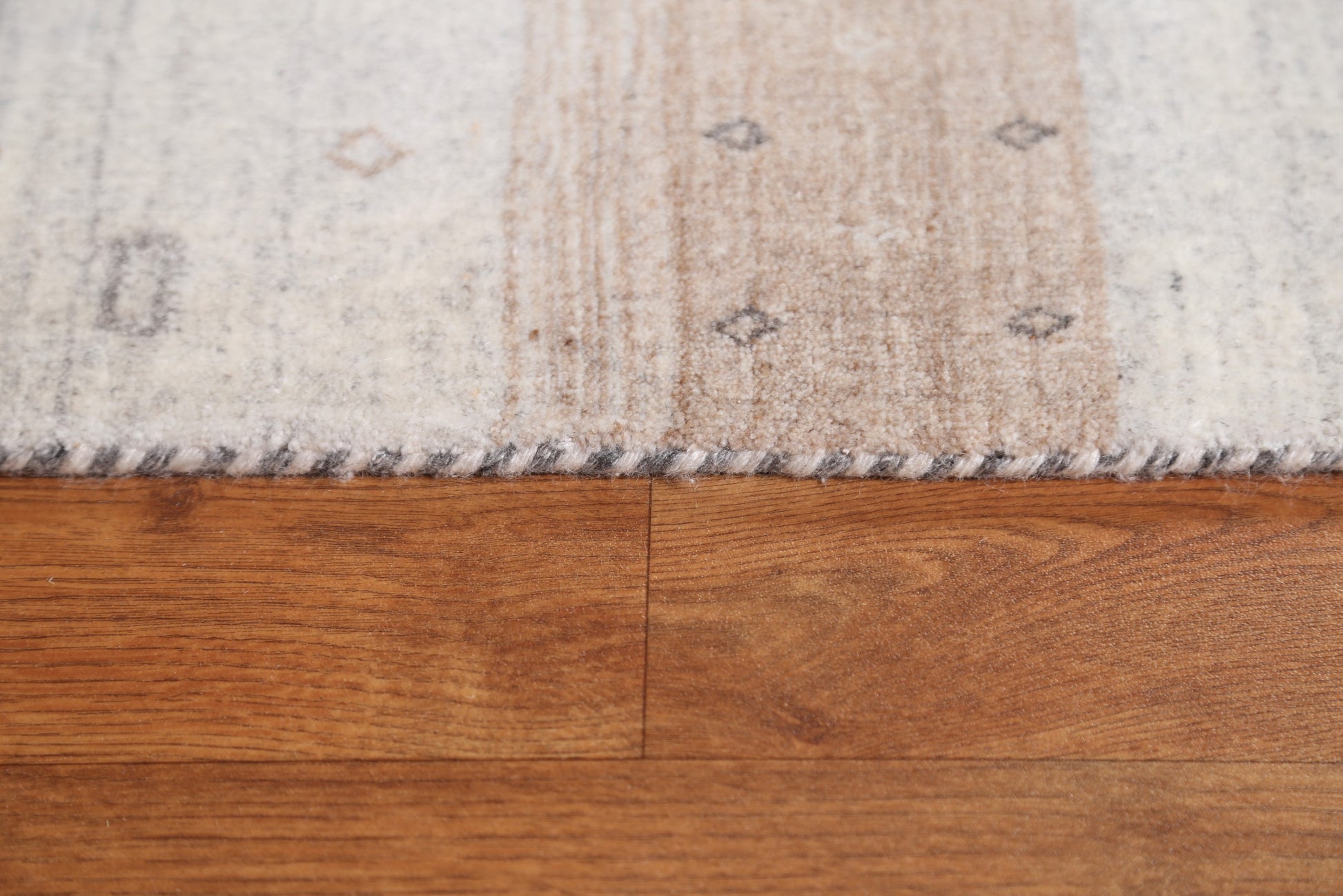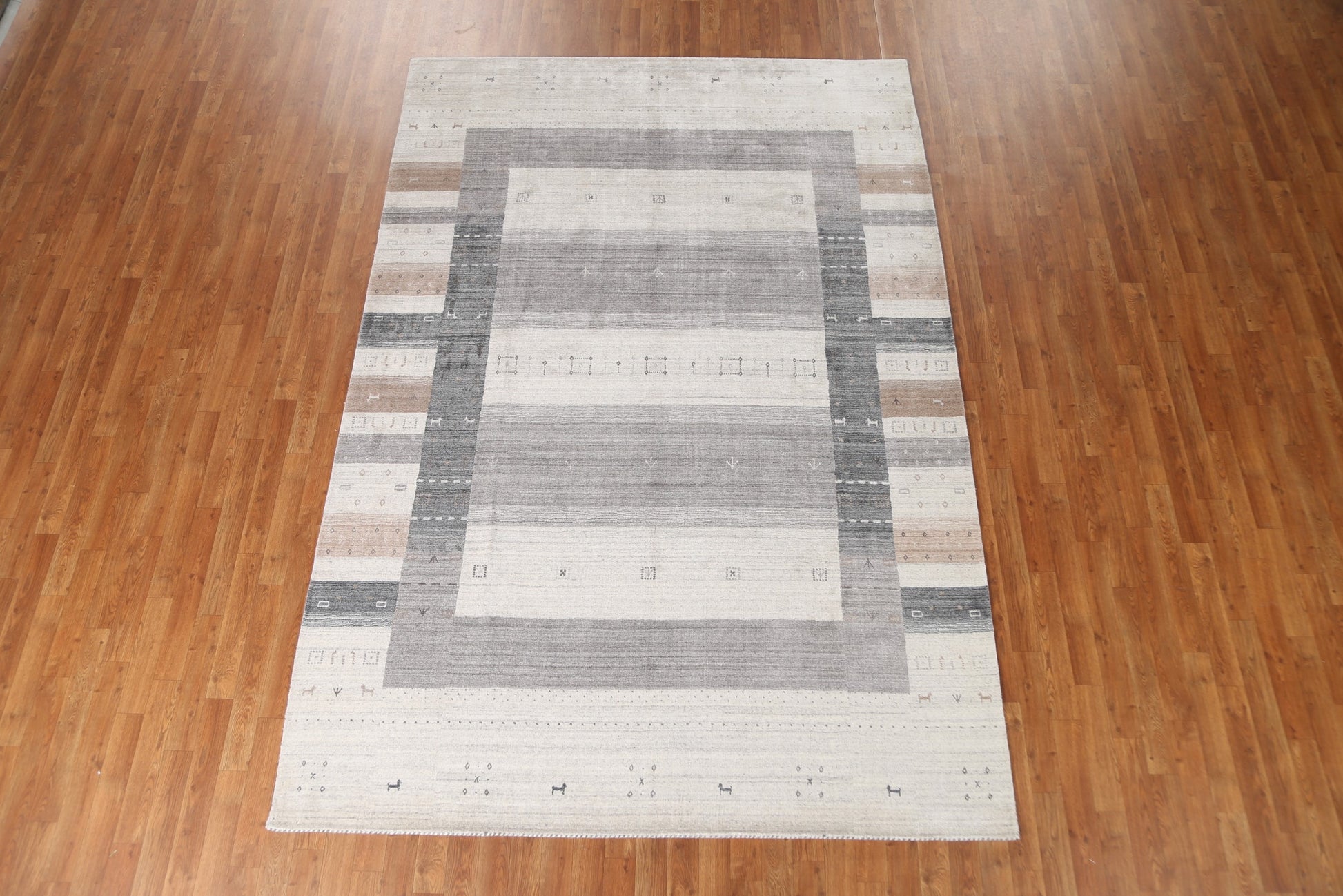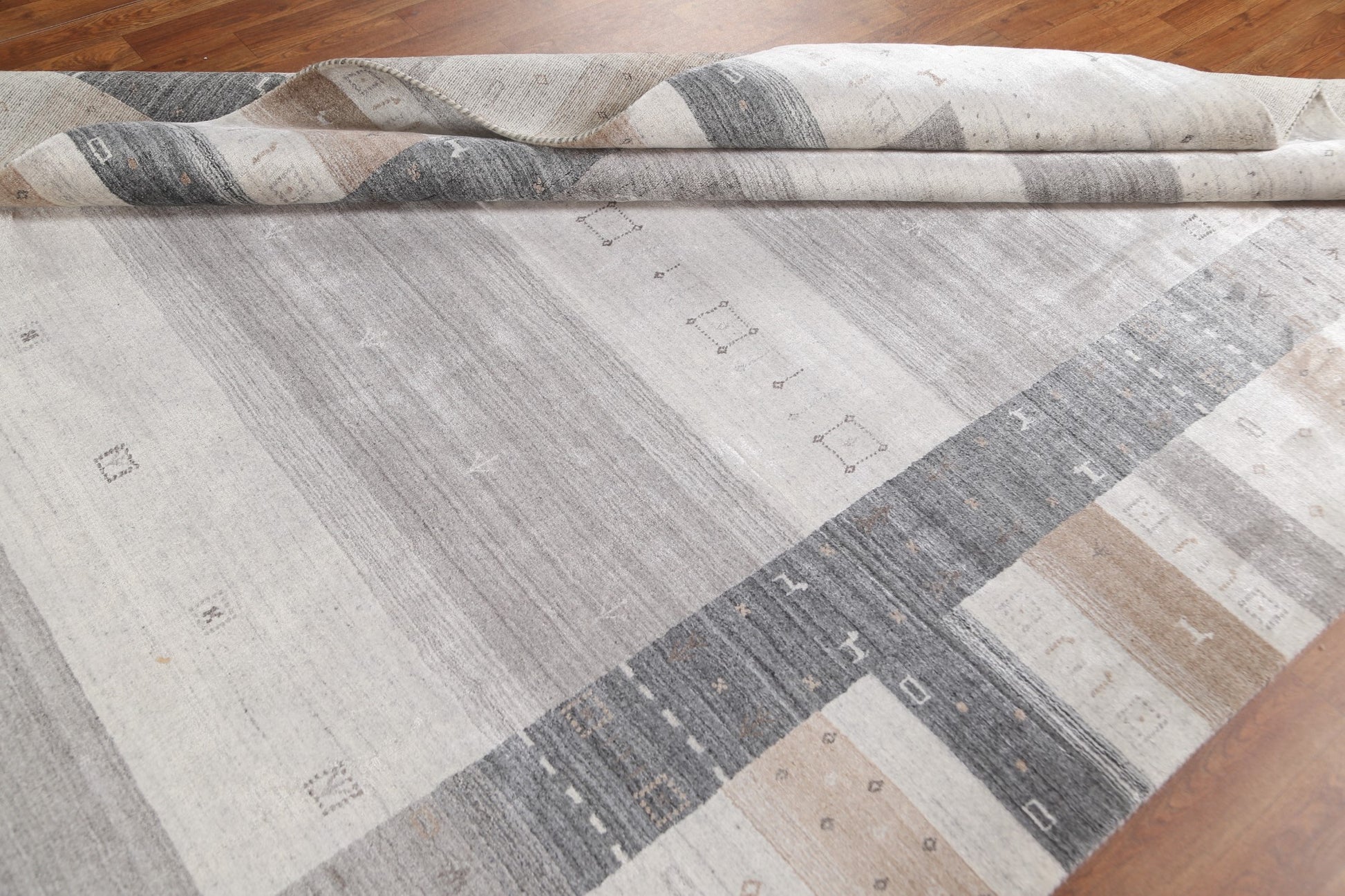 A Beautiful Genuine India Gabbeh rug is Hand Knotted by skillful weavers in India with 100% Wool Material. This rug is in New, First Quality condition. dimensions are 9' 10'' X 6' 8'' in foot and 300 X 203 in centimeter. the primary color is Greys & Charcoal.